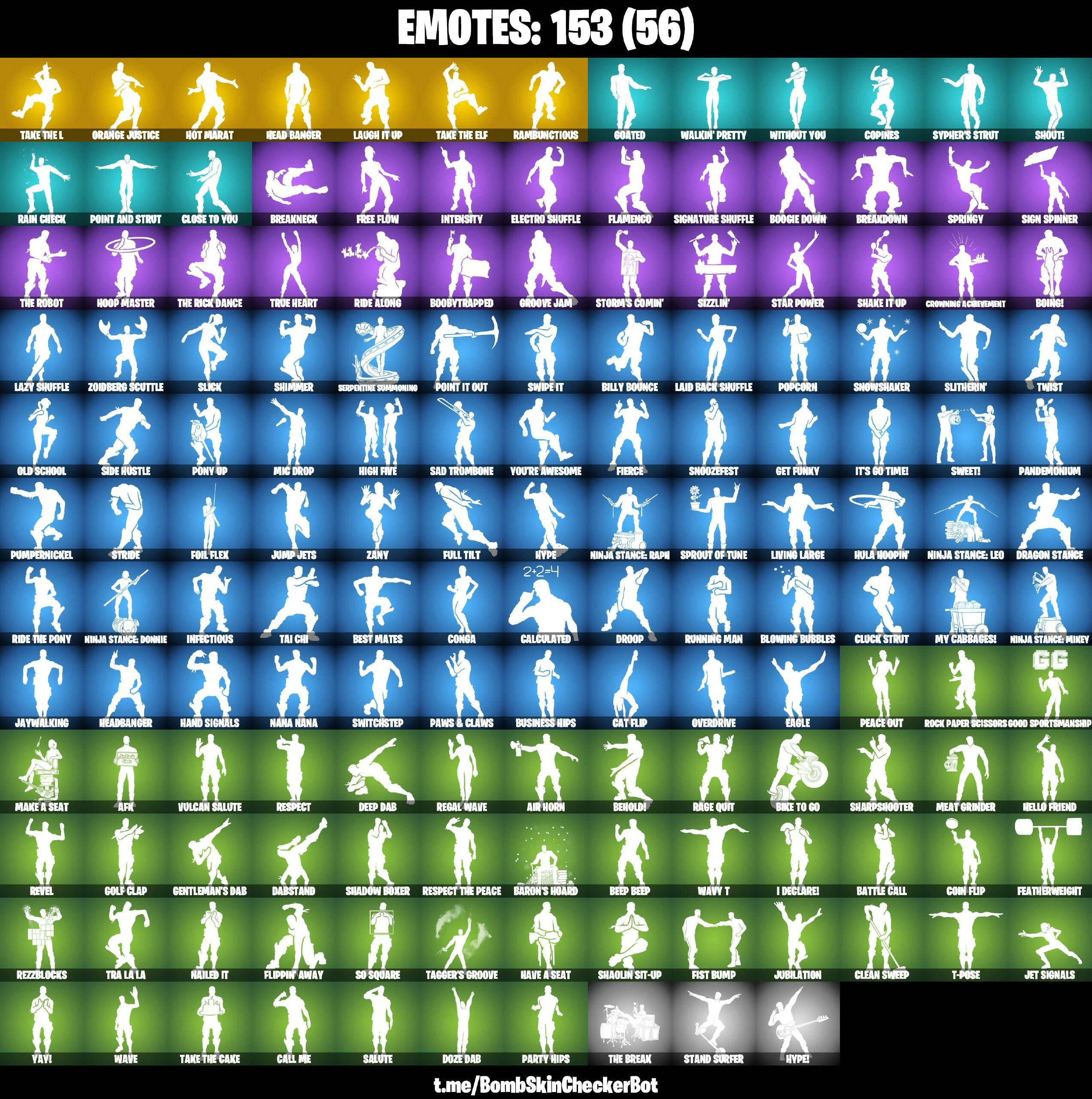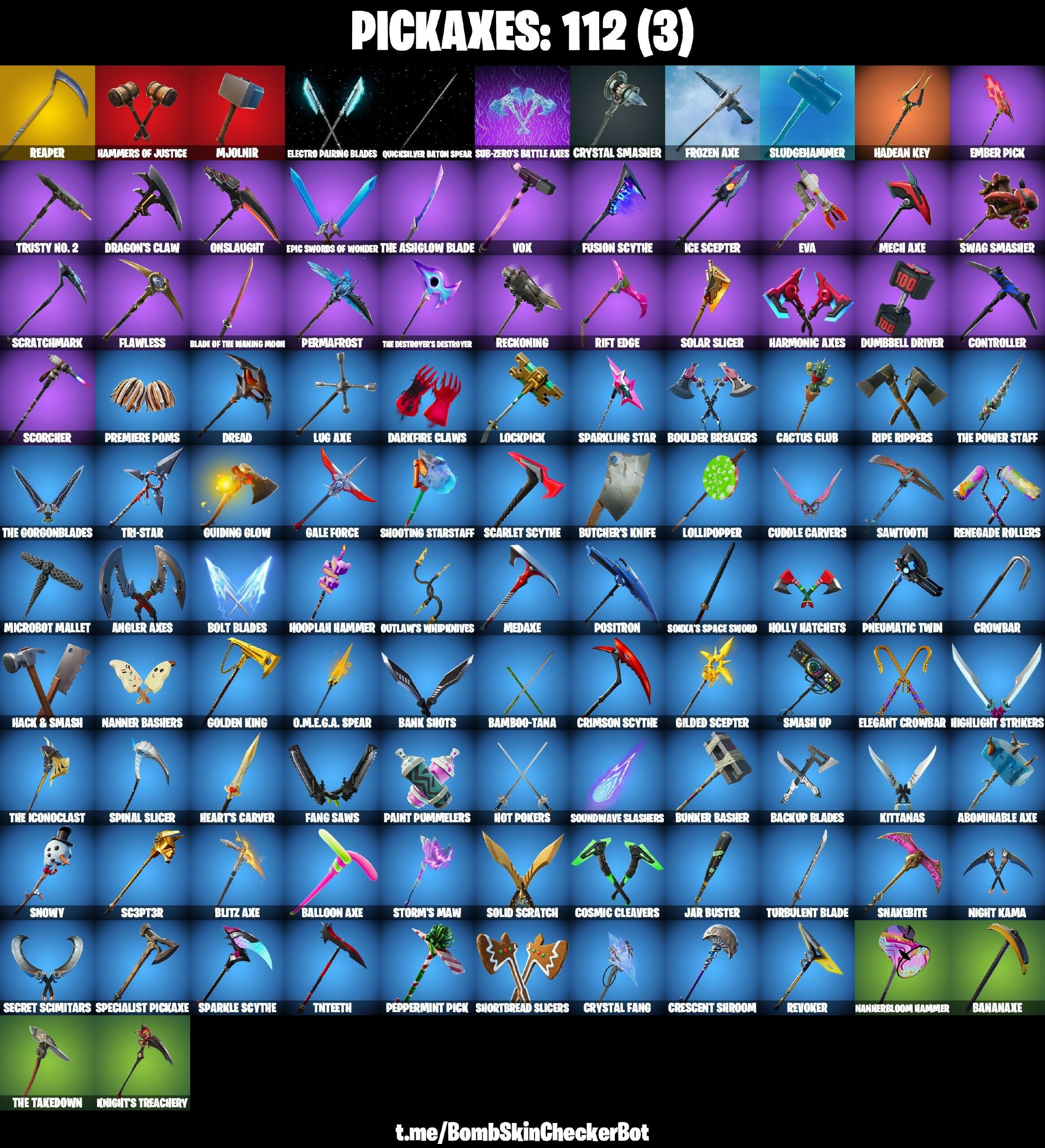 8-Ball Vs Scratch, A.I.M., Abominable Axe, Afk, Agent Peely, Air Horn, Angler Axes, Backup Blades, Balloon Axe, Bamboo-Tana, Bananaxe, Bank Shots, Baron's Hoard, Battle Call, Battlehawk, Beep Beep, Behold!, Best Mates, Bike To Go, Billy Bounce, Blackheart, Blacklight, Blade Of The Waning Moon, Blitz Axe, Blitz Knight, Blowing Bubbles, Blue Striker, Boing!, Bolt Blades, Boobytrapped, Boogie Down, Boulder Breakers, Breakdown, Breakneck, Brutus (Fully Golden), Bunker Basher, Bunker Jonesy, Business Hips, Butcher's Knife, Cactus Club, Calamity, Calculated, Call Me, Cameo Vs Chic, Carbide (Stage 5), Carbon Commando, Cat Flip, Catalyst, Catrina, Clean Sweep, Cloaked Shadow, Close To You, Cluck Strut, Cobalt, Coin Flip, Conga, Controller, Copines, Cosmic Cleavers, Crescent Shroom, Crimson Scythe, Crowbar, Crowning Achievement, Crystal Fang, Crystal Smasher, Cuddle Carvers, DJ Yonder, Dabstand, Dark Voyager, Darkfire Claws, Deadpool, Deep Dab, Demi, Dire, Doze Dab, Dragon Stance, Dragon's Claw, Dread, Drift (Stage 5), Droop, Dumbbell Driver, Dusk, Eagle, Electro Pairing Blades, Electro Shuffle, Elegant Crowbar, Elite Agent, Ember, Ember Pick, Enforcer, Epic Swords Of Wonder, Eternal Voyager, Eva, Fable, Fang Saws, Featherweight, Fierce, Fist Bump, Flamengo, Flawless, Flippin' Away, Foil Flex, Free Flow, Frozen Axe, Frozen Love Ranger, Frozen Raven, Frozen Red Knight, Full Tilt, Fusion, Fusion Scythe, Gale Force, Gear Specialist Maya, Gentleman's Dab, Get Funky, Giddy-Up, Gilded Scepter, Goated, Golden King, Golf Clap, Groove Jam, Guiding Glow, Hack & Smash, Hadean Key, Hammers Of Justice, Hand Signals, Harmonic Axes, Have A Seat, Head Banger, Headbanger, Hearts Carver, Hello Friend, High Five, Highlight Strikers, Holly Hatchets, Hoop Master, Hooplah Hammer, Hot Marat, Hot Pokers, Hula Hoopin', Huntress, Hybrid, Hype, Hype!, I Declare!, Ice Scepter, Infectious, Inferno, Intensity, It's Go Time!, Jar Buster, Jaywalking, Jennifer Walters, Jet Signals, Journey Vs Hazard, Jubilation, Jump Jets, Kittanas, Knight's Treachery, Laid Back Shuffle, Laugh It Up, Lazy Shuffle, Living Large, Lockpick, Lollipopper, Lt. Evergreen, Lug Axe, Luxe, Lynx, Make A Seat, Master Key, Meat Grinder, Mech Axe, Medaxe, Meowscles, Mezmer, Mic Drop, Microbot Mallet, Midas (Fully Golden), Mission Specialist, Mjolnir, Moonwalker, My Cabbages!, Nailed It, Nana Nana, Nanner Bashers, Nannerbloom Hammer, Night Kama, Nightshade, Ninja Stance: Donnie, Ninja Stance: Leo, Ninja Stance: Mikey, Ninja Stance: Raph, O.M.E.G.A. Spear, Old School, Omega, Onesie, Onslaught, Orange Justice, Outlaw's Whipknives, Overdrive, Paint Pummelers, Pandemonium, Party Hips, Paws & Claws, Payback, Peace Out, Peely, Peppermint Pick, Permafrost, Pig The Butcher, Pneumatic Twin, Point And Strut, Point It Out, Pony Up, Popcorn, Positron, Powder, Premiere Poms, Prodigy, Pumpernickel, Quicksilver Baton Spear, Rage Quit, Ragnarok (Stage 6), Rain Check, Rambunctious, Reaper, Reckoning, Red Strike, Redline, Regal Wave, Remedy Vs Toxin, Renegade Rollers, Respect, Respect The Peace, Revel, Revoker, Rezzblocks, Ride Along, Ride The Pony, Rift Edge, Ripe Rippers, Rippley Vs Sludge, Rock Paper Scissors Good Sportsmanship, Rogue Agent, Rook, Rox, Ruin, Running Man, Runway Racer, Rust Lord, Sad Trombone, Salute, Sawtooth, Sc3pt3r, Scarlet Scythe, Scorcher, Scratchmark, Secret Scimitars, Sentinel, Serpentine Summoning, Sgt. Winter, Shadow Boxer, Shake It Up, Shaolin Sit-Up, Sharpshooter, Shimmer, Shooting Starstaff, Shortbread Slicers, Shout!, Side Hustle, Sidewinder, Sign Spinner, Signature Shuffle, Sith Trooper, Sizzlin', Skye, Sledgehammer, Slick, Slitherin', Sludgehammer, Smash Up, Snakebite, Snoozefest, Snowshaker, Snowy, So Square, Solar Slicer, Solid Scratch, Sonka's Space Sword, Soundwave Slashers, Sparkle Scythe, Sparkle Supreme, Sparkling Star, Specialist Pickaxe, Spinal Slicer, Springy, Sprout Of Tune, Squad Leader, Stand Surfer, Star Power, Storm's Comin', Storm's Maw, Stratus, Stride, Sub-Zero's Battle Axes, Summit Striker, Sun Strider, Swag Smasher, Sweet!, Swipe It, Switchstep, Sypher's Strut, T-Pose, Tagger's Groove, Tai Chi, Take The Cake, Take The Elf, Take The L, Teknique, The Ace, The Ashglow Blade, The Break, The Destroyer's Destroyer, The Gorgonblades, The Ice King, The Iconoclast, The Power Staff, The Prisoner, The Reaper, The Rick Dance, The Robot, The Takedown, The Visitor, Thor, Tilted Teknique, Tnteeth, Tntina, Toy Trooper, Tra La La, Tri-Star, Trilogy, Trog, True Heart, Trusty No. 2, Turbulent Blade, Turk Vs Riptide, Twist, Ultima Knight, Valor, Vega, Vendetta, Vox, Vulcan Salute, Walkin' Pretty, Wave, Wavy T, Wilde, Willow, Wingman, Without You, Wooly Warrior, X-Lord, Yay!, Yond3r, You're Awesome, Zany, Zenith, Zoey, Zoidberg Scuttle