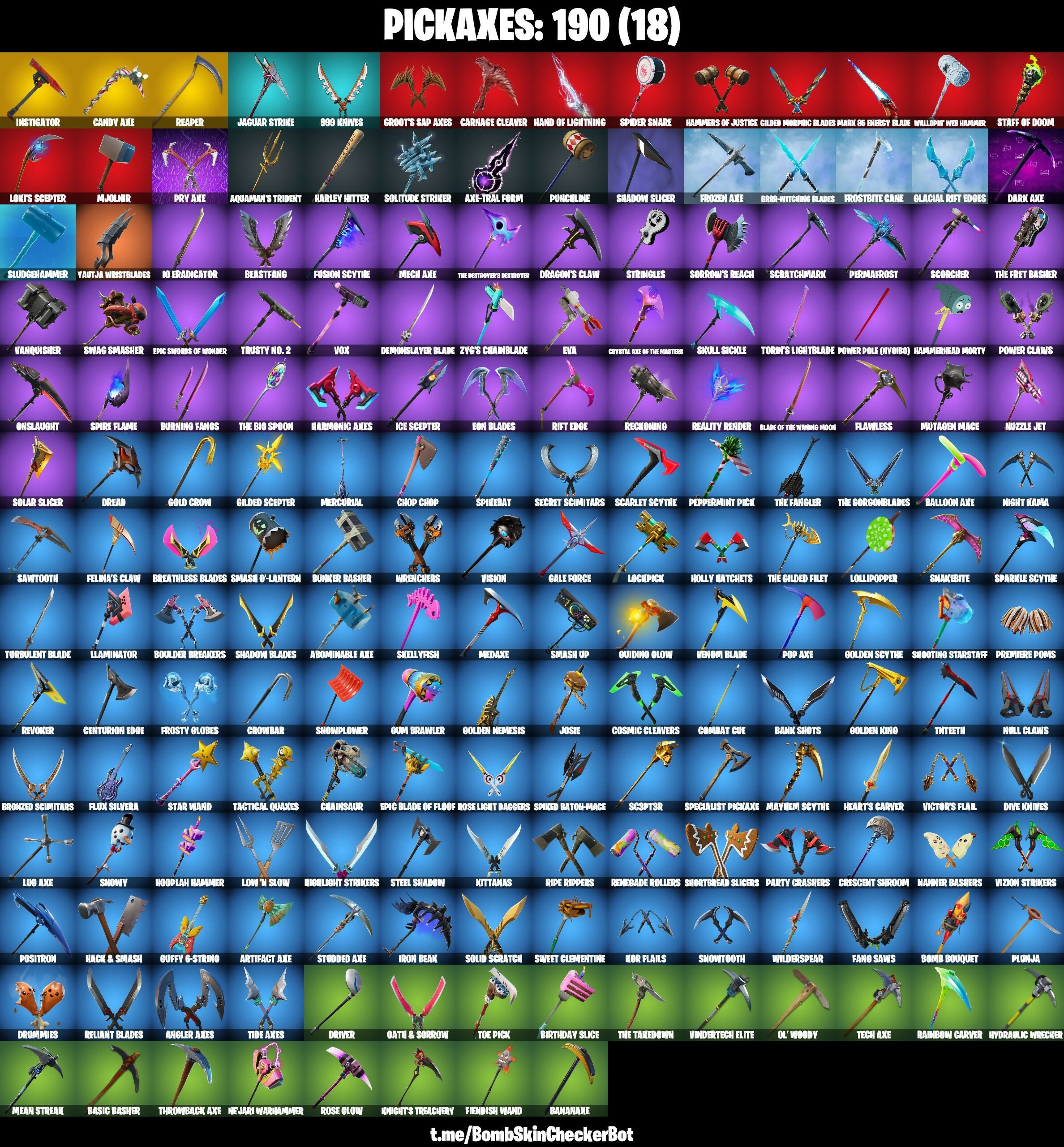 1-Ball, 8-Ball vs Scratch, 999 Knives, A Warrior Prepares, A.I.M., Abominable Axe, Agent Jones, Agent Peely, Air Shredder, Alli, Angler Axes, Aquaman, Aquaman's Trident, Artifact Axe, Axe-ital Form, Azarath Metrion Zinthos, Balloon Axe, Bananaxe, Bank Shots, Basic Basher, Battlehawk, Bean Bag, Beastfang, Beep Beep, Best Mates, Birthday Slice, Blackheart, Blade Of The Waning Moon, Blaze, Blizzard Bomber, Blowing Bubbles, Blue Team Leader, Boing!, Bomb Bouquet, Boogie Down, Boomin', Boots 'N' Cats, Boulder Breakers, Breakdown, Breakneck, Breathless Blades, Brite Bomber, Bronzed Scimitars, Brrr-witching Blades, Brutus (Fully Golden), Bunker Basher, Bunker Jonesy, Burning Fangs, Burpee, Calamity, Calculated, Call Me, Cameo vs Chic, Candy Axe, Carbide (Stage 5), Cardistry, Carnage, Carnage Cleaver, Cat Flip, Catalyst, Cauldron Chill, Centurion, Centurion Edge, Chainsaur, Chaos Director, Chaos Double Agent Double Agent Hush, Chaos Origins, Charlotte, Choice Knit, Chop Chop, Chun-Li, Clark Kent, Clean Sweep, Cloaked Shadow, Clock Strut, Cluck, Clutch, Coin Flip, Combat Cue, Commando, Conga, Cosmic Cleavers, Crescent Shroom, Crowbar, Crowning Achievement, Crystal Axe Of The Masters, Cyclo Curl, DJ Yonder, Dabstand, Dark Axe, Dark Bomber, Dark Jonesy, Dark Red Knight, Dark Voyager, Dark Wild Card, Deadpool, Deep End, Deimos, Demi, Demonslayer Blade, Dire, Dive Knives, Doctor Doom, Doctor Slone, Double Agent Wildcard, Doze Dab, Dragon Stance, Dragon's Claw, Dread, Dream, Drift (Stage 5), Driver, Droop, Drumlines, Dusk, Dynamo Dancer, Dynamo TNTina, Elite Agent, Ember, Enforcer, Eon Blades, Epic Blade Of Floof, Epic Swords Of Wonder, Eternal Knight, Eternal Voyager, Eva, Evasive Maneuvers, Fabio Sparklemane, Fable, Fade, Fang Saws, Featherweight, Felina, Felina's Claw, Fiendish Wand, Fierce, Finesse Finisher, Flamenco, Flawless, Flippin' Away, Flux Silvera, Foil Flex, Free Flow, Frost Broker, Frost Squad, Frostbite Cane, Frosty Globes, Frozen Axe, Fusion, Fusion Scythe, Gale Force, Gear Specialist Maya, Gentleman's Dab, Get Funky, Ghoul Trooper, Giddy-Up, Gilded Morphic Blades, Gilded Scepter, Glacial Rift Edges, Gold Crow, Golden King, Golden Nemesis, Golden Scythe, Golf Clap, Grind, Groot, Groot's Sap Axes, Groove Jam, Guffy G-string, Guggimon, Guiding Glow, Gum Brawler, Gumbo, Hack & Smash, Hammerhead Morty, Hammers Of Justice, Hand Of Lightning, Hand-Forged, Hang Loose Celebration, Harley Hitter, Harley Quinn, Harlowe, Harmonic Axes, Havoc, Heart's Carver, Hello Friend, High Five, Highlight Strikers, Holiday Boxy, Holly Hatchets, Hoodlah Hammer, Hoop Master, Hot Marat, Hula Hoopin', Huntress, Hybrid, Hydraulic Wrecker, Hype, I Declare!, IO Eradicator, Ice Scepter, Instigator, Iris, Iron Beak, It's Go Time!, It's... You?, J.B. Chimpanski, Jaguar Strike, Jaywalking, Jennifer Walters, Jet Signals, Joey, Josie, Journey vs Hazard, Jules, Jump Jets, Keyed Up, Kick Back, Kick Ups, Kit, Kittanas, Knight's Treachery, Kondor, Kor, Kor Flails, Krisabelle, Kymera, Laid Back Shuffle, Lara Croft, Laugh It Up, Lexa, Lil' Monster, Lil' Rover, Lil' Saucer, Llaminator, Lockpick, Loki Laufeyson, Loki's Scepter, Lollipopper, Love It!, Love Ranger, Low 'N Slow, Lt. Evergreen, Lt. John Llama, Lug Axe, Lunar Charge, Luxe, Lynx, Major Glory, Mancake, Mandalorian, Mark 85 Energy Blade, Mashed Potato, Master Key, Mave, Mayhem Scythe, Mean Streak, Mech Axe, Mecha Cuddle Master, Medaxe, Menace, Meowdas, Meowscles (Fully Golden), Mercurial, Mic Drop, Midas (Fully Golden), Mission Specialist, Mjolnir, Mogul Master (FRA), Moonwalker, Mutagen Mage, Mwahaha, Mystique, Nailed It, Nana Nana, Nanner Bashers, Ne'Jari Warhammer, Neymar Jr, Night Kama, Nightshade, Ninja Stance: Leo, Null Claws, Nuzzle Jet, Oath & Sorrow, Ocean, Ol' Woody, Omega (Stage 5), Onesie, Onslaught, Orange Justice, Pandemonium, Party Crashers, Paws & Claws, Peace Out, Peely, Peppermint Pick, Permafrost, Pizza Party, Planetary Vibe, Plunja, Point It Out, Polar Peely, Pony Up, Pop Axe, Popcorn, Positron, Powder, Power Claws, Power Pole (Nyoibo), Predator, Premiere Poms, Prickly Pose, Pry Axe, Punchline, Purr-Demonium, Rage, Ragnarok (Stage 6), Rainbow Carver, Ravage, Raven, Raz, Ready When You Are, Reality Render, Reaper, Rebirth Raven, Reckoning, Red-Nosed Raider, Redline, Reese, Regal Wave, Reliant Blades, Remedy vs Toxin, Renegade Rollers, Respect, Respect The Peace, Revoker, Rhythm Of Chaos, Rick Sanchez, Ride The Pony, Rift Edge, Ripe Rippers, Rippley vs Sludge, Rogue Agent, Ronin, Rook, Rose Glow, Rose Light Daggers, Rose Team Leader, Rox, Ruby Shadows, Ruin, Running Man, Rust Lord, Sad Trombone, Safari, Salute, Sawtooth, Sc3pt3r, Scarlet Scythe, Scootin', Scorchier, Scorpion, Scratchmark, Scuba Crystal, Scuba Jonesy, Secret Scimitars, Sentinel, Serpentine Summoning, Sgt. Winter, Shadow Blades, Shadow Slicer, Shanta, Shaolin Sip, Sharpshooter, Shimmer, Shooting Starstaff, Shortbread Slicers, Side Hustle, Sidewinder, Sign Spinner, Sing Along, Singularity, Siona, Ska-Stra-Terrestrial, Skatemonster, Skellyfish, Skull Sickle, Skye, Slayer Juice Wrld, Sledgehammer, Slitherin', Slow Clap, Sludgehammer, Smash O'-Lantern, Smash Up, Snakebite, Snoozefest, Snow Drift, Snowheart, Snowmando, Snowplower, Snowshaker, Snowtooth, Snowy, So Square, Solar Slicer, Solid Scratch, Solitude Striker, Sorana, Sorrow's Reach, Sparkle Scythe, Sparkle Supreme, Specialist Pickaxe, Spider Snare, Spider-Man, Spikebat, Spiked Baton-Mace, Spire Assassin, Spire Flame, Springy, Squad Leader, Staff Of Doom, Stand Surfer, Star Wand, Steel Shadow, Storm, Stormy, Stratus, Stride, Stringles, Studded Axe, Sub Commander, Sun Goku, Sun Strider, Sunny, Swag Smasher, Sweet Clementine, Swipe It, TNTina, Tactical Quaxes, Take A 'Bow, Take The Cake, Take The Elf, Take The L, Tarana, Tart Tycoon, Team Mech, Tech Axe, Teknique, The Ace, The Big Spoon, The Break Shot, The Burning Wolf, The Cube Queen, The Destroyer's Destroyer, The Fangler, The Foundation, The Fret Basher, The Gilded Filet, The Gorgonbl