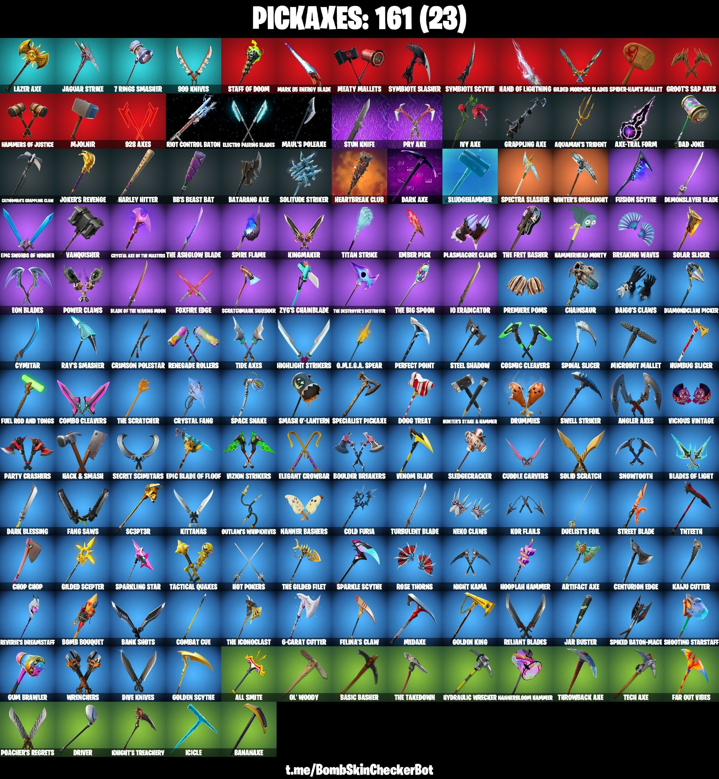 1-Ball, 6-Carat Cutter, 7 Rings Smasher, 8-Ball Vs Scratch, 928 Axes, 999 Knives, Agent Jones, Agent Peely, Ahsoka’s Clone Trooper, Air Horn, Air Shredder, All Might, All Smite, Angler Axes, Aquaman, Aquaman's Trident, Arctic Adeline, Ariana Grande, Armored Batman Zero, Artifact Axe, Atlantean Fishstick, Atom Eve, Axe-Tral Form, Azarath Metrion Zintras, B.R.U.T.E. Navigator, BB's Beast Bat, Bad Joke, Bananaxe, Bank Shots, Baron's Hoard, Basic Basher, Batarang Axe, Battle Blessing, Be Seeing You, Bean Bag, Beast Boy, Beep Beep, Bhangra Boogie, Bike To Go, Billy Bounce, Blade of the Waning Moon, Blades of Light, Blinding Lights, Blizzard Bomber, Blowing Bubbles, Boing!, Bomb Bouquet, Boogie Down, Boots 'n' Cats, Boulder Breakers, Breaking Point, Breaking Waves, Breakneck, Brutus (Fully Golden), Burpee, Bushranger, Call Me, Cameo Vs Chic, Card Drop, Cardistry, Catalyst, Catwoman's Grappling Claw, Centurion, Centurion Edge, Chainsaur, Champion Stash’d, Chaos Agent, Chaos Director, Charging Up, Charlotte, Chef's Special, Chimichanga!, Chop Chop, Chugga-Chugga, Clark Kent, Clean Sweep, Clone Trooper, Cluck, Coin Flip, Cold Furia, Combat Cue, Combo Cleavers, Contract Giller, Coruscant Guard, Cosmic Cleavers, Crabby, Crimson Polestar, Crowning Achievement, Crystal Axe of the Masters, Crystal Fang, Cuddle Carvers, Cymitar, D-1000, Dabstand, Daigo, Daigo's Claws, Dark Axe, Dark Blessing, Dark Jonesy, Dark Red Knight, Dark Wild Card, Darth Maul, Deadpool, Demonslayer Blade, Denied, Diamond Diva, Diamond Throne, Diamondclaw Picker, Dive Knives, Do The 'Split, Doctor Doom, Doctor Slone, Dogg Treat, Double Up, Doze Dab, Dribblin', Driver, Droop, Drummies, Duelist’s Foil, Dynamo Tntina, D’Ark, Eddie Brock, Electro Pairing Blades, Electro Swing, Elegant Crowbar, Elvasive Maneuvers, Ember Pick, Empress Fan Dance, Eon Blades, Epic Blade of Floof, Epic Swords of Wonder, Eren Jaeger, Eternal Knight, Eternal Voyager, Explorer Emilie, Expressionism, Fabio Sparklemane, Fade, Fang Saws, Far Out Vibes, Featherweight, Felina, Felina's Claw, Finger Wag, Fishin', Fishstick, Fist Bump, Flashback Breakdown, Flippin' Away, Focused, Foil Flex, Follow The Butterfly, Foxfire Edge, Fuel Rod and Tongs, Fusion, Fusion Scythe, Gangnam Style, Gear Specialist Maya, Get Griddy, Get Schwifty, Gilded Morphic Blades, Gilded Scepter, Glitter, Go Home!, Go! Go! Go!, Godzilla Evolved, Golden King, Golden Scythe, Good Game, Well Played, Good Guy, Grappling Axe, Groot, Groot's Sap Axes, Ground Pound, Guff Gringle, Guggimon, Gum Brawler, Gun Show, Hack & Smash, Half-Court Hero, Hammerhead Morty, Hammers of Justice, Hand of Lightning, Hand-Forged, Hang Loose Celebration, Hannerbloom Hammer, Harley Hitter, Hatsune Miku, Have A Seat, Heartbreak Club, Heartbreak Ranger, Hero Baymax, High Five, Highlight Strikers, Highwire, Hola Hoopin', Holiday Boxy, Hooplah Hammer, Hope, Hot Pokers, Howl, Hugo, Humbug Slicer, Hunter's Stake & Hammer, Hydraulic Wrecker, I'm A Mystery, IO Eradicator, Icicle, Imani, In The End, Introducing..., Invincible, Invisible Cut, It's... You?, Ivy Axe, J.B. Chimpanski, Jade, Jaguar Strike, Jar Buster, Jaywalking, Jellie, Jennifer Walters, Jet Signals, Jofy, Joker's Revenge, Jonesy The First, Journey Vs Hazard, Jugglin', Jules, Kaiju Cutter, Kendo, Keyed Up, Kick Back, Kingmaker, Kit, Kittanas, Knife Sharpener, Knight's Treachery, Kor, Kor Flails, Kymera, Lara Croft, Last Forever, Lazer Axe, Lazer Blast, Lil Split, Lil' Floatcorn, Lil' Godzilla Attack, Lil' Longboat, Lil' Podracer, Lil' Prancer, Lil' Rover, Lil' Saucer, Lil' Shady Mobile, Lil' Station Wagon, Lil' Warthog, Love It!, Mark 85 Energy Blade, Martial Arts Master, Maul's Poleaxe, Meaty Mallets, Mecha Morty, Mecha Team Leader, Medaxe, Meowdas, Meowscles, Metal Team Leader, Microbot Mallet, Midas (Fully Golden), Midas Rex, Miku Live, Miku Miku Beam, Mintbeast Bushranger, Mizuki, Mjolnir, Montague, Mr. Dappermint, Mystica, Mystique, Nailed It, Nanner Bashers, Nanner Ringer, Neko Claws, Never Gonna, Neymar Jr, Night Kama, Ninja Stance: Donnie, Ninja Stance: Leo, Ninja Stance: Mikey, Ninja Stance: Raph, Nisha, No Sweat, Nyanja, O.M.E.G.A. Spear, Ocean, Ol’ Woody, Omegarok, Omni-Man, Oscar, Outlaw's Whipknives, P.A.N.D.A Team Leader, Pandemonium, Party Crashers, Party Hips, Paws & Claws, Perfect Point, Peter Griffin, Pizza Party, Planetary Vibe, Plasmacore Claws, Poacher's Regrets, Poison Ivy, Poki, Power Claws, Premier Poms, Prickly Pose, Pry Axe, Psylocke, Puppet Dance, Purr-Demonium, Put 'er There, Rage, Raven's Legion, Ray's Smasher, Raz, Ready When You Are, Real Slim Shady, Reanimated, Rebirth Harley Quinn, Rebirth Raven, Red Strike, Reliant Blades, Remedy Vs Toxin, Renegade Lynx, Renegade Rollers, Renzo The Destroyer, Respect The Peace, Reverie, Reverie's Dreamstaff, Rhythm Of Chaos, Rick Sanchez, Riot Control Baton, Rippley Vs Sludge, Robo-Ray, Rock Paper Scissors, Rocket Spinner, Rollie, Rose Thorns, Ruby, Runway Racer, Santa Dogg, Say So, Sc3pt3r, Scarlet Defender, Scootin', Scorecard, Scorpion, Scout Regiment Salute, Scratchmark Surrender, Scuba Jonesy, Secret Scimitars, Seeker, Shadow Blade Hope, Shamisen-Sational, Shaolin Sit-Up, Sharpshooter, Shooting Starstaff, Show 'Em Off, Showstopper, Side Hustle, Sing Along, Siona, Sith Trooper, Ska-Stra-Terrestrial, Skatemonster, Skull Trooper, Skye, Slayer Juice Wrld, Sled Ready Guff, Sledgecracker, Slow Clap, Sludgehammer, Smash O’-Lantern, Snap, Snoop's Walk, Snowshaker, Snowtooth, So Square, Solar Slicer, Solid Scratch, Solid Snake, Solitude Striker, Sorana, Space Snake, Sparkle Scythe, Sparkle Supreme, Sparkling Star, Specialist Pickaxe, Spectatin', Spectra Knight, Spectra Slasher, Spider-Ham's Mallet, Spider-Man (Miles Morales), Spider-Man 2099, Spiked Baton-Mace, Spinal Slicer, Spire Assassin, Spire Flame, Spirit Strider, Springy, Squat Kick, Staff of Doom, Stand Surfer, Standing Bow, Stay Afloat, Steel Shadow, Storm, Stormy, Stray, Street Blade, Stride, Stun Knife, Sultura, Sunny, Surfin' Bird,