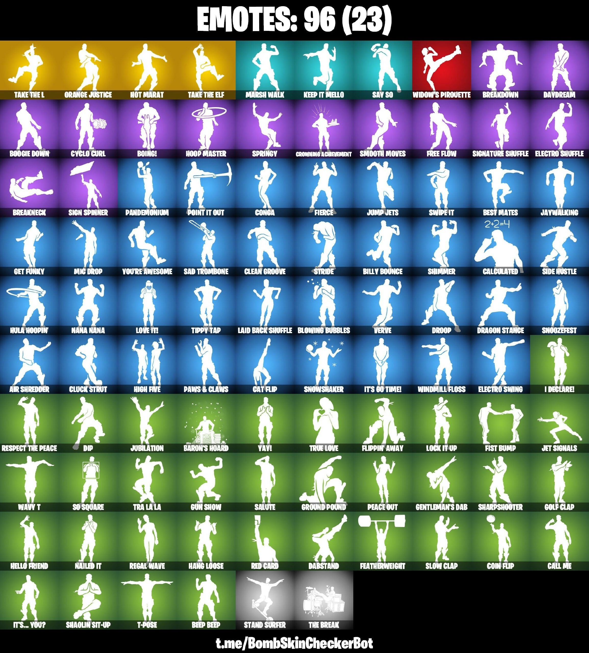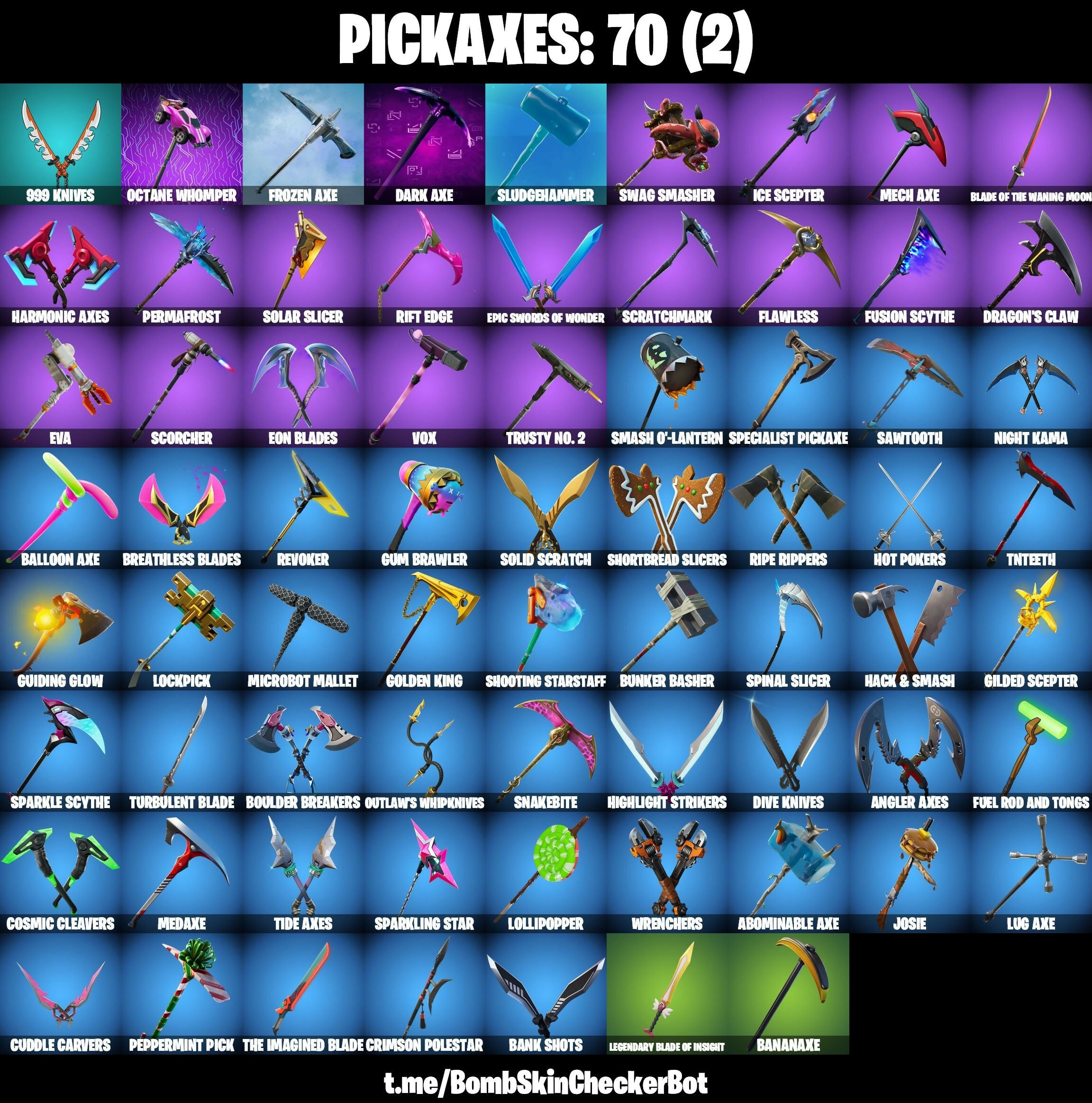 8-Ball Vs Scratch, 999 Knives, Abominable Axe, Agent Peely, Air Shredder, Angler Axes, Astro Jack, Balloon Axe, Bananaxe, Bank Shots, Baron's Hoard, Beep Beep, Best Mates, Billy Bounce, Blackheart, Blade of the Waning Moon, Blowing Bubbles, Boing!, Boogie Down, Boulder Breakers, Breakdown, Breakneck, Breakpoint, Breathless Blades, Brutus (Fully Golden), Bunker Basher, Bunker Jonesy, Calculated, Call Me, Cameo Vs Chic, Cat Flip, Catalyst, Clean Groove, Cloud Striker, Cluck Strut, Cobalt, Coin Flip, Conga, Cosmic Cleavers, Crimson Polestar, Crowning Achievement, Cuddle Carvers, Cyclo Curl, Dabstand, Dark Axe, Dark Jonesy, Dark Red Knight, Dark Voyager, Dark Wild Card, Daydream, Deadpool, Demi, Dip, Dive Knives, Dragon Stance, Dragon's Claw, Drift (Stage 5), Droop, Electro Shuffle, Electro Swing, Ember, Enforcer, Eon Blades, Epic Swords of Wonder, Eva, Fade, Featherweight, Fierce, Fist Bump, Flawless, Flippin' Away, Free Flow, Frozen Axe, Fuel Rod and Tongs, Fusion Scythe, Gear Specialist Maya, Gentleman's Dab, Get Funky, Gilded Scepter, Golden King, Golf Clap, Ground Pound, Guiding Glow, Gum Brawler, Gun Show, Hack & Smash, Hang Loose, Harmonic Axes, Hello Friend, High Five, Highlight Strikers, Hoop Master, Hot Marat, Hot Pokers, Hula Hoopin', Huntress, Hybrid, I Declare!, Ice Scepter, It's Go Time!, It's... You?, Jaywalking, Jet Signals, Josie, Journey Vs Hazard, Jubilation, Jules, Jump Jets, Keep It Mello, Laguna, Laid Back Shuffle, Legendary Blade of Insight, Lock It Up, Lockpick, Lollipopper, Love It!, Lug Axe, Luxe, Lynx, Marsh Walk, Master Key, Mech Axe, Medaxe, Meowscles, Mic Drop, Microbot Mallet, Midas (Fully Golden), Mission Specialist, Moonwalker, Nailed It, Nana Nana, Night Kama, Ocean, Octane Whomper, Onesie, Orange Justice, Outlaw's Whipknives, Pandemonium, Paws & Claws, Peace Out, Peely, Peppermint Pick, Perfect Shadow, Permafrost, Point It Out, Powder, Ragnarok (Stage 6), Red Card, Red Strike, Redline, Regal Wave, Remedy Vs Toxin, Respect the Peace, Revoker, Rift Edge, Ripe Rippers, Rippley Vs Sludge, Rook, Rox, Rust Lord, Sad Trombone, Salute, Sawtooth, Say So, Scorcher, Scratchmark, Scuba Jonesy, Sentinel, Sgt. Winter, Shadow Skully, Shadowbird, Shaolin Sit-Up, Sharpshooter, Shimmer, Shooting Starstaff, Shortbread Slicers, Side Hustle, Sidewinder, Sign Spinner, Signature Shuffle, Skye, Slayer Juice Wrld, Sledgehammer, Slow Clap, Sludgehammer, Smash O'-Lantern, Smooth Moves, Snakebite, Snoozefest, Snowshaker, So Square, Solar Slicer, Solid Scratch, Sparkle Scythe, Sparkle Supreme, Sparkling Star, Specialist Pickaxe, Spinal Slicer, Springy, Stand Surfer, Stratus, Stride, Sun Strider, Swag Smasher, Swipe It, T-Pose, Take the Elf, Take the L, The Break, The Ice King, The Imagined Blade, The Prisoner, Tide Axes, Tilted Teknique, Tippy Tap, Tnteeth, Tntina, Tra La La, Travis Scott, Trog, True Love, Trusty No. 2, Turbulent Blade, Turk Vs Riptide, Vega, Vendetta, Verve, Vox, Wavy T, Widow's Pirouette, Wilde, Windmill Floss, Wooly Warrior, Wrenchers, X-Lord, Yay!, Yond3r, You're Awesome, Zenith