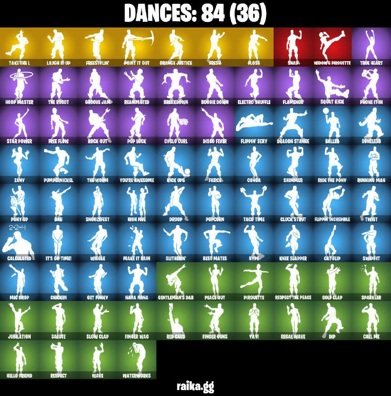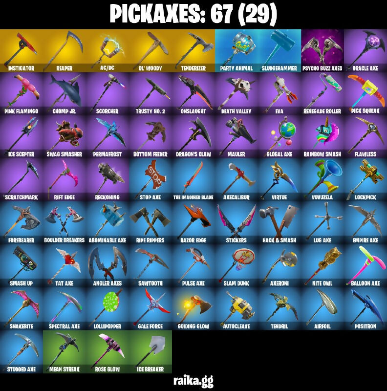 Abominable Axe, Ac/Dc, Agent Peely, Agent Peely (another variant), Air Tank, Airfoil, Alpine Accessories (BBR), Alpine Accessories (Can), Alpine Ace (Can), Altitude, Angler Axes, Antidote, Armory Bag, Arro, Astro, Autocleave, Axecalibur, Axeroni, Backup Plan, Baller, Balloon Axe, Bamboo, Banana Briefcase, Bandolier, Base Jumper, Basecamp Bag, Battle Hound, Battle Shroud, Battlehawk, Beach Umbrella, Bear Force One, Beastmog, Bee Boss, Best Mates, Big Haul, Birdshot, Birthday Cake, Black Knight, Black Shield, Black Werewolf, Blackheart, Blackheart (Stage 3), Blue Courier, Blue Shift, Blue Striker, Bogey Bag, Bone Wasp, Boneless, Boogie Down, Boombox, Booty Buoy, Bottom Feeder, Boulder Breakers, Breakdown, Brite Bag, Broken Heart, Buckler, Bunker Jonesy, Bunny Brawler, Burgle Bag, Burnout, Calculated, Call Me, Captain Cluck (Marching Chicken), Carbide, Carbon, Cat Flip, Catalyst, Centurion, Chef's Choice, Chicken, Chomp Jr., Chomp Sr., Cinder, Clanz Retro, Classified, Cloud Strike, Cluck Strut, Cluefinder, Cobra, Commando, Conga, Conquest, Contagion, Covered Crusader, Crackshot, Crested Cape, Crossfire, Cruiser, Cuff Case, Cyclo Curl, DL Voyager, Dab, Damage, Dark Matter, Dark Vanguard, Dark Void, Dark Voyager, Dark Wings, Deadfire, Death Valley, Deep Fried, Deep Space Lander, Deflector, Demi, Desperado, Destabilizer, Dip, Dire, Dire (Stage 6), Disco Fever, Diving Tank, Downpour, Downshift, Dragon Stance, Dragon's Claw, Dreadnard (Dreadnard Harrowed), Drift, Drift Stage 6, Droop, Duner, Dusk Wings, Eggshell, Electro Shuffle, Elite Agent, Empire Axe, Enduring Cape, Eva, Evidence Bag, Fabled Cape, Fall, Feathered Flyer, Fencer, Field Flyer, Fierce!, Finger Guns, Finger Wag, Fish Tank, Flamenco, Flawless, Flippin' Incredible, Flippin' Sexy, Floss, Flytrapper, Forebearer, Forerunner, Forte Gunner, Founder's Glider, Founder's Umbrella, Free Flow, Freestylin', Fresh, Frozen Shroud, Galaxy, Galaxy (Stage 6), Gale Force, Gentleman's Dab, Get Down!, Get Funky, Glidurr, Global Axe, Gold Token, Golden Disco, Golf Clap, Goodie Bag, Groove Jam, Guiding Glow, Gunn-Brella, Gunner Gristle, Hack & Smash, Hang Time, Hard Boiled, Hazard Agent, Heir Specialist Wrap, Hello Friend, High Caliber, High Five, High Octane, Hoop Master, Huntress, Hybrid, Hybrid (Stage 6), Hype, Ice Breaker, Ice Cube, Ice Mantle, Ice Scepter, Instigator, Intrepid, Iron Cage, It's Go Time!, Jubilation, Jumpshot, K.O. Cruiser, Kabag, Kata-Pack, Kick Ups, Knee Slapper, Lane Splitter, Laser Chomp, Last Gasp, Laugh It Up, Lockpick, Lockstep, Lollipopper, Lost Byte, Love Ranger, Love Wings, Lug Axe, Luxe, Lynx, Lynx (another variant), Magnus, Make It Rain, Mako, Master Key, Master Key (Snowman), Master Portal, Mauler, Mean Streak, Meltdown, Mertani, Mic Drop, Midnight Ops, Midnight Striker, Mission Specialist, Modified Maestro, Moisty Merman, Molten/ Molten Valkyrie (partially obscured), Moniker, Moonwalker, Mothmando, Mullet Marauder, Musen, Mutiny, Nana Nana, Night Cloak, Nightshade, Ninja Man, Nite Owl, Noir, OG Ghost Portal, OG King (Gold), OG Skull Trooper, Oblivion, Offworld Rig, Ol' Woody, Omega (Stage 6), Ominous Orb, Onesie, Onslaught, Oracle Axe, Orange Justice, Overtaker, P.A.N.D.A Team Leader, Palm Leaf, Paper Parasol, Party Animal, Pathogen, Peace Out, Peely, Peely (another variant), Perfect Present, Permafrost, Phone It In, Pick Squeak, Picnic, Pink Flamingo, Pirouette, Planetary Probe, Point It Out, Pony Up, Pool Party, Pop Lock, Popcorn, Positron, Precision, Primal Danger, Prismatic, Prowler, Psycho Bandit, Psycho Buzz Axes, Pulse Axe, Pumpernickel, Punk Ops, Pursuit, Rabbit Raider, Rage, Raged Pluviwalker, Raidcallion (Raidcall), Rainbow Rider, Rainbow Smash, Raptor, Raptor Satchel, Ravage/Raven, Raven, Razor Edge, Reanimated, Reaper, Rearguard, Reckoning, Recon Expert, Recon Specialist, Red Card, Red Knight, Red Shield, Redline, Refugee, Regal Wave, Renegade Roller, Respect, Respect The Peace, Rickety Runner, Ride The Pony, Rift Edge, Ripe Rippers, Rippley Fish (Rippley), Riptide, Riptide vs Toxin, Rock Out, Rogue Agent, Rook, Rook Ranger, Rose Glow, Rose Rider, Rose Team Leader, Rowdy-Up, Rox (Stage 6), Royale Air, Royale Dragon, Royale Flags, Royale Knight, Royale Shield, Royale X, Running Man, Rust Bucket, Rust Lord, Rusty Rider, Salty Sargent, Salute, Sashimono, Sawtooth, Scaly, Scorcher, Scoundrel, Scratchmark, Sentinel, Sgt. Winter, Sgt. Winter (Stage 3), Shackled Stone, Shadow Master, Shark Fin, Shimmer, Signal Hub, Sir Glider The Brave, Skirmish, Sky Serpents, Sky Stalker, Sky Trawler, Slam Dunk, Sledge, Sledgehammer, Slipstream, Slitherin', Slow Clap, Sludgehammer, Smash Up, Snakebite, Snap, Snipes, Snoozefest, Snowfall, Snowflake, Sparkle Specialist, Sparkler, Special Delivery, Spectral Axe, Splashdown, Squad Leader, Squat Kick, Squire Major, Squire Shield, Stabilizer, Stalwart Sweeper, Standard Issue, Star Power, Starry Flight, Steel Sight, Steelcast, Stickers, Stop Axe, Strongbox, Studded Axe, Sub Commander, Sugar Crash, Sun Strider, Sunset Striker, Swag Bag, Swag Smasher, Swarm, Swipe It, Tackle Box, Taco Time, Tactical Sleigh, Tag Bag, Take The L, Tat Axe, Tenderizer, Tendril, Terminus, The Ace, The Ice King, The Imagined Blade, The Reaper, The Robot, The Umbrella, The Visitor, The Worm, Tj2strike Sniper (partially obscured), Tomahawk, Tomatoman, Tomatoman (Chicken), Top Notch, Toxic Trooper, Trail Tote, Trailblazer, Triple Threat, Triumph, True Heart, True North, Trusty No. 2, Turbo Spin, Turn Up Button, Twist, Uplink, Ursa Gold (Outlaw), V6, Valor, Venturion, Venturion Cape, Venus Flyer, Virge, Virtue, Vuvuzela, Warden Raider, Warpaint, Waterworks, Wave, Waveform, Waypoint, Wench Hauler, Wet Paint, Wheelie, Widow's Pirouette, Wiggle, Wild Card, Wild Streak, Wingback, Wings of Valor, Wolfpack, Yay!, You're Awesome, Zany, Zenith, Zenith (Stage 4), Zoey
