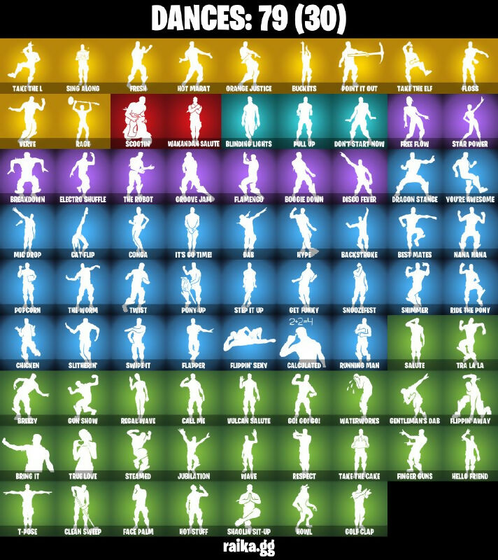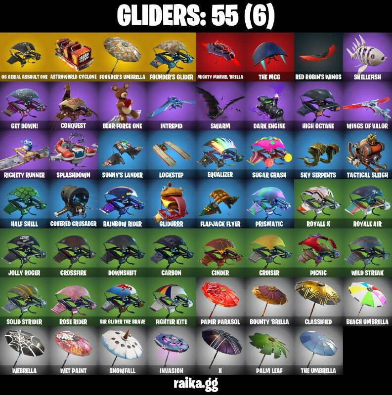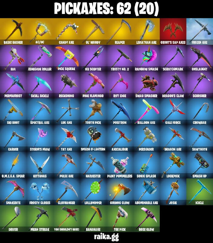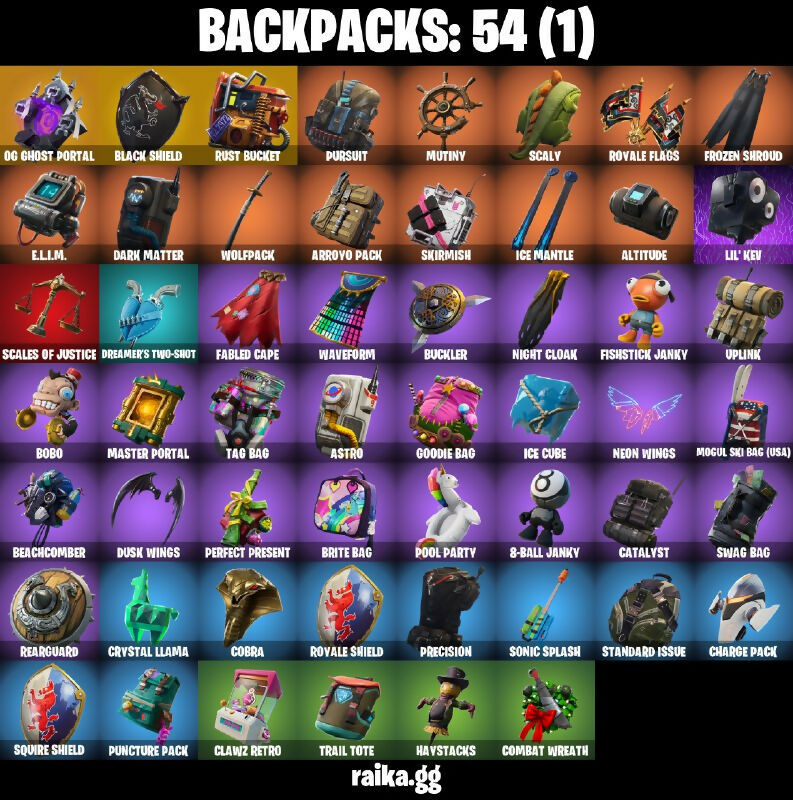 06 Aerial Assault One, 8-Ball Janky, A.I.M., AC/DC, Abominable Axe, Absolute Zero, Abstract, Altitude, Arctic Assassin, Arroyo Pack, Astro, Astroworld Cyclone, Axecalibur, Backstroke, Balloon Axe, Bananaxe, Basic Basher, Battlehawk, Beach Umbrella, Beachcomber, Bear Force One, Best Mates, Black Knight, Black Shield, Black Werewolf, Blackheart, Blackheart (Stage 8), Blinding Lights, Blue Squire, Bobo, Boogie Down, Bounty 'Brella, Bracer, Brawler, Breakdown, Breezy, Bring It, Brite Bag, Brite Bomber, Brite Gunner, Buckets, Buckler, Calamity, Calamity Stage 5, Calculated, Call Me, Candy Axe, Carbide, Carbide Armor Stage 5, Carbon, Carver, Cat Flip, Catalyst, Charge Pack, Chesire, Chicken, Chromium, Cinder, Classified, Clawz Retro, Clean Sweep, Cliffhanger, Cobra, Combat Wreath, Commando, Conga, Conquest, Covered Crusader, Crossfire, Crowbar, Cruiser, Crystal Llama, DJ Yonder, Dab, Dark Engine, Dark Matter, Dark Voyager, Devastator, Diecast, Dire, Disco Fever, Don’t Start Now, Downshift, Dragon Axe, Dragon Stance, Dragon's Claw, Dreamer's Two-Shot, Drift, Drift Stage 6, Driver, Dusk, Dusk Knight, Dusk Wings, E.L.I.M., Electro Shuffle, Elite Agent, Equalizer, Eva, Fable, Fabled Cape, Face Palm, Fighter Kite, Finger Guns, Fishstick Janky, Flamenco, Flapjack Flyer, Flapper, Flippin’ Away, Flippin’ Sexy, Founder's Glider, Founder's Umbrella, Free Flow, Fresh, Frosty Globes, Frozen Axe, Frozen Shroud, Gale Force, Gentleman’s Dab, Get Down!, Get Funky, Giddy-Up, Glidurrr, Gloss, Go! Go! Go!, Golf Clap, Goodie Bag, Groot's Sap Axes, Groove Jam, Guiding Glow, Gun Show, Half Shell, Harvester, Haystacks, Hello Friend, High Octane, Highland Warrior, Hogul Master (USA), Hot Magat, Hot Stuff, Howl, Huntress, Hybrid, Hybrid (Stage 4), Hype, Ice Cube, Ice King (Gold), Ice Mantle, Ice Scepter, Icicle, Intrepid, Invasion, It’s Go Time, Jolly Jammer, Jolly Roger, Josie, Jubilation, Kittanas, Leviathan Axe, Lil' Kev, Lockpick, Lockstep, Lollipopper, Lug Axe, Lynx, Master Portal, Mayhem, Mean Streak, Mic Drop, Mighty Marvel 'Brella, Mission Specialist, Mogul Ski Bag (USA), Moonwalker, Mutiny, Nana Nana, Neon Wings, Night Cloak, Nightshade, Nog Ops, O.M.E.G.A. Spear, Og Aerial Assault One, Og Ghost Portal, Og Skull Trooper, Ol' Woody, Omega, Onslaught, Orange Justice, Paint Pummelers, Palm Leaf, Paper Parasol, Peely, Perfect Present, Permafrost, Persuader, Pick Squeak, Picnic, Pink Flamingo, Point It Out, Pony Up, Pool Party, Popcorn, Positron, Powder, Powder (White), Precision, Prismatic, Pull Up, Pulse Axe, Puncture Pack, Pursuit, Rage, Ragnarok, Rainbow Rider, Rainbow Smash, Reaper, Rearguard, Reckoning, Red Robin's Wings, Red-Hosed Ranger, Redline, Regal Wave, Renegade Roller, Respect, Rex, Rickety Runner, Ride The Pony, Rift Edge, Rogue Agent, Rook, Rose Glow, Rose Rider, Rose Team Leader, Royale Air, Royale Flags, Royale Knight, Royale Shield, Royale X, Running Man, Rust Bucket, Rust Lord, Salute, Sawtooth, Scales Of Justice, Scaly, Scootin, Scorcher, Scratchmark, Sgt. Winter, Sgt. Winter Headgear, Shaolin Sit-Up, Shimmier, Sidewinder, Sidewinder (Dark), Sing Along, Sir Glider The Brave, Skellefish, Ski Boot, Skirmish, Skull Sickle, Sky Serpents, Sledgehammer, Slitherin’, Smash O'-Lantern, Smash Up, Snakebite, Snoozefest, Snowfall, Solid Strider, Sonic Splash, Sparkle Specialist, Special Forces, Spectral Axe, Splashdown, Squad Leader, Squire Shield, Standard Issue, Star Power, Steamed, Step It Up, Storm's Maw, Sugar Crash, Sun Strider, Sunny's Lander, Swag Bag, Swag Smasher, Swarm, Swipe It, T-Pose, Tactical Sleigh, Tactics Officer, Tag Bag, Take The Cake, Take The Elf, Take The L, Tat Axe, Teknique, Teknique (Stage 4 - No Paintball), The Ace, The Ice King, The MCG, The Reaper, The Robot, The Umbrella, The Worm, Toe Pick, Tooth Pick, Tower Recon Specialist, Tra La La, Trail Tote, Trog, Trog (Tribal), True Love, Trusty No. 2, Twist, Undead Nog (OG Skulltrooper), Uplink, Valor, Verve, Vulcan Salute, Wakandan Salute, Warpaint, Waterworks, Wave, Waveform, Webrella, Wet Paint, Wild Streak, Wings of Valor, Wolfpack, Wukong, X, You Shouldn't Have!, You’re Awesome, Zenith, Zenith (Stage 4), Zoey