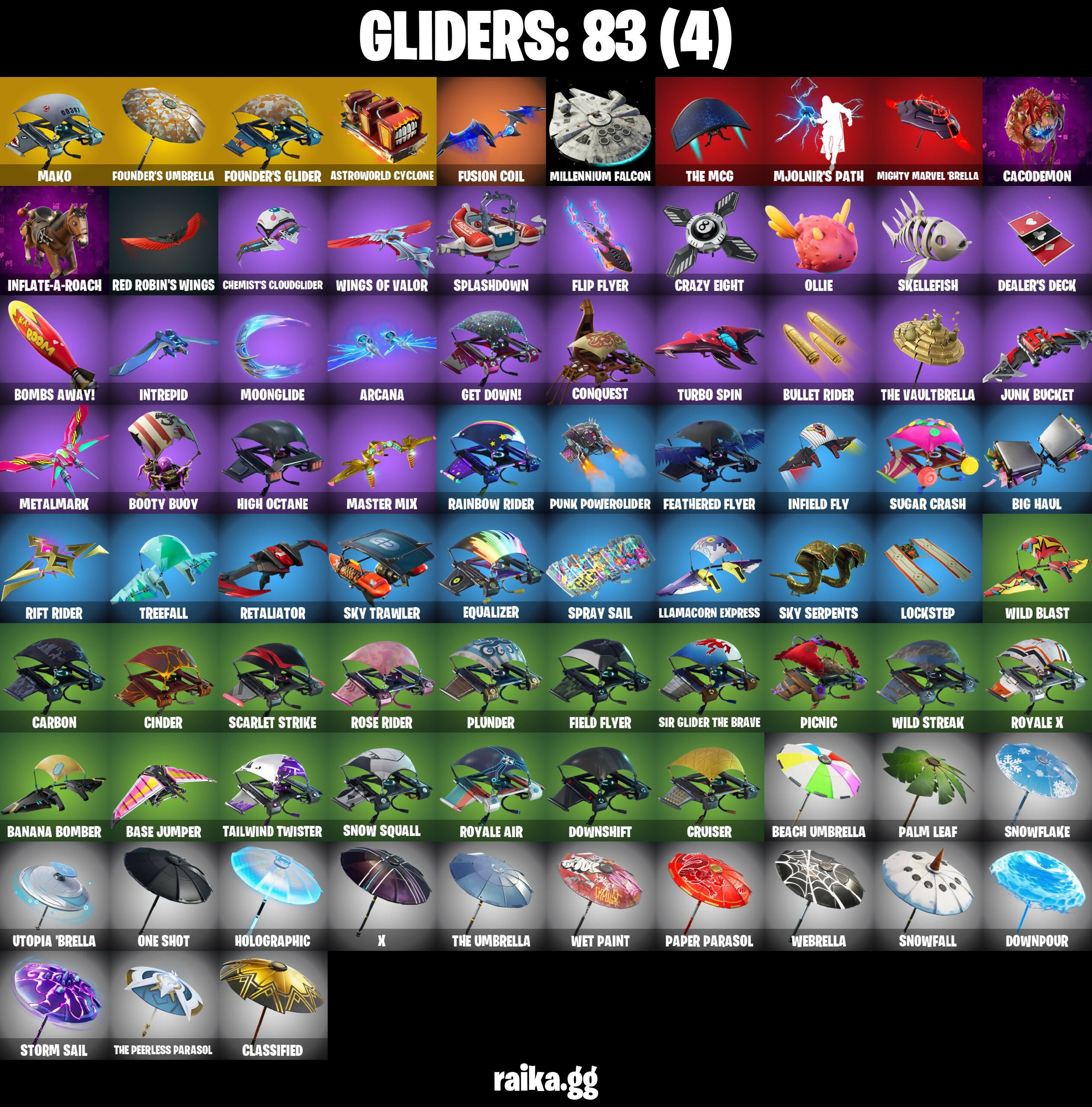 2020 Kickflip, 8-Ball Vs Scratch, Abominable Axe, Ac/Dc, Adventure Pack, Agent Peely, Air Horn, Ancestral Bloom, Angler Axes, Antidote, Arcana, Arroyo Pack, Astro, Astro Armor, Astroworld Cyclone, Atmosphere, Axecalibur, B Splat, Back Board, Backlash, Backtracker, Balance Board, Ball Bling, Balloon Axe, Banana Bomber, Banana Briefcase, Bananaxe, Bank Shots, Banner Cape, Baron's Hoard, Base Jumper, Basecamp Bag, Basic Basher, Batsickle, Battlehawk, Beach Umbrella, Beep Beep, Best Mates, Big Haul, Birthday Slice, Black Knight, Black Shield, Blackheart, Blade Bag, Blade Of The Waning Moon, Bladed Bag, Blitz Axe, Blowing Bubbles, Blue Squire, Board Breaker, Bogey Bag, Boing!, Bombs Away!, Boobytrapped, Boogie Down, Booty Buoy, Boulder Breakers, Breakdown, Brutus, Bullet Rider, Bunker Basher, Bunker Jonesy, Bunsen Backburner, Cacodemon, Calamity, Calculated, Call Me, Cameo Vs Chic, Carbide, Carbon, Catalyst, Charge Pack, Chemist's Cloudglider, Cinder, Classified, Clawz Retro, Cluck Strut, Cobra, Coin Flip, Conga, Conquest, Corrupted, Cosmic Cleavers, Crazy Eight, Criss Cross, Crowbar, Crowning Achievement, Crucible Blade, Cruiser, Crystal Llama, Dabstand, Dark, Dark Deflector, Dark Matter, Dark Vertex, Dark Voyager, Dark Wings, Dealer's Deck, Deep Dab, Deep End, Demi, Denied, Designated Hitters, Dj Yonder, Doom Slayer, Double Header, Downpour, Downshift, Dragon Stance, Dragon's Claw, Dread, Drift, Droop, Dry Bag, Dusty, Dying Light, Electro Pairing Blades, Electro Shuffle, Elite Agent, Ember, Enforcer, Epic Swords Of Wonder, Equalizer, Eva, Fabled Cape, Face Palm, Fancy Feet, Fang Saws, Fate, Feathered Flyer, Featherweight, Feline Fun, Field Flyer, Fierce, Flawless, Flip Flyer, Floss, Founder's Glider, Founder's Umbrella, Frozen Axe, Frozen Shroud, Fusion, Fusion Coil, Fusion Orb, Fusion Scythe, Gale Force, Gear Specialist Maya, Gentleman's Dab, Geralt Of Rivia, Get Down!, Gilded Scepter, Go Bag, Gold, Gold Dagger Pack, Gold Token, Golden King, Golf Clap, Goodie Bag, Grind Bag, Groove Jam, Ground Pound, Hack & Smash, Hammers Of Justice, Harmonic Axes, Hazard, Hello Friend, Hench Hauler, High Caliber, High Five, High Octane, Highlight Strikers, Hola Hoopin', Holographic, Hoodie, Hoop Master, Hot Pokers, Hot Wings, Huntress, Hybrid, Hype, I Declare!, Ice Breaker, Igni Sign, Infield Fly, Infinite Dab, Inflate-A-Roach, Intrepid, Iron Cage, Jaywalking, Jennifer Walters, Journey Vs Hazard, Jubilation, Jump Jets, Junk Bucket, Kabag!, Keep It Mello, Laguna, Laid Back Shuffle, Legendary Blade Of Insight, Living Large, Llamacorn Express, Lock It Up, Lockpick, Lockstep, Lollipopper, Lone Wolf Holster, Low 'N Slow, Lug Axe, Lunar Glow, Lunar Party, Lunarios, Luxe, Make It Rain, Mako, Mark of the Slayer, Mask, Massai, Master Key, Master Mix, Master Portal, Mean Streak, Mech Axe, Medaxe, Meowscles, Metalmark, Mic Drop, Midfield Maestro, Mighty Marvel 'Brella, Millennium Falcon, Mind's Eye, Mini Slayer Fistbump, Mission Specialist, Mjolnir, Mjolnir's Path, Moonglide, Moonwalker, Mutiny, Nana Cape, Nana Nana, Night, O.M.E.G.A. Spear, Offworld Rig, Ol' Woody, Ollie, Omega, Ominous Orb, On The Hook, One Shot, Onslaught, Orange Justice, Outlaw's Knife Rack, Outlaw's Whipknives, Paint Pack, Paint Pummellers, Palette Pack, Palm Leaf, Pandemonium, Paper Parasol, Paws & Claws, Peace Out, Peely, Peppermint Pick, Permafrost, Picnic, Pineapple Strummer, Plunder, Pony Up, Pool Party, Popcorn, Positron, Precision, Pulse Axe, Punk Powerglider, Pursuit, Quack Pack, R3X Tail, Ragnarok, Rainbow Rider, Ravage, Raven, Raven's Legion, Reaper, Rearguard, Reckoning, Recon Specialist, Red, Red Robin's Wings, Red Strike, Redline, Regal Wave, Remedy Vs Toxin, Renegade, Respect, Respect The Peace, Retaliator, Retribution, Revoker, Ride The Pony, Rift Edge, Rift Rider, Ripe Rippers, Rippley Vs Sludge, Riptide, Rock Paper Scissors, Rogue Agent, Rook, Rose Glow, Rose Rider, Rose Team Leader, Rox, Royale Air, Royale Knight, Royale Shield, Royale X, Ruin, Rust Bucket, Rust Lord, SC Electric, Sad Trombone, Salute, Sawtooth, Sc3pt3r, Scales of Justice, Scarlet Edge, Scarlet Scythe, Scarlet Strike, Scavenger, Selene, Sentinel, Shaolin Sit-Up, Sharpshooter, Shooting Starstaff, Side Hustle, Sidewinder, Sign Spinner, Singularity, Sir Glider The Brave, Skellefish, Skirmish, Sky Serpents, Sky Trawler, Skye, Sledgehammer, Slow Clap, Sludgehammer, Smash Up, Smoothie, Snakebite, Snoozefest, Snow Squall, Snowfall, Snowflake, Snowshaker, Snowy, Solid Scratch, Sparkle Scythe, Sparkle Specialist, Sparkle Supreme, Sparkler, Specialist Pickaxe, Spiked Satchel, Splashdown, Spray Sail, Squad Leader, Squire Shield, Stage 4, Stage 5, Stage 6 - No Shoulder Pad, Stage 8, Standard Issue, Star Shot, Storm Sail, Storm's Maw, Stratus, Stride, Subjugator, Sugar Crash, Sun Strider, Sunlit Selene, Supernova Ranker, Swag Bag, Swag Smasher, Swell Striker, Swipe It, T-Pose, Tackle Box, Tailwind Twister, Take The L, Teal, Teknique, The Ace, The Mcg, The Peerless Parasol, The Reaper, The Rebel, The Robot, The Sith, The Umbrella, The Vaultbrella, The Visitor, The Worm, Thor, Thor's Cloak, Thrasher Massai, Tilted Teknique, Tnteeth, Tntina, Tra La La, Trail Tote, Treefall, Trophy Sack, Trusty No. 2, Turbo Spin, Turk Vs Riptide, Twin Blasters, Upgrade With Helmet, Uplink, Utopia 'Brella, Valor, Vega, Vendetta, Viper School, Vivacious, Vox, Warpaint, Waterworks, Wave, Wavebreaker, Wavy T, Weapons of the Witcher, Webrella, Wet Paint, Whiplash, Widow's Pirouette, Wild Blast, Wild Streak, Wilde, Wingman, Wings Of Valor, Witcher's Steel Sword, X, X-Lord, Y0nd3r, Yay!, You're Awesome, Zadie's Blade, Zoey