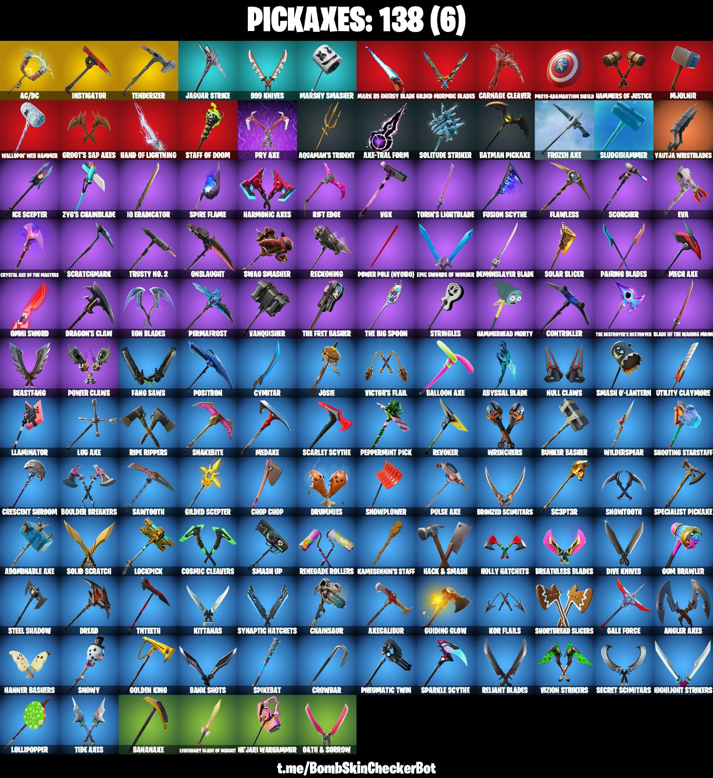 8-Ball Vs Scratch, 999 Knives, A Warrior Prepares, A.I.M., Abominable Axe, Abyssal Blade, Ac/Dc, Agent Jones, Agent Peely, Air Shredder, Angler Axes, Aquaman, Aquaman's Trident, Arsenalz, Axe-Tral Form, Axecalibur, Azarath Metrion Zinthos, Balloon Axe, Bananaxe, Bank Shots, Batman Comic Book Outfit, Batman Pickaxe, Battlehawk, Bean Bag, Beastfang, Beep Beep, Beerus, Best Mates, Black Knight, Blackheart, Blade Of The Waning Moon, Blinding Lights, Blowin' Up, Blowing Bubbles, Blue Squire, Blue Striker, Blue Team Leader, Boing!, Boobytrapped, Boogie Down, Boomin', Boots 'N' Cats, Boulder Breakers, Breakdown, Breakneck, Breathless Blades, Bronzed Scimitars, Brutus (Fully Golden), Bulma, Bunker Basher, Bunker Jonesy, Calamity, Calculated, Call Me, Cameo Vs Chic, Captain America, Carbide (Stage 5), Carbon Commando, Cardistry, Carnage, Carnage Cleaver, Cat Flip, Catalyst, Chainsaur, Charlotte, Choice Knit, Chop Chop, Clark Kent, Clean Sweep, Cluck, Cluck Strut, Clutch, Cobalt, Coin Flip, Conga, Controller, Cosmic Cleavers, Crescent Shroom, Crowbar, Crowning Achievement, Crystal Axe Of The Masters, Cymitar, DJ Yonder, Dabstand, Dark Voyager, Deadpool, Deep End, Demi, Demogorgon, Demonslayer Blade, Dire, Dive Knives, Doctor Doom, Doctor Slone, Doggo, Dragon Stance, Dragon's Claw, Dread, Drift (Stage 5), Droop, Drummies, Dusk, Elite Agent, Ember, Enforcer, Eon Blades, Epic Swords Of Wonder, Eternal Knight, Eternal Voyager, Eva, Evasive Maneuvers, Evie, Fabio Sparklemane, Fable, Fade, Fang Saws, Featherweight, Fierce, Flamenco, Flawless, Flippin' Away, Floss, Free Flow, Freestylin', Frozen Axe, Frozen Love Ranger, Frozen Raven, Frozen Red Knight, Fusion, Fusion Scythe, Fusion! Hah!!, Gale Force, Gear Specialist Maya, Gentleman's Dab, Get Funky, Giddy-Up, Gilded Scepter, Golden King, Golf Clap, Grind, Groot, Groot's Sap Axes, Groove Jam, Guggimon, Guiding Glow, Gum Brawler, Gumbo, Hack & Smash, Hammerhead Morty, Hammers Of Justice, Hand Of Lightning, Hand-forged, Hang Loose Celebration, Harlowe, Harmonic Axes, Haven, Havoc, Heart Sign, Hello Friend, High Five, Highlight Strikers, Holly Hatchets, Hoop Master, Hot Marat, Hula Hoopin', Huntress, Hybrid, Hype, I Declare!, I'm Diamond, Ice Scepter, Instigator, Io Eradicator, It's Dynamite!, It's Go Time!, It's... You?, J.B. Chimpanski, Jaguar Strike, Jaywalking, Jedi Training, Jennifer Walters, Joey, John Wick, Josie, Journey Vs Hazard, Jules, Jump Jets, Kamesennin's Staff, Keep It Mello, Keyed Up, Kick Back, Kit, Kittanas, Kondor, Kor, Kor Flails, Krisabelle, Kylo Ren, Kymera, Laguna, Laid Back Shuffle, Lara Croft, Legendary Blade Of Insight, Lexa, Lil' Monster, Lil' Rover, Lil' Saucer, Llaminator, Lockpick, Lollipopper, Love It!, Lt. Evergreen, Lt. John Llama, Lug Axe, Lunar Charge, Luxe, Lynx, Make It Rain, Mancake, Mandalorian, Mark 85 Energy Blade Gilded Morphic Blades, Marshy Smasher, Mashed Potato, Master Key, Mave, Mech Axe, Medaxe, Menace, Meowscles, Mic Drop, Midas (Fully Golden), Mission Specialist, Mjolnir, Moonwalker, Mwahaha, Mystique, Nailed It, Nana Nana, Nanner Bashers, Ne'Jari Warhammer, Neymar Jr, Nightshade, Null Claws, Oath & Sorrow, Ocean, Omega, Omni Sword, Onesie, Onslaught, Orange Justice, Pairing Blades, Pandemonium, Paws & Claws, Peace Out, Peely, Peppermint Pick, Permafrost, Piccolo, Planetary Vibe, Pneumatic Twin, Point It Out, Point Patroller, Polar Peely, Pony Up, Popcorn, Positron, Powder, Power Claws, Power Pole (Nyoibo), Predator, Prodigy, Proto-Adamantium Shield, Pry Axe, Pulse Axe, Ragnarok (Stage 6), Rambunctious, Raven, Raz, Ready When You Are, Rebirth Raven, Reckoning, Redline, Reese, Regal Wave, Reliant Blades, Remedy Vs Toxin, Renegade Rollers, Respect, Respect The Peace, Revoker, Rick Sanchez, Ride The Pony, Rift Edge, Ripe Rippers, Rippley Vs Sludge, Ronin, Rook, Rox, Royale Knight, Ruin, Running Man, Rust Lord, Sad Trombone, Salute, Sawtooth, Sc3pt3r, Scarlet Scythe, Scorcher, Scourge, Scratchmark, Scuba Jonesy, Secret Scimitars, Sentinel, Sgt. Winter, Shanta, Shaolin Sip, Sharpshooter, Shimmer, Shooting Starstaff, Shortbread Slicers, Side Hustle, Sidewinder, Sign Spinner, Singularity, Siona, Ska-stra-terrestrial, Skye, Slayer Juice Wrld, Sledgehammer, Slitherin', Sludgehammer, Smash O'-Lantern, Smash Up, Snakebite, Snap, Snoozefest, Snowplower, Snowshaker, Snowstrike, Snowtooth, Snowy, So Square, Solar Slicer, Solid Scratch, Solitude Striker, Son Gohan, Son Goku, Sorana, Sparkle Scythe, Sparkle Specialist, Sparkle Supreme, Specialist Pickaxe, Spider-Man, Spider-Man (No Way Home), Spikebat, Spire Assassin, Spire Flame, Springy, Squad Leader, Staff Of Doom, Steel Shadow, Storm, Stormy, Stratus, Stride, Stringles, Sub Commander, Sultura, Sun Strider, Sunny, Swag Smasher, Swipe It, Synaptic Hatchets, Take The Cake, Take The Elf, Take The L, Tarana, Technique, Tenderizer, The Ace, The Big Spoon, The Brat, The Cube Queen, The Dark Knight Movie Outfit, The Destroyer's Destroyer, The Foundation, The Fret Basher, The Ice King, The Prisoner, The Reaper, The Rick Dance, The Robot, The Scientist, The Visitor, The Worm, Thor, Tide Axes, Tilted Teknique, Tippy Tap, Tnteeth, Tntina, Tony Stark, Toona Fish, Torin, Torin's Lightblade, Toy Trooper, Tra La La, Trailblazer, Trog, Trusty No. 2, Tsuki 2.0, Turk Vs Riptide, Ultima Knight, Utility Claymore, Valor, Vanquisher, Vega, Vegeta, Vendetta, Verve, Victor's Flail, Vizion Strikers, Vox, Vulcan Salute, Wakandan Salute, Walloper Web Hammer, Wave, Wavy T, Wilderspear, Wolverine, Wooly Warrior, Wrenchers, X-Lord, Xoxo, Yautja Wristblades, Yay!, Yond3r, You're Awesome, Zenith, Zoey, Zyg, Zyg's Chainblade