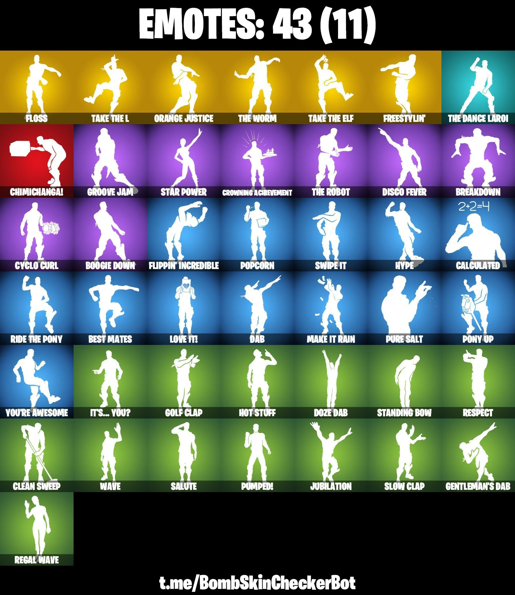 Ac/Dc, Axecalibur, Backup Blades, Balloon Axe, Battlehawk, Best Mates, Black Knight, Blade Of The Waning Moon, Blue Squire, Boogie Down, Breakdown, Calamity, Calculated, Carbide (Stage 5), Chimichanga!, Clean Sweep, Crescent Shroom, Crowbar, Crowning Achievement, Cyclo Curl, DJ Yonder, Dab, Dark Voyager, Disco Fever, Doze Dab, Drift (Stage 5), Elite Agent, Enforcer, Eva, Flippin' Incredible, Floss, Freestylin', Gale Force, Gentleman's Dab, Giddy-Up, Golf Clap, Groove Jam, Guiding Glow, Gum Brawler, Havoc, Heart's Carver, Hot Pokers, Hot Stuff, Huntress, Hype, Instigator, It's... You?, Jubilation, Lina Scorch, Lollipopper, Love It!, Love Ranger, Lug Axe, Make It Rain, Mercurial, Mission Specialist, Moonwalker, Nanner Bashers, Omega, Omen, Onslaught, Orange Justice, Outlaws Whipknives, Permafrost, Pony Up, Popcorn, Positron, Premiere Poms, Pulse Axe, Pumped!, Pure Salt, Ragnarok (Stage 6), Reckoning, Redline, Regal Wave, Respect, Ride The Pony, Rift Edge, Rogue Agent, Rook, Royale Knight, Rust Lord, Salute, Sawtooth, Secret Scimitars, Shamisen Electric, Sledgehammer, Slow Clap, Smash Up, Sparkle Specialist, Sparkling Star, Squad Leader, Standing Bow, Star Power, Sub Commander, Sun Strider, Swipe It, Take The Elf, Take The L, Teknique, Tenderizer, The Ashglow Blade, The Dance Laroi, The Destroyer's Destroyer, The Reaper, The Robot, The Takedown, The Visitor, The Worm, Trailblazer, Trusty No. 2, Valor, Wave, Wingman, You're Awesome, Zoey