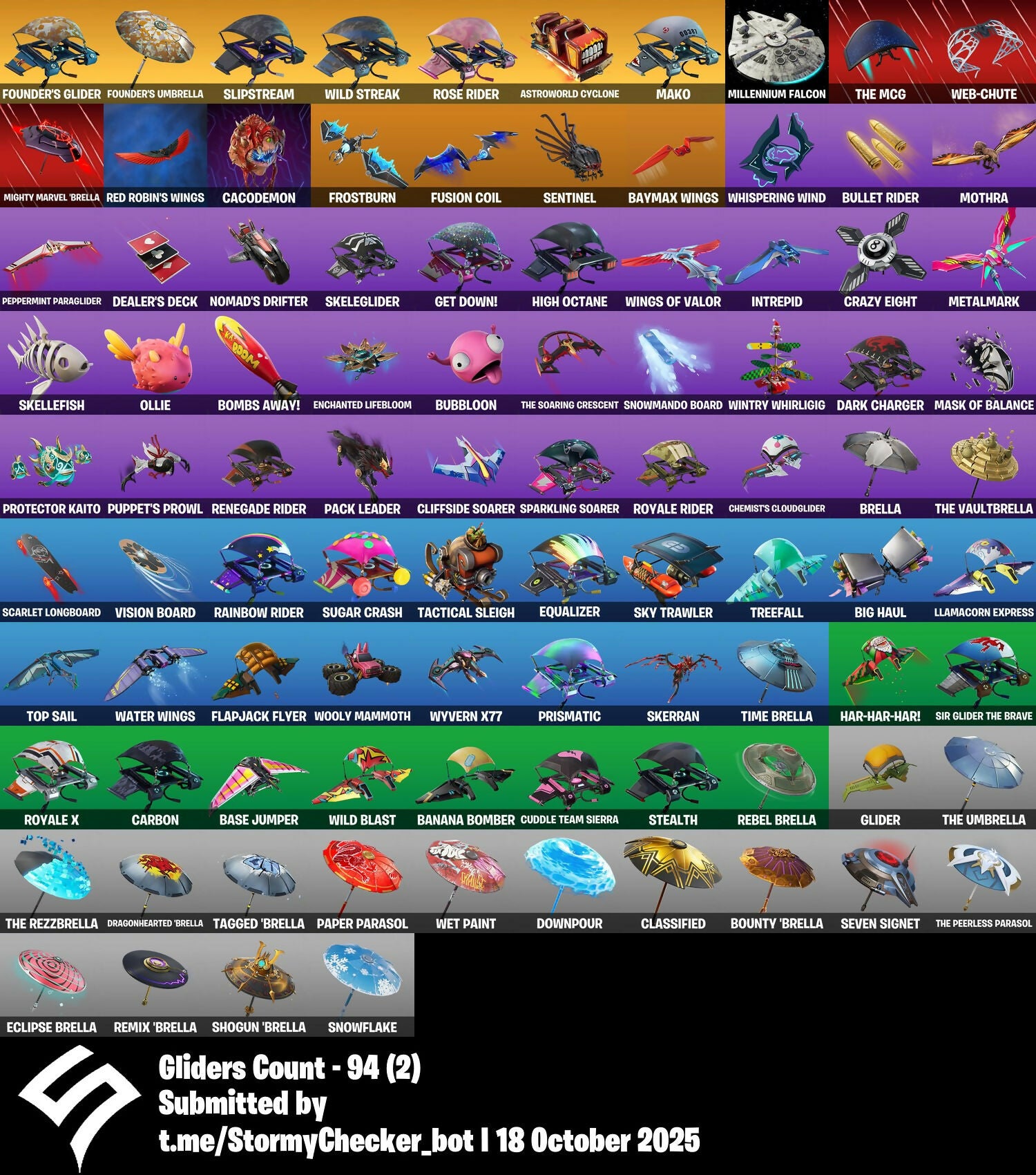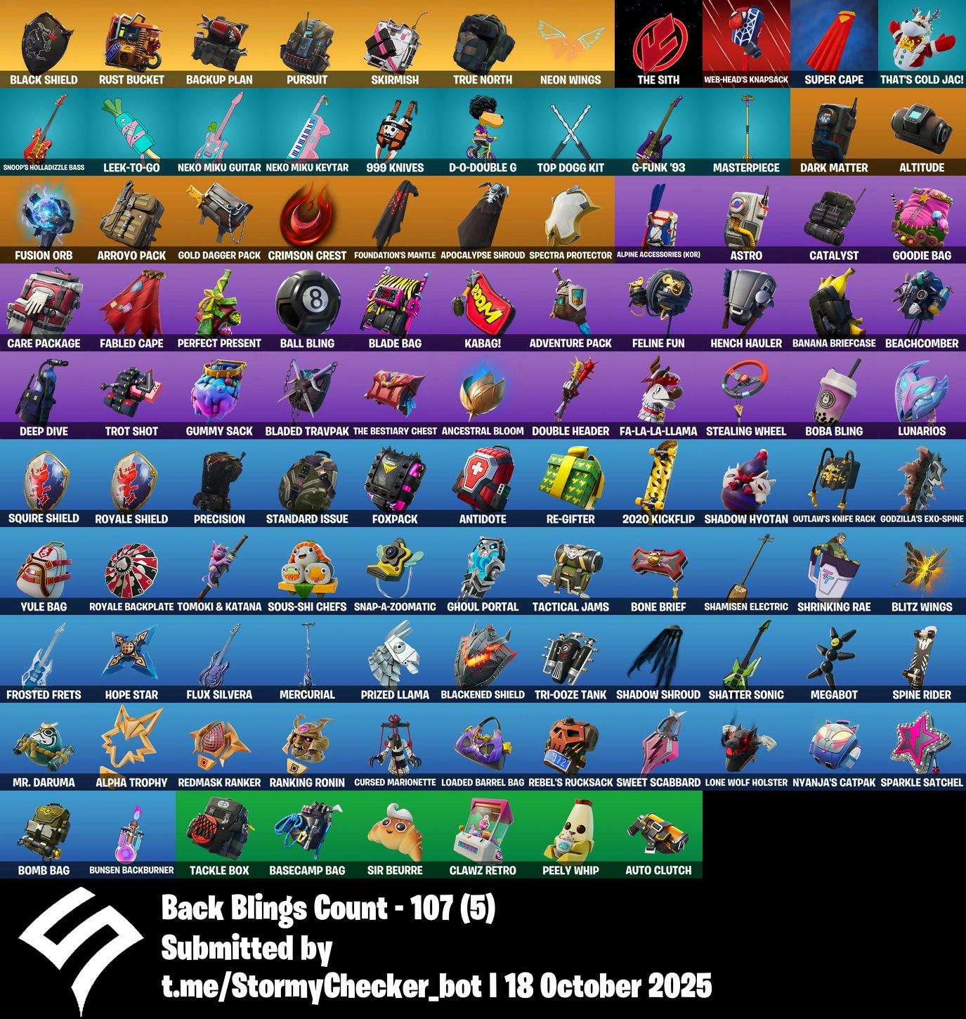 2020 Kickflip, 8-Ball Vs Scratch, 999 Knives, AC/DC, Adventure Pack, Aerial Assault Bomber, Agent Peely, Air Shredder, Alpha Trophy, Alpine Accessories (Kor), Alpine Ace (Kor), Altitude, Ancestral Bloom, Angler Axes, Antidote, Apex Predator, Apocalypse Shroud, Arctic Adeline, Arroyo Pack, Astro, Astroworld Cyclone, Auto Clutch, Axecalibur, Backup Blades, Backup Plan, Ball Bling, Banana Bomber, Banana Briefcase, Bananaxe, Bank Shots, Baron's Hoard, Base Jumper, Basecamp Bag, Basic Basher, Battle Blessing, Battlehawk, Baymax Wings, Beachcomber, Beast Claw, Beep Beep, Best Mates, Big Haul, Birthday Basher, Black Knight, Black Shield, Blackened Shield, Blade Bag, Blade Of The Waning Moon, Bladed Travpak, Blades Of Light, Blitz Wings, Blue Squire, Boba Bling, Boing!, Bomb Bag, Bombs Away!, Bone Brief, Bones, Boogie Down, Boulder Breakers, Bounty 'Brella, Breakin', Brella, Bronzed Scimitars, Brseason1, Brutus, Bubloon, Bullet Rider, Bunsen Backburner, Cacodemon, Call Me, Cameo Vs Chic, Carbide, Carbon, Care Package, Cassidy Quinn, Cat Flip, Catalyst, Chemists' Cloudglider, Choice Knit, Chomp Jr., Classified, Clawz Retro, Click!, Cliffside Soarer, Clinical Crosser, Coin Flip, Conqueror's Axe, Conqueror's Claim, Crazy Eight, Crescent Shroom, Crimson Crest, Crimson Polestar, Crowning Achievement, Crystal Fang, Cuddle Carvers, Cuddle Team Sierra, Cuddle Team Specialist, Cursed Marionette, D-O-Double G, Dab, Daigo, Daigo's Claws, Dance Moves, Dark Charger, Dark Doggo, Dark Matter, Dark Voyager, Dealer's Deck, Deep Dive, Default Pickaxe, Designated Hitters, Diva Fever, Dogg Treat, Double Header, Downpour, Doze Dab, Dragonhearted 'Brella, Droop, Duelist's Card Trick, Duplicating Batons, Duplikates, Durrr Taisho, Dynamic Dribbler, Eclipse Brella, Elegant Crowbar, Elite Agent, Empty Out Your Pockets, Enchanted Lifebloom, Epic Blade Of Floof, Epic Swords Of Wonder, Equalizer, Eva, Fa-La-La-Llama, Fabled Cape, Face Palm, Fade, Feline Fun, Fennix, Finesse Finisher, First Downer, Fist Bump, Flapjack Flyer, Flapper, Flippin' Away, Flippin' Sexy, Floss, Flux, Flux Silvera, Foundation's Mantle, Foundation's Plasma Spike, Founder's Glider, Founder's Umbrella, Foxpack, Freestylin', Front Page Pose, Frostburn, Frosted Frets, Fusion, Fusion Coil, Fusion Orb, Fusion Scythe, G-Funk '93, Gale Force, Gear Specialist Maya, Gentleman's Dab, Get Down!, Ghoul Portal, Gilded Scepter, Glider, Godzilla Evolved, Godzilla's Exo-Spine, Gold Dagger Pack, Golden King, Golf Clap, Goodie Bag, Groove Jam, Gum Brawler, Gumbo, Gummy Sack, Hack & Smash, Har-Har-Har!, Harlowe, Haruka Of The Masks, Haven, Havoc, Heart Chopper, Helichopper, Hello Friend, Hench Hauler, Hero Baymax, High Five, High Octane, Highlight Strikers, Holly Hatchets, Hope Star, Hot Pokers, Hula Hoopin', Humbug Slicer, Hype, Hypnot-Eyes, I Declare!, Instigator, Intrepid, Invisible Cut, It's Chemistry!, It's... You?, Jade, Jet Signals, Josie, Joss, Journey Vs Hazard, Kabag!, Kendo, Kiss Kiss, Knight Conqueror, Krisabelle, Lbc '93 Dogg, Leek-To-Go, Legendary Blade Of Insight, Lil' Godzilla Attack, Lil' Monster, Lil' Prancer, Lil' Speeder Bike, Lil' Tank, Lil' Warthog, Live From Haddonfield, Llamacorn Express, Llaminator, Loaded Barrel Bag, Lollipopper, Lone Wolf Holster, Love It!, Lt. Evergreen, Lt. John Llama, Lunar Charge, Lunarios, Lynx, Mako, Mask of Balance, Masterpiece, Mean Streak, Medaxe, Megabot, Meowscles, Mercurial, Metalmark, Microbot Mallet, Midas, Mighty Marvel 'Brella, Millennium Falcon, Mine, Mission Specialist, Moonwalker, Mothra, Mr. Daruma, Mwahaha, Nanner Bashers, Neko Claws, Neko Hatsune Miku, Neko Miko Guitar, Neko Miko Keytar, Neko Miku Guitar, Neko Miku Keytar, Neon Wings, Night Kama, Nomad's Drifter, Nyanja, Nyanja's Catpak, Ocean, Ol' Woody, Ollie, Omega, Orange Justice, Out West, Outlaw's Knife Rack, Outlaw's Whipknives, Pack Leader, Pandemonium, Paper Parasol, Paws & Claws, Peely Whip, Peppermint Paraglider, Peppermint Pick, Perfect Present, Poised Playmaker, Pony Up, Popcorn, Positron, Precision, Premiere Poms, Prismatic, Prized Llama, Protector Kaito, Pulse Axe, Puppet Dance, Puppet's Prowl, Pure Salt, Pursuit, Raider's Revenge, Rainbow Rider, Ranking Ronin, Raptor's Talon, Raven Team Syd, Re-Gifter, Rebel Brella, Rebel's Rucksack, Recon Raptor, Red Robin's Wings, Redmask Ranker, Regal Wave, Remedy Vs Toxin, Remix 'Brella, Renegade Raider, Renegade Reaver, Renegade Rebel, Renegade Rider, Respect, Respect the Peace, Ride the Pony, Rippley Vs Sludge, Rocket Rodeo, Rocket Wrecker, Rogue Agent, Ronin, Rose Glow, Rose Rider, Rose Team Leader, Rose Thorns, Royale Backplate, Royale Knight, Royale Rider, Royale Shield, Royale X, Rust Bucket, Rust Lord, Salute, Santa Dogg, Sasquatchin', Save The World, Sawtooth, Scarlet Longboard, Scorcher, Scratchmark, Scuba Jonesy, Secret Scimitars, Sentinel, Seven Signet, Sgt. Green Clover, Shadow Blade Hope, Shadow Hyotan, Shadow Shroud, Shamisen Electric, Shamisen-Sational, Shanta, Shaolin Sip, Shaolin Sit-Up, Sharpshooter, Shatter Sonic, Shogun 'Brella, Shortbread Slicers, Show 'Em Off, Shrinking Rae, Side Hustle, Sing Along, Sir Beurre, Sir Glider the Brave, Six String Sniper, Skele-Dance, Skeleglider, Skellefish, Skerran, Skirmish, Skull Blade, Skull Commander, Sky Trawler, Skye, Slayer Juice Wrld, Sled Ready Guff, Sledgecracker, Slipstream, Slow Clap, Sludgehammer, Snap-A-Zoomatic, Snoop's Holladizzle Bass, Snowflake, Snowmando Board, Snowplower, Snowshaker, Snowy, Snowy Ops, Solid Scratch, Sous-Shi Chefs, Sparkle Diva, Sparkle Satchel, Sparkle Specialist, Sparkling Soarer, Sparkling Star, Specialist Pickaxe, Spectra Protector, Spider-Man, Spikebat, Spinal Slicer, Spine Rider, Spirit Strider, Springy, Squad Leader, Squire Shield, Stand Surfer, Standard Issue, Stealing Wheel, Stealth, Step It Up, Storm's Maw, Striped Soldier, Sub Commander, Sugar Crash, Super Cape, Sweet Scabbard, Syntheslicer, Tackle Box, Tactical Jams, Tactical Sleigh, Tagged 'Brella, Take The L, Teknique, Tenderizer, That's Cold Jac!, T