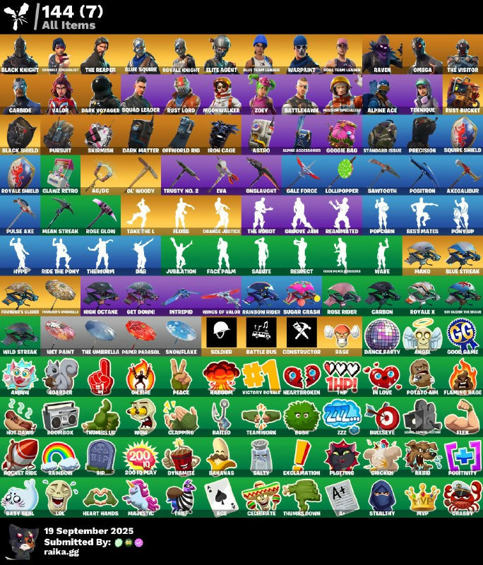 1HP!, 200 IQ, 2000 To Play, AC/DC, Ace, Alpine Accessories, Alpine Ace, Angel, Astro, Awkaw, Axecalibur, Baby Seal, Baited, Bananas, Battle Bus, Battlehawk, Best Mates, Black Knight, Black Shield, Blue Squire, Blue Streak, Blue Team Leader, Boombox, Bullseye, Bush, Carbide, Carbon, Celebrate, Chicken, Clapping, Clawz Retro, Constructor, Crabby, Dab, Dance Party, Dark Matter, Dark Voyager, Dynamite, Elite Agent, Eva, Exclamation, Face Palm, Flaming Rage, Flex, Floss, Founder's Glider, Founder's Umbrella, Gale Force, Gambler Specialist, Get Down!, Good Game, Goodie Bag, Groove Jam, Heart Hands, Heartbroken, High Octane, Hoarder, Home Decor Auction, Hot Dawg, Hype, In Love, Intrepid, Iron Cage, Jubilation, Kaboom, Lollipopper, MVP, Majestic, Mako, Mean Streak, Mission Specialist, Moonwalker, Offworld Rig, Ol' Woody, Omega, On Fire, Onslaught, Orange Justice, Paper Parasol, Peace, Plotting, Pony Up, Popcorn, Positivity, Positron, Potato Aim, Precision, Pulse Axe, Pursuit, RIP, Rabic, Rage, Rainbow, Rainbow Rider, Raven, Reanimated, Respect, Ride The Pony, Rocket Ride, Rose Glow, Rose Maker Gibbons, Rose Rider, Rose Team Leader, Royale Knight, Royale Shield, Royale X, Rust Bucket, Rust Lord, Salty, Salute, Sawtooth, Sir Glider The Brave, Skirmish, Snowflake, Soldier, Sparkle Specialist, Squad Leader, Squire Shield, Standard Issue, Stealthy, Sugar Crash, Take The L, Teamwork, Teknique, The Reaper, The Robot, The Umbrella, The Visitor, The Worm, Thief, Thumbs Down, Thumbs Up, Trusty No. 2, Valor, Victory Royale, Warpaint, Wave, Wet Paint, Wild Streak, Wings of Valor, Wow, ZZZ, Zoey