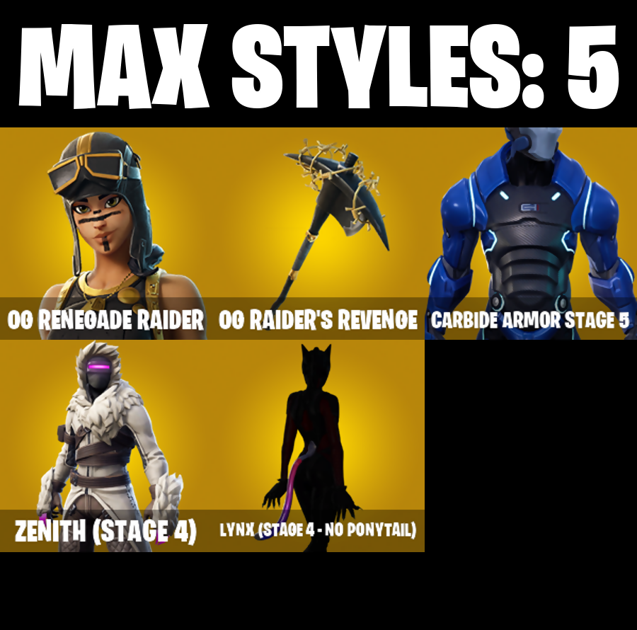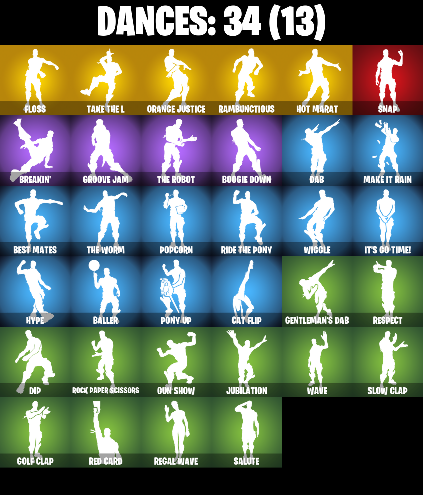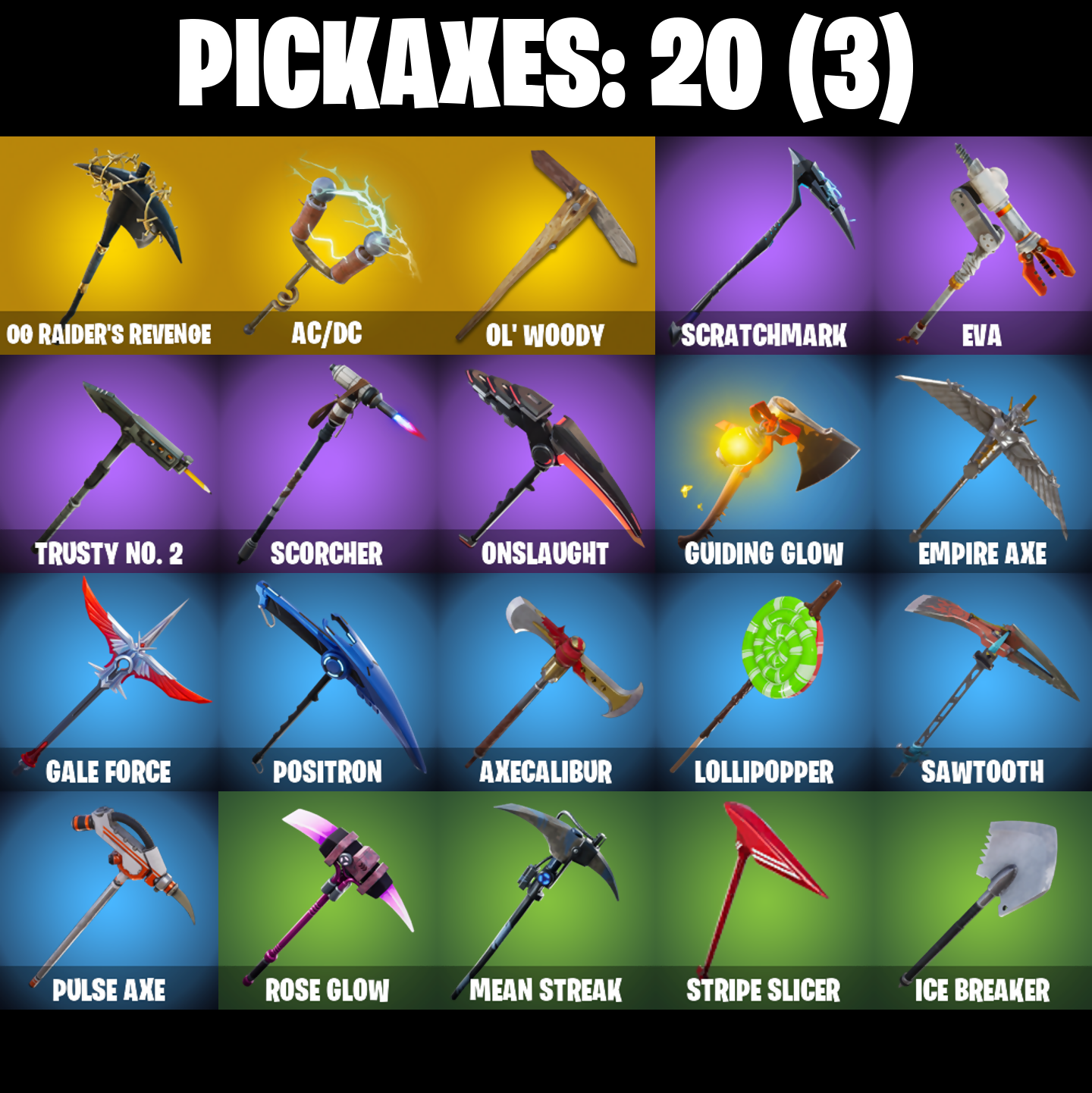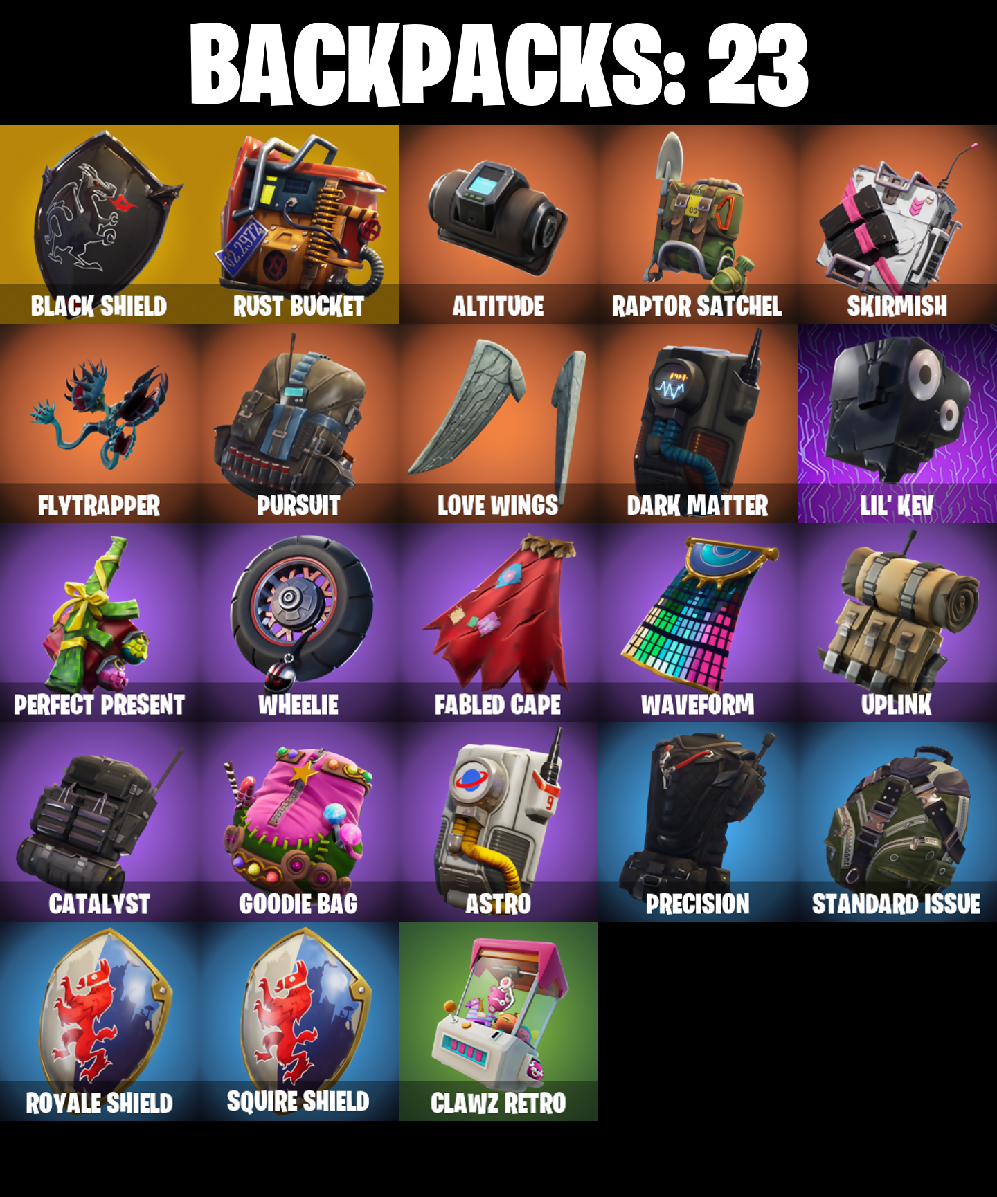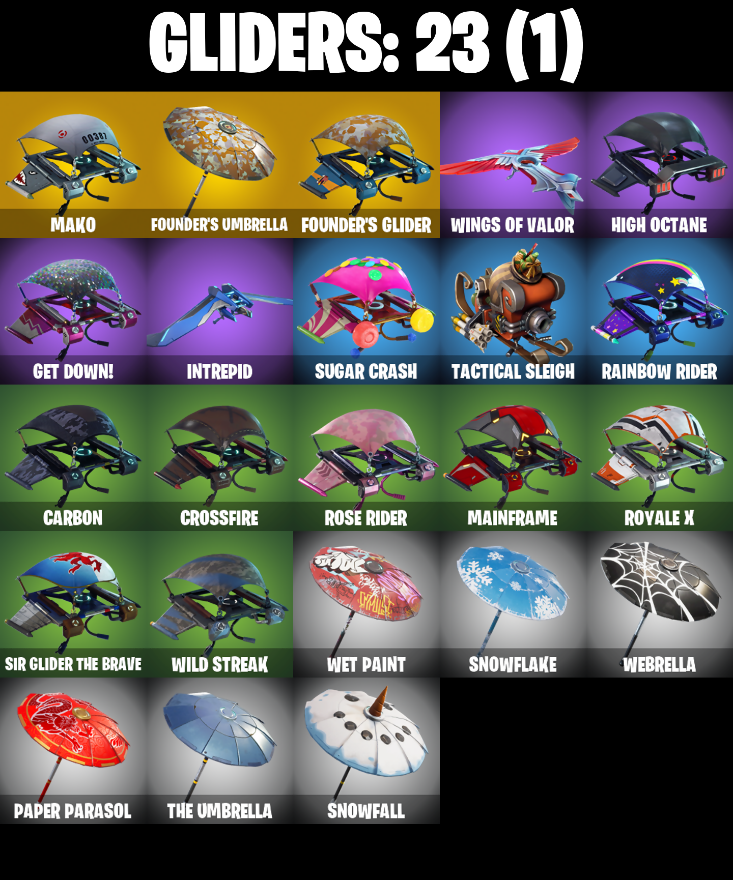 00 Raider's Revenge, Ac/Dc, Altitude, Astro, Axecalibur, Baller, Battlehawk, Best Mates, Black Knight, Black Shield, Blue Squire, Boogie Down, Breakin', Brite Bomber, Burnout, Carbide, Carbide Armor Stage 5, Carbon, Cat Flip, Catalyst, Clawz Retro, Crossfire, Dab, Dark Matter, Dark Voyager, Dip, Elite Agent, Empire Axe, Eva, Fabled Cape, Floss, Flytrap, Flytrapper, Founder's Glider, Founder's Umbrella, Gale Force, Gentleman's Dab, Get Down!, Golf Clap, Goodie Bag, Groove Jam, Guiding Glow, Gun Show, High Octane, Hot Marat, Hype, Ice Breaker, Intrepid, It's Go Time!, Jubilation, Jumpshot, Lil' Kev, Lollipopper, Love Ranger, Love Wings, Lynx, Lynx (Stage 4 - No Ponytail), Mainframe, Make It Rain, Mako, Mean Streak, Mission Specialist, Moonwalker, OG Raider's Revenge, OG Renegade Raider, Ol' Woody, Omega, Onslaught, Oo Renegade Raider, Orange Justice, Paper Parasol, Perfect Present, Pony Up, Popcorn, Positron, Precision, Pulse Axe, Pursuit, Rainbow Rider, Rambunctious, Raptor, Raptor Satchel, Red Card, Regal Wave, Respect, Ride The Pony, Rock Paper Scissors, Rogue Agent, Rose Glow, Rose Rider, Rose Team Leader, Royale Knight, Royale Shield, Royale X, Rust Bucket, Rust Lord, Salute, Sawtooth, Scorcher, Scratchmark, Sir Glider The Brave, Skirmish, Slow Clap, Snap, Snowfall, Snowflake, Sparkle Specialist, Squad Leader, Squire Shield, Standard Issue, Stripe Slicer, Sugar Crash, Tactical Sleigh, Take The L, Teknique, The Reaper, The Robot, The Umbrella, The Worm, Trusty No. 2, Uplink, Valor, Warpaint, Wave, Waveform, Webrella, Wet Paint, Wheelie, Wiggle, Wild Streak, Wings Of Valor, Zenith, Zenith (Stage 4), Zoey
