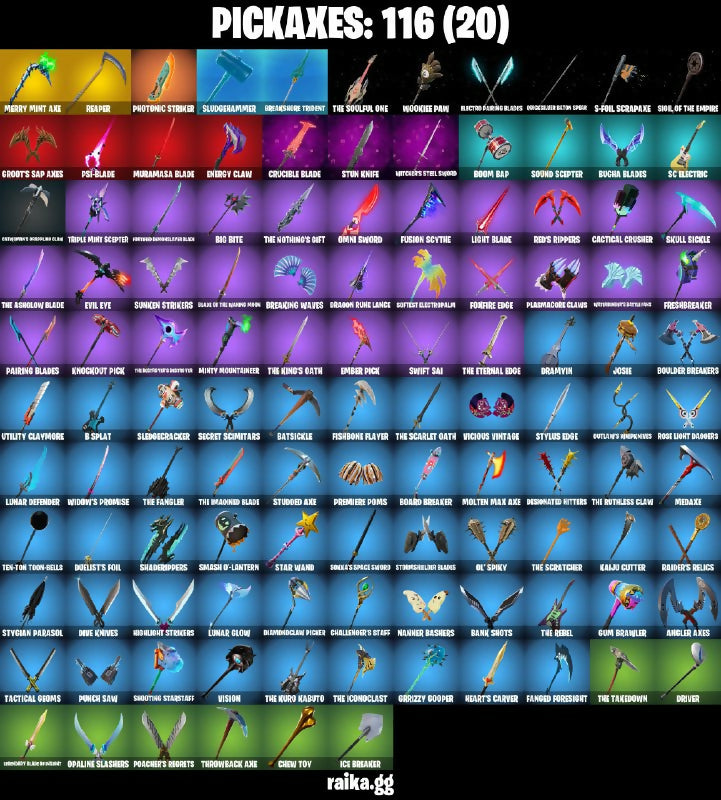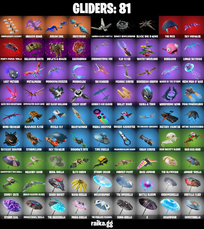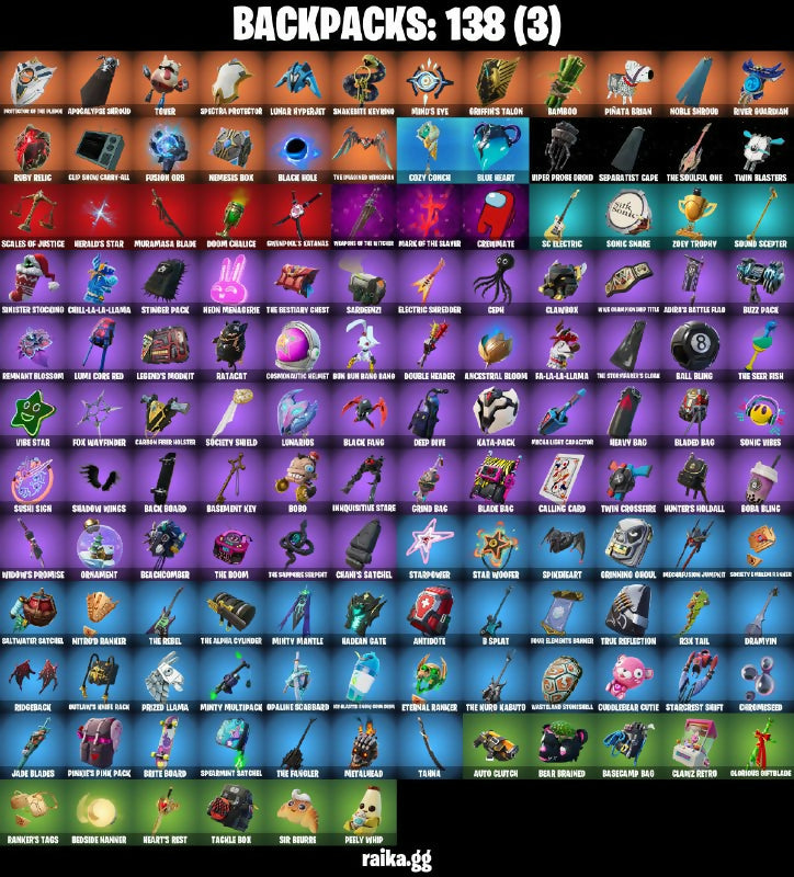 8-Ball vs Scratch, 86 Splat, Adira, Adira (Battle Mask), Adira’s Battle Flag, Adonis Creed, Alto, Ancestral Bloom, Anderson .Paak, Angler Axes, Antidote, Aphrodite, Apocalypse Shroud, Arctic Adeline, Articulated Blade Wing, Astro Armor, Auto Clutch, Avatar's Flourish, B Splat, Back Board, Backlash, Balance Board, Balanced, Ball Bling, Bamboo, Bank Shots, Base Jumper, Basecamp Bag, Basement Key, Batsickle, Battle Bloom, Battle Board, Bea Chomber, Beach Bomber, Bear Brained, Bedside Manner, Beerus, Big Bite, Billy Bounce, Birdie, Black Fang, Black Hole, Black One X-Wing, Blade Bag, Bladed Bag, Blades Of The Waning Moon, Blowin' Up, Blue Heart, Board Breaker, Boba Bling, Boba Snack, Bobo, Boing!, Boogie Down, Boom Bap, Boulder Breakers, Breaking Waves, Bring It Around, Bruno Mars, Bubbloon, Bugha, Bugha Blades, Build Up, Bullen Brawler Dusty, Bullet Rider, Bun Bun Band Band, Burning Ambition Valeria, Buzz Pack, Bytes, Bytes (Lone Traveler), Cacodemon, Cactical Crusher, Call Me, Called Shot, Calling Card, Cameo vs Chic, Carbon Fiber Holster, Card Drop, Cerberus, Chain Surfer, Challenger's Staff, Chani, Chef's Special, Chew Toy, Chilli-La-La-Llama, Chrome Punk, Chrome Seed, Chromebrella, Chromestruck Fire, Clawbox, Clean Sweep, Clean’s Satchel, Clip Show Cherry-Kill, Cloaked Shadow, Club President Helsie, Cometbrella, Comfy Cats, Commander's Descent, Competitor's Time Brella, Cosmonautic Helmet, Cozy Crunch, Crazy Eight, Crewmate, Crowning Achievement, Crowpole’s Katana’s, Crucible Blade, Cthulhu Purple Dragon Claw Claw, Cuddlebeary Cutie, Curling Iron, Customized Captain, Cyclo Curl, Darth Vader, Deep Dive, Delivery Diver, Diamond Throne, Diamondclaw Picker, Dissonated Ritters, Distraction Dance, Dive Knives, Doom Chalice, Doom Slayer, Double Header, Downpour, Doze Dab, Dragon Rider, Dragon Rune Lance, Dramyin, Driver, Droop, Duelist's Foil, Dusty, Dusty Daredevil, Echo, Electric Shredder, Electro Daring Blades, Elite Servo, Ember Pick, Empress Fan Dance, Energy Claw, Espy, Eternal Ranker, Evie, Evie (Summer Strider), Evil Eye, Expressionism, Fa-La-La-Llama, Fancy Peter Griffin, Fanged Foresight, Fishbone Flayer, Fishstick, Flapjack Flyer, Flip Flyer, Flippin' Away, Flow, Foil Flex, Fortilla Flier, Fortnite Bambelleaf Paw, Foundational Brella, Fox Wayfinder, Foxfire Edge, Freedom Wheels, Fresh Aura, Freshbreaker, Frostburn, Fusion, Fusion Orb, Fusion Scythe, Geralt of Rivia, Get Griddy, Ghoul Trooper, Glanz Retro, Globe Shaker, Glorious Outblade, Gothic Shadesoarer, Grand Glacier Glider, Griffins Talon, Grind Bag, Grinning Ghoul, Grizzly Gooper, Groot's Sap Axes, Groovejawer Baton Spear, Grriz, Guff Gringle, Gum Brawler, Gunn-Brella, Gunnar, Hadean Gate, Har-Har-Har!, Haze, Heart's Carver, Heartwinder, Heart’s Rest, Heavy Bag, Helsie, Herald’s Star, Heroes Hunter Hoodie, High Five, High Society Glider, Highlight Strikers, Highwire, Holiday Boxy, Holographic, Hope, Hot Slurp Balloon, Hula Hoopin', Hunter’s Holdall, Hypnot-Eyes, I'm A Mystery, Ice Breaker, Ignisign, Ikonik, Imani, Imperial March, Infield Fly, Inflate-A-Roach, Inquisitive Stare, Iridia Vayne, Iron Menagerie, It Is Finished, It's... You?, Jade Blades, John Cena, Joni The Red, Joni The Red (Blue-Blood), Josie, Journey vs Hazzard, Junker Brella, Kaiju Cutter, Kata Tech Burstwing, Kata-Pack, Kaws Skeleton, Knife Sharpener, Knockout Pick, Korra, Korra's Air Glider, Lambda-Class Shuttle, Laser Focused, Legend’s Modkit, Lennox Rose, Light Blade, Lil' Prancer, Lost Meteor, Love It!, Loveless, Lumi Core Red, Lunar Defender, Lunar Glow, Lunar Hyperjust, Lunar Party, Lunar Skyspan, Lunarios, Magmatic Mizuki, Magnorepulsor Board, Make A Seat, Malik, Malik (Solitary Defender), Manic, Mark of the Slayer, Massai, Match Point, Mecha Strike Commander, MechaFusion Jumpkit, Medaxe, Mega-Brella, Meow Skulls, Merry Mint Axe, Metalhead, Metamark, Midas’s Eye, Mighty Marvel Brella, Min-Joon, Mina Park, Mini Dogfight, Mini Elements Banner, Mini Slayer Postump, Minty Bomber, Minty Mountaineer, Minty Multipack, Misty Mantle, Mizuki, Molten Max Axe, Montague, Moonbow Breezer, Moonguide, Muramasa Blade, My Cabbages!, Mystica, Nana-Brella, Nanner Bashers, Needle Dropper, Nemesis Box, Neon Man O' War, Nezumi, Ninja Stance: Donnie, Ninja Stance: Leo, Nisha, Nitebeam, Nitro’d Ranker, Noble Shroud, Ol' Spiky, Omg I Love It, Omni Sword, On Your Marks..., Opaline Scabbard, Opaline Slashers, Origami Battalion, Orin, Ornament, Oscar, Outlaw's Whipknives, Outlaw’s Dhole Pack, P.A.N.D.A Team Leader, PJ, Pairing Blades, Paradigm (Reality-659), Party Star, Peely Whip, Perfect Pivot, Peter Griffin, Phaedra, Phantasm, Photonic Striker, Pinata Brian, Pinkie, Pinkie’s Pink Pack, Plasma Core Claws, Poacher's Regrets, Poet, Poised Playmaker, Poseidon, Premiere Poms, Prized Llama, Prowler, Psi-Blade, Psion Coil, Psionic Surfer, Pumpkin Pie Thrower, Punch Saw, Punk Powerglider, R3X Tail, Rage Quit, Raider's Relics, Rankers Tags, Ratacat Roamer, Ratcat, Raven's Legion, Reaper, Rebel Brella, Recon Champion, Red Claw, Red Strike, Red's Rippers, Red-Nosed Raider, Remedy vs Toxin, Remnant Blossom, Renegade, Renzo The Destroyer, Respect The Peace, Ridgeback, Rippley vs Sludge, River Guardian, Rococo Cloak-O, Rose Light Daggers, Rough Cut Montague, Ruby Relic, Runway Racer, S-Foil Scrapaxe, SC Electric, Sabina, Sabina (Ponytail), Safety & Builder Harness, Saltwater Satchel, Salvaged Chute, Sardinez, Scales of Justice, Scenario, Scratch (Virus), Seashore Trident, Secret Scimitars, Selene, Senate Repulsorpod, Separatist Cape, Seven Signet, Shadebox, Shaderippers, Shadow Wings, Shadow's Bite, Sharpshooter, Shock Brawler Oscar, Shooting Starstaff, Shuriken Spinner, Sigil Of The Empire, Silver Surfer, Sing Along, Sinister Stocking, Sir Burps, Skellemint Oro, Skull Sickle, Skull-A-Tron, Sky Prowler, Sky Trawler, Skycarver, Slayer Charlotte, Sled Ready Guff, Sledgecracker, Sludgehammer, Slurpentine, Smash O-Lantern, Snakesbit Keyring, Snap, Snorkel Ops, So Square, S