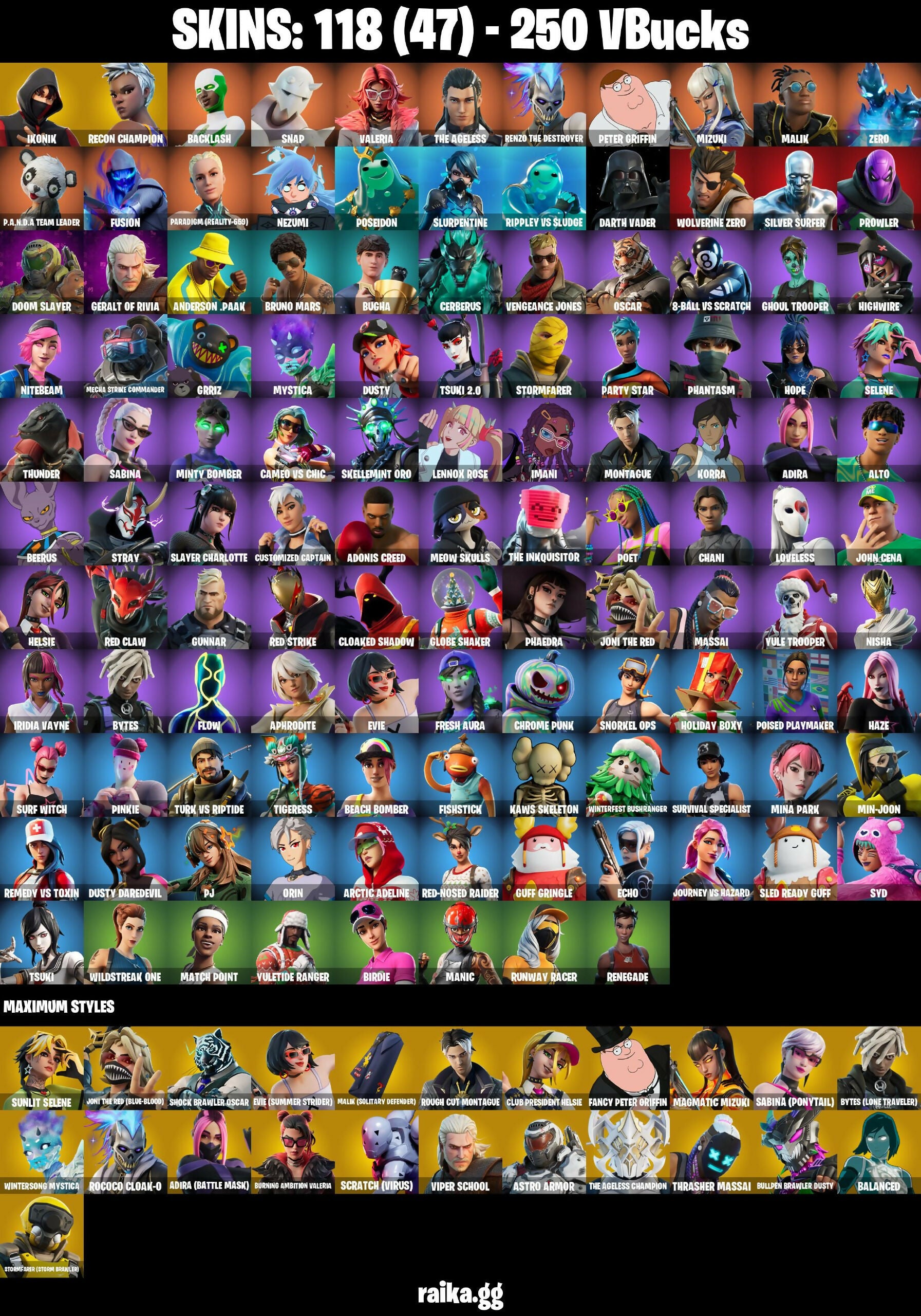 118 skins | IKONIK | Recon Champion | Backlash | Snap | Valeria | The Ageless | Renzo the Destroyer | Peter Griffin | Mizuki | Malik | Zero | 250 VB