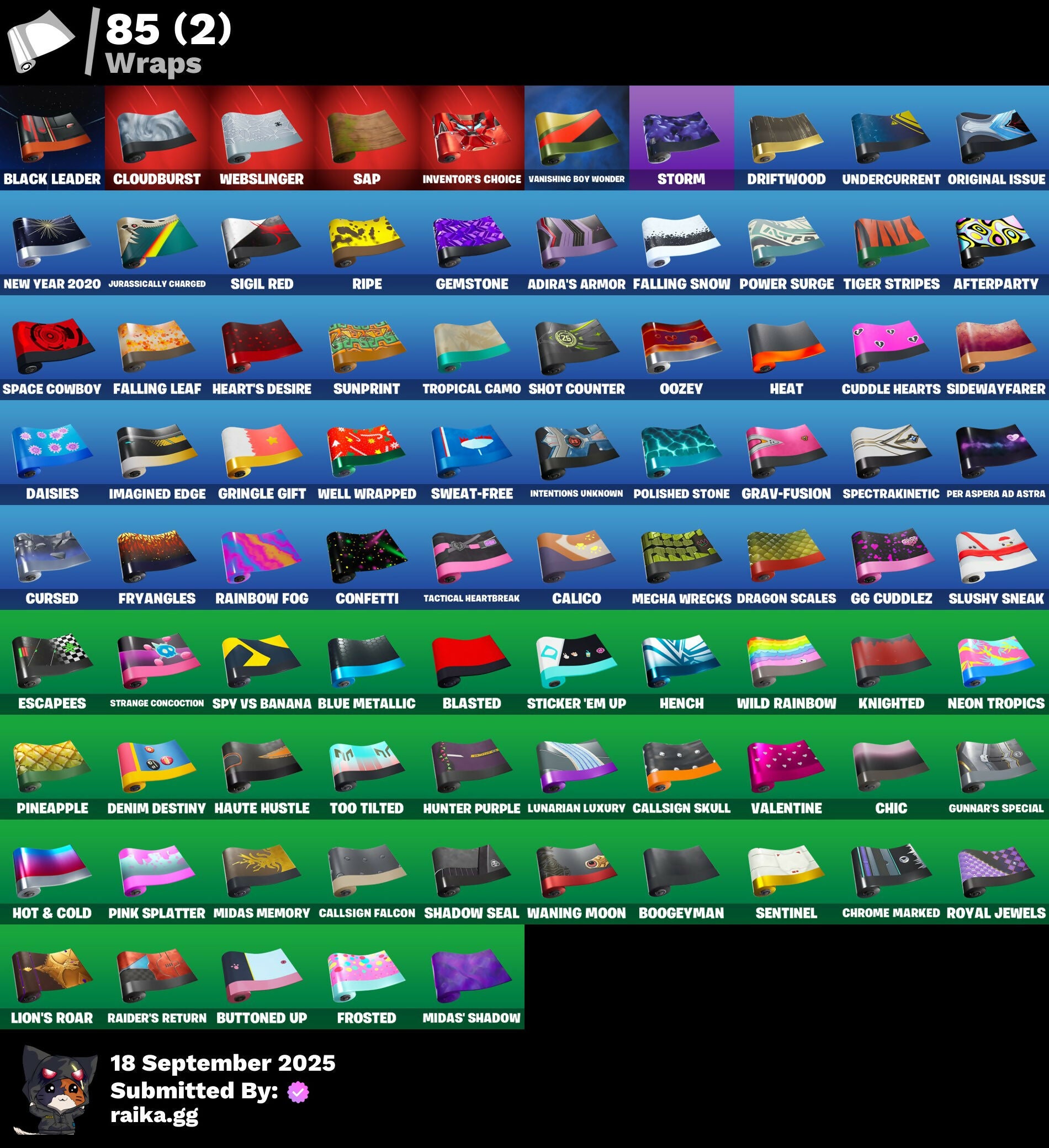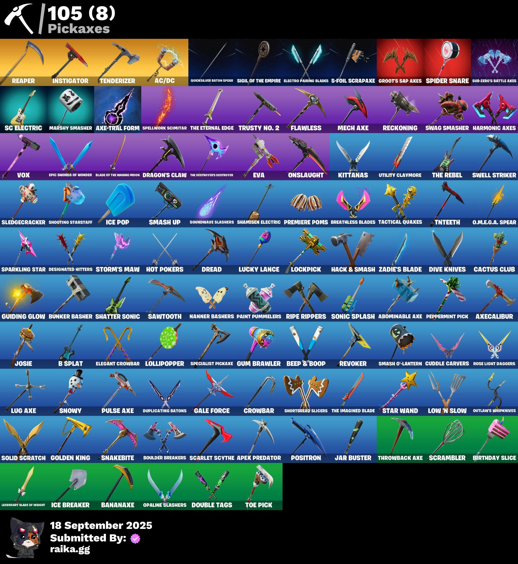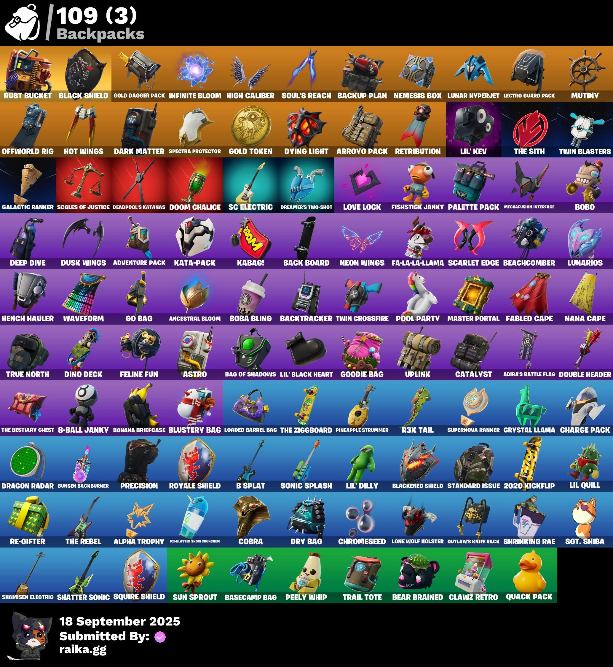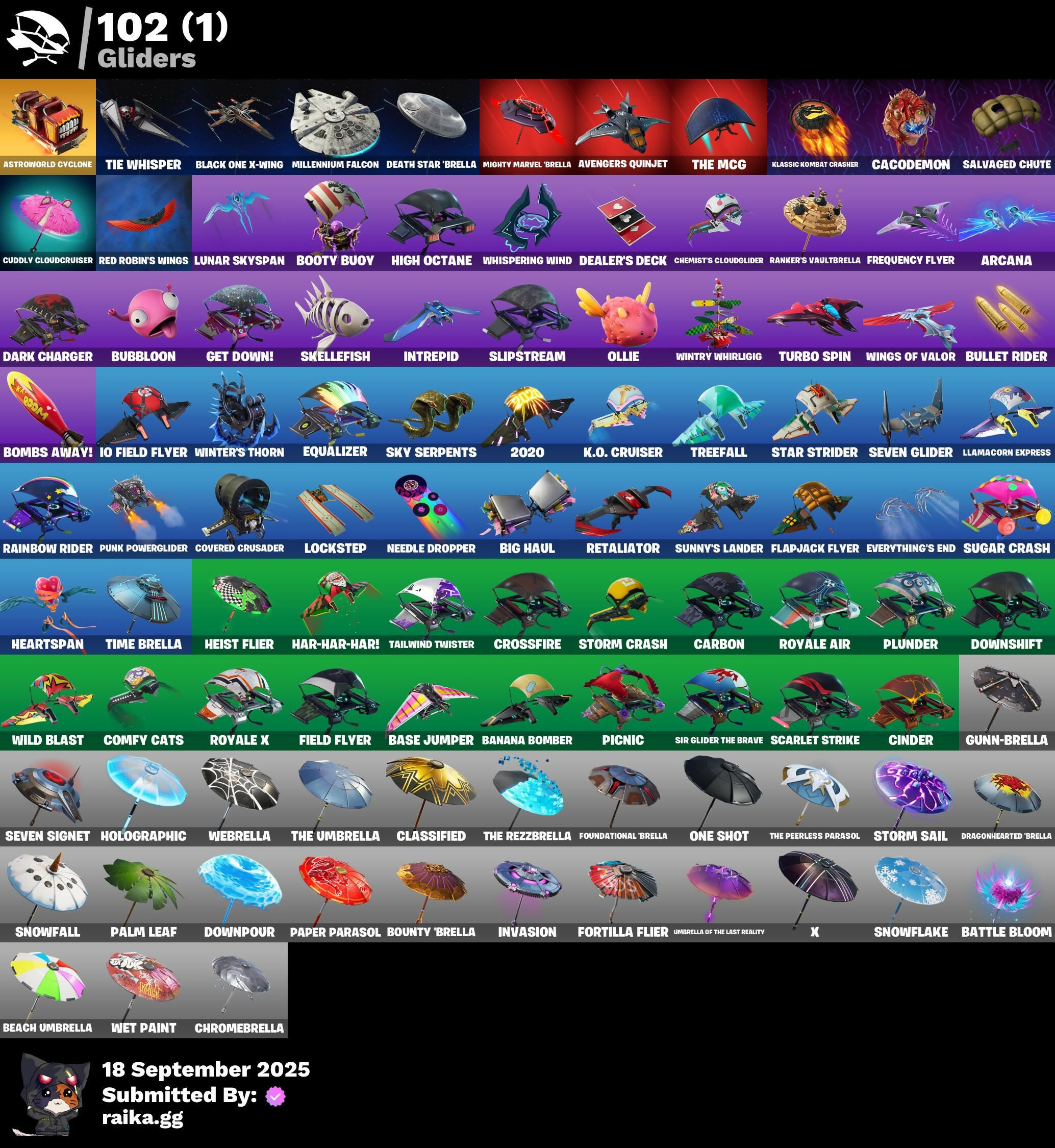 2020, 2020 Kickflip, 8-Ball, 8-Ball Janky, A Warrior Prepares, A.L.T.E.R., Abominable Axe, Abstract, Ac/Dc, Adira's Armor, Adira's Battle Flag, Adventure Pack, Aerial, Afterparty, Agent Jones, Agent Nana, Agent Peely, Alpha Trophy, Ancestral Bloom, Apex Predator, Arcana, Arctic Achiever, Arctic Adeline, Ark, Arrow, Arroyo Pack, Astro, Astro Antidote, Astro Jack, Astroworld Cyclone, Avengers, Avengers Logo, Avengers Quinjet, Axe-Tral Form, Axecalibur, Axo's Big Moment, B Splat, Back Board, Backtracker, Backup Plan, Bacon, Bag Of Shadows, Banana Bomber, Banana Briefcase, Bananaxe, Banner, Banner Icon, Baron Kane, Baron's Hoard, Base Jumper, Basecamp Bag, Bat, Batman, Battle Bloom, Battle Call, Battle Mode, Battlehawk, Beach Chair, Beach Umbrella, Beachcomber, Bear Brained, Bee, Beep & Boop, Beep Beep, Best Mates, Big Guns, Big Haul, Billy Bounce, Birthday Slice, Black Knight, Black Leader, Black One X-Wing, Black Shield, Blackened Shield, Blackheart, Blackheart (Stage 8), Blade Of The Waning Moon, Blasted, Blue Metallic, Blue Squire, Blustery Bag, Boba Bling, Bobo, Bombs Away!, Bone, Boobytrapped, Boogeyman, Boogie Down, Boosting Ki, Booty Buoy, Bot, Both Eyes Open, Boulder Breakers, Bounty 'Brella, Bow, Bowling, Breathless Blades, Bring It Around, Brite Bomber, Brood, Brutus, Bubbloon, Bullet Rider, Bunker Basher, Bunker Jonesy, Bunsen Backburner, Bush, Bush Peek, Buttoned Up, Bytes' Sigil, Cacodemon, Cactus Club, Cactus Maze, Cake, Calamity, Calamity Stage 5, Calculated, Calico, Call Me, Callsign Falcon, Callsign Skull, Camera, Campfire, Captain America's Shield, Carbide, Carbide Armor Stage 5, Carbon, Carbon Fiber, Cash Grab, Cat Soldier, Catalyst, Chains, Chalk Outline, Charge Pack, Charlotte's Logo, Chemist's Cloudglider, Chic, Chick, Chillshot, Chomp Cud!!, Choppy, Chrome Marked, Chrome Punk, Chromebrella, Chromeseed, Cinder, Circle, Classified, Clawz Retro, Clean Sweep, Cloudburst, Cluck Strut, Cobra, Coconuts, Coin Flip, Comet, Comfy Cats, Compass, Confetti, Conga, Controller Crew, Covered Crusader, Cowboy Chat, Crab, Crazy Castle, Crimson Elite, Cross Your Heart, Crossfire, Crosshair, Crowbar, Crystal Llama, Cuddle Carvers, Cuddle Hearts, Cuddles' Garden, Cuddly Bear, Cuddly Cloudcruiser, Cursed, Cyclo Curl, D.C. 63, DJ Yonder, Dagger Dance, Daisies, Dance Mat, Dark Charger, Dark Matter, Dark Voyager, Daughter Of Trigon, Daydream, Deadpool, Deadpool Unmasked, Deadpool's Katanas, Dealer's Deck, Death Star 'Brella, Deep Dive, Deep End, Deku, Demi, Demons Beware, Denim Destiny, Designated Hitters, Dice, Dino Deck, Dinosaur, Dinosaur Skull, Diva's Grin, Dive Knives, Do It!, Doctor Doom, Dog Bowl, Dog Collar, Doom Chalice, Double Header, Double Tags, Downpour, Downshift, Doze Dab, Dr3amin, Dragon, Dragon Radar, Dragon Rune Lances, Dragon Scales, Dragon Spirit, Dragon Stance, Dragon's Claw, Dragonhearted 'Brella, Dread, Dream Feet, Dreamer's Two-Shot, Driftwood, Dropout, Drummies, Dry Bag, Duck, Dupli-Kate, Duplicating Batons, Duplikates, Dusk Knight, Dusk Wings, Dying Light, Dynamite, Dynamo, E.G.O., Eagle, Egg, Electro Pairing Blades, Elegant Crowbar, Elite Agent, Ember, Ember (Night), Epic Swords Of Wonder, Equalizer, Erisa Alert, Escapees, Eva, Everything's End, Everything's Fine, Explosion, Eye Of Agamotto, Fa-La-La-Llama, Fable, Fabled Cape, Falcon, Fallen Love Ranger, Falling Leaf, Falling Snow, Fate, Feline Fun, Fence, Field Flyer, Fierce, Fish Hook, Fishbone, Fishstick Janky, Fizzix, Flail, Flapjack Flyer, Flawless, Flippin' Away, Floating Island, Floss, Fortilla Flier, Foundational 'Brella, Fox, Freestylin', Frequency Flyer, Fright Funk, Frosted, Fryangles, Fusion!, GG Cuddlez, GG Ornament, GG Potion, GG SmileY, GG Snakes, GG Snowman, Galactic Ranker, Gale Force, Game Over, Gameface, Gas Mask, Gear Specialist Maya, Gemstone, Gentleman's Dab, Get Down!, Ghoul Trooper, Giddy-Up, Go Bag, Gold Brutus, Gold Dagger Pack, Gold Midas, Gold Token, Gold Touch, Golden King, Golden Shine, Golden Wolf, Golf Clap, Good Guy, Goodie Bag, Grav-Fusion, Gringle Gift, Groot's Sap Axes, Groove Jam, Groovy!, Grriz, Guggi Was Here, Guiding Glow, Guitar Walk, Gum Brawler, Gumbo, Gunn-Brella, Gunnar's Special, Hack & Smash, Hammerhead, Hand Horns, Happy Cloud, Har-Har-Har!, Harmonic Axes, Haute Hustle, Haven, Havoc, Heart Sign, Heart's Desire, Hearts, Heartspan, Heat, Heavy Metal Omega, Heist Flier, Hello Friend, Hemlock, Hench, Hench Hauler, Hero Emblem, High Caliber, High Octane, Holographic, Hoop Master, Hootenanny, Hot & Cold, Hot Marat, Hot Pokers, Hot Wings, Howl, Hunter Purple, Hybrid, Hybrid (Stage 4), Hype, Hype!, Hypnot-Eyes, I Declare!, Ice Breaker, Ice Cream, Ice Pop, Ice-Blasted Snow Crunchem, Ikonik, Imagined Edge, Imagined Order, Imperial March, In Her Sights, Infinite Bloom, Infinity Blade, Infinity Gauntlet, Instigator, Intentions Unknown, Intrepid, Invasion, Inventor's Choice, Io Field Flyer, It Is Finished, It's Go Time!, It's... You?, Jar Buster, Jellyfish, Jolly Roger, Josie, Jubilation, Jump Jets, Jungle Scout, Jurassically Charged, K.O. Cruiser, Kabag!, Kaboom!, Kata-Pack, Keep It Mello, Kenshi Yonezu, Killswitch Ready, King's Wrath, Kiss, Kit, Kittanas, Klassic Kombat Crasher, Knight's Helm, Knight's Honor, Knighted, Kymera Swarm, Laguna, Laid Back Shuffle, Last Forever, Laugh It Up, Lectro Guard Pack, Legendary Blade Of Insight, Lightning, Lil Quill, Lil' Black Heart, Lil' Dilly, Lil' Kev, Lil' Prancer, Lion Herald, Lion's Roar, Llama De Muertos, Llamacorn Express, Loaded Barrel Bag, Lobby Classic, Lockpick, Lockstep, Log, Lollipopper, Lone Wolf Holster, Looted, Lord Vader, Love, Love It!, Love Lock, Love Ranger, Low 'N Slow, Lt. Evergreen, Lucky Lance, Lug Axe, Luke, Lunar Hyperjet, Lunar Skyspan, Lunarian Luxury, Lunarios, Luxe, Luxe (Gold Clothing), Mad Mask, Mandala Disc, Manhole Cover, Mark Of The Champion, Marshy Smasher, Mask, Master Key, Master Key (Masked), Master Portal, Mech Axe, Mecha Team Banner, Mecha Wrecks, Mechafusion Interface, Mello Made It Right, Melting Sn