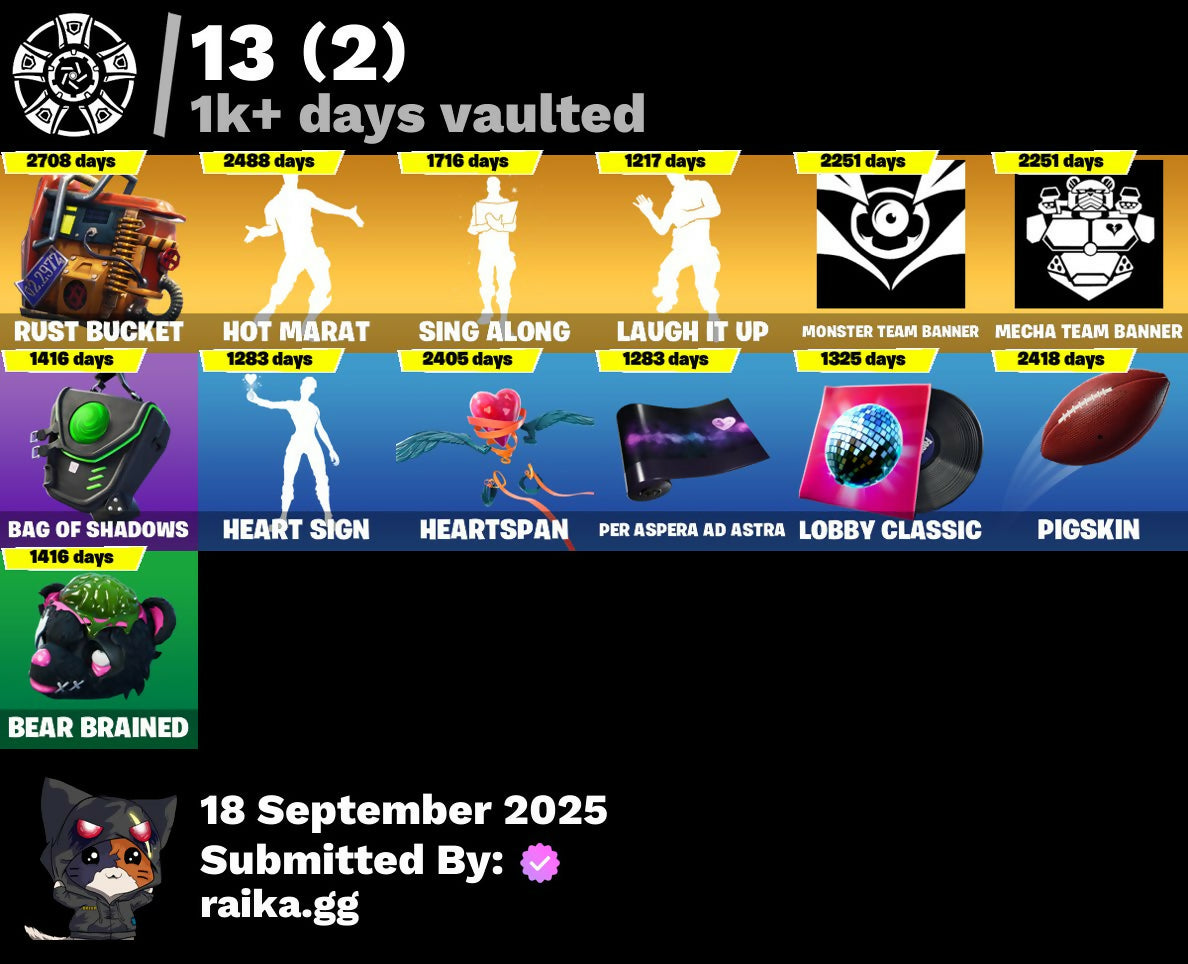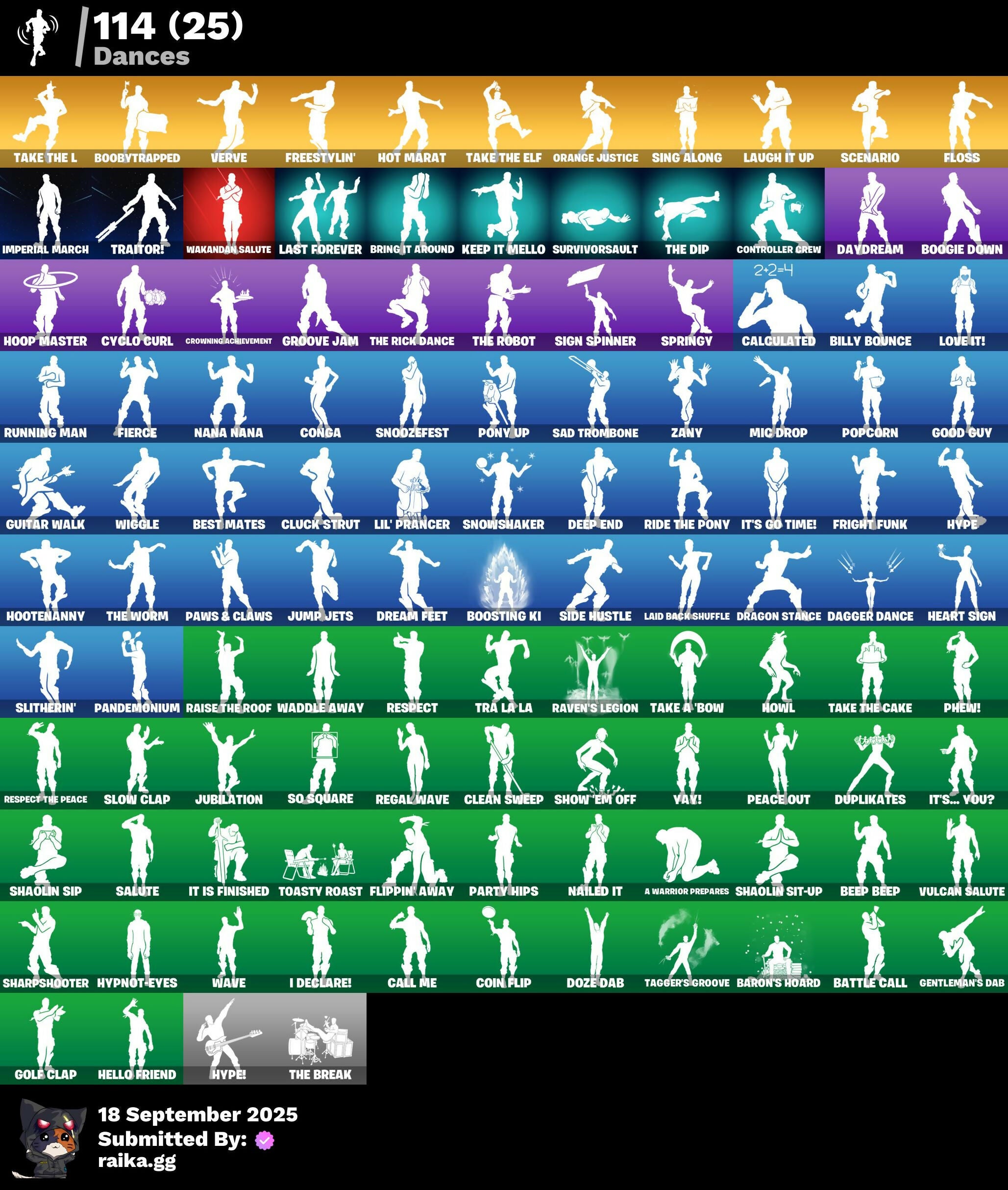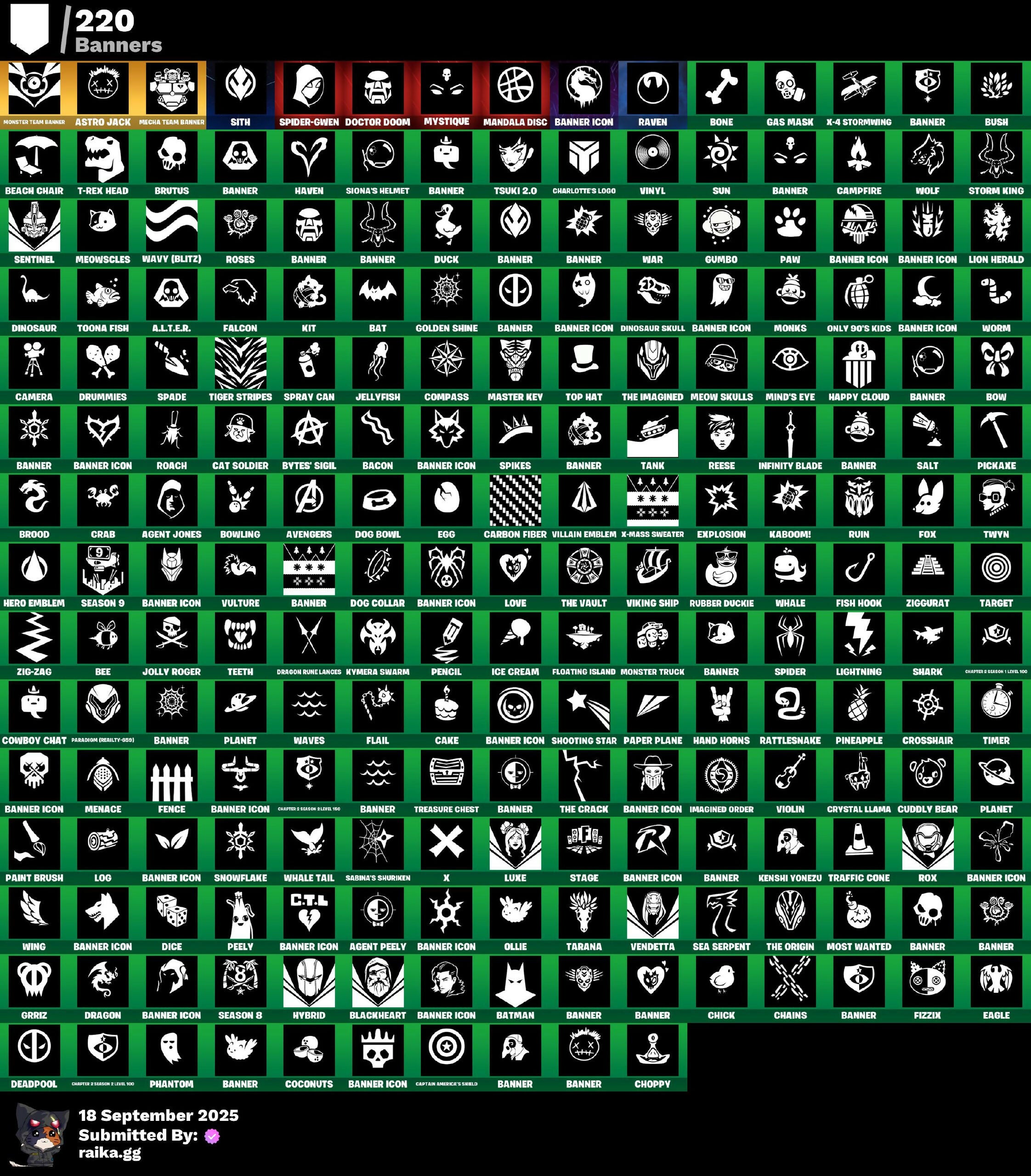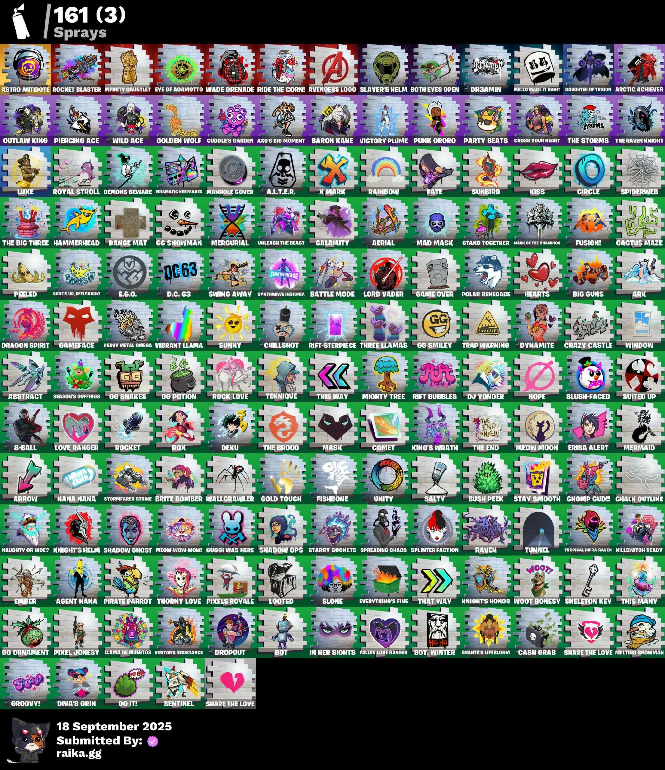 2020, 2020 Kickflip, 8-Ball, 8-Ball Janky, A Warrior Prepares, A.L.T.E.R., Abominable Axe, Abstract, Ac/Dc, Adira's Armor, Adira's Battle Flag, Adventure Pack, Aerial, Afterparty, Agent Jones, Agent Nana, Agent Peely, Alpha Trophy, Ancestral Bloom, Apex Predator, Arcana, Arctic Achiever, Arctic Adeline, Ark, Arrow, Arroyo Pack, Astro, Astro Antidote, Astro Jack, Astroworld Cyclone, Avengers, Avengers Logo, Avengers Quinjet, Axe-Tral Form, Axecalibur, Axo's Big Moment, B Splat, Back Board, Backtracker, Backup Plan, Bacon, Bag Of Shadows, Banana Bomber, Banana Briefcase, Bananaxe, Banner, Banner Icon, Baron Kane, Baron's Hoard, Base Jumper, Basecamp Bag, Bat, Batman, Battle Bloom, Battle Call, Battle Mode, Battlehawk, Beach Chair, Beach Umbrella, Beachcomber, Bear Brained, Bee, Beep & Boop, Beep Beep, Best Mates, Big Guns, Big Haul, Billy Bounce, Birthday Slice, Black Knight, Black Leader, Black One X-Wing, Black Shield, Blackened Shield, Blackheart, Blackheart (Stage 8), Blade Of The Waning Moon, Blasted, Blue Metallic, Blue Squire, Blustery Bag, Boba Bling, Bobo, Bombs Away!, Bone, Boobytrapped, Boogeyman, Boogie Down, Boosting Ki, Booty Buoy, Bot, Both Eyes Open, Boulder Breakers, Bounty 'Brella, Bow, Bowling, Breathless Blades, Bring It Around, Brite Bomber, Brood, Brutus, Bubbloon, Bullet Rider, Bunker Basher, Bunker Jonesy, Bunsen Backburner, Bush, Bush Peek, Buttoned Up, Bytes' Sigil, Cacodemon, Cactus Club, Cactus Maze, Cake, Calamity, Calamity Stage 5, Calculated, Calico, Call Me, Callsign Falcon, Callsign Skull, Camera, Campfire, Captain America's Shield, Carbide, Carbide Armor Stage 5, Carbon, Carbon Fiber, Cash Grab, Cat Soldier, Catalyst, Chains, Chalk Outline, Charge Pack, Charlotte's Logo, Chemist's Cloudglider, Chic, Chick, Chillshot, Chomp Cud!!, Choppy, Chrome Marked, Chrome Punk, Chromebrella, Chromeseed, Cinder, Circle, Classified, Clawz Retro, Clean Sweep, Cloudburst, Cluck Strut, Cobra, Coconuts, Coin Flip, Comet, Comfy Cats, Compass, Confetti, Conga, Controller Crew, Covered Crusader, Cowboy Chat, Crab, Crazy Castle, Crimson Elite, Cross Your Heart, Crossfire, Crosshair, Crowbar, Crystal Llama, Cuddle Carvers, Cuddle Hearts, Cuddles' Garden, Cuddly Bear, Cuddly Cloudcruiser, Cursed, Cyclo Curl, D.C. 63, DJ Yonder, Dagger Dance, Daisies, Dance Mat, Dark Charger, Dark Matter, Dark Voyager, Daughter Of Trigon, Daydream, Deadpool, Deadpool Unmasked, Deadpool's Katanas, Dealer's Deck, Death Star 'Brella, Deep Dive, Deep End, Deku, Demi, Demons Beware, Denim Destiny, Designated Hitters, Dice, Dino Deck, Dinosaur, Dinosaur Skull, Diva's Grin, Dive Knives, Do It!, Doctor Doom, Dog Bowl, Dog Collar, Doom Chalice, Double Header, Double Tags, Downpour, Downshift, Doze Dab, Dr3amin, Dragon, Dragon Radar, Dragon Rune Lances, Dragon Scales, Dragon Spirit, Dragon Stance, Dragon's Claw, Dragonhearted 'Brella, Dread, Dream Feet, Dreamer's Two-Shot, Driftwood, Dropout, Drummies, Dry Bag, Duck, Dupli-Kate, Duplicating Batons, Duplikates, Dusk Knight, Dusk Wings, Dying Light, Dynamite, Dynamo, E.G.O., Eagle, Egg, Electro Pairing Blades, Elegant Crowbar, Elite Agent, Ember, Ember (Night), Epic Swords Of Wonder, Equalizer, Erisa Alert, Escapees, Eva, Everything's End, Everything's Fine, Explosion, Eye Of Agamotto, Fa-La-La-Llama, Fable, Fabled Cape, Falcon, Fallen Love Ranger, Falling Leaf, Falling Snow, Fate, Feline Fun, Fence, Field Flyer, Fierce, Fish Hook, Fishbone, Fishstick Janky, Fizzix, Flail, Flapjack Flyer, Flawless, Flippin' Away, Floating Island, Floss, Fortilla Flier, Foundational 'Brella, Fox, Freestylin', Frequency Flyer, Fright Funk, Frosted, Fryangles, Fusion!, GG Cuddlez, GG Ornament, GG Potion, GG SmileY, GG Snakes, GG Snowman, Galactic Ranker, Gale Force, Game Over, Gameface, Gas Mask, Gear Specialist Maya, Gemstone, Gentleman's Dab, Get Down!, Ghoul Trooper, Giddy-Up, Go Bag, Gold Brutus, Gold Dagger Pack, Gold Midas, Gold Token, Gold Touch, Golden King, Golden Shine, Golden Wolf, Golf Clap, Good Guy, Goodie Bag, Grav-Fusion, Gringle Gift, Groot's Sap Axes, Groove Jam, Groovy!, Grriz, Guggi Was Here, Guiding Glow, Guitar Walk, Gum Brawler, Gumbo, Gunn-Brella, Gunnar's Special, Hack & Smash, Hammerhead, Hand Horns, Happy Cloud, Har-Har-Har!, Harmonic Axes, Haute Hustle, Haven, Havoc, Heart Sign, Heart's Desire, Hearts, Heartspan, Heat, Heavy Metal Omega, Heist Flier, Hello Friend, Hemlock, Hench, Hench Hauler, Hero Emblem, High Caliber, High Octane, Holographic, Hoop Master, Hootenanny, Hot & Cold, Hot Marat, Hot Pokers, Hot Wings, Howl, Hunter Purple, Hybrid, Hybrid (Stage 4), Hype, Hype!, Hypnot-Eyes, I Declare!, Ice Breaker, Ice Cream, Ice Pop, Ice-Blasted Snow Crunchem, Ikonik, Imagined Edge, Imagined Order, Imperial March, In Her Sights, Infinite Bloom, Infinity Blade, Infinity Gauntlet, Instigator, Intentions Unknown, Intrepid, Invasion, Inventor's Choice, Io Field Flyer, It Is Finished, It's Go Time!, It's... You?, Jar Buster, Jellyfish, Jolly Roger, Josie, Jubilation, Jump Jets, Jungle Scout, Jurassically Charged, K.O. Cruiser, Kabag!, Kaboom!, Kata-Pack, Keep It Mello, Kenshi Yonezu, Killswitch Ready, King's Wrath, Kiss, Kit, Kittanas, Klassic Kombat Crasher, Knight's Helm, Knight's Honor, Knighted, Kymera Swarm, Laguna, Laid Back Shuffle, Last Forever, Laugh It Up, Lectro Guard Pack, Legendary Blade Of Insight, Lightning, Lil Quill, Lil' Black Heart, Lil' Dilly, Lil' Kev, Lil' Prancer, Lion Herald, Lion's Roar, Llama De Muertos, Llamacorn Express, Loaded Barrel Bag, Lobby Classic, Lockpick, Lockstep, Log, Lollipopper, Lone Wolf Holster, Looted, Lord Vader, Love, Love It!, Love Lock, Love Ranger, Low 'N Slow, Lt. Evergreen, Lucky Lance, Lug Axe, Luke, Lunar Hyperjet, Lunar Skyspan, Lunarian Luxury, Lunarios, Luxe, Luxe (Gold Clothing), Mad Mask, Mandala Disc, Manhole Cover, Mark Of The Champion, Marshy Smasher, Mask, Master Key, Master Key (Masked), Master Portal, Mech Axe, Mecha Team Banner, Mecha Wrecks, Mechafusion Interface, Mello Made It Right, Melting Sn