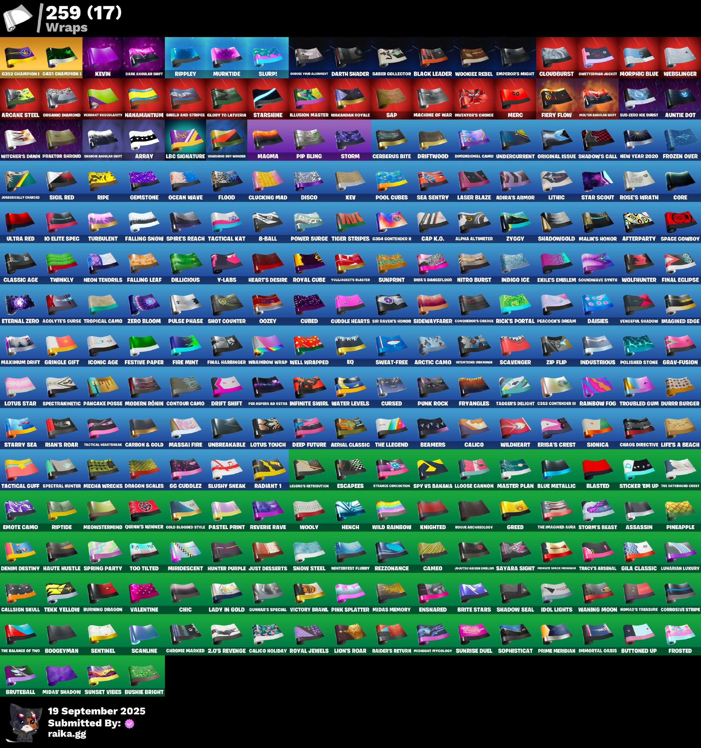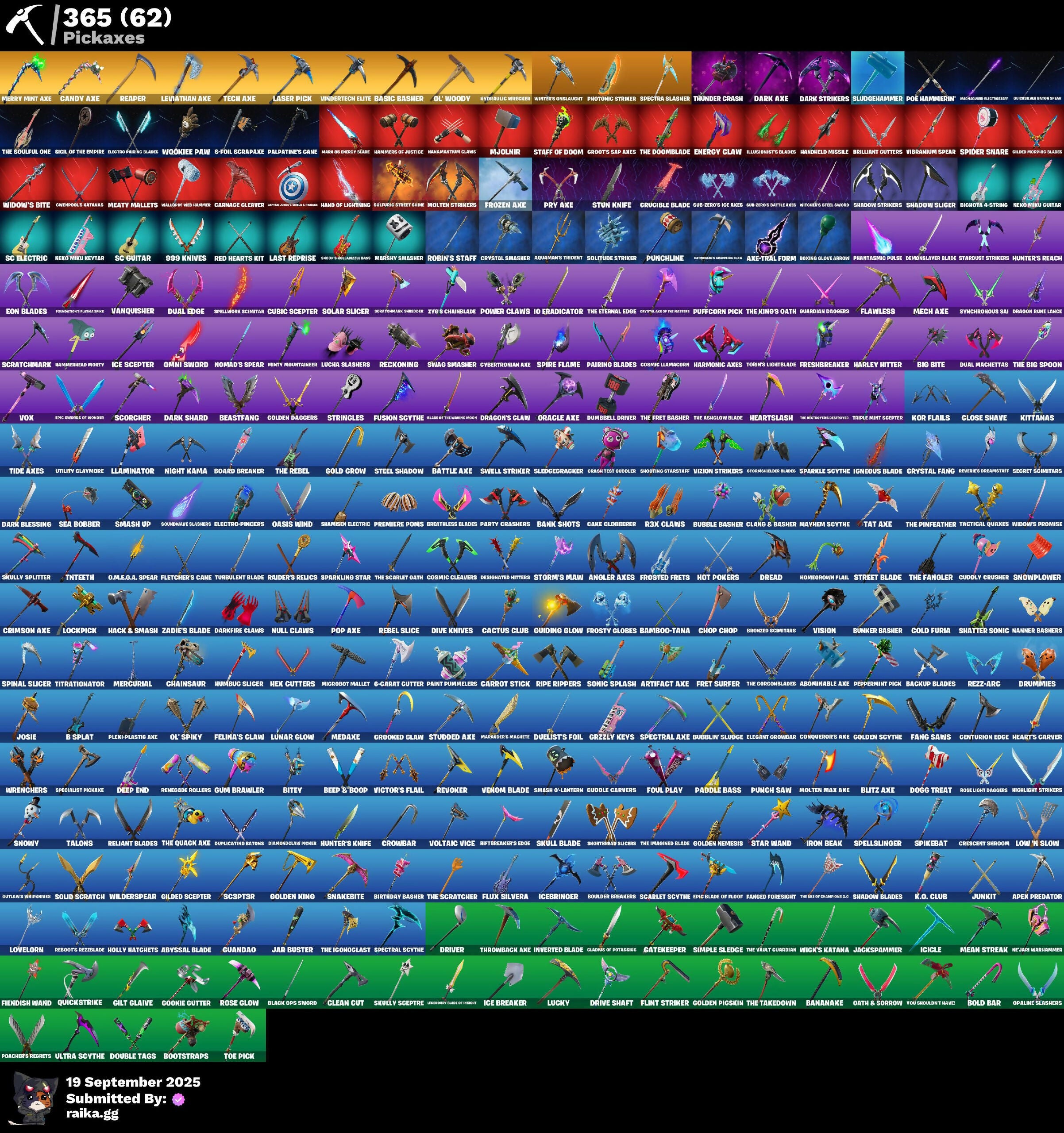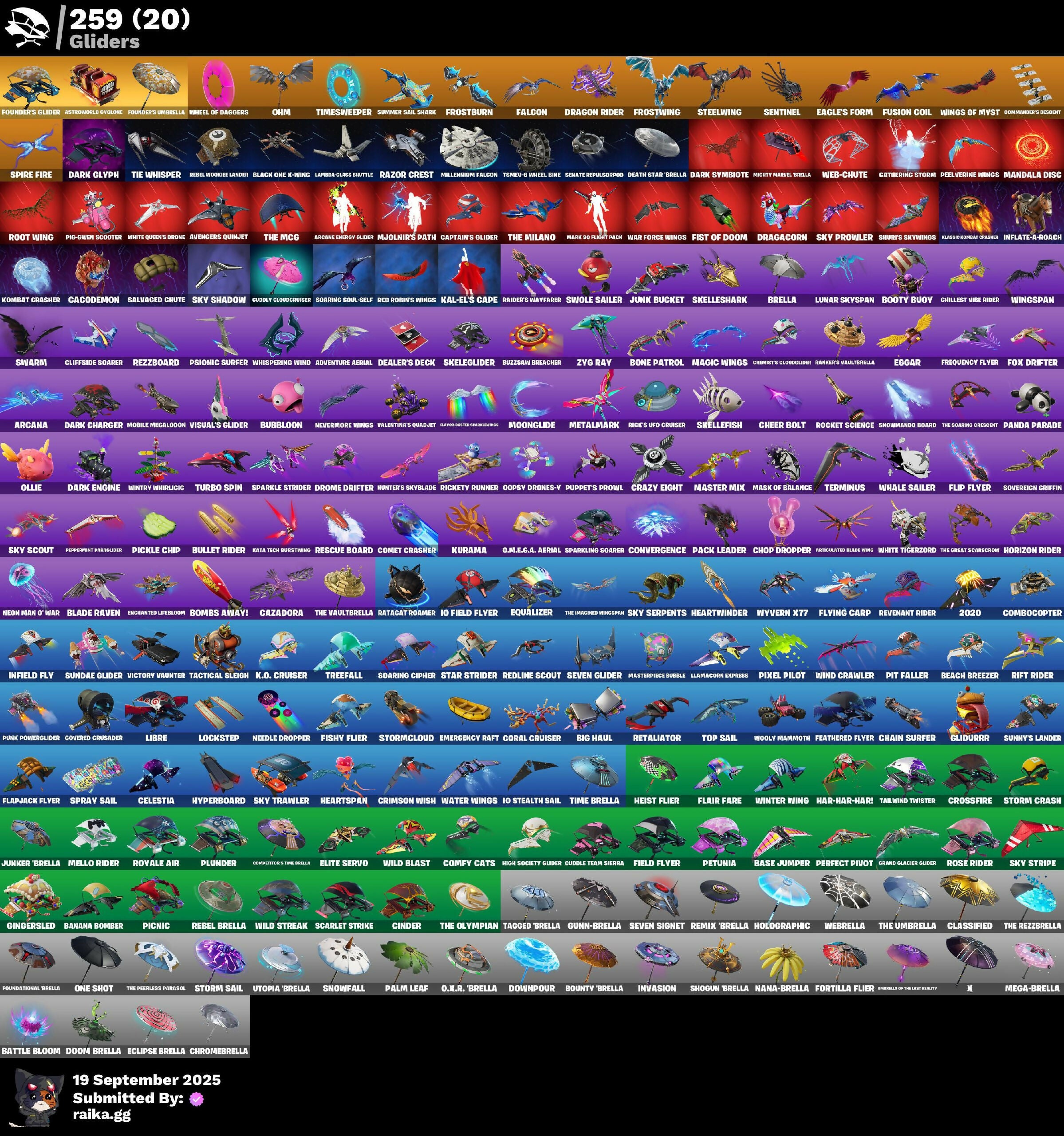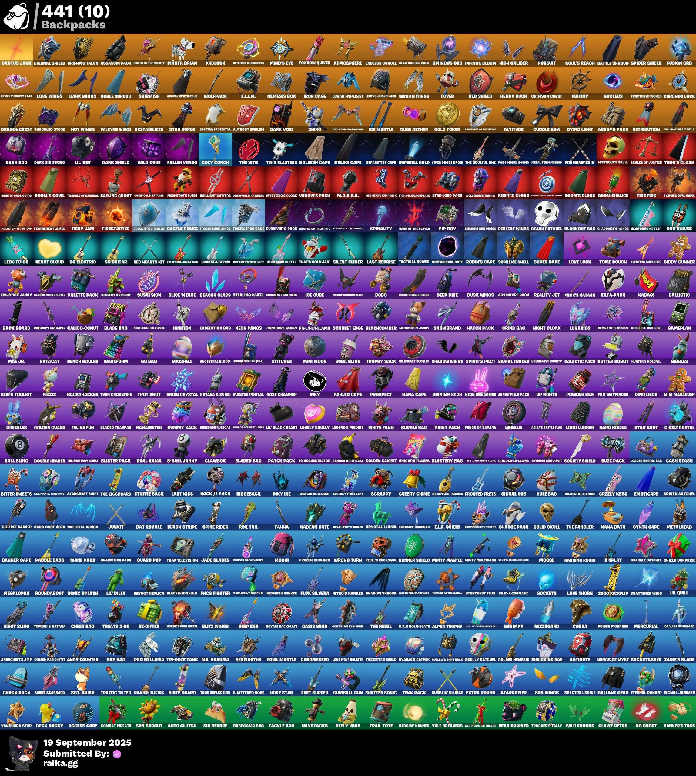 (Snikti), 01 Optimus Prime, 10 Field Flyer, 10 Stealth Sail, 2.0's Revenge, 2020, 2020 Kickflip, 2022, 6-Carat Cutter, 8-Ball, 8-Ball Janky, 9-Ball vs Scratch, 909 Knives, 999 Knives, A Warrior Prepares, A.I.M., A.L.T.E.R., Abduction, Abominable Axe, AbseNz, Abyssal Blade, Access Core, Ace Pilot Poe, Acolyte's Curse, Adira, Adira (Battle Mask), Adira's Armor, Adira's Battle Flag, Adventure Aerial, Adventure Pack, Aerial, Aerial Classic, Aerial Swagger, Afterparty, Agent Jones, Agent Jones (Jump 31), Agent Nana, Agent Peely, Air Shredder, Alpha Altimeter, Alpha Trophy, Altitude, Anarchist's Amp, Ancestral Bloom, Angler Axes, Angry Counter, Anomaly Rifts, Antidote, Apex Predator, Apocalypse Shroud, Appeeling Drive, Apprentice Evie, Aquaman, Aquaman’s Trident, Arcana, Arcane Energy Glider, Arcane Research, Arcane Steel, Arctic Adeline, Arctic Camo, Ark, Array, Arroyo Pack, Artemis and Gus's Reminder, Articulated Blade Wing, Artifact Axe, Ascension Nezumi, Aspen, Assassin, Assassin Pack, Assault Trooper, Astra, Astro Antidote, Astro Armor, Astro Jack, Astroworld Cyclone, Atmosphere, Auntie Dot, Aura, Auto Clutch, Autobot Emblem, Avengers, Avengers Logo, Avengers Quinjets, Aw, Shucks., Axe-Trail Form, Axo's Big Moment, Ayla Winn, Azarath Mightiest Wonder, B Splat, B-Splat, B.R.U.T.E. Competitor, B.R.U.T.E. Gunner, Bachii, Back Board, Backstabber, Backtracker, Backup Blades, Bacon, Bad Guy, Bag Of Coal, Baited, Balance Board, Ball Bling, Ballistic, Bamboo-Tana, Banana Bomber, Banana Briefcase, Bananas, Bananaxe, Bank Shots, Banker’s Vaultbrella, Banner, Banner Cape, Banner Icon, Banner Shield, Banner Trooper, Baron Kane, Baron's Hoard, Base Jumper, Baseball, Basecamp Bag, Basic Basher, Bat, Bat Royale, Bat Signal, Batarang, Batman, Battle Axe, Battle Bloom, Battle Mode, Battle Ready Era, Battle Ready Poe, Battle Shroud, Bawk Off, Be Seeing You, Beach Bomber, Beach Breezer, Beach Chair, Beachcomber, Beacon Glass, Beamers, Bean Bag, Bear Brained, Beastfang, Beatbox, Bedside Banner, Beef Blade, Beep & Boop, Beep Beep, Bees!, Belt It!, Berserker Barrage, Bi-Han, Bichota 4-String, Big Bite, Big Dill, Big Guns, Big Haul, Big Smooch, Bike To Go, Billy, Billy Bounce, Billy's Tricycle, Bim Bam Boom, Birdarang Flourish, Birdie, Birthday Basher, Birthday Bud, Bitey, Bitter Sweets, Black Hole, Black Knight, Black Leader, Black One X-Wing, Black Ops Sword, Black Panther (Shuri), Black Queen, Black Stripe, Black Werewolf, Black Widow Outfit, Black of the Burning Moon, Blackened Shield, Blackheart, Blackheart (Stage 8), Blackout Bag, Blade Bag, Blade Raven, Bladed Bag, Bladed Travpak, Blasted, Blaze, Blister Pack, Blitz Axe, Blitz Wings, Blizzabelle, Blocko, Bloom'n Bouquet, Blowin' Up, Blowing Bubbles, Blue Cyclo, Blue Metallic, Blustery Bag, Board Breaker, Boba Bling, Boba Snack, Bobo, Boing!, Bold Bar, Bold Stance, Bolt, Bombastio Winterfest, Bombs Away!, Bone, Bone Breaker, Bone Patrol, Bones, Boneyard Brand, Booby Trapped, Boogeyman, Boogie Down, Book of Cagliostro, Boomin', Bootsin' Cats, Bootstraps, Booty Buoy, Both Eyes Open, Boulder Breakers, Bounty ‘Brella, Bow Go, Boxing Glove Arrow, Bracer, Brainiac, Branded Brigadier, Breakfast Bounty, Breakneck, Breakpoint, Breathless Blades, Breezy, Brella, Brilliant Cutters, Bring It Around, Brite & Speedy, Brite Board, Brite Bomber, Brite Hatsune Miku, Brite Stars, Bronzed Scimitars, Brood, Bruno's Blue Heart, Bruteball, Brutus, Bubble Basher, Bubblin Sludge, Bubblin' Sludge, Bubbloon, Buccaneer, Buergly Streety Ginge, Build Up, Bullet Rider, Bullpen Brawler Dusty, Bullseye, Bunker Basher, Bunker Jonesy, Bunny Brawler, Bunsen Backburner, Burgle Bag, Burn Bright, Burning Dragon, Burnout, Bush Peek, Bushie Bright, Business Hips, Butter Robot, Butterfly, Buttoned Up, Buzz Pack, Buzzsaw Breacher, Bytes' Sigil, CS32 Champion, CS33 Contender III, CS34 Contender II, CS41 Champion, Cacodemon, Cactus Club, Cactus Jack, Cactus Maze, Cake Clobberer, Calamity, Calamity Stage 5, Calico, Calico Holiday, Calico-Conut, Call Me, Called Shot, Callsign Skull, Cameo, Cameo vs Chic, Camo War Machine, Campfire, Candy Axe, Cap K.O., Captain America, Captain America's Shield, Captain Jones, Captain Phasma, Captain’s Glider, Carbon & Gold, Carbon Fiber, Carbon Fiber Holster, Cardistry, Carmine Rosso, Carnage, Carnage (Maximum), Carnage Cleaver, Carrot Stick, Cash Grab, Cash Stash, Cassidy Quinn, Castle Peaks, Cat Flip, Catalyst, Catalyst (Overcharged), Catwoman Zero, Cauldron Chill, Cazadora, Cazadora Wings, Celebrate Me, Celestia, Centurion, Centurion Edge, Cerberus Bite, Chain Surfer, Chainsaur, Chainstick Pack, Challenger Cerberus, Champion Kyra, Chaos Agent, Chaos Directive, Charge Pack, Charlotte, Charlotte's Logo, Cheer Bag, Cheer Bolt, Cheery Chime, Chemist’s Cloudglider, Chibi, Chic, Chigusa, Chill Count, Chill-La-La-Llama, Chillest Vibe Rider, Chillshot, Chimichanga!, Choice Knit, Chomp Cudi, Choose Naughty, Chop Chop, Chop Dropper, Choppy, Chrome Marked, Chromebrella, Chromeseed, Chromium, Chronos Lock, Chuck Pack, Cinder, Clang & Basher, Clash, Classic Age, Classic Peelyrine, Classified, Clawbox, Claws of Posession, Clawz Retro, Clean Cut, Clean Sweep, Cliffside Soarer, Clinical Crosser, Cloaked Shadow, Close Shave, Cloudburst, Club President Helsie, Cluck, Cluck (Slurp), Cluck Strut, Clucking Mad, Clutch, Clutch (Red), Cobra, Cocktail Tama Slush Edition, Coconuts, Codename Elf, Coin Flip, Cold Blooded, Cold Blooded Style, Cold Furia, Combat Giller, Combat Wreath, Combocopter, Comet, Comet Crasher, Comfy Cats, Commander’s Descent, Commando, Compass, Competition Medusa, Competition’s Time Brella, Compounded Katanas, Confident Indira, Confusing Mysterio, Conga, Conjure Weapon, Conqueror's Axe, Conqueror's Charge, Conqueror's Claim, Conqueror's Stare, Console Cup, Constructor, Contour Camo, Controller Crew, Convergence, Cookie Cutter, Coral Cruiser, Core, Corrosive Stripe, Cosmic Cleavers, Cosmic Llamacorn, Count It!, Courageous Mikasa, Covered Crusader, Cowboy
