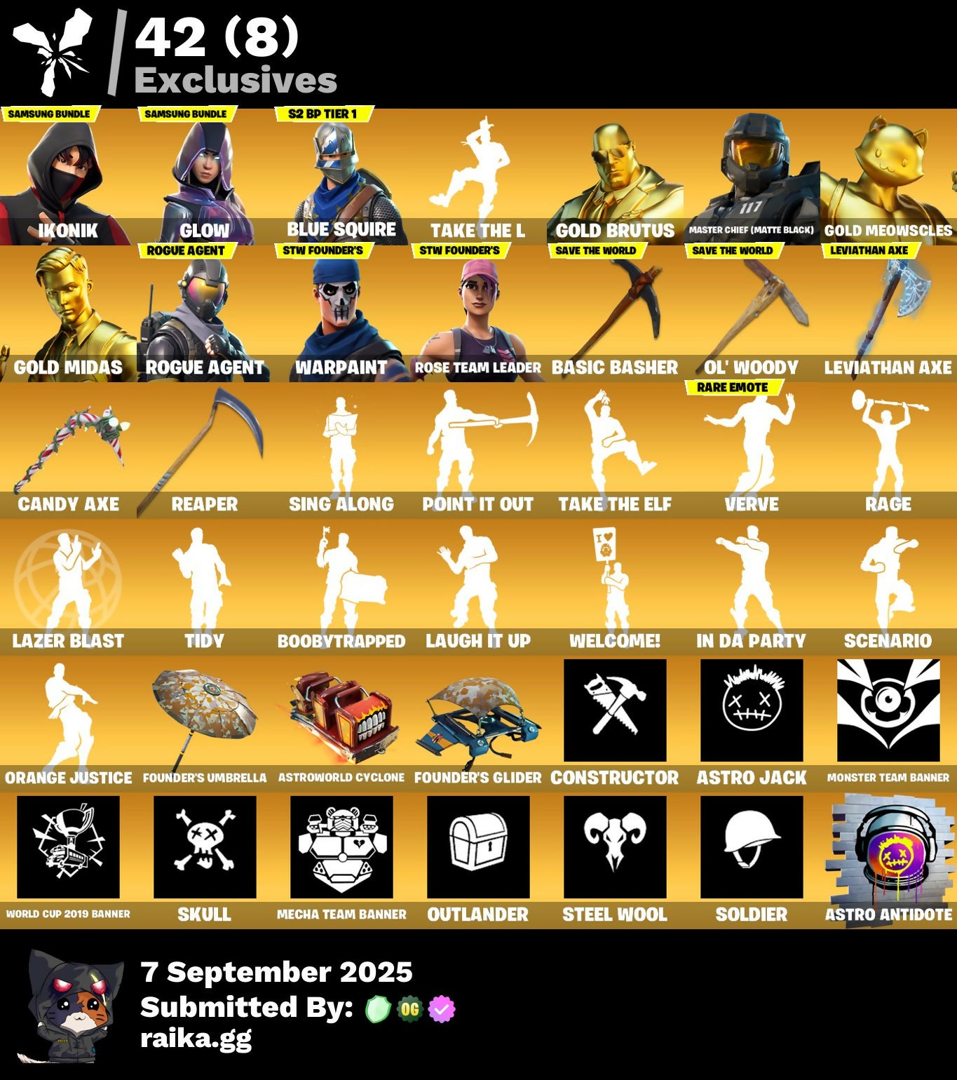 [PC/PSN/XBOX] 200 skins | IKONIK | OG STW | Glow | Blue Squire | Gold Brutus | Master Chief (Matte Black) | Gold Meowscles | Gold Midas | Rogue Agent | 480 VB #435