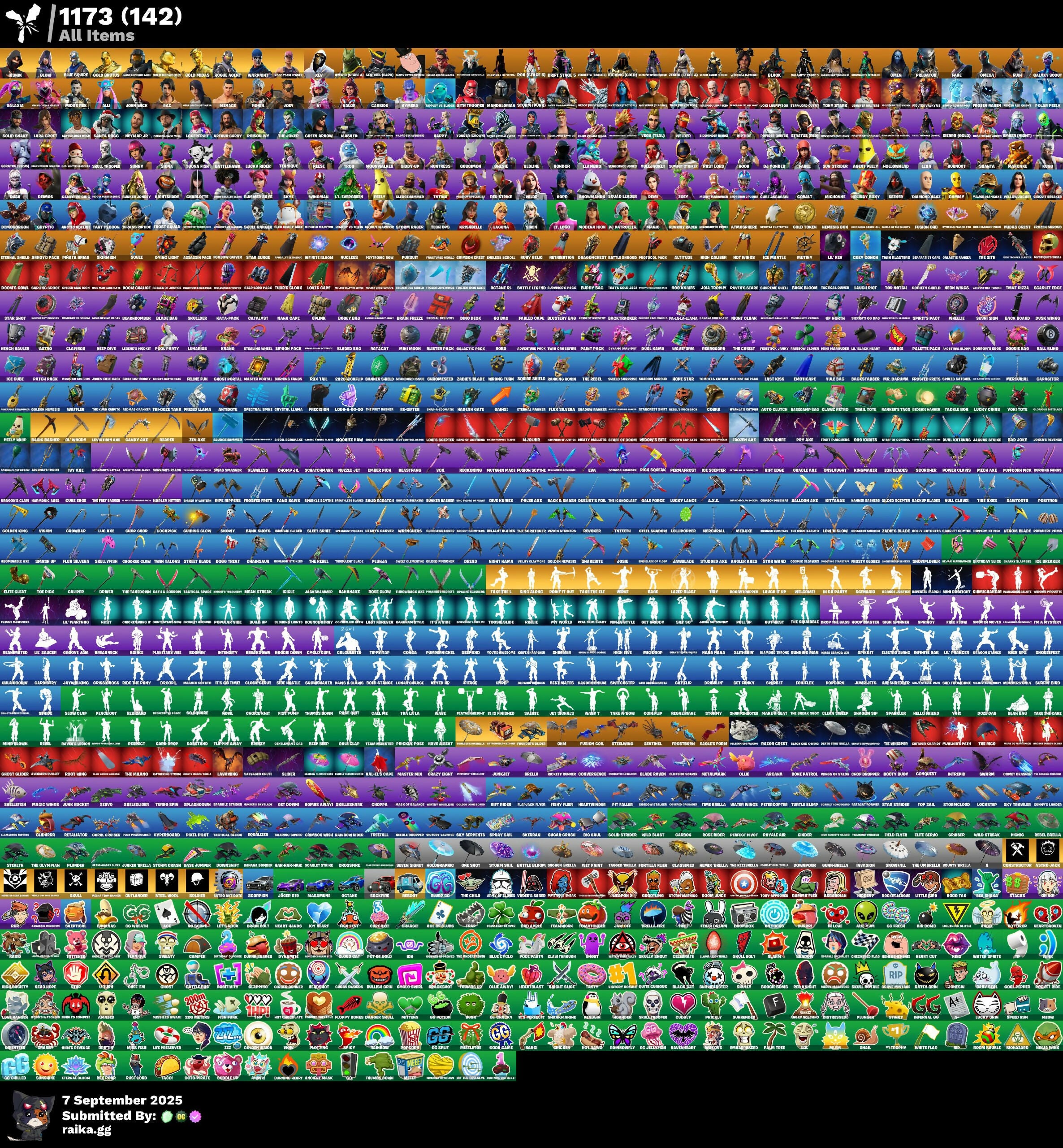 2000, 2023, 999 Kevlis, A Staff, A.X.E., Ace, Aegis, Aegis Panther, Agent Jones (Jump 31), Agent Jonesy, Agent Peely, Alien, Alien Hunter, Alli, Ampersand, Angel, Antler, Aramis, Arctic Adeline, Aria, Army, Arthur Curry, Arthurs Dungeon, Assault, Astro Antidote, Astro Jack, Astroworld Cyclone, Autocut, Axe, Back Basher, Backstabber, Bad Joe, Balloon Axe, Bamajane, Banana, Bandolier, Banner Shield, Base, Baseball, Basic Basher, Basil, Battle, Battlehawk, Battler, Beasting, Behind, Bigfoot, Black, Black Hole, Black Scourge, Blackheart (Stage 8), Blade, Bladerunner, Blast, Blue Hood, Blue Squire, Bluestreak Blades, Bolt, Bomb, Bone, Boobytrapped, Boom, Boombox, Boon, Booty, Borg, Bouncy, Bowler, Brainneck, Brella, Bunker Basher, Bunker Jonesy, Bunny, Bunny Locks, Burning Ambition Valeria, Burning Wings, Burnout, Calamity Stage 5, Calibre, Cameo vs Chic, Camp, Candy Axe, Capacitor, Carbide, Carver, Cascade, Catalyst (Overcharged), Catapult, Chaos Origins (Shadow), Charlotte, Charterick, Chassette, Chef, Chicken, Chipmunkish, Choc Mochi, Chomp Jr., Chop, Chop Chop, Chromes, Circuit Breaker, Classified, Clerty, Cloud, Cloz, Cluster, Clutch, Cobalt, Codename E.L.F., Codex, Comet, Conquest, Constructor, Convergence, Cot Cane, Covenint, Cover, Crash, Crawler, Crazy, Critical, Croc, Crossbar Crusher, Crossfire, Crossli, Crowbar, Crowd, Cryptic, Cube Assassin, Cupuchin, Cure Edge, Cyclone, Cyclops, DJ Yonder, Dagger, Dance, Dancing Doom, Dancing Team, Danger, Dark Shots, Dawn Duelist Nisha, Deadeye, Deadpool Unmasked, Dee Party, Deimos, Delirium, Demi, Demogorgon, Diamond Hanz, Diggle, Dive Knives, Doctor Doom (Ego Eirison), Doctor Doom (God Emperor), Doge, Dogtag, Dold Dwhite, Doom, Downshift, Dracula Axe, Dragon, Dragon's Bite, Dragon's Claw, Dragonborn, Dranfryd, Drift Stage 5, Drillone, Dtherlying, Dual Katans, Duelist's Foil, Duelists, Duke, Dummy, Dunkex Mauve, Dusk, EAF, Eco, Edge, Eggplant, El Furrito, Eldian, Elemental, Elite, Elite Clerty, Ember, Ember (Night), Ember Pick, Emerald, Emote, Endor, Energy, Enforcer, Engrave, Eternal Voyager (Eternal), Eyemoticape, Fable, Fade, Falcon, Fall, Fallout, Fancy Peter Griffin, Fang Claws, Favor, Feline, Feline Fur, Fiery, Fifty Sabers, Figured, Fingerright, Fire, Fireball, Fish Mask, Fish Tank Glitch, Fist, Flame, Flame Scout, Flameless, Flamethrower, Flawless, Flicker, Flux, Form, Founder's Glider, Founder's Umbrella, Fox, Frenzy, Frost Squad, Frostbird Feets, Frostbite, Frosted Fists, Frozen Ake, Frozen Love Ranger, Frozen Raven, Frozen Red Knight, Fur, Fury, Fusion, G Blooderce, Galaxia, Galaxy Scout, Gale Force, Garrison, Gear Specialist Maya, Gem, Genesis, Ghost, Ghost Glider, Ghost Portal, Ghost Rider, Giddy-Up, Ginger, Glitch, Glow, Goggles, Gold, Gold Brutus, Gold Meowscles, Gold Midas, Gold Shoot, Golden King, Golden Pan, Golden Scorpion, Gollopsper, Grave Dippers, Greality Suite, Green Arrow, Groot (Silver Foil), Guggimon, Guiding Glow, Gunslingers, Hack, Hack & Smash, Happy, Hard, Harley Witter, Hawk, Headhunter Prime, Heads, Hearts, Hearts Carrier, Helix, Hi-Tech, Hideback, His Wheel, Holdonhand, Holiday Boxy, Hollow Ears, Hollowhead, Holy Hearts, Hood, Hook, Hope, Horn Slow, Hound, Hubris, Hulk, Humpty, Hunter's Glaive, Huntress, Hybrid (Stage 4), Ice, Ice King (Gold), Ice Queen, Ice Scepter, Iceball, Iceberg, Ikonik, Immortal, In Da Party, Indone's Bert, Indones Bert, Inferno, Infinity, Intervention, Intrepid, Iris, Iron Blades, Ivy Ake, Jabburn Strike, Jackknife, Jade, Jade Scalp Blades, Jake, Jazpark, Jectors Revenge, Jennifer Walters, Joey, John Wick, Josh Square, Journey vs Hazard, Juggernaut, Jumper, Jungle, Junglist, Junker, Kaelscape, Kane, Kani-Kani, Kegs, Kickflip, Kid, Kindmaker, King, Kittianas, Knife, Kondor, Krisabelle, Kuno, Kymera, Laguna, Lantern Hunter, Lara Croft, Laser, Last Kiss, Laugh It Up, Lava, Lava Saucer, Laywitch, Lazer Blast, Legend, Lever, Leviathan Axe, Lexa, Leyvilatha Fears, Llamabro, Llambro, Loadouts, Lobo, Lobster Lord, Lockpick, Locks, Lockstep, Loki Laufeyson, Lord's Scepter, Loserfruit, Lt. Evergreen, Lt. Logo, Lucky, Lucky Lance, Lucky Rider, Lug Axe, Luke (Gold Clothing), Luxe (Gold Clothing), Lynx (Stage 4 - No Pants), Lynx (Stage 4 - No Ponytail), Madcap, Mage, Magma, Major, Major Mancake, Maker's of Armor, Makers of Armor, Mancake, Mandalorian, Manic, Mantis, Marshall Never More, Masked, Master, Master Chief (Matte Black), Master Kev (Masked), Master Key (Masked), Mave (Reactive Hair Off), Max Smash, Meaty Maulers, Mecha Cuddle Master, Mecha Team Banner, Medake, Medicare, Mediocre, Megabyte, Melbourne, Menace, Mercurial, Merry Marauder, Metalruler, Michonne, Mick, Midas Rex, Midfield Maestro, Mission Specialist, Missplosion, Mistress, Modena Icon, Mogul Master (OGR), Moisture, Molten Battle Hound, Molten Valkyrie, Mono, Monster Team Banner, Monsters, Monty, Moon, Mooncrane, Moonwalker, Moss, Mr Daruma, Mr. Daruma, Mr. Krabs, Mullet, Muzzle Jet, Mystique (Tactical), Nail Claws, Narmer Gardens, Needle, Neymar Jr, Nightmare, Nightshade, Ninja, Nites, Norm, Norm Pick Squeak, Note, Nuke, Nutcracke, Nutrogen Magic Fusion Scythe, Ocean, Octane, Octo-Ghost, Ol' Woody, Ollie, Olympian, Omega, Omen, Omnis, One Shot, Onesie, Onslaught, Orange Justice, Orcion, Ornatus, Oro, Outlander, Outlaw, Over, Over Crossli, Overcomer, Pack, Paint, Pan, Panda, Party, Patch, Patrol, Peace Out, Peanut, Peely, Pelly Who, Pelty, Pely Ake, Penny, Permafrost, Permafrost Ice Scepter, Pick, Pick Hammer, Pick Squeak, Piggyblaster, Pilot, Pistachio, Pivot, Pj Patroller, Plague, Plasma, Platoon, Plunder, Plush, Pogger, Point It Out, Poison, Poison Ivy, Pokemon, Polar Peely, Pony, Popcorn, Portal, Portrait, Posion, Postgiron, Powder (White), Power Claws, Preach Axe, Predator, Premiere, Premiere Form, Primafrost, Psyon, Pulse, Pulse Axe, Pump Pump, Punk Rat, Punko' Rook, Pwn, Queen, Quick, Rage, Ragnarok (No Shoulder Pad), Ranger, Rathage, Raven, Raz, Razr, Reaper, Reaperas, Reckoner, Reckoning, Red, Red Knight, Red Strike, Redli