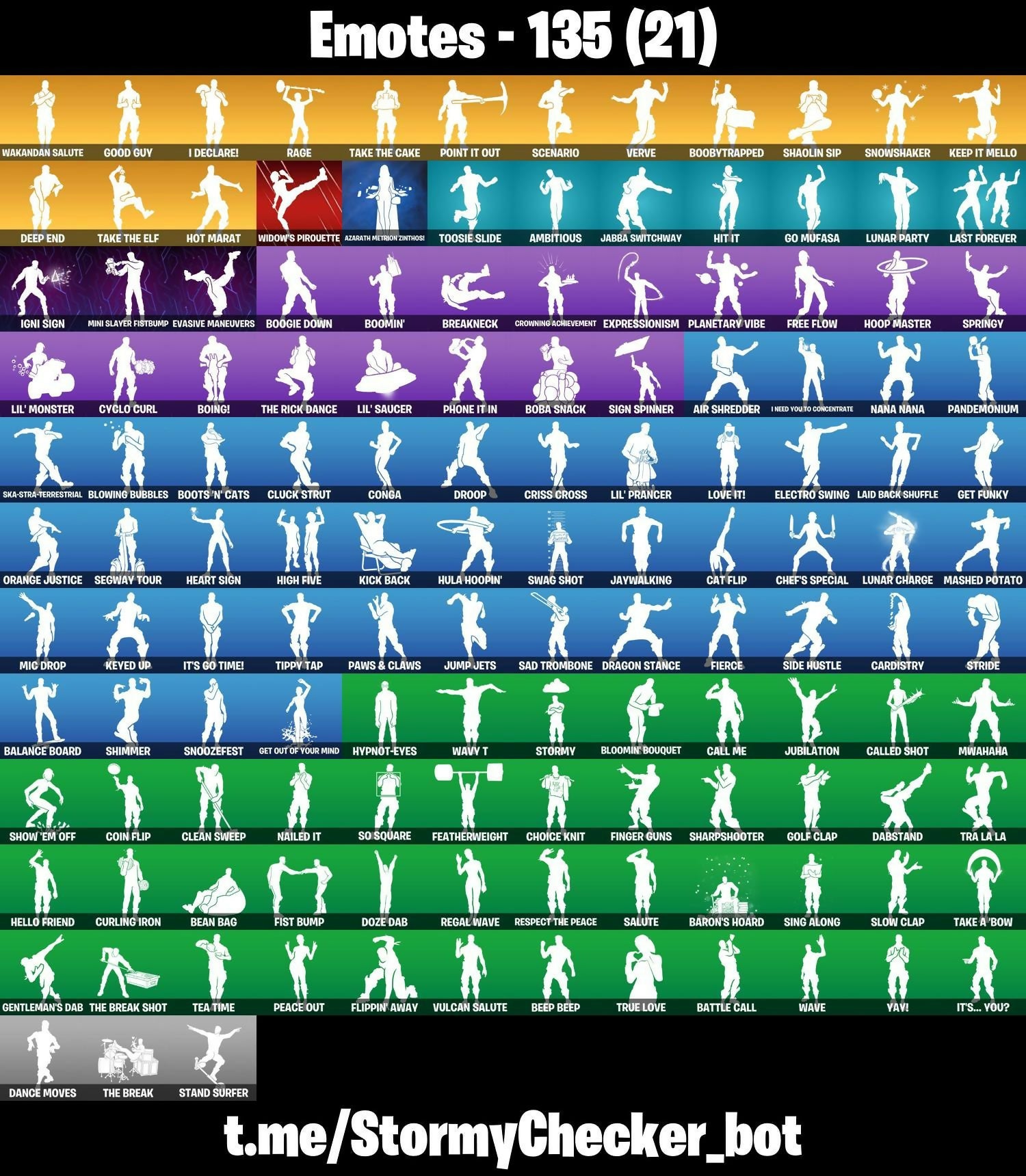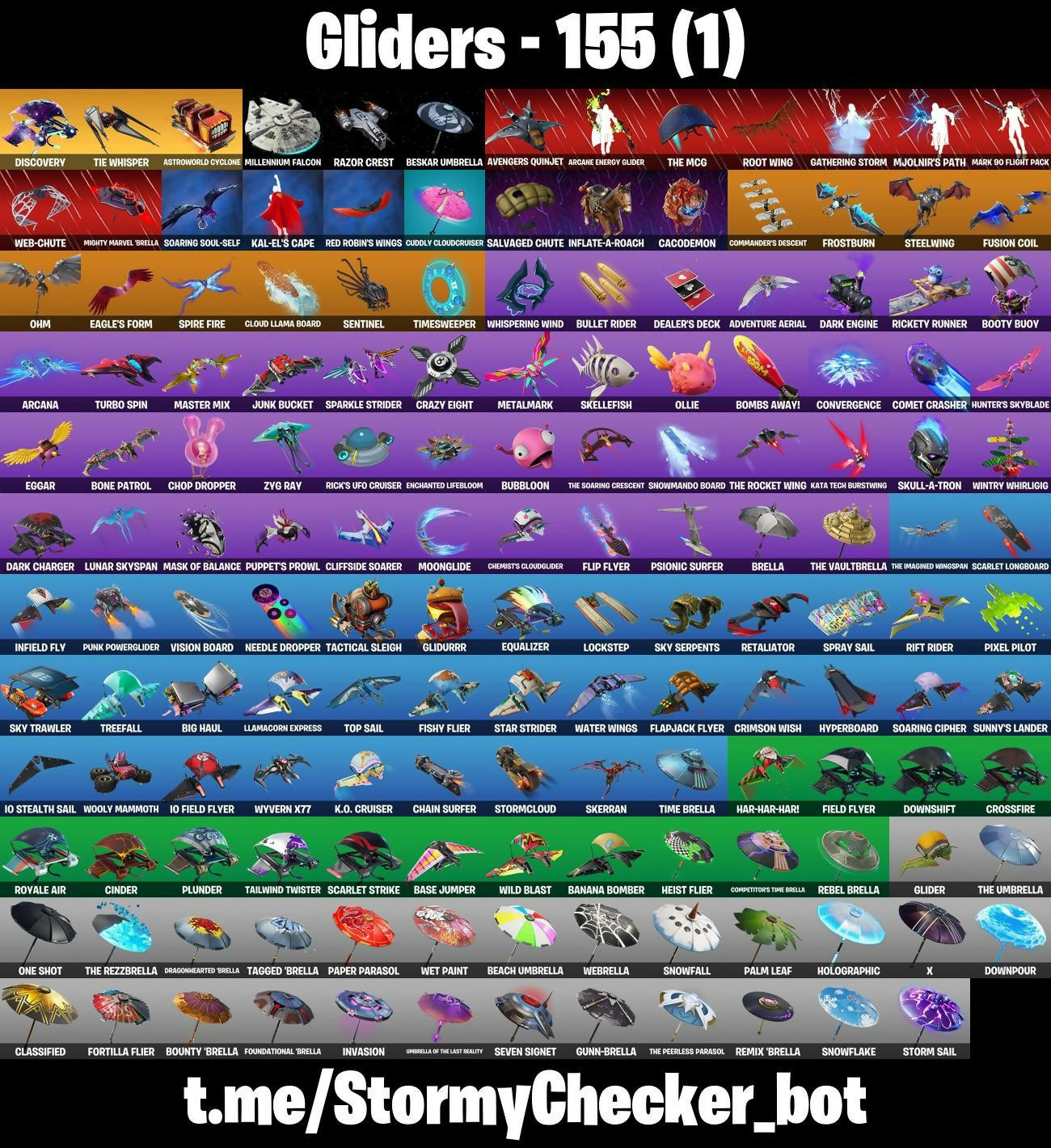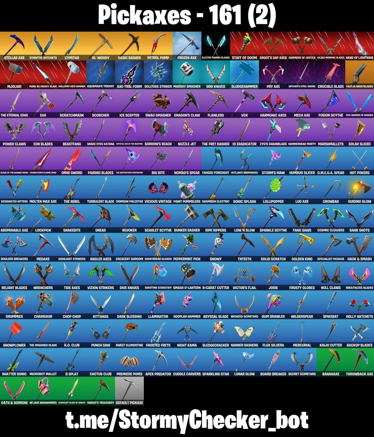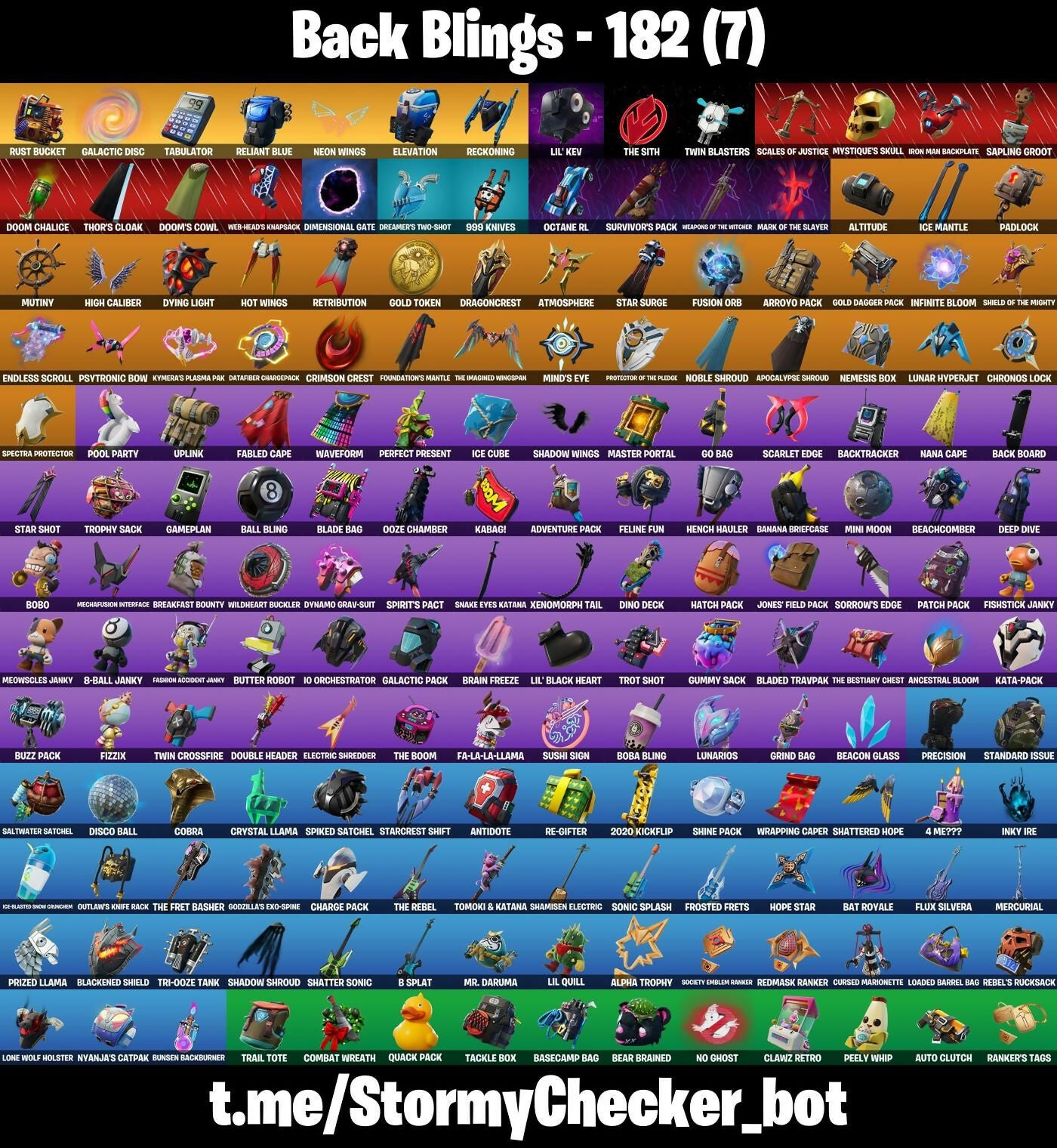 2020 Kickflip, 4 Me???, 6-Carat Cutter, 8-Ball Janky, 8-Ball vs Scratch, 999 Knives, Abominable Axe, Absenz, Abyssal Blade, Adventure Aerial, Adventure Pack, Afterparty, Agent Jones, Agent Peely, Air Shredder, Alpha Trophy, Altitude, Ambitious, Ancestral Bloom, Angler Axes, Antidote, Apex Predator, Apocalypse Shroud, Aquaman's Trident, Arcana, Arcane Energy Glider, Arctic Adeline, Arroyo Pack, Astroworld Cyclone, Atmosphere, Auto Clutch, Avengers Quinjet, Axe-tral Form, Azarath Metrion Zinthos!, B Splat, Back Board, Backtracker, Backup Blades, Balance Board, Ball Bling, Banana Bomber, Banana Briefcase, Bananaxe, Bank Shots, Baron's Hoard, Base Jumper, Basecamp Bag, Basic Basher, Bat Royale, Battle Ball, Battle Call, Beach Umbrella, Beachcomber, Beacon Glass, Bean Bag, Bear Brained, Beastfang, Beep Beep, Beskar Umbrella, Big Bite, Big Haul, Black Knight, Blackened Shield, Blackheart, Blade Bag, Blade of the Waning Moon, Bladed Travpak, Blitz Knight, Bloomin' Bouquet, Blowing Bubbles, Board Breaker, Boba Bling, Boba Snack, Bobo, Boing!, Bombs Away!, Bone Patrol, Boobytrapped, Boogie Down, Boomin', Boots 'N' Cats, Booty Buoy, Boulder Breakers, Bounty 'Brella, Brain Freeze, Breakfast Bounty, Breakneck, Breathless Blades, Brella, Bronzed Scimitars, Brutus, Bubbloon, Bullet Rider, Bunker Basher, Bunker Jonesy, Bunsen Backburner, Butter Robot, Buzz Pack, Cacodemon, Cactus Club, Call Me, Called Shot, Cameo vs Chic, Cardistry, Cat Flip, Catalyst, Chain Surfer, Chainsaur, Chaos Agent, Charge Pack, Chef's Special, Chemist's Cloudglider, Choice Knit, Chop Chop, Chop Dropper, Chronos Lock, Cinder, Classified, Clawz Retro, Clean Sweep, Cliffside Soarer, Cloaked Shadow, Cloud Llama Board, Cloud Striker, Cluck, Cluck Strut, Cobalt Overdrive, Cobra, Coin Flip, Combat Wreath, Comet Crasher, Commander's Descent, Competitor's Time Brella, Conga, Convergence, Cosmic Cleavers, Crazy Eight, Crescent Shroom, Crimson Crest, Crimson Polestar, Crimson Wish, Criss Cross, Crossfire, Crowbar, Crowning Achievement, Crucible Blade, Crystal Axe of the Masters, Crystal Llama, Cuddle Carvers, Cuddle Hearts, Cuddly Cloudcruiser, Curling Iron, Cursed Marionette, Cyclo Curl, Cymitar, D'ark, Dabstand, Dance Moves, Dark Blessing, Dark Charger, Dark Engine, Datafiber Chargepack, Deadpool, Dealer's Deck, Deep Dive, Deep End, Default Pickaxe, Deimos, Demi, Designated Hitters, Diamond Diva, Dimensional Gate, Dino Deck, Disco Ball, Disco Diva, Discovery, Dive Knives, Doctor Doom, Doctor Slone, Doom Chalice, Doom Slayer, Doom's Cowl, Double Header, Downpour, Downshift, Doze Dab, Dragon Stance, Dragon's Claw, Dragoncrest, Dragonhearted 'Brella, Dread, Dreamer's Two-shot, Droop, Drummies, Dusty, Dying Light, Dynamo Grav-suit, Eagle's Form, Eggar, Electric Shredder, Electro Pairing Blades, Electro Swing, Elevation, Ember, Enchanted Lifebloom, Endless Scroll, Eon Blades, Epic Swords of Wonder, Equalizer, Era, Eternal Voyager, Eva, Evasive Maneuvers, Everybody Dance!, Evie, Expressionism, Fa-la-la-llama, Fabled Cape, Fade, Fang Saws, Fanged Foresight, Fashion Accident Janky, Featherweight, Feline Fun, Field Flyer, Fierce, Finesse Finisher, Finger Guns, Fishstick, Fishstick Janky, Fishy Flier, Fist Bump, Fixer, Fizzix, Flapjack Flyer, Flawless, Flip Flyer, Flippin' Away, Flux Silvera, Fncs Fit, Fortilla Flier, Foundation's Mantle, Foundation's Plasma Spike, Foundational 'Brella, Free Flow, Frostburn, Frosted Frets, Frosty Globes, Frozen Axe, Fusion, Fusion Coil, Fusion Orb, Fusion Scythe, Galactic Disc, Galactic Pack, Galaxy, Gameplan, Gathering Storm, Gear Specialist Maya, Gentleman's Dab, Geralt of Rivia, Get Funky, Get Out Of Your Mind, Ghoul Trooper, Gilded Morphic Blades, Glider, Glidurrr, Go Bag, Go Mufasa, Godzilla's Exo-Spine, Gold Dagger Pack, Gold Token, Golden King, Golf Clap, Good Guy, Grind Bag, Groot, Groot's Sap Axes, Guggimon, Guiding Glow, Gum Brawler, Gumbo, Gummy Sack, Gunn-Brella, Gunnar, Hack & Smash, Hammerhead Morty, Hammers of Justice, Hand of Lightning, Har-Har-Har!, Harlowe, Harmonic Axes, Hatch Pack, Haven, Heart Sign, Heist Flier, Hello Friend, Helsie, Hench Hauler, High Caliber, High Five, Highlight Strikers, Hit It, Holly Hatchets, Holographic, Hoop Master, Hooplah Hammer, Hope Star, Hot Marat, Hot Pokers, Hot Wings, Hula Hoopin', Humbug Slicer, Hunter's Skyblade, Hybrid, Hyperboard, Hypnot-Eyes, I Declare!, I Need You To Concentrate, IO Eradicator, IO Orchestrator, Ice Cube, Ice Mantle, Ice Scepter, Ice-Blasted Snow Cruncher, Igni Sign, Ikonik, Imani, Infield Fly, Infinite Bloom, Inflate-A-Roach, Inky Ire, Invasion, Io Field Flyer, Io Stealth Sail, Iron Man Backplate, It's Go Time!, It's... You?, Jabba Switchway, Jaywalking, Jennifer Walters, Joey, Jones' Field Pack, Josie, Journey vs Hazard, Jubilation, Jules, Jump Jets, Junk Bucket, K.O. Club, K.O. Cruiser, Kabag!, Kaiju Cutter, Kal-El's Cape, Kata Tech Burstwing, Kata-Pack, Keep It Mello, Keyed Up, Kiara K.O., Kick Back, King Flamingo, Kit, Kittanas, Knight's Treachery, Kondor, Krisabelle, Kymera, Kymera's Plasma Pak, Laid Back Shuffle, Lara Croft, Last Forever, Last Round, Legendary Blade of Insight, Lexa, Lil Quill, Lil' Black Heart, Lil' Kev, Lil' Monster, Lil' Prancer, Lil' Saucer, Llama-Rama, Llamacorn Express, Llaminator, Loaded Barrel Bag, Lockpick, Lockstep, Lollipopper, Lone Wolf Holster, Love It!, Low 'n Slow, Lt. Evergreen, Lt. John Llama, Lug Axe, Lunar Charge, Lunar Glow, Lunar Hyperjet, Lunar Party, Lunar Skyspan, Lunarios, Luxe, Lynx, Mancake, Mandalorian, Mark 85 Energy Blade, Mark 90 Flight Pack, Mark of the Slayer, Marshmallets, Marshy Smasher, Mashed Potato, Mask Of Balance, Massai, Master Key, Master Mix, Master Portal, Mave, Mech Axe, Mecha Cuddle Master, Medaxe, Menace, Meowscles, Meowscles Janky, Mercurial, Metalmark, Mic Drop, MichaFusion Interface, Microbot Mallet, Midas, Mighty Marvel 'Brella, Millennium Falcon, Mind's Eye, Mini Moon, Mini Slayer Fistbump, Mjolnir, Mjolnir's Path, Molten Max Axe, Moonglide, Mr. Daruma, Mutiny, Mw