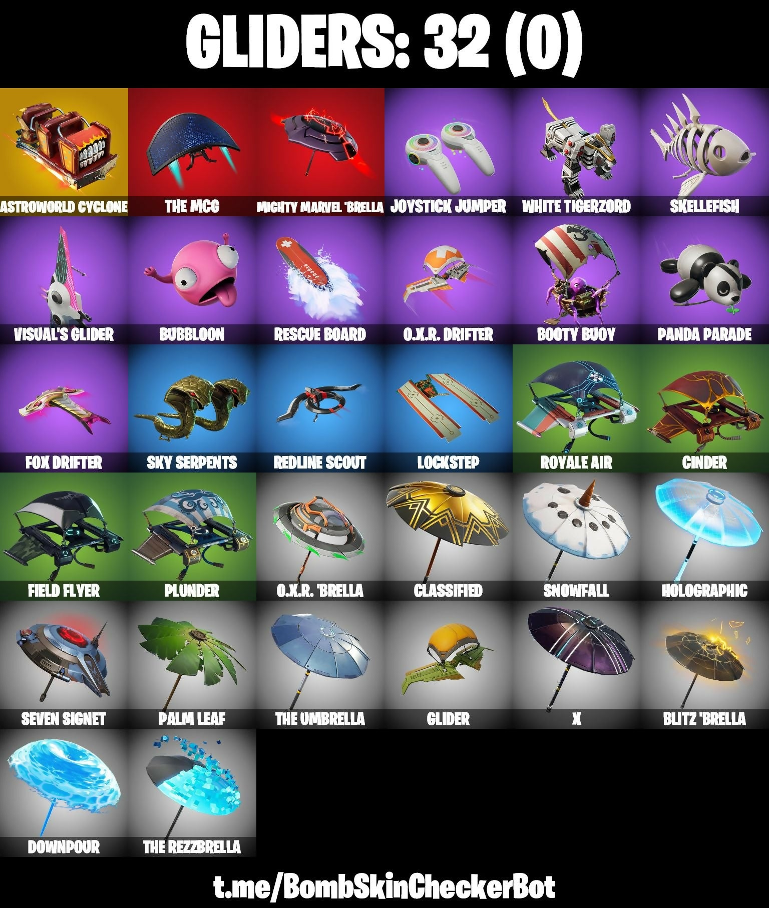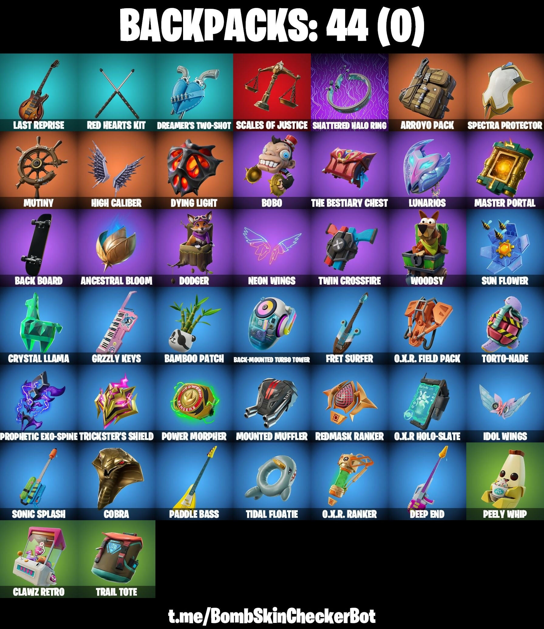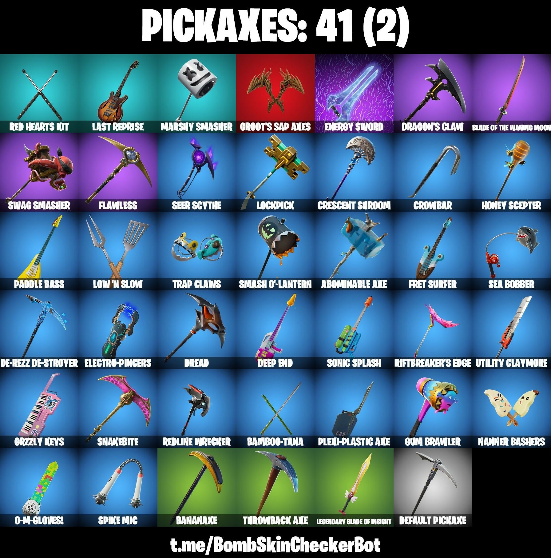 Abominable Axe, Agent Patch, Ancestral Bloom, Arroyo Pack, Astroworld Cyclone, Augury, Aw, Shucks., Back Board, Back-Mounted Turbo Tower, Bamboo Patch, Bamboo-Tana, Bananaxe, Battle Gamer Mae, Beep Beep, Bernie, Bike To Go, Blackheart, Blade Of The Waning Moon, Blitz 'Brella, Blizzabelle, Bobo, Boogie Down, Boop!, Booty Buoy, Bubbloon, Business Up Front, Call Me, Cap Kick, Cinder, Classified, Clawz Retro, Cobra, Conga, Crescent Shroom, Crowbar, Crowning Achievement, Crystal Llama, Dance Moves, Danica, De-Rezz De-Stroyer, Deep End, Default Pickaxe, Die With A Smile, Die With A Smile Bruno, Dodger, Downpour, Dragon Stance, Dragon's Claw, Dread, Dreamer's Two-Shot, Dying Light, Electro-Pincers, Ember, Energy Sword, Field Flyer, Fierce, Flawless, For O.X.R.!, Fox Drifter, Fret Surfer, General's War Table, Glider, Go Mufasa, Golf Clap, Good Sportsmanship, Groot's Sap Axes, Grzzly Keys, Gum Brawler, Heel Click Breakdown, Hello Friend, High Caliber, Holographic, Honey Scepter, Hoop Master, Hybrid, Hype!, Idol Wings, Ikonik, It's... You?, Joystick Jumper, Keep It Mello, Kehlani, Last Reprise, Legendary Blade Of Insight, Lil' Ducky Train, Lil' Ghost, Lock It Up, Lockpick, Lockstep, Love It!, Low 'N Slow, Lt. Ripp Slade, Lunarios, Luxe, Marshy Smasher, Master Key, Master Portal, Mic Drop, Midas' Shadow, Mighty Marvel 'Brella, Mounted Muffler, Mutiny, Nana Nana, Nanner Bashers, Neon Wings, O-M-Gloves!, O.X.R Holo-Slate, O.X.R. 'Brella, O.X.R. Drifter, O.X.R. Field Pack, O.X.R. Ranker, Onyx Winter, Out West, Paddle Bass, Palm Leaf, Panda Parade, Peely, Peely Whip, Plexi-Plastic Axe, Plunder, Polly, Power Morpher, Prophetic Exo-Spine, Red Hearts Kit, Redline Racer, Redline Scout, Redline Wrecker, Redmask Ranker, Reporting For Duty, Rescue Board, Rescue Run, Respect The Peace, Rift Break, Riftbreaker's Edge, Riftreaver Drift, Royale Air, Ruin, Russel, Scales of Justice, Scenario, Sea Bobber, Seer Scythe, Seven Signet, Sgt. Green Clover, Shattered Halo Ring, Sidewinder, Sing Along, Skellefish, Sky Serpents, Smash O'-Lantern, Snakebite, Snoozefest, Snowfall, Sonic Splash, Spectra Protector, Spike Mic, Sun Flower, Swag Smasher, The Bestiary Chest, The Mcg, The Rezzbrella, The Umbrella, Throwback Axe, Tidal Floatie, Tide Strider, Torto-Nade, Trail Tote, Trap Claws, Trickster's Shield, Twin Crossfire, Unsc Spartan, Utility Claymore, Visual's Glider, Wanna See Me, White Tigerzord, Woodsy, X, Yay!, Yoo-Mi