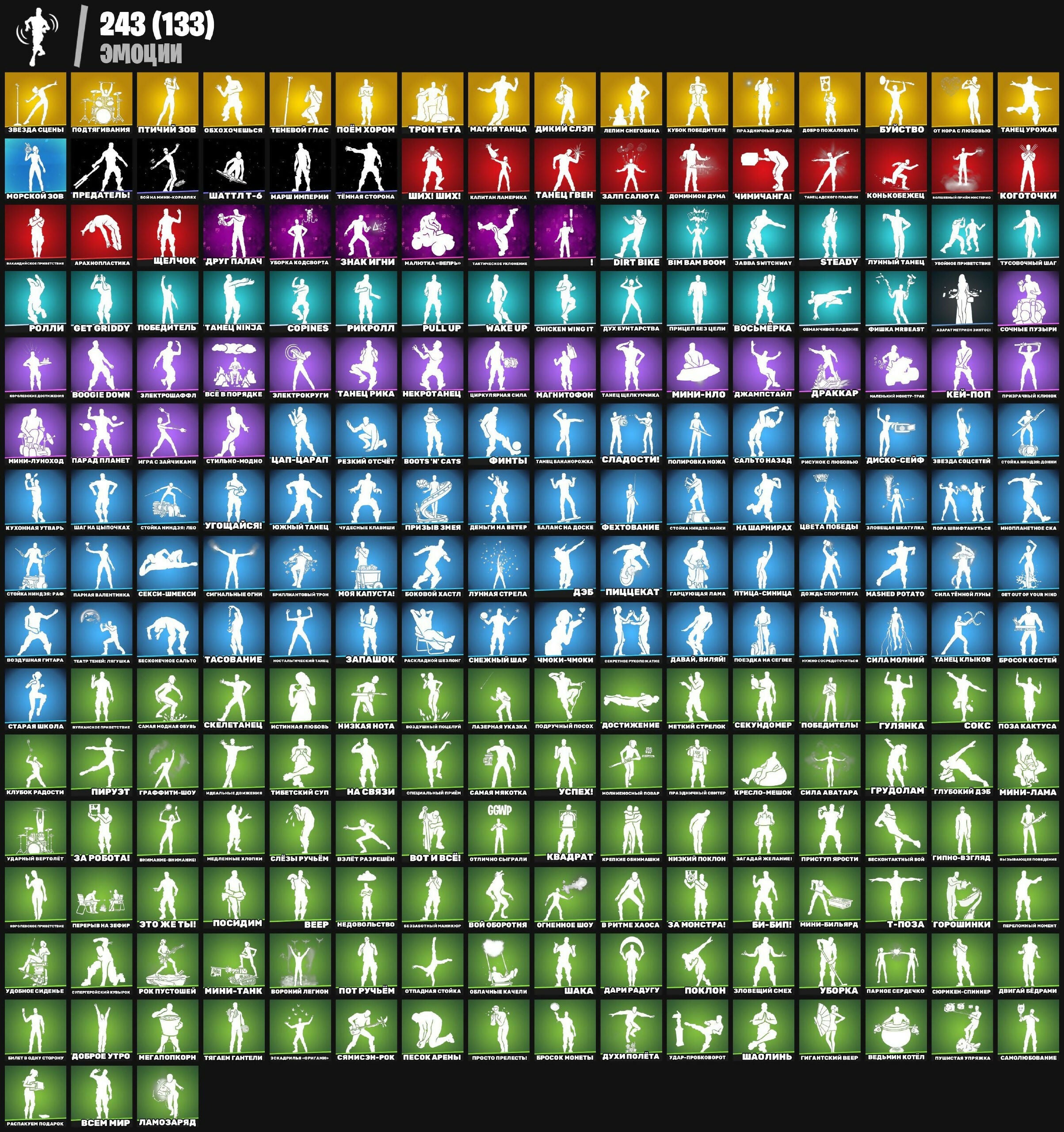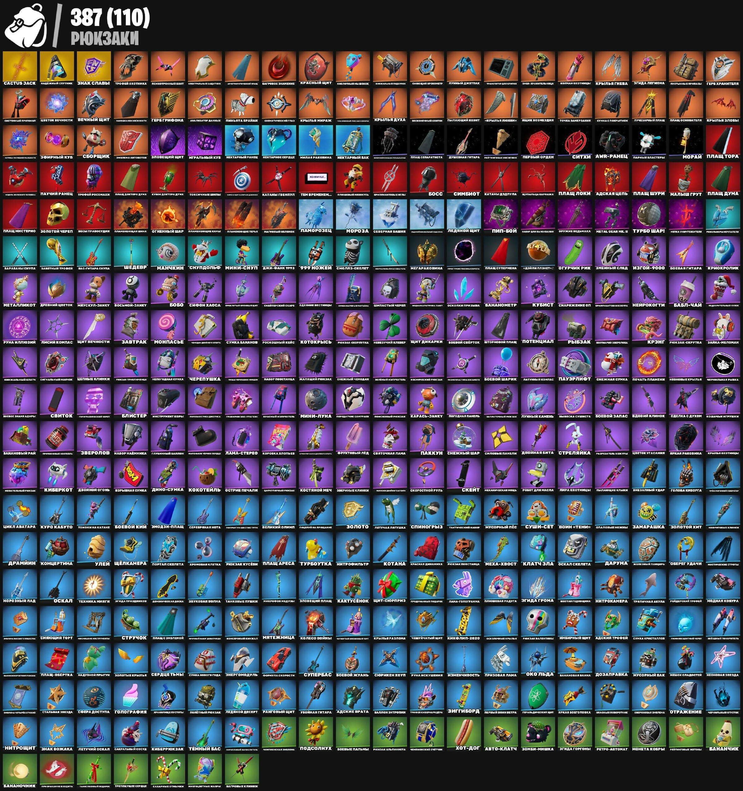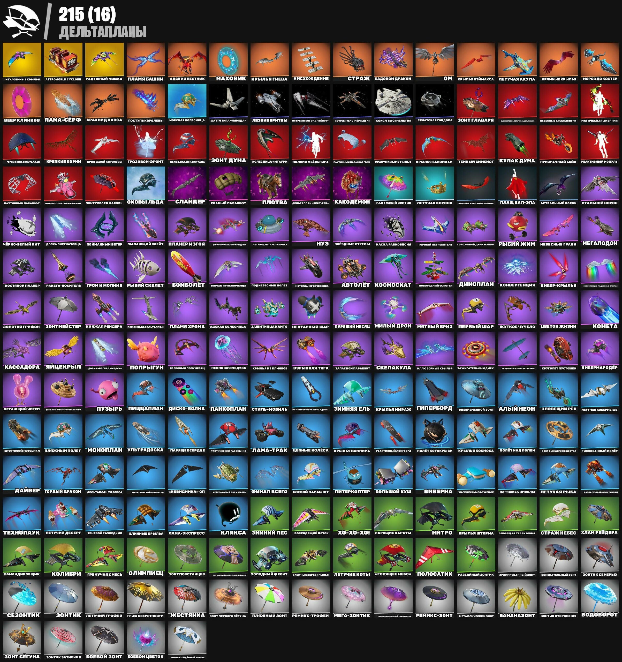 "Goryasche Nebo", "Nevernidzimka" OP, "Olimpiets", 999 ножей, Adskaia Kolesnitsa, Adskii Vestnik, Al’bii Neon, Arahnid Khaosa, Astral’nyi Voron, Astroworld Cyclone, Avtolet, Awr-Ранец, Bananazont, Bananidirovshik, Banchevyi Polumesets, Bim Bam Boom, Blinniie Krylya, Boevoi Parashyut, Boevoi Tsvetok, Boevoi Zont, Bol’shoy Kush, Bombole’t, Boogie Down, Boots 'N' Cats, Cactus Jack, Cherno-Belyi Kit, Cherpalo’ii Dirzhatel’, Chicken Wing It, Copines, Dai’ver, Deltaplan "Vest-Tek", Deltaplan Fulologa, Deltaplan Kapitana, Dino-plan, Dinotoplivka Razvedchika, Dirt Bike, Disko-Volna, Djemon Ryigatelnyi Shar, Doska "Begly Midasa", Doska Snegrazovtsa, Dron Beloj Korolevy, Ekspress-Morozhenoe, Elitnie Sergevriki, Ezdoovoi Drakon, Final Vsego, Geroicheskii Deltaplan, Get Griddy, Get Out Of Your Mind, Giperbord, Gordyi Drakon, Gornyi Istrebitel, Gorokhovyi Dirmkal’d, Griechnaya Smes’, Grif Sekretnosti, Grom I Molnia, Grozovoi Front, Istrebitel-Shch-Ptic, Istrebitel-Snac "Shelot", Kakodemon, Kassandra, Khlam Reidera, Kho-Kho-Kho!, Kholodnyi Front, Khronirovannyi Zont, Kiber-Krylya, Kibermaroder, Kliaksa, Knizhal Reidera, Kolesnitsa Chitaturi, Kolibri, Kometa, Konvergentsiya, Kosmoskat, Kostyanoi Planer, Krepkie Korni, Krylya Bianomakha, Krylya Biemaksa, Krylya Gneva, Krylya Iz Klinkov, Krylya Kosmosa, Krylya Mirazh, Krylya Shtorma, Krylya Vampira, Kryl’ia Krasnogo Rynka, Kryugole’t Pustoviei, Kulak Duma, Lama-Ekspress, Lama-Trak, Leg-209, Letauchaya Tarelka Reka, Letauchii Cherep, Letuchaya Akyla, Letuchaya Kiver`nik, Letuchaya Korona, Letuchaya Ryiba, Letuchie Koti, Letuchii Desert, Letuchii Trofei, Lezvie Britvy, Magicheskaya Energiya, Makhovik, Mashed Potato, Maska Ravnovesiya, Mega-Zontik, Megalodon, Metal Gear MkII, Metallicheskui Zont, Miatnyi Briz, Milii Dron, Milye Zornye Krylya, Molnia Nyel’rnaya, Monoplan, Moroz Do Kostey, Morskaya Kolesnitsa, Motograletrèv-Bikem, Mototalon Kholodnoka, Nektarnyi Shar, Neonovaya Meduza, Neproizvoditel’naya Zontik, Nesbesnye Grani, Nesbesnye Krylya Shury, Niskhozhdenie, Nitro, Novogodnii Volgets, Nuz, Okovy L’da, Om, Orlinye Krylya, Osvnatel’nyi Zont, Pankoplan, Parashy Mesyats, Parayshie Karaty, Parayshie Simvoly, Parayushchii Serdtse, Pautinnyi Parashut, Pautinnyi Parashut P-N, Pervyi Shar, Pesochnii Deltaplan, Pishchaplani, Piterkopter, Plama-Serf, Plamya Bashni, Plamya Khroma, Planer Izgoi, Plash Kal-Ela, Pliazhnii Zont, Pliazhnyi Polièt, Plotva, Podveshennyi Polièt, Poimannyi Veter, Polet Kotorkrisi, Polet Nad Polem, Polosatik, Popyrgun, Postupl Korolevy, Prizrachnyj Baik, Pull Up, Puzyr’, Pylayushchii Skejt, Raduzhnyi Mishka, Raduzhnyi Zontik, Raketa-Nositèl’, Raskalivaiushchii Shar, Ravnyi Parashut, Razboynii Zontik, Reaktivnye Krylya, Reaktivnyi Longtord, Reaktivnyi Modul, Remiks-Trofei, Reymiks-Zont, Riskovannyi Polièt, Ryibii Skelet, Ryibii Zhimm, Sezontik, Shatti Tipa "Lybida", Shtornovoi Mototsikl, Sinte’icheskii Parashyut, Skelakula, Slaider, Sokol Tisyacheletia, Stal’noi Voron, Steady, Stil’-Mobil’, Strazh, Strazh Nebes, Sviatskaya Gondola, Takticheskii Razvedchik, Tekhnopauk, Temnii Simbiot, Tennevoi Razvedchik, Tseplie Kolesa, Tsvetok Zhizni, Tyrynnyi Blei Rezervnoi Zont, Ultradoska, Veep, Veer Klinkov, Viverna, Vnevremennoi Zont, Vnimanie Plyuklonentsa, Vodovorot, Voskhodiashchii Potok, Vzryvnaya Tyaga, Wake Up, Yaitsie Kryil, Zaplasnoi Parashyut, Zashchitnitsa Kaito, Zazhigatelnyi Disk, Zhestianka, Zhytkoe Chuchelo, Zimnii Les, Zimnyaya El’, Zloveshchaia Traktoriya, Zloveshchii Re’v, Zolotoi Grifon, Zont Duma, Zont Geroev Marvel, Zont Glavarya, Zont Pervoho Sezuna, Zont Povstatsche, Zont Seguna, Zont Vysshego Obshchestva, Zontik, Zontik Semerkh, Zontik Vtorzheniya, Zontik Zatmeniya, Zontmeister, Zvezdnie Streli, «Счастливчики», Авто-Клатч, Адмирель-Вимпл, Адская Цепь, Адские Врата, Адский Трофейн, Адский ключ, Азарт ретро Шутера, Айрон, Алмаз Артебана, Арахнопластика, Арктический Янтарь, Астероидная кирка, Бабл-Чай, Багровый клинки, Баланс на доске, Баллон Эндрюс, Банановые когти, Бананометр, Бананочкин, Бананчик, Барабаны Смута, Барабаны супила, Бас-гитара Супила, Беззаботный мальчик, Безмолвный нож, Бес, Бесконечное сальто, Бесконтактный бой, Бесшумные тени, Би-бип!, Билет в один сторону, Бита Харли, Благословитель, Блистер, Блиц-топор, Бобава косточка, Бобо, Боевая Гитара, Боевая Звезда Один, Боевилка, Боевой Жуань, Боевой Запас, Боевой Знак Джури, Боевой Свитерок, Боевой кий, Боевой посох Лево, Боевой скейт, Боевые Пальмы, Боковой хастл, Большая ложка, Босс, Браслетовая троп, Броненосец Рутти, Бросок костей, Бросок монеты, Буинс и шмякс, Буйство, Бум-бита, Бунка Криптило, В ритме хаоса, Ва-размиватель, Вагровое Значение, Вазы Время Взгляка, Вальдейский приветствие, Ведьминый котёл, Великий Олимп, Вера мата воды, Верный колун, Вечная шпаги, Вечный Щит, Взлёт разрешён, Взрывная Сумка, Взрывная кирка, Взрывной букет, Викинговый шлем, Виртуальный поцелуй, Вихрь клинки, Вкус светлой мялой, Водные железы, Водяной клино