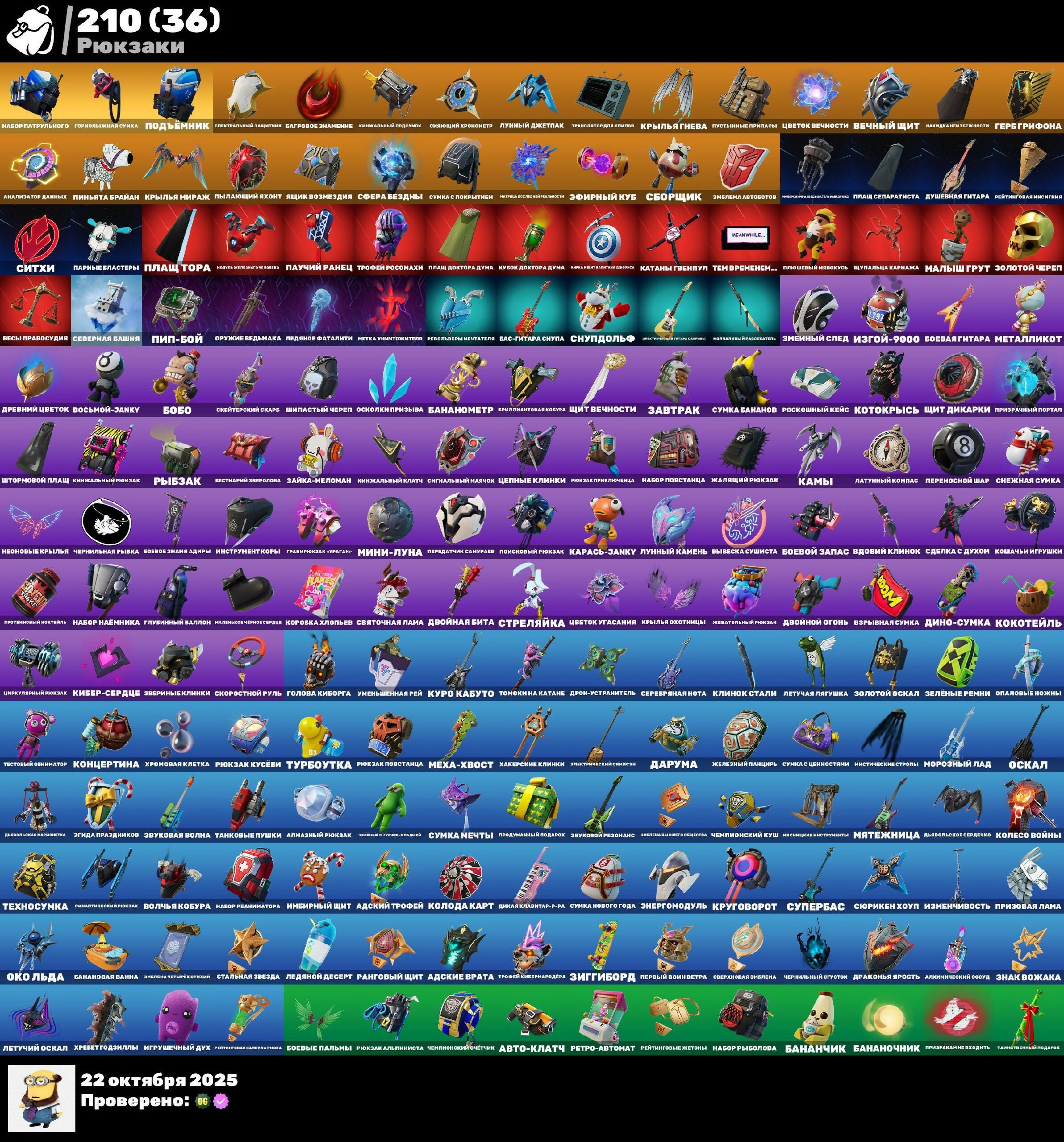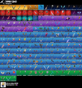 Fmandr Shop, Gold Brutus, Gold Midas, Khaby Lame, Авто-клатч, Агент Банан, Агент Рождества, Адепт, Адира, Адские врата, Адский трофей, Айрис, Айрон, Акулья удочка, Алмазный рюкзак, Алмазный топорик, Алхимический сосуд, Анализатор данных, Антония, Анютосик / Интоксикан, Апикотиста / Экстремалка, Аппитиуда, Арктическая Дельфинка, Астродная кирка, Астронавт Шиппински, Баблгам, Багровое знамение, Банановая ванна, Банановые морожени, Бананометр, Бананорожок, Бананочник, Бананчик, Бас-гитара Снула, Бас-гитара Сплута, Безжалостные перчатки, Бесстрашная Сталь, Бестиарий зверобола, Блинчик, Бобо, Боевая гитара, Боевая косточка, Боевое знамя Адиры, Боевой Техник Джулс, Боевой запас, Боевой скейт, Боевые пальмы, Боевые топоры саб-Зиро, Бой-Кот, Большая ложка, Бриллиантовая булавка, Бриллиантовая кобура, Бриллиантовые иглы, Бродяга, Бронзовые скимитары, Бум-бита, Бумс и Шмякс, Вайолет, Валерия, Вдовий клинок, Вдовый клинок, Везучая матрешка, Вектор птицы, Верх совершенства, Весы правосудия, Вечная Вопительница, Вечная шпага, ВечноЗеленый, Вечный щит, Взрывная кирка, Взрывная сумка, Вихревые клинки, Водные жезлы, Воин Ветра, Волна, Волчья кобура, Воскреситель, Восьмой / Пул, Восьмой-Janky, Вывеска сушиста, Гангстер Мидас, Гвен-Паук, Гвоздебиты, Геральт из Ривии, Герб грифона, Глубинный баллон, Голова киберга, Гольф-топор, Горнило палача, Горнолыжная сумка, Гравинознак «Ураган», Грибной полумесяц, Грут, Грыззли, Грёза, Дальнейшая механика, Дар небытиа, Дарт Вейдер, Дарума, Дасти, Двоественные орудатели, Двойная бита, Двойной огонь, Двуручные мечи, Деловольское сердечко, Дженнифер Уолтерс, Джинглбелл, Джосс, Джулс, Дикая квинта-р-р-ра, Дикая клавиатура-ра, Дикое копьё, Дина Митт, Дино-сумка, Длань Бури, Добытчица, Доктор Дум, Драконий ярость, Драконье копьё, Древесные топоры Грутa, Древний цветок, Древняя ярость, Дрон-устранитель, Дуплеты, Дупли-Кейт, Дупли-лезвия, Душевная гитара, Душераздиратели, Жалающий рюкзак, Жвательные молоты, Жевательный рюкзак, Жел звезды смерти, Железный панцирь, Жестокий коготь, Живой звук, Жнец, Завтрак, Зайка-Меломан, Заострённые крюки, Звериные клинки, Звериные клыки, Звуковая волна, Звуковой резонанс, Звёздный жезл, Зеленые ремни, Земной электрический, Зиггиборд, Зимний Агент Рождества, Зимний Карась, Зимний Леший, Зимний ледорез, Зимняя Бомбистка, Злюдеская звезда, Змеиный след, Знак вожака, Значение таинственного глаза, Золотичный склептер, Золотой ломик, Золотой оскал, Золотой череп, Игрушечный дух, Идеальное острие, Изгой-9000, Измельчитель специй, Изменчивость, Иллюзорные клинки, Имбирный щит, Инструмент Кори, Инструмент повстанца, Иридиия Вэйн, Искатель, Исполините желаний, Исток, Кадо Торн, Камео Эстрада, Камы, Карастероид, Карась, Карась-Janky, Карнаж, Касание мечты, Кастетные перчатки, Катануто»3, Катаны Гвенпул, Кеша Кросс, Киара Бум, Кибер-сердце, Кибертронская секира, Кинжалы Рози, Кира, Кирка вожака, Кирка и щит капитана Америка, Кисельный подъемник, Клинок Тёмной Луны, Клинок воина, Клинок мирах, Клинок стали, Клык бури, Клыки Хеска, Клятва и долг, Книжный клатч, Книжный рюкзак, Коготь Фелини, Кокотейль, Колесо войны, Коллекция инструментов, Колода карт, Колотушка микробота, Комбинатор, Кондор, Концертнина, Копы из виварниума, Копьё О.М.Е.Г.А., Копьё истока, Копьё странника, Кора, Коробка хлопьев, Королевская клятва, Коса пустоты, Костолом, Костяная месть, Ко