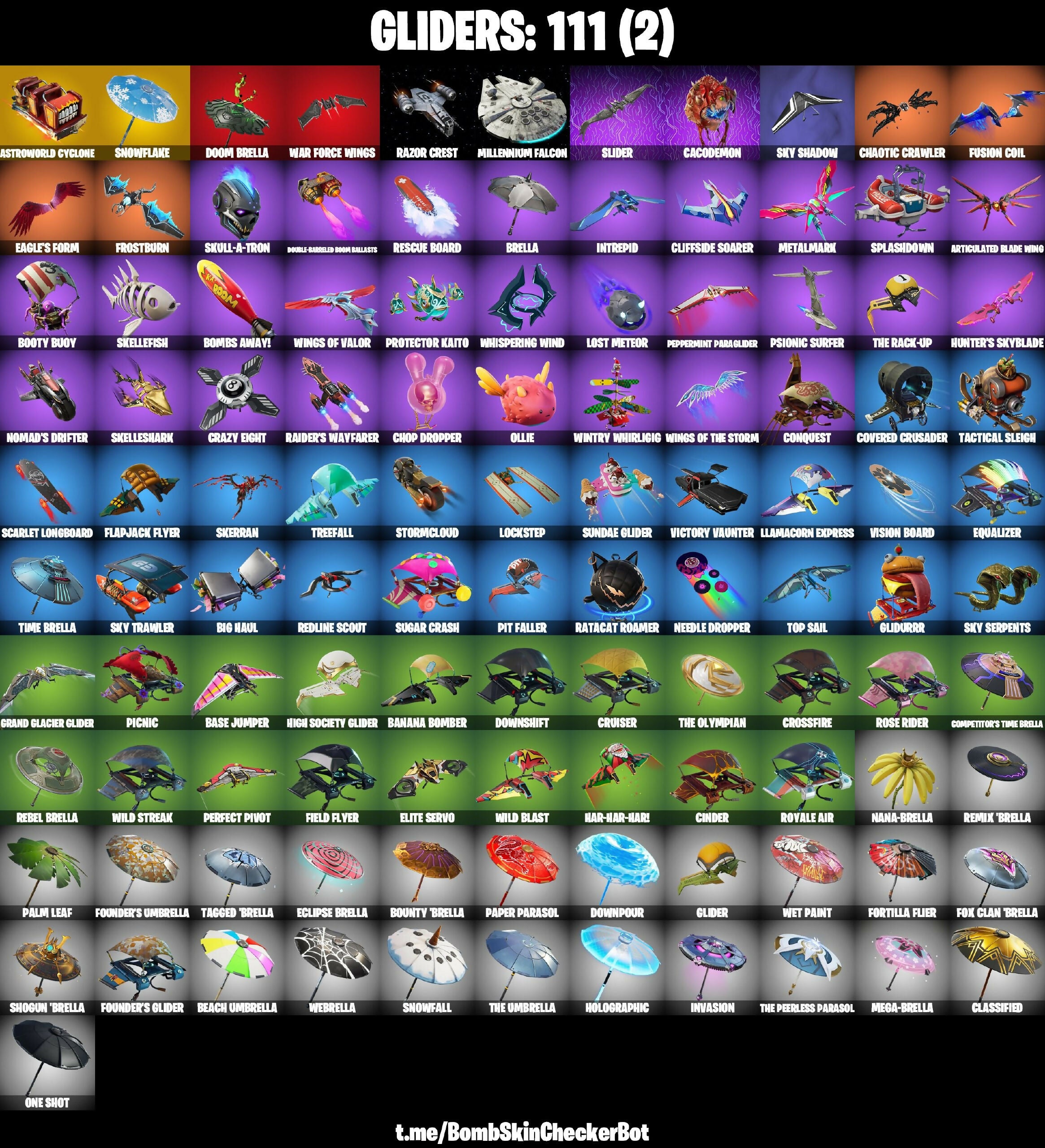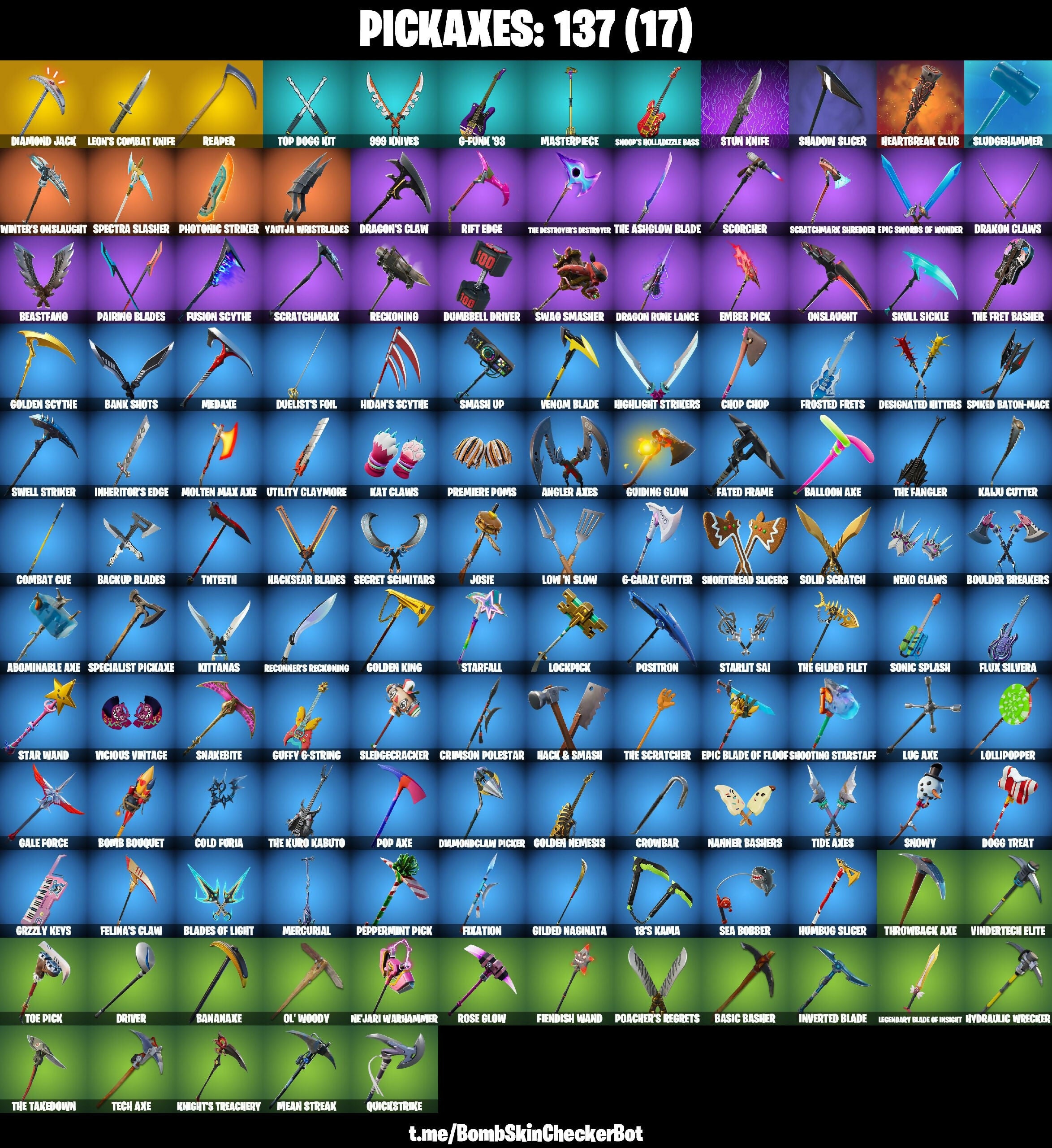 1-Ball, 18's Kama, 6-Carat Cutter, 8-Ball Vs Scratch, 999 Knives, Abominable Axe, Agent Peely, Air Shredder, Andy Fangerson, Angler Axes, Arctic Adeline, Articulated Blade Wing, Astro Jack, Astroworld Cyclone, Backup Blades, Balloon Axe, Banana Bomber, Bananaxe, Bank Shots, Base Jumper, Basic Basher, Battlehawk, Be Seeing You, Beach Umbrella, Beastfang, Beep Beep, Big Fan, Big Haul, Bike To Go, Billy Bounce, Blackheart, Blades Of Light, Blowin' Up, Blue Striker, Boing!, Bomb Bouquet, Bombs Away!, Boogie Down, Boomin', Booty Booy, Boulder Breakers, Bounty 'Brella, Brella, Bring It Around, Brite Bomber, Brutus, Buckle Up, Bullseye, Cacodemon, Calamity, Calculated, Call Me, Cameo Vs Chic, Carbide, Card Drop, Cat Flip, Cauldron Chill, Chalk Outline, Chaos Director, Chaotic Crawler, Chef's Special, Chop Chop, Chop Dropper, Cinder, Classified, Cliffside Soarer, Coin Flip, Cold Furia, Combat Cue, Combat Tech Jules, Commando, Competitor's Time Brella, Conga, Conquest, Covered Crusader, Crazy Eight, Crimson Polestar, Crossfire, Crowbar, Crowning Achievement, Cruiser, Curling Iron, Dark Bomber, Deadpool, Deep Dab, Deep End, Designated Hitters, Diamond Diva, Diamond Jack, Diamond Throne, Diamondclaw Picker, Dj Yonder, Do The Split, Dogg, Dogg Treat, Doom Brella, Double-Barreled Boom Ballasts, Downpour, Downshift, Doze Dab, Dragon Rune Lance, Dragon Stance, Dragon's Claw, Drakon Claws, Drakon Steel Hybrid, Drift, Drift (Stage 5), Driver, Droop, Duelist's Foil, Dumbbell Driver, Dusk, Dynamo Tntina, Eagle's Form, Eclipse Brella, Elite Servo, Ember, Ember Pick, Envoy, Epic Blade Of Floof, Epic Swords Of Wonder, Equalizer, Evie, Explorer Emile, Expressionism, Fable, Fade, Fate, Fated Frame, Felina, Felina's Claw, Field Flyer, Fiendish Wand, Finger Wag, First Order Banner, Fixation, Flapjack Flyer, Flashback Breakdown, Flippin' Away, Flux Silvera, Focus, Foil Flex, Fortilla Flier, Founder's Glider, Founder's Umbrella, Fox Clan 'Brella, Frostburn, Frosted Frets, Fusion, Fusion Coil, Fusion Scythe, G-Funk '93, GG Smiley, Gale Force, Gear Specialist Maya, Gentleman's Dab, Giddy-Up, Gilded Naginata, Glider, Glidurrr, Golden King, Golden Nemesis, Golden Scythe, Golf Clap, Grand Glacier Glider, Grizzly Keys, Groove Jam, Guff Gringle, Guffy G-String, Guggimon, Guiding Glow, Hack & Smash, Hacksear Blades, Heartbreak Club, Heartbreak Ranger, Heartburst, Helichopper, Hello Friend, Hidan's Scythe, High Five, High Society Glider, Highlight Strikers, Holiday Boyx, Holographic, Hope, Hot Marat, Hula Hoopin', Humbug Slicer, Hunter's Skyblade, Huntress, Hybrid, Hydraulic Wrecker, Hype, Hypnot-Eyes, I'm A Mystery, Imani, Infinite Dab, Inheritor's Edge, Intrepid, Invasion, Inverted Blade, Invisible Cut, Iris, It's Go Time!, Jabba Switchway, Jade, Jet Signals, Josie, Journey Vs Hazard, Jungle Scout, Kaiju Cutter, Kat Claws, Katalina, Kendo, Kittanas, Knife Sharpener, Knight's Treachery, Kymera, Kyran Aryk, LBC '93, Lady Of Cranes, Legendary Blade Of Insight, Leon's Combat Knife, Lil Split, Lil' Longboat, Lil' Prancer, Llamacorn Express, Lockpick, Lockstep, Lollipopper, Lost Meteor, Low 'N Slow, Lt. Evergreen, Lug Axe, Lynx, Magma, Mancake, Mandalorian, Masterpiece, Mave, Mean Streak, Mecha Team Banner, Medaxe, Mega-Brella, Meowdas, Meowscles, Mercurial, Metalmark, Mic Drop, Midas (Fully Golden), Millennium Falcon, Molten Max Axe, Monster Team Banner, Montague, Mr. Dappermint, Nana Nana, Nana-Brella, Nanner Bashers, Nanner Ringer, Ne'Jari Warhammer, Needle Dropper, Neko Claws, Ninja Stance: Donnie, Ninja Stance: Leo, Ninja Stance: Mikey, Nisha, Nog Ops, Nomad's Drifter, Ny Anja, Ocean, Ol' Woody, Ollie, Omega, Omegarok, One Shot, Onslaught, Orange Justice, Oscar, Pairing Blades, Palm Leaf, Pandemonium, Paper Parasol, Paws & Claws, Peely, Peppermint Paraglider, Peppermint Pick, Perfect Pivot, Peter Griffin, Photonic Striker, Picnic, Pit Faller, Poacher's Regrets, Point Patroller, Polarity, Pop Axe, Popcorn, Positron, Powder, Predator, Premiere Poms, Protector Kaito, Psionic Surfer, Purr-Demonium, Quickstrike, Raider's Wayfarer, Ratcat Roamer, Razor Crest, Reaper, Rebel Brella, Recknner's Reckoning, Reckoning, Redline, Redline Scout, Reese, Regal Wave, Remedy Vs Toxin, Remix 'Brella, Renegade Lynx, Renzo The Destroyer, Rescue Board, Resistance Banner, Respect, Respect The Peace, Rhythm Of Chaos, Ride The Pony, Rift Edge, Rift Knight Kieran, Rippley Vs Sludge, Rose Glow, Rose Rider, Rose Team Leader, Royale Air, Ruby, Ruby Shadows, Running Man, Runway Racer, Rust Bucket, Salute, Santa Dogg, Scarlet Longboard, Scorcher, Scorpion, Scratchmark, Scratchmark Shredder, Scuba Jonesy, Sea Bobber, Secret Scimitars, Sgt. Winter, Shadow Slicer, Shamisen-sational, Shaolin Sip, Sharpshooter, Shimmer, Shogun 'Brella, Shooting Starstaff, Shortbread Slicers, Show 'Em Off, Side Hustle, Sidewinder, Ska-stra-terrestrial, Skatemonster, Skellefish, Skellshark, Skerran, Skull Ranger, Skull Scout, Skull Sickle, Skull-A-Tron, Sky Serpents, Sky Shadow, Sky Trawler, Skye, Slayer Juice Wrld, Sled Ready Guff, Sledgecracker, Sledgehammer, Slider, Slim Shady, Slitherin', Slow Clap, Sludgehammer, Smash Up, Snakebite, Snikt! Snikt!, Snoop's Holladazzle Bass, Snoozefest, Snowfall, Snowflake, Snowshaker, Snowy, Solid Scratch, Solid Snake, Sonic Splash, Specialist Pickaxe, Spectra Knight, Spectra Slasher, Spiked Baton-Mace, Splashdown, Springy, Squad Leader, Stand Surfer, Star Wand, Starfall, Starlit Sai, Stormcloud, Stun Knife, Sugar Crash, Sun Strider, Sundae Glider, Sunny, Surf Witch, Surfin' Bird, Swag Shot, Swag Smasher, Swell Striker, Swipe It, Tactical Sleigh, Tagged 'Brella, Take A Bow, Take The Elf, Tech Axe, Teknique, The Ashglow Blade, The Break Shot, The Destroyer's Destroyer, The Dip, The Fangler, The Fret Basher, The Gilded Filet, The Kuro Kabuto, The Olympian, The Peerless Parasol, The Rack-Up, The Scratcher, The Takedown, The Umbrella, Throwback Axe, Thunder, Tide Axes, Tidy, Time Brella, Tnteeth, Tntina, Toe Pick, Top Dogg Kit, Top Sail, Travis