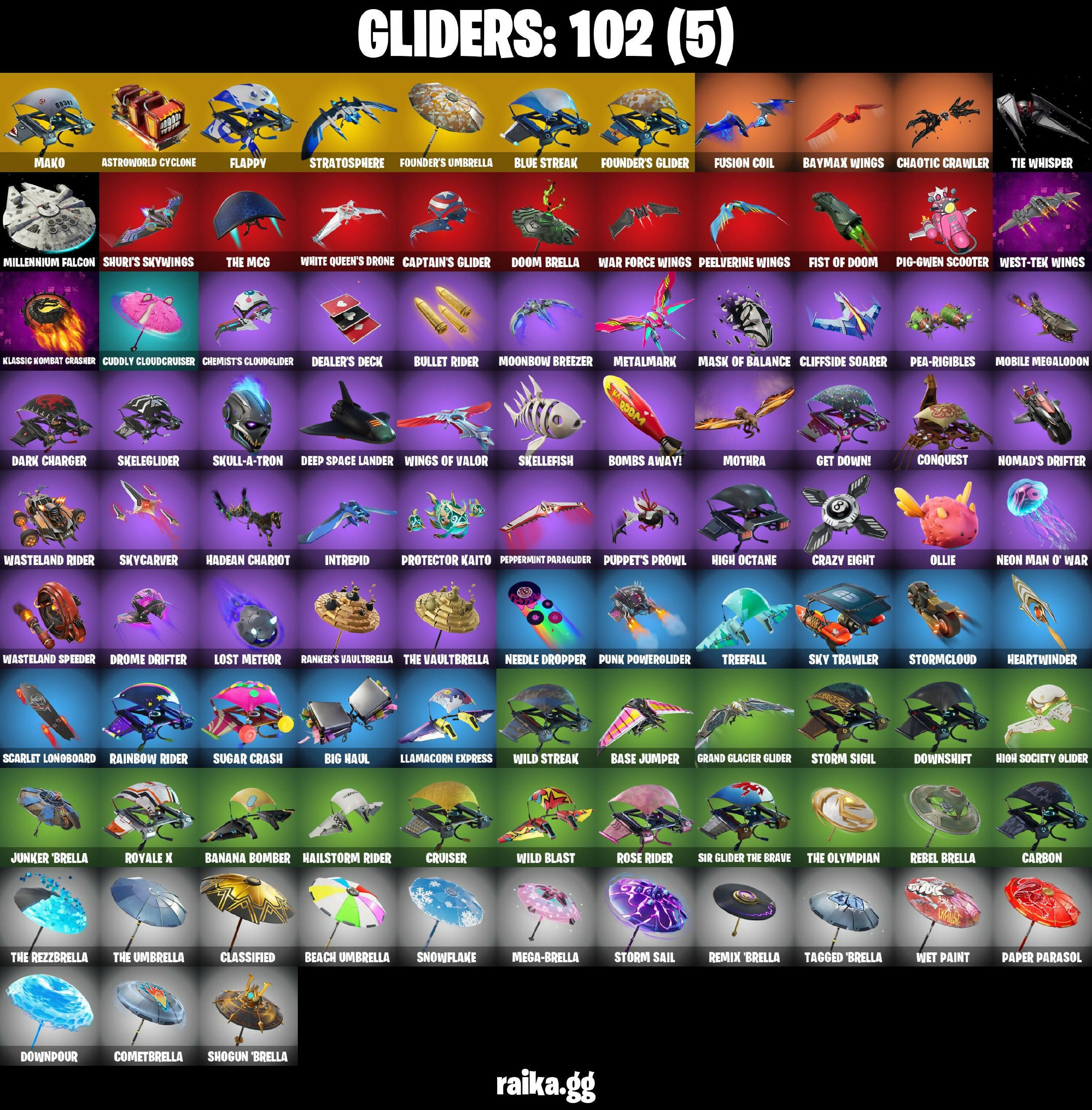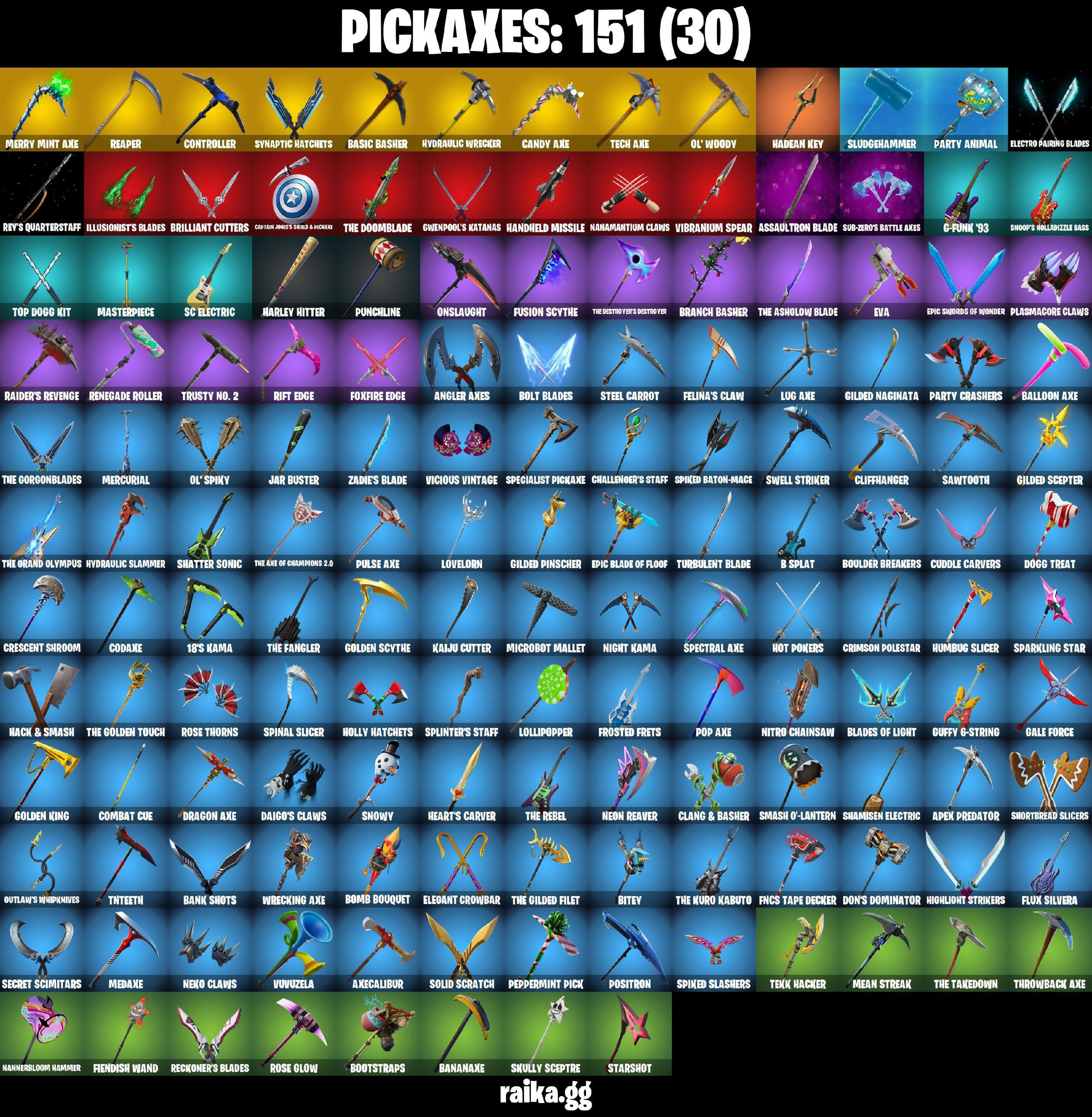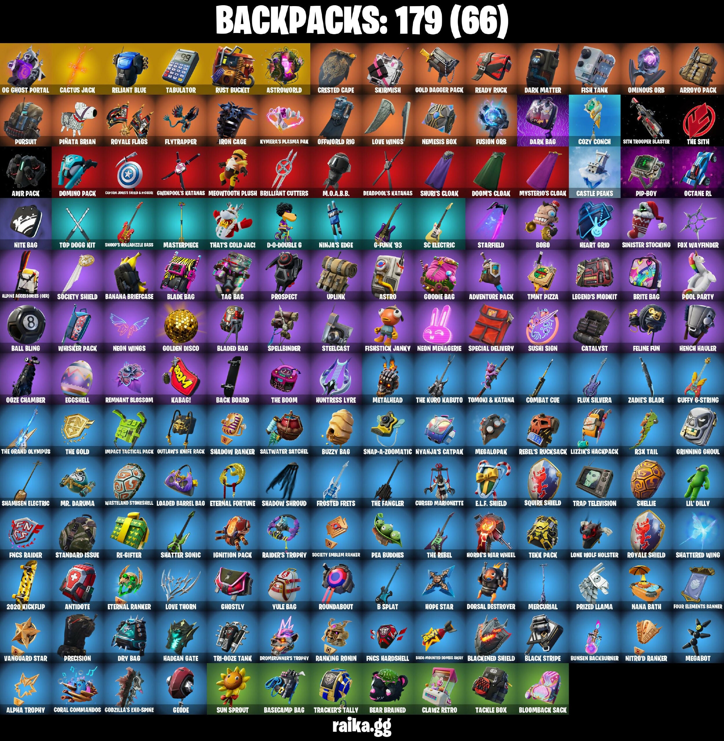 (Snikt!), 1-Ball, 18's Kama, 2020 Kickflip, 8-Ball Vs Scratch, ASMR Keys, AWR Pack, Abstrakt, Adventure Pack, Aerial Assault Trooper, Agent Peely, Alpha Trophy, Alpine Accessories (OER), Alpine Ace (Ger), Always Fantabulous, Andy Fangeson, Angler Axes, Antidote, Apex Predator, Arroyo Pack, Assaultron Blade, Astro, Astro Jack, Astroworld, Astroworld Cyclone, Axecalibur, B Splat, Back Board, Back-Mounted Bombs Away, Backstroke, Ball Bling, Balloon Axe, Banana Bomber, Banana Briefcase, Bananaxe, Bank Shots, Baron's Hoard, Base Jumper, Basecamp Bag, Basic Basher, Battle Blessing, Battle Hound, Battlehawk, Baymax Wings, Beach Umbrella, Bear Brained, Beep Beep, Best Mates, Big Haul, Billy, Billy Bounce, Billy's Tricycle, Bird Call, Bitey, Black Panther (Shuri), Black Queen, Black Stripe, Blackened Shield, Blade Bag, Bladed Bag, Blades of Light, Bloomback Sack, Blue Squire, Blue Streak, Blue Team Leader, Bobo, Boing!, Bolt Blades, Bomb Bouquet, Bombs Away!, Boneless, Bonny Brawler, Boogie Down, Bootstraps, Boulder Breakers, Bounce Wit' It, Bracer, Branch Basher, Breakin', Breezy, Brilliant Cutters, Bring It Around, Brite Bag, Brite Gunner, Brite Moves, Brite Raider, Brutus, Bullet Rider, Bunnywolf, Bunsen Backburner, Bushranger, Business Hips, Buzzy Bag, Cactus Jack, California Love, Call Me, Cameo Vs Chic, Camo War Machine, Candy Axe, Cap Kick, Captain John's Shield & Pickaxe, Captain Jones, Captain Jones's Shield & Pickaxe, Captain LLamerica, Captain's Glider, Carbide, Carbon, Castle Peaks, Castor, Catalyst, Cauldron Chill, Chalked Up 1-Ball, Challenger's Staff, Champion Kuno, Champion PJ, Chaos Agent, Chaos Director, Chaotic Crawler, Chef's Special, Chemist's Cloudglider, Chill Count, Choice Knit, Clang & Basher, Clash, Classic Peelverine, Classified, Clawz Retro, Cliffhanger, Cliffside Soarer, Codaxe, Codename E.L.F., Codsworth's Cleanup, Coin Flip, Combat Cue, Cometbrella, Conquest, Contract Giller, Controller, Controller Crew, Coral Commandos, Corrupted, Cozy Conch, Crazy Eight, Crazyboy, Crescent Shroom, Crested Cape, Crimson Polestar, Crown, Crowning Achievement, Cruiser, Cuddle Carvers, Cuddly Cloudcruiser, Cuffy 6-String, Cursed Marionette, D-O-Double G, Dab, Daigo, Daigo's Claws, Dark Bag, Dark Bomber, Dark Charger, Dark Gwenpool, Dark Matter, Dark Voyager, Deadpool, Deadpool's Katanas, Dealer's Deck, Deep Space Lander, Demon Hunter Hope, Desirable, Dogg Treat, Domino, Domino Pack, Don's Dominator, Doom, Doom Brella, Doom's Cloak, Dorsal Destroyer, Downpour, Downshift, Dragon Axe, Dream, Drift, Drome Drifter, Dromerunner's Trophy, Droop, Drop Dee, Dry Bag, E.L.F. Shield, Eggshell, Electro Pairing Blades, Electro Shuffle, Elegant Crowbar, Elite Agent, Elite Zadie, Emma Frost, Empty Out Your Pockets, Epic Blade of Floof, Epic Swords of Wonder, Eternal Fortune, Eternal Ranker, Eva, Expressionism, FNCS Hardshell, FNCS Raider, FNCS Tape Decker, Facet, Fate, Felina, Felina's Claw, Feline Fun, Fiendish Wand, Fire Show, Fireworks Salvo, Fish Tank, Fishin', Fishstick, Fishstick Janky, Fist Bump, Fist of Doom, Flappy, Flux Silvera, Flytrap, Flytrapper, Foil Flex, Founder's Glider, Founder's Umbrella, Four Elements Banner, Fox Wayfinder, Foxfire Edge, Fresh, Frosted Frets, Frozen Fishstick, Frozen Nog Ops, Full Tilt, Funk Ops, Fusion, Fusion Coil, Fusion Orb, Fusion Scythe, G-Funk '93, Gale Force, Gear Specialist Maya, Gentleman's Dab, Geode, Get Down!, Get Griddy, Get H.O.T., Ghostly, Ghoul Trooper, Gilded Naginata, Gilded Pinscher, Gilded Scepter, Godzilla Evolved, Godzilla's Exo-Spine, Gold Dagger Pack, Golden Disco, Golden King, Golden Scythe, Goodie Bag, Grand Glacier Glider, Green Roots Billie, Grinning Ghoul, Groove Jam, Guffy 6-String, Guild, Gwen-Step, Gwendpool, Gwenpool's Katanas, Hack & Smash, Hadean Chariot, Hadean Gate, Hadean Key, Hailstorm Rider, Handheld Missile, Harley Hitter, Harley Quinn, Harmonizer, Have A Seat, Hazard, Head Banger, Heart Grid, Heart's Carver, Heartwinder, Helichopper, Hellfire Dance, Helmet On, Hench Hauler, Hero Baymax, Heroic Hope, High Five, High Octane, High Society Glider, Highlight Strikers, Holly Hatchets, Hope Star, Horde's War Wheel, Hot Marat, Hot Pokers, Hula Hoopin', Humbug Slicer, Huntress, Huntress Lyre, Hush, Hydraulic Slammer, Hydraulic Wrecker, Hype, I Declare!, I Like To Move It, Ignition Pack, Illusionist's Blades, Imani, Impact Tactical Pack, Infinity, Intrepid, Introducing..., Invisible Cut, Iris, Iron Cage, Jabba Switchway, Jade, Jar Buster, Jellie, Jet Signals, Journey Vs Hazard, Jubilation, Jumpshot, Jungle, Junker 'Brella, Kabago!, Kaiju Cutter, Kendo, Kev, Kintsugi Daigo, Klassic Kombat Crasher, Kymera, Kymera's Plasma Pak, Kyrian Aryk, LBC '93 Dogg, Lady Of Cranes, Laugh It Up, Leapin', Legend's Modkit, Leviathan, Lil' Dilly, Lil' Godzilla Attack, Liteshow, Lizzik, Lizzik's Hackpack, Llamacorn Express, Loaded Barrel Bag, Lock It Up, Lollipopper, Lone Wolf Holster, Lost Meteor, Love Ranger, Love Thorn, Love Wings, Lovelorn, Lt. Evergreen, Lucid Dreams, Lucky Nyanja, Lug Axe, M.O.A.B.B., Ma-Ya-Hi, Make A Seat, Mako, Marked Marauder, Mask Off, Mask of Balance, Masterpiece, Mean Streak, Medaxe, Mega-Brella, Megabot, Megalo Don, Megalopak, Meoviscies, Meowtooth Plush, Mercurial, Merry Mint Axe, Metalhead, Metalmark, Microbot Mallet, Midas, Midnight Skye, Millennium Falcon, Miss Bunny Penny, Mission Specialist, Mobile Megalodon, Moonbow Breezer, Moongazer, Moonwalker, Mothra, Mr. Daruma, Mysterio, Mysterio's Cloak, Mysterio's Magic Trick, Mystica, Nana Bath, Nanamatium Claws, Nannerbloom Hammer, Needle Dropper, Neko Claws, Nemesis Box, Neon Man O' War, Neon Menagerie, Neon Reaver, Neon Wings, Never Gonna, Night Hunter Scarr, Night Kama, Ninja, Ninja Stance: Donnie, Ninja Stance: Leo, Ninja Style, Ninja's Edge, Nite Bag, Nite Gunner, Nitro Chainsaw, Nitro Fusion Medal Don, Nitro'd Ranker, Nog Ops, Nomad's Drifter, Nyanja, Nyanja's Catpak, Octane RL, Offworld Rig, Og Ghost Portal, Og Skull Trooper, Ol' Spiky, Ol' Woody, Ollie, Omega, Omi