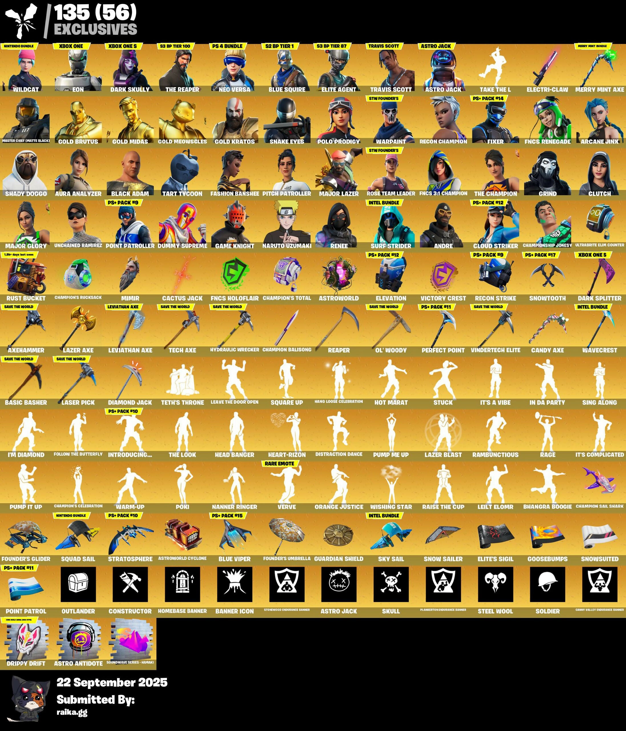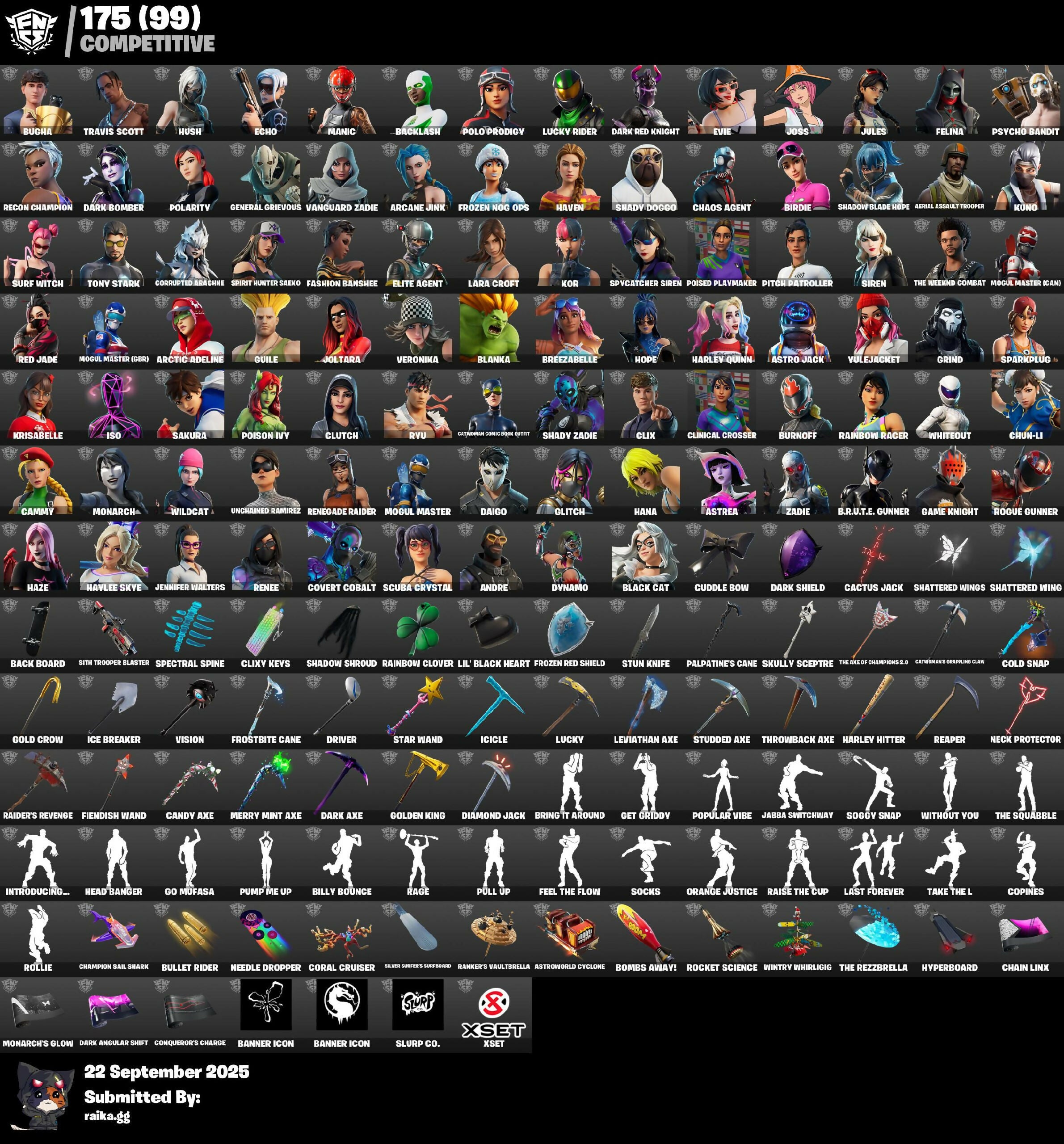 OG Fortnite Account☑️733 Skins☑️Wildcat (Full Bundle)☑️Eon☑️Dark Skully☑️Neo Versa☑️Gold Kratos (PS5)☑️S2 Knights☑️The Reaper☑️Travis Scott (Full Bundle)☑️The Champion☑️Major Glory☑️Recon Champion☑️Dummy Supreme☑️Merry Mint Axe☑️Leviathan Axe☑️Take the L