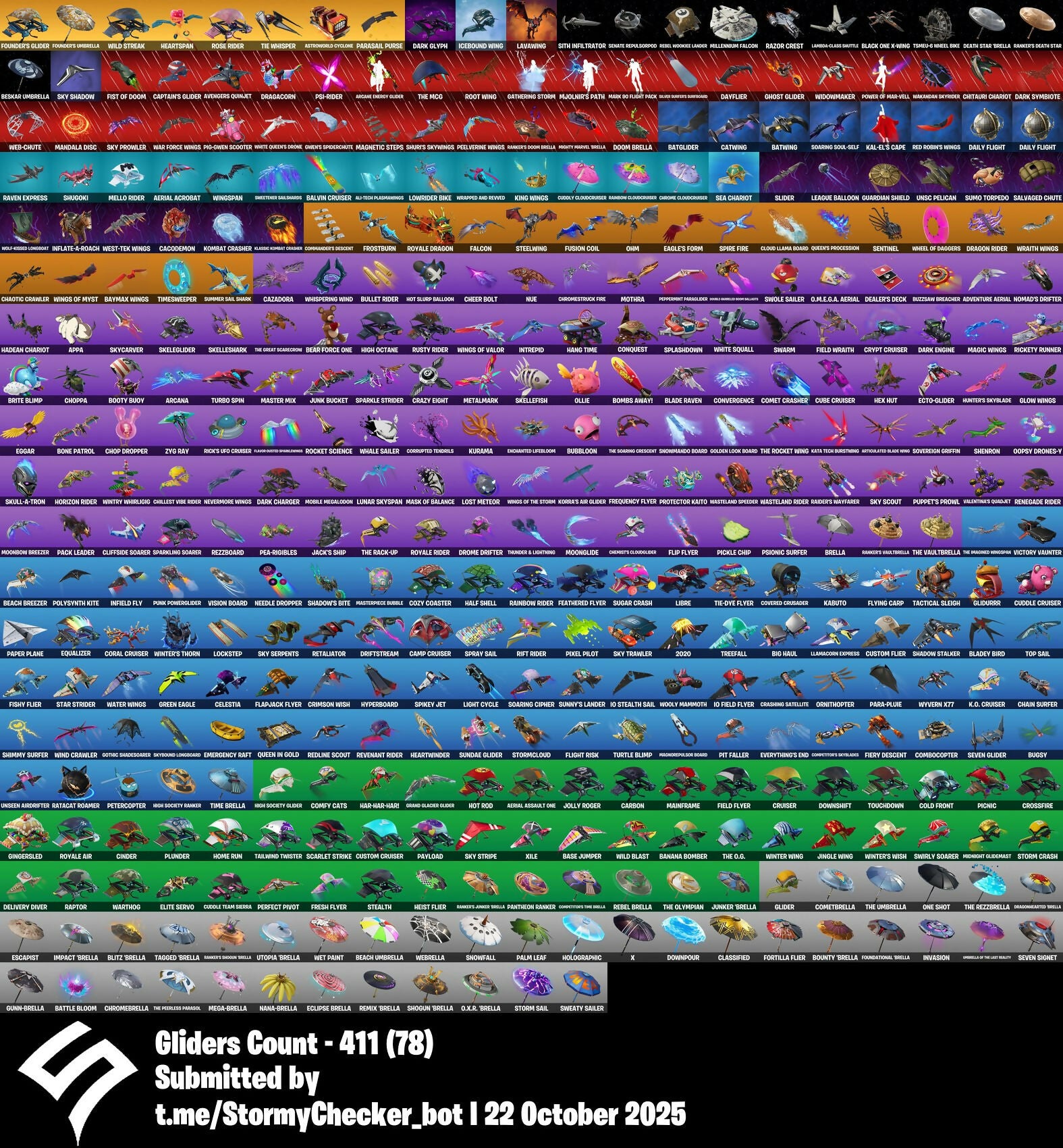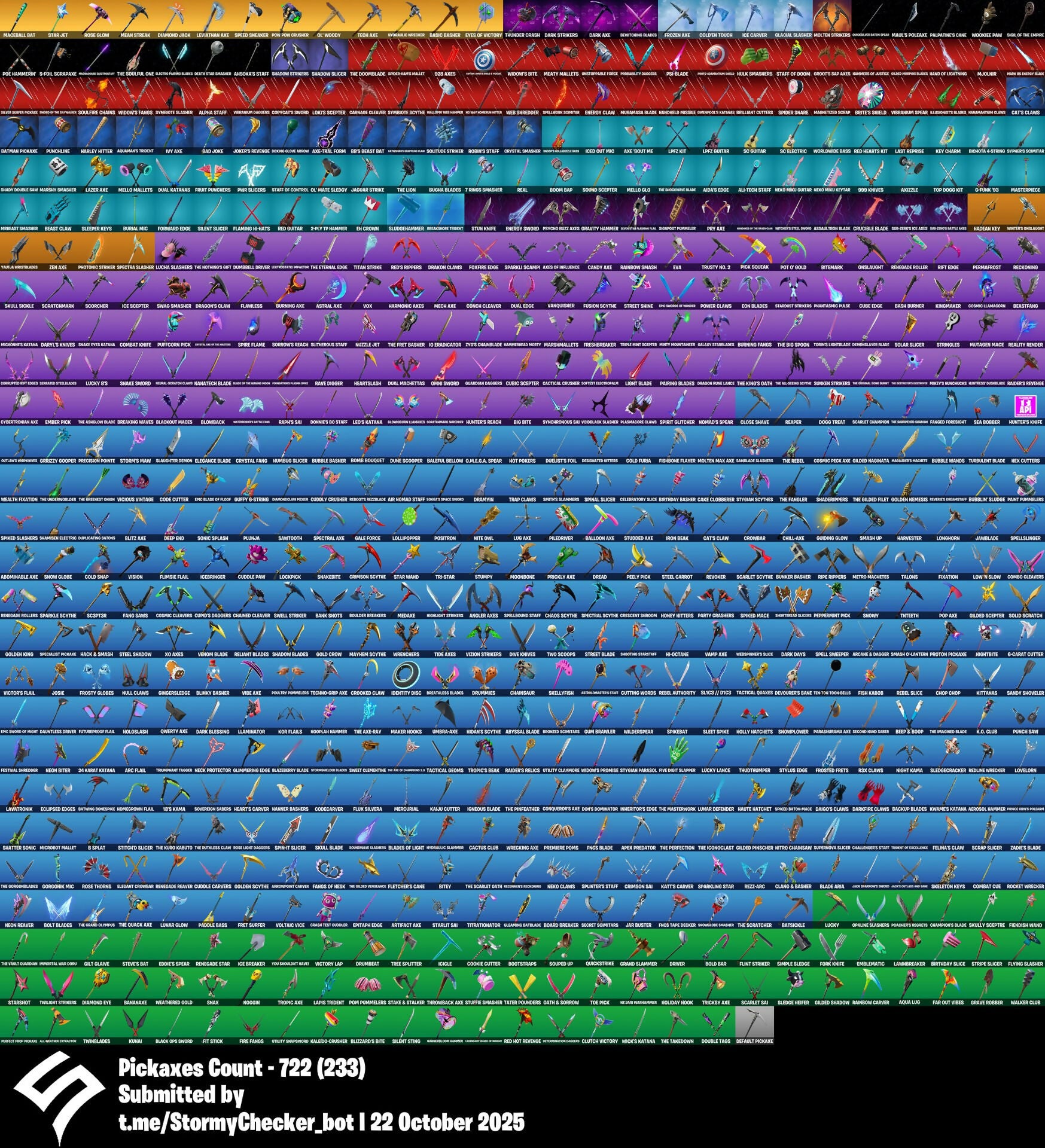 (Snikt!), 1-40 Power Angel, 10 Field Flyer, 10 Orchestrator, 10 Stealth Sail, 18'S Kama, 2-Ply TP Hammer, 2020, 2020 Kickoff, 2099 Web Cape, 24 Karat Katana, 4 Jilletzy, 6-Carat Cutter, 7 Rings Smasher, 9000 Knives, 9029 Axes, 999 Wings, @Real_Jonny, AFK, Aang, Aang's Air Sphere, Abominable Axe, Abstrakt, Abyssal Blade, Abyssal Vault, Access Core, Accolades, Acronie Couture, Adira, Adventure Aerial, Adventure Pack, Aerial Acrobat, Aerial Assault One, Aerosol Hammer, Afterparty, Agent Enforcer, Agent Jones, Agent Peely, Agent Stories, Ahsoka Tano, Ahsoka's Staff, Aida's Edge, Air Nomad Staff, Air Pack, Air Shredder, Air Worn, Alias, All-Seeing Scythe, All-Tech Plasmingas, All-Tech Staff, Alli, Alok, Alpha Staff, Alpha Trophy, Altitude, Alto, Always Battle Ruins, Amazing Cube, Amazing Feets, Ambitious, Amity, Anarchists Apt, Anarchy Agent, Ancestral Blade, Anderson Paak, Andre, Andy Fanderson, Anemone, Angler Axes, Angy Counter, Antidote, Antonia, Apex Predator, Aphrodite, Apocalyptic Shroud, Appa, Apprentice Evee, Aqua Crystal, Aqua Lug, Aquaman, Aquaman's Trident, Arachnobatics, Arc Flail, Arcadino Tote, Arcana, Arcane & Dagger, Arcane Energy Glider, Arcane Jinx, Arcane Junk, Arcane Research, Archon, Arctic Adeline, Arctica, Arentar Statue Fang Shard, Ares, Ariana Grande, Arrowsport Carver, Arroyo Pack, Articulated Blade Wing, Artifact Axe, Aspen, Assassin Pack, Assaulltron Blade, Astira, Astra, Astral Axe, Astro Jack, Astroblasters Staff, Astroworld, Astroworld Cyclone, Atmosphere, Aur Max 1'86, Aura, Auric, Auto Clutch, Autobot Emblem, Avatar Cycle, Avatars Flourish, Avengers Quinjet, Awk. Shucks., Axe Bout Me, Axe Lamps, Axe of Wands, Axe of the Winning Pool, Axe-Trail Form, Axel Shadows Blade, Axis of Influence, Axizzle, Ayia Wynn, Azaran Tha', Aztralove Assassin, B-Splat, B.a.r.e.t.e. Gunner, BB's Beast Bat, BPM Breakdown, Baba Yaga, Baby Ginny, Back Bloom, Back Board, Back DPS Backpanel, Back On 74, Back-O-Lantern, Backstabber, Backstroke, Backtracker, Backup Blades, Bacon Vs. Board, Bad Basket, Bad Bibble's Rucksack, Bad Boss, Bad Joke, Balance Board, Ball Bling, Ball VS Scorpio, Ball in Play, Ballbear Bellow, Baller, Balletic, Balloon Axe, Balls of Power, Ballsy, Balvin Cruiser, Ban Ban Sang Ban, Banana Bag, Banana Bomber, Banana Cabana, Bananaxe, Bandollete, Bank Shots, Banner Cape, Banner Shell, Bans' Sak Kolster, Base Jumper, Basecamp Bag, Basement Key, Basic Basher, Basin Burner, Bat Attitude, Bat Royale, Bat Signal, Batglider, Batman Pickaxe, Batpad, Battiscicle, Battle Agent, Battle Balloon, Battle Blessing, Battle Bloom, Battle Bomber, Battle Call, Battle Lambax, Battle Legend, Battle Ruin, Batty Pack, Batwing, Batwing Bonespike, Baymax Wings, Be Seeing You, Beach Bomber, Beach Breezer, Beach Umbrella, Beachcomber, Beacon Glass, Bean Bag, Bear Brained, Bear Force One, Bear Hug, Beast Blaster, Beast Boy, Beast Claw, Beastfang, Beastmode, Beasttrailes Blades, Bed Chem, Bedside Manner, Beef Pack, Beep 'n Boop, Beep Beep, Behold!, Bernie, Beskar Umbrella, Best Mates, Better Moves, Bewitching Blades, Bhangra Boogie, Big Bite, Big Dawgs, Big Dill, Big Fan, Big Haul, Bike To Go, Billie's Crown, Billy Bounce, Bim Bam Boom, Biocta 4-String, Birdbaring Flourish, Birthday Basher, Birthday Cake, Birthday Slice, Bitemark, Bitey, Bitter Sweets, Bizzocchito, Black Fang, Black Hole, Black Knight, Black One X-Wing, Black Ops Sword, Black Panther, Blackened Shield, Blackheart, Blackhood, Blacklight, Blackout Bag, Blackout Maces, Blade, Blade Aria, Blade Bag, Blade Raven, Bladed Bag, Bladed Travapac, Blades of Light, Bladey Bird, Blatzbunny, Blazberry Blade, Blightmoth's Blades, Blinding Lights, Blinky Basher, Blitz 'Brella, Blitz Axe, Blitz Brigade, Blitze Wings, Blizzard's Bite, Bloodmarch Sack, Bloomin' Bouquet, Blowback, Blowing Doubles, Blown Up, Bluco, Bluster Pack, Board Breaker, Boba Bling, Boba Snack, Bobbin', Bobo, Bodd Up Groove, Bogey Bag, Bold Bar, Bold Stance, Bolt Blades, Bomb Bag, Bomb Bouquet, Bombs Away!, Bonded Of Britain, Bone Breaker, Bone Patrol, Bone Shade, Bones, Bonger, Boobytrapped, Boogie Down, Book of Cautious, Boom Bap, Boomerang Blade, Boomin', Boosting KJ, Boot It, Boots 'N' Cats, Bootstraps, Booty Buoy, Boozy, Borealis Backer, Boulder Breakers, Bounce Berry, Bouncer, Bounty 'Brella, Bow Go, Boxer, Boxing Glove Arrow, Bracer, Brain Freeze, Brainiac, Branko, Break Through, Breakaway, Breakay Handbag, Breakdown, Breakfast Bounty, Breakforce Trident, Breakin', Breaking Waves, Breakneck, Breakpoint, Breezeball, Breezy, Brella, Brilliant Cutters, Brilliant Outfits, Bring It Around, Brite Blimp, Brite Board, Brite Star, Brite's Shield, Britt Raider, Britt's Collection, Broghost, Bronto, Bronto Bag, Brozen Scombiars, Bruno Mars, Brutus, Bubble Basher, Bubble Wands, Bubblin Sludge, Bubbly Sludge, Bubloon, Buccaneer, Bucha, Bucha Blades, Buckets, Buckle Up, Buddy Bag, Bugsy, Build Up, Bullet Proof, Bullet Rider, Bully, Bunker Basher, Bunker Jonesy, Bunny 'N' Inyo Bow, Bunny Brawler, Bunny Hop, Bunnywolf, Burial Mic, Burn Bright, Burning Axe, Burning Fangs, Burs Witch, Burst DAS SENORARO, Bushkey, Bushranger, Bushy's Bul Bas, Business Hips, Business Up Front, Busses Backdoor, Bust A Move, Busy!, Butter Robot, Buzz Pack, Buzzsaw Breacher, Buzzy Bag, Bytes, CR26, Cable, Cable Cloak, Cached, Cacodemon, Cactus Club, Cactus Jack, Cake Clobberer, Calamity, Calculated, Calice Frazer, Calico-Donut, Call Me, Called Shot, Calling Card, Cambion Cleaver, Camera Celebration, Camo Carrier, Camp Cruiser, Campy, Candy Axe, Candyman Cape, Cape of Potassius, Capearon, Caper, Capoeira, Captain America, Captain Clamerica, Captain Jones, Captain Marvel, Captain Phasma, Captain's Glider, Carbon, Carbon Fiber Belt, Card Drop, Cardistry, Cargo vs Claws, Carnage, Carshene Rosso, Cash 'N' Quacks, Cassidy Quinn, Castle Peaks, Castor, Cat Flip, Cat's Claw, Cat's Claws, Catalyst, Catastrophe, Catling Gun, Catrina, Catwing, Catwoman Zero, Cauldron Chill, Cazadora, Cazadora Wings, Celebratory Slice, C
