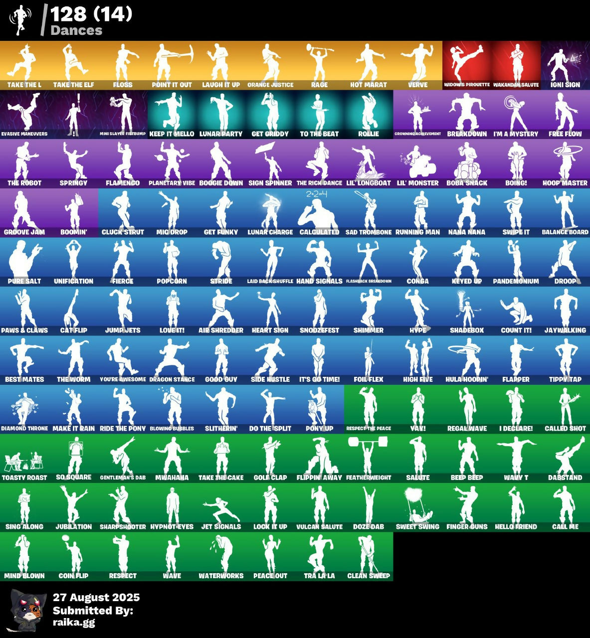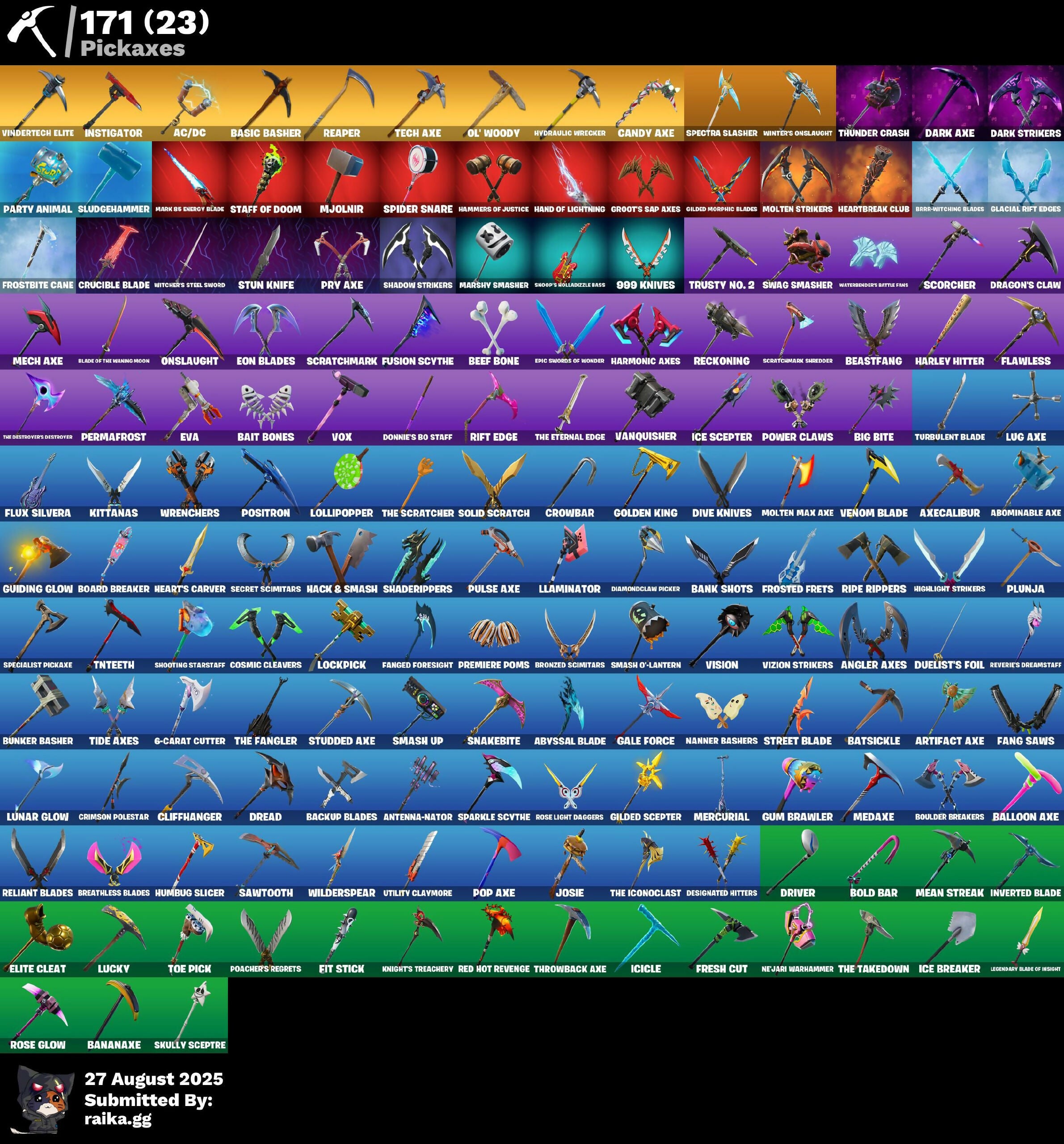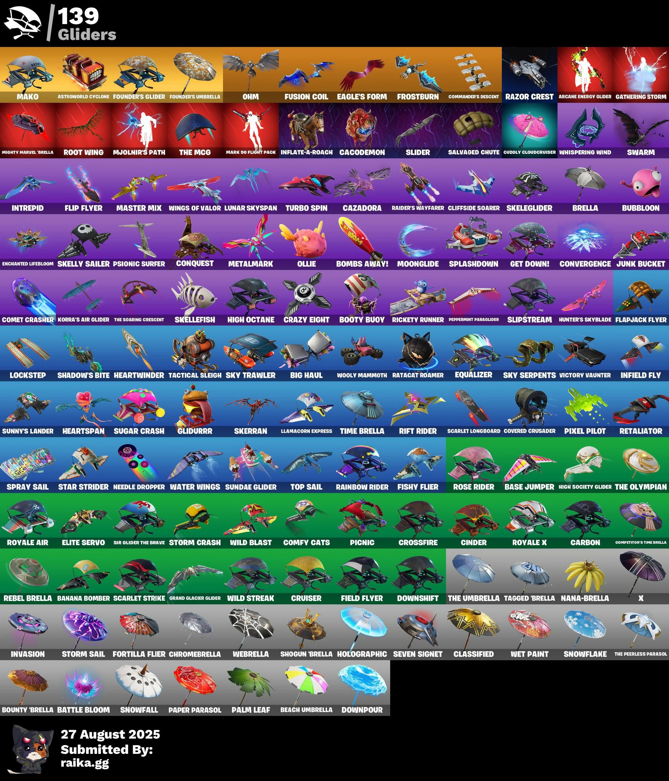 6-Carat Cutter, 8-Ball vs Scratch, 999 Knives, A.I.M., AC/DC, Abominable Axe, AbseNz, Abyssal Blade, Agent Jones, Agent Peely, Air Shredder, Angler Axes, Antenna-Nator, Aphrodite, Arcane Energy Glider, Artifact Axe, Assault Trooper, Astro Antidote, Astro Jack, Astroworld Cyclone, Axecalibur, B.R.U.T.E. Gunner, Backup Blades, Bait Bones, Balance Board, Balloon Axe, Banana Bomber, Bananaxe, Bank Shots, Base Jumper, Basic Basher, Batsickle, Battle Bloom, Battle Bus, Battlehawk, Beach Umbrella, Beastfang, Beef Bone, Beep Beep, Best Mates, Big Bite, Big Haul, Black Knight, Black Shield, Blackheart, Blade Of The Waning Moon, Blowing Bubbles, Blue Squire, Board Breaker, Boba Snack, Boing!, Bold Bar, Bombs Away!, Bone Boss, Bone Ravage, Boogie Down, Boomin', Booty Buoy, Boulder Breakers, Bounty 'Brella, Brawler, Breakdown, Breathless Blades, Brella, Bronzed Scimitars, Brrr-Witching Blades, Brutus, Bubbloon, Bullseye, Bunker Basher, Bunker Jonesy, Cacodemon, Cactus Jack, Calamity, Calculated, Call Me, Called Shot, Cameo vs Chic, Candy Axe, Carbide, Carbon, Cat Flip, Catalyst, Cazadora, Cerberus, Chaos Agent, Chrome Punk, Chromebrella, Cinder, Classified, Clean Sweep, Cliffhanger, Cliffside Soarer, Cluck Strut, Cobalt, Codename E.L.F., Coin Flip, Comet Crasher, Comfy Cats, Commander's Descent, Commando, Competitor's Time Brella, Conga, Conquest, Constructor, Convergence, Cosmic Cleavers, Count It!, Covered Crusader, Crazy Eight, Crimson Polestar, Crossfire, Crowbar, Crowning Achievement, Crucible Blade, Cruiser, Crusher, Cuddly Cloudcruiser, Curse Buster, DJ Yonder, Dabstand, Dark Axe, Dark Bomber, Dark Jonesy, Dark Power Chord, Dark Red Knight, Dark Strikers, Dark Voyager, Dark Wild Card, Deadpool, Demi, Designated Hitters, Diamond Diva, Diamond Throne, Diamondclaw Picker, Dire, Dive Knives, Do The Split, Doctor Doom, Donatello, Donnie's Bo Staff, Doom Slayer, Downpour, Downshift, Doze Dab, Dragon Stance, Dragon's Claw, Dread, Drift, Driver, Droop, Drop Dee, Duelist's Foil, Dusk, Dusty, Dynamo, Eagle's Form, Elite Agent, Elite Cleat, Elite Servo, Ember, Enchanted Lifebloom, Enforcer, Eon Blades, Epic Swords Of Wonder, Equalizer, Eva, Evasive Maneuvers, Ex, Fable, Fade, Fang Saws, Fanged Foresight, Featherweight, Field Flyer, Fierce, Finger Guns, Fishskull, Fishy Flier, Fit Stick, Flamenco, Flapjack Flyer, Flapper, Flashback Breakdown, Flawless, Flip Flyer, Flippin' Away, Floss, Flux Silvera, Foil Flex, Fortilla Flier, Founder's Glider, Founder's Umbrella, Free Flow, Fresh Cut, Frost Broker, Frostbite Cane, Frostburn, Frosted Frets, Frozen Fishstick, Frozen Nog Ops, Fusion, Fusion Coil, Fusion Scythe, Gale Force, Gathering Storm, Gear Specialist Maya, Gentleman's Dab, Geralt of Rivia, Get Down!, Get Funky, Get Griddy, Ghoul Trooper, Giddy-Up, Gilded Morphic Blades, Gilded Scepter, Ginger Gunner, Glacial Rift Edges, Glidurr, Gold Midas, Golden King, Golf Clap, Good Guy, Grand Glacier Glider, Groot, Groot's Sap Axes, Groove Jam, Guiding Glow, Gum Brawler, Gumbo, Hack & Smash, Hammers Of Justice, Hand Of Lightning, Hand Signals, Harley Hitter, Harley Quinn, Harmonic Axes, Haven, Havoc, Heart Sign, Heart's Carver, Heartbreak Club, Heartbreak Ranger, Heartspan, Heartwinder, Hello Friend, Helsie, High Five, High Octane, High Society Glider, Highlight Strikers, Holiday Boy1, Holly Jammer, Holographic, Hoop Master, Hope, Hopper, Hot Marat, Hula Hoopin', Humbug Slicer, Hunter's Skyblade, Huntress, Hybrid, Hydraulic Wrecker, Hype, Hypnot-eyes, I Declare!, I'm A Mystery, Ice Breaker, Ice Scepter, Icicle, Igni Sign, Infield Fly, Inflate-A-Roach, Instigator, Instinct, Intrepid, Invasion, Inverted Blade, Iris, Iso, It's Go Time!, Jaywalking, Jennifer Walters, Jet Signals, Josie, Journey vs Hazard, Jubilation, Jules, Jump Jets, Junk Bucket, Kaws Skeleton, Keep It Mello, Keyed Up, Kit, Kittanas, Knight's Treachery, Korra, Korra's Air Glider, Lada, Laguna, Laid Back Shuffle, Lara Croft, Laugh It Up, Legendary Blade Of Insight, Lil Split, Lil' Longboat, Lil' Monster, Llamacorn Express, Llaminator, Lock It Up, Lockpick, Lockstep, Lollipopper, Love It!, Love Ranger, Lt. John Llama, Lucky, Lug Axe, Lunar Charge, Lunar Glow, Lunar Party, Lunar Skyspan, Luxe, Lynx, Make It Rain, Mako, Mancake, Mandalorian, Manic, Mark 85 Energy Blade, Mark 90 Flight Pack, Marshy Smasher, Massai, Master Kev, Master Mix, Mave, Maven, Mean Streak, Mech Axe, Mecha Team Banner, Medaxe, Meowscles, Mercurial, Metalmark, Mic Drop, Mighty Marvel 'Brella, Mind Blown, Mini Slayer Fistbump, Mission Specialist, Mjolnir, Mjolnir's Path, Mogul Master (Owl), Molten Max Axe, Molten Omen, Molten Strikers, Monster Team Banner, Montague, Moonglide, Moonwalker, Mr. Meeseeks, Mwahaha, Mystique, Nana Nana, Nana-Brella, Nanner Bashers, Ne'Jari Warhammer, Needle Dropper, Nezumi, Nightshade, Nisha, Nog Ops, Ocean, Ohm, Ol' Woody, Ollie, Omega, Omegarok, Onesie, Onslaught, Orange Justice, Oscar, Outlander, Palm Leaf, Pandemonium, Paper Parasol, Party Animal, Pathfinder, Paws & Claws, Peace Out, Peely, Peppermint Paraglider, Permafrost, Peter Griffin, Picnic, Pinkie, Pixel Pilot, Planetary Vibe, Plunja, Poacher's Regrets, Point It Out, Pony Up, Pop Axe, Popcorn, Positron, Powder, Power Claws, Predator, Premiere Poms, Pry Axe, Psionic Surfer, Pulse Axe, Pure Salt, Rage, Ragnarok, Raiders Wayfarer, Rainbow Rider, Ratacat Roamer, Raven, Razor Crest, Reaper, Rebel Brella, Reckoning, Red Hot Revenge, Red Jade, Redline, Reese, Regal Wave, Relay, Reliant Blades, Remedy vs Toxin, Renegade, Renegade Lynx, Respect, Respect The Peace, Retaliator, Reverie, Reverie's Dreamstaff, Rickety Runner, Ride The Pony, Rift Edge, Rift Rider, Ripe Rippers, Rippley vs Sludge, Rogue Agent, Rollie, Ronin, Rook, Root Wing, Rose Glow, Rose Light Daggers, Rose Rider, Rose Team Leader, Rox, Royale Air, Royale Knight, Royale X, Ruin, Running Man, Runway Racer, Rust Lord, Sad Trombone, Salute, Salvaged Chute, Samurai Scrapper, Sandshark Driver, Santa Dogg, Sawtooth, Scarlet Longboard, Scarlet Str