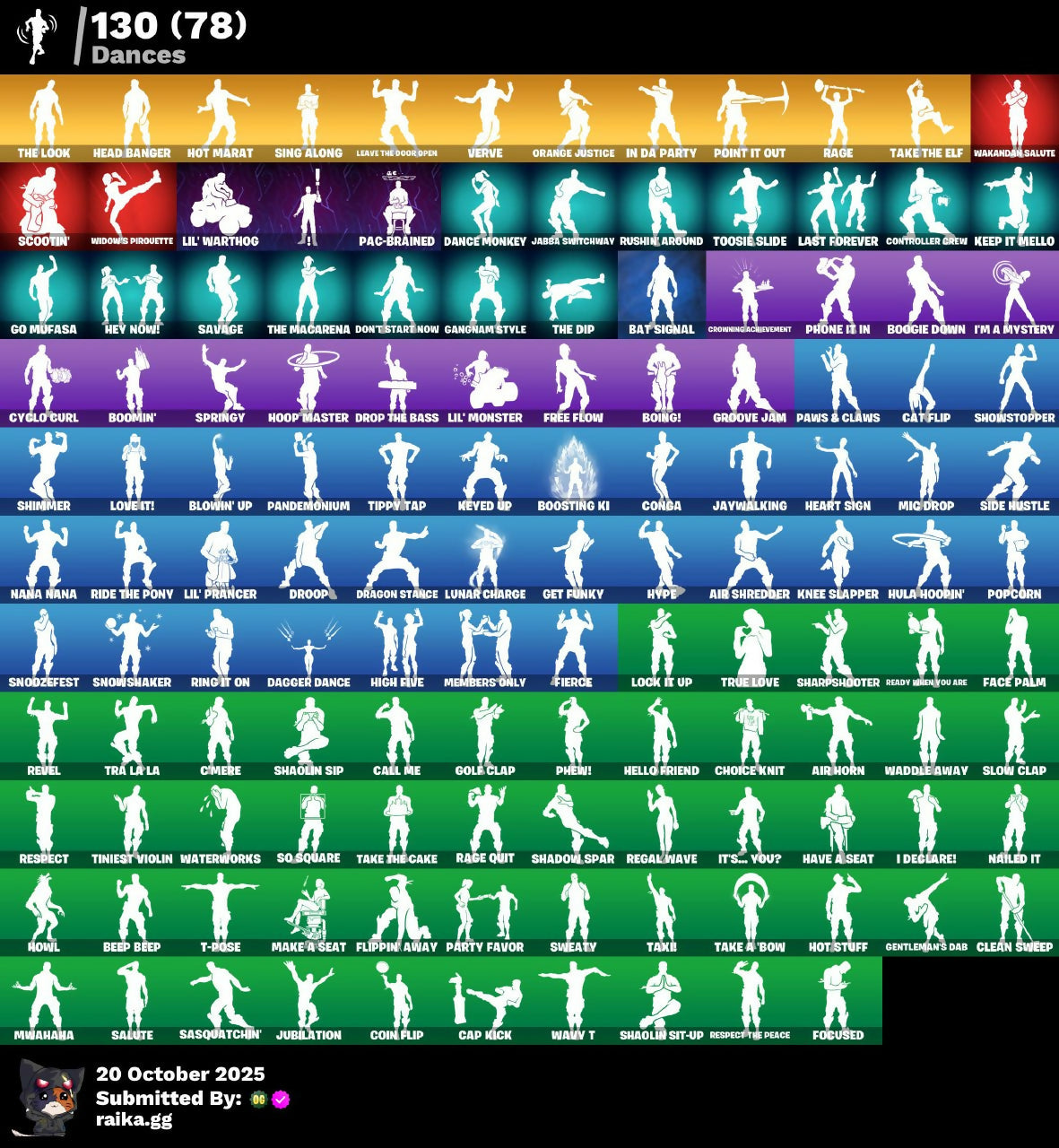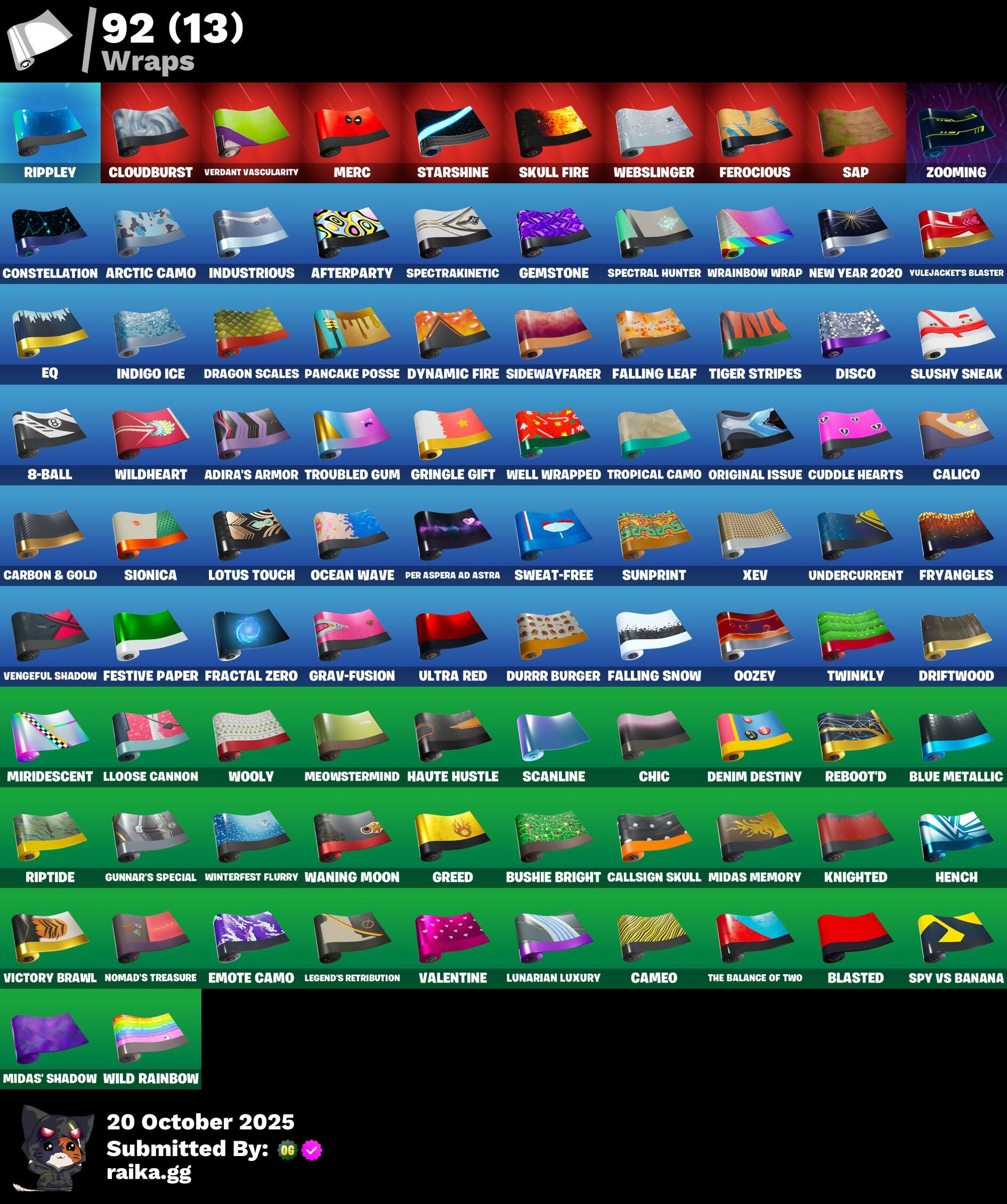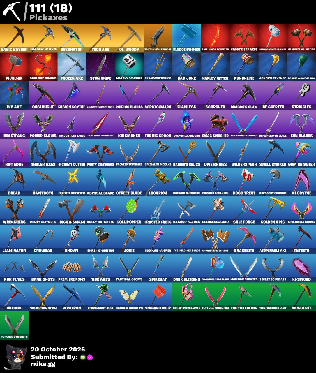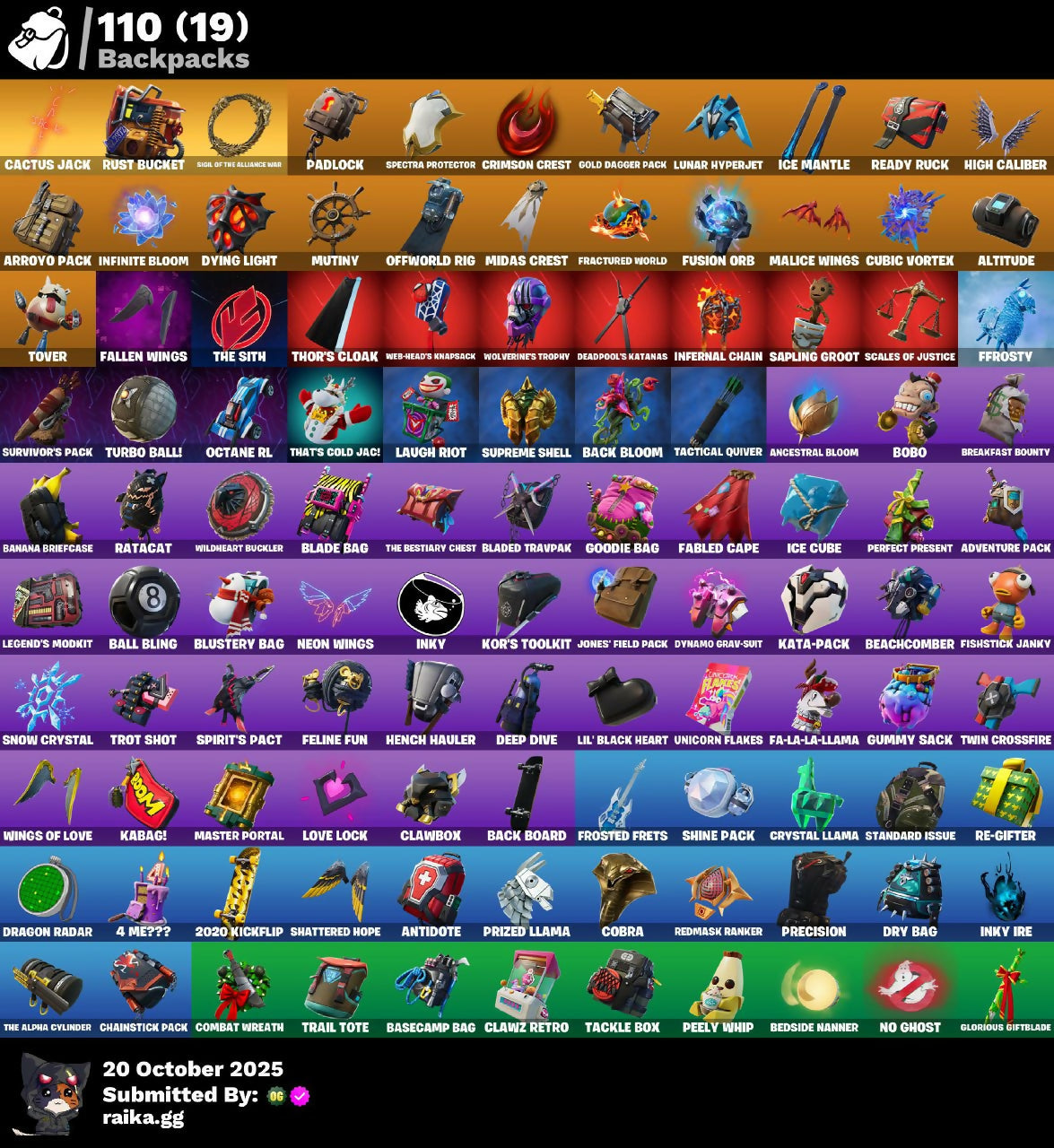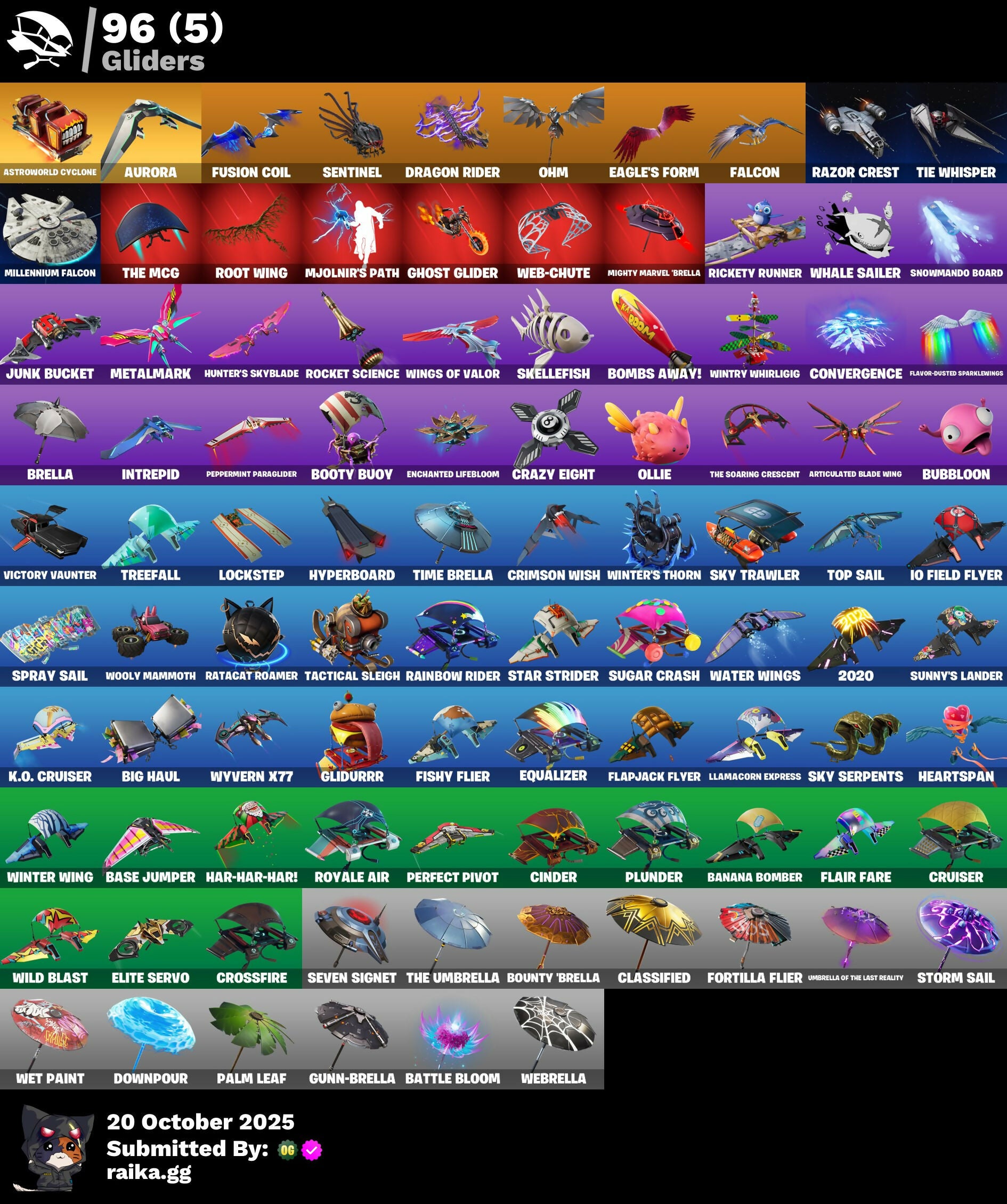 2020, 2020 Kickflip, 4 Me???, 6-Carat Cutter, 8-Ball, 8-Ball Vs Scratch, Abominable Axe, AbsenZ, Abyssal Blade, Adira, Adira's Armor, Adventure Pack, Afterparty, Agent Jones, Agent Peely, Air Horn, Air Shredder, Altitude, Ancestral Bloom, Angler Axes, Antidote, Aquaman, Aquaman's Trident, Arctic Adeline, Arctic Camo, Arroyo Pack, Articulated Blade Wing, Astroworld Cyclone, Aurora, Back Bloom, Back Board, Backup Blades, Bad Joke, Ball Bling, Banana Bomber, Banana Briefcase, Bananaxe, Bank Shots, Base Jumper, Basecamp Bag, Basic Basher, Bat Signal, Battle Bloom, Battlehawk, Beachcomber, Beastfang, Bedside Nanner, Beep Beep, Big Haul, Blackheart, Blade Bag, Blade of the Waning Moon, Bladed Travpak, Blasted, Blowin' Up, Blue Metallic, Blustery Bag, Bobo, Boing!, Bombs Away!, Boogie Down, Boomin', Boosting Ki, Booty Buoy, Boulder Breakers, Bounty 'Brella, Boxing Glove Arrow, Breakfast Bounty, Breathless Blades, Brella, Bronzed Scimitars, Brutus, Bubbloon, Bushie Bright, C'mere, Cactus Jack, Calico, Call Me, Callsign Skull, Cameo, Cameo Vs Chic, Cap Kick, Carbide, Carbon & Gold, Cat Flip, Catalyst, Chainstick Pack, Charlotte, Chic, Choice Knit, Cinder, Classified, Clawbox, Clawz Retro, Clean Sweep, Cloudburst, Cobra, Coin Flip, Combat Wreath, Conga, Constellation, Controller Crew, Convergence, Cosmic Cleavers, Cosmic Llamacorn, Crazy Eight, Crescent Shroom, Crimson Crest, Crimson Wish, Crossfire, Crowbar, Crowning Achievement, Cruiser, Crystal Llama, Cubic Vortex, Cuddle Hearts, Cyclo Curl, D'Ark, Dagger Dance, Dance Monkey, Dark Blessing, Deadpool, Deadpool's Katanas, Deep Dive, Demonslayer Blade, Denim Destiny, Diamond Diva, Disco, Dive Knives, Dogg Treat, Don't Start Now, Downpour, Dragon Radar, Dragon Rider, Dragon Rune Lance, Dragon Scales, Dragon Stance, Dragon's Claw, Dread, Drift, Driftwood, Droop, Drop The Bass, Dry Bag, Durrrr Burger, Dying Light, Dynamic Fire, Dynamo Grav-Suit, EQ, Eagle's Form, Elite Servo, Ember, Emote Camo, Enchanted Lifebloom, Eon, Eon Blades, Epic Swords of Wonder, Equalizer, Evie, Fa-La-La-Llama, Fabio Sparklemane, Fabled Cape, Face Palm, Fade, Falcon, Fallen Love Ranger, Fallen Wings, Falling Leaf, Falling Snow, Feline Fun, Ferocious, Festive Paper, Ffrosty, Fierce, Fishstick Janky, Fishy Flier, Flair Fare, Flapjack Flyer, Flawless, Flippin' Away, Focused, Fortilla Flier, Foundation's Plasma Spike, Fractal Zero, Fractured World, Free Flow, Frosted Frets, Frozen Axe, Fry Angles, Fusion, Fusion Coil, Fusion Orb, Fusion Scythe, Galaxia, Gale Force, Gangnam Style, Gear Specialist Maya, Gemstone, Gentleman's Dab, Get Funky, Ghost Glider, Ghost Rider, Gilded Scepter, Glidurrr, Glorious Giftblade, Go Mufasa, Goku Black, Gold Dagger Pack, Gold Midas, Golden King, Golf Clap, Goodie Bag, Grav-Fusion, Greed, Green Arrow, Gringle Gift, Groot, Groot's Sap Axes, Groove Jam, Gum Brawler, Gumbo, Gummy Sack, Gunn-Brella, Gunnar's Special, Hack & Smash, Hammers of Justice, Har-Har-Har!, Harley Hitter, Harley Quinn, Harlowe, Haute Hustle, Have A Seat, Haven, Head Banger, Heart Sign, Heartspan, Hello Friend, Hench, Hench Hauler, Hey Now!, High Caliber, High Five, Highlight Strikers, Holiday Boxy, Holly Hatchets, Hoop Master, Hooplah Hammer, Hope, Hot Marat, Hot Stuff, Howl, Hula Hoopin', Hunter's Skyblade, Huntress, Hybrid, Hydraulic Wrecker, Hype, Hyperboard, I Declare!, I'm A Mystery, Ice Cube, Ice Mantle, Ice Scepter, In Da Party, Indigo Ice, Industrious, Infernal Chain, Infinite Bloom, Inky, Inky Ire, Intrepid, Io Field Flyer, It's... You?, Ivy Axe, Jabba Switchwav, Jaywalking, Jennifer Walters, Joker's Revenge, Jones' Field Pack, Josie, Journey Vs Hazard, Jubilation, Jules, Junk Bucket, K.O. Cruiser, Kabag!, Kata-Pack, Keep It Mello, Keyed Up, Ki-Scythe, Ki-Sword, Kingmaker, Kit, Knee Slapper, Knighted, Kondor, Kor, Kor Flails, Kor's Toolkit, Krisabelle, Lara Croft, Last Forever, Laugh Riot, Leave The Door Open, Legend's Modkit, Legend's Retribution, Lil' Black Heart, Lil' Monster, Lil' Prancer, Lil' Warthog, Llamacorn Express, Llaminator, Lloose Cannon, Lock It Up, Lockpick, Lockstep, Lollipopper, Lotus Touch, Love It!, Love Lock, Lt. Evergreen, Lt. John Llama, Lunar Charge, Lunar Hyperjet, Lunarian Luxury, Luxe, Lynx, Make A Seat, Malice, Malice Wings, Mancake, Mandalorian, Marshy Smasher, Master Key, Master Portal, Mave, Medaxe, Members Only, Meowscles, Meowstermind, Merc, Metalmark, Mic Drop, Midas Crest, Midas Memory, Midas Rex, Midas' Shadow, Mighty Marvel 'Brella, Millennium Falcon, Min-Joon, Miridescent, Mission Specialist, Mjolnir, Mjolnir's Path, Mutiny, Mwahaha, Nailed It, Nana Nana, Nanner Bashers, Nejari Warhammer, Neon Wings, New Year 2020, No Ghost, Nomad's Treasure, Oath & Sorrow, Ocean, Ocean Wave, Octane RL, Offworld Rig, Ohm, Ol' Woody, Ollie, Omega, Onesie, Onslaught, Oozey, Orange Justice, Original Issue, Oscar, Pac-Brained, Padlock, Pairing Blades, Palm Leaf, Pancake Posse, Pandemonium, Party Crashers, Party Favor, Paws & Claws, Peely, Peely Whip, Peppermint Paraglider, Peppermint Pick, Per Aspera Ad Astra, Perfect Pivot, Perfect Present, Phew!, Phone It In, Plunder, Poacher's Regrets, Point It Out, Poison Ivy, Polar Peely, Popcorn, Positron, Powder, Power Claws, Precision, Predator, Premiere Poms, Prized Llama, Punchline, Rage, Rage Quit, Raider's Relics, Rainbow Rider, Ratacat, Ratacat Roamer, Razor Crest, Re-Gifter, Ready Ruck, Ready When You Are, Reboot'd, Redmask Ranker, Reese, Regal Wave, Remedy Vs Toxin, Resonator, Respect, Respect The Peace, Revel, Rickety Runner, Ride The Pony, Rift Edge, Ring It On, Rippley, Rippley Vs Sludge, Riptide, Rocket Science, Ronin, Root Wing, Royale Air, Ruin, Rushin' Around, Rust Bucket, Rust Lord, Salute, Santa Dogg, Sap, Sapling Groot, Sasquatchin', Savage, Sawtooth, Scales Of Justice, Scanline, Scootin', Scorcher, Scratchmark, Scuba Jonesy, Secret Scimitars, Seeker, Sentinel, Seven Signet, Sgt. Winter, Shadow Spar, Shanta, Shaolin Sip, Shaolin Sit-Up, Sharpshooter, Shattered Hope, Shimmer, Shine Pack, Shooting S