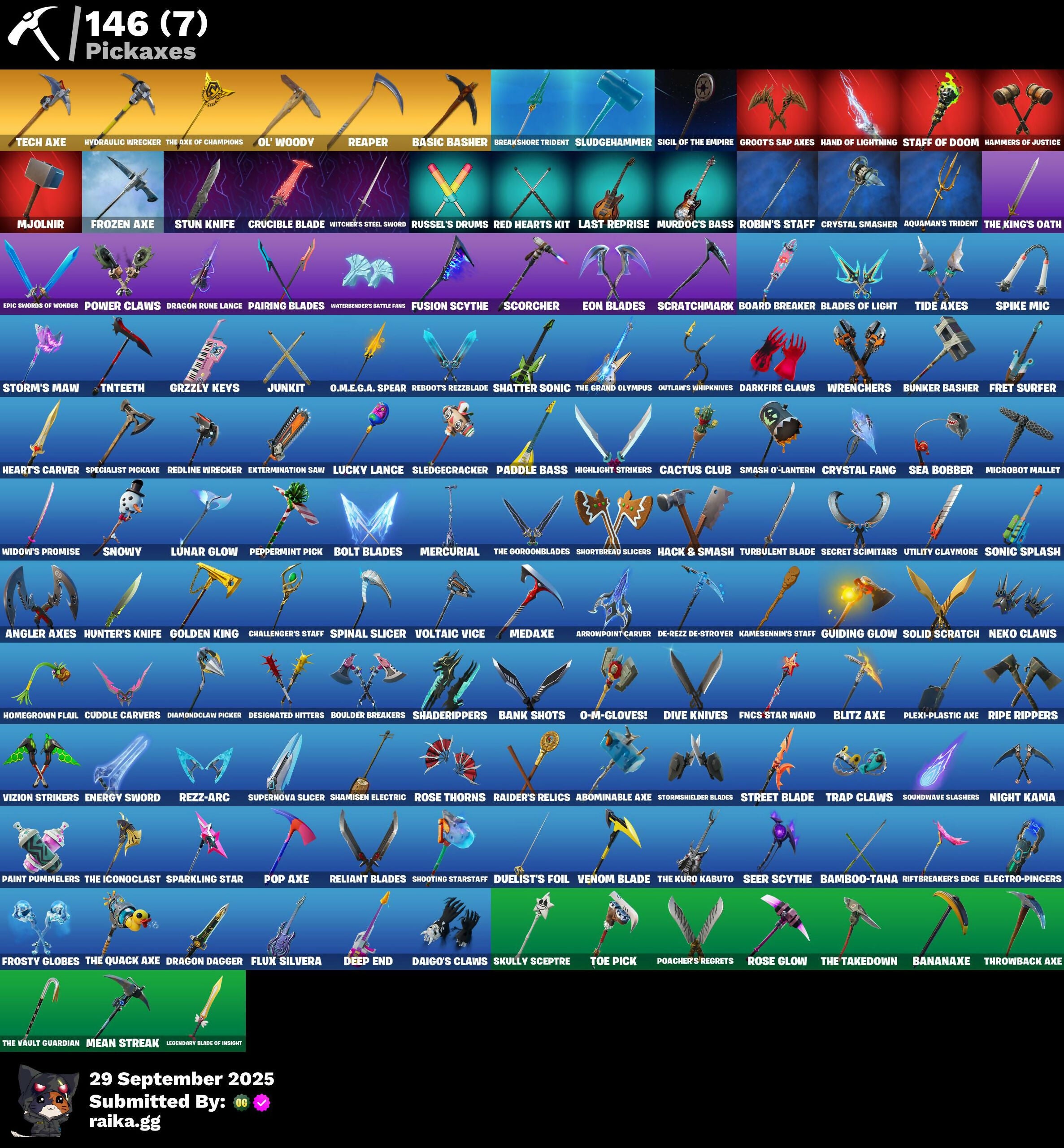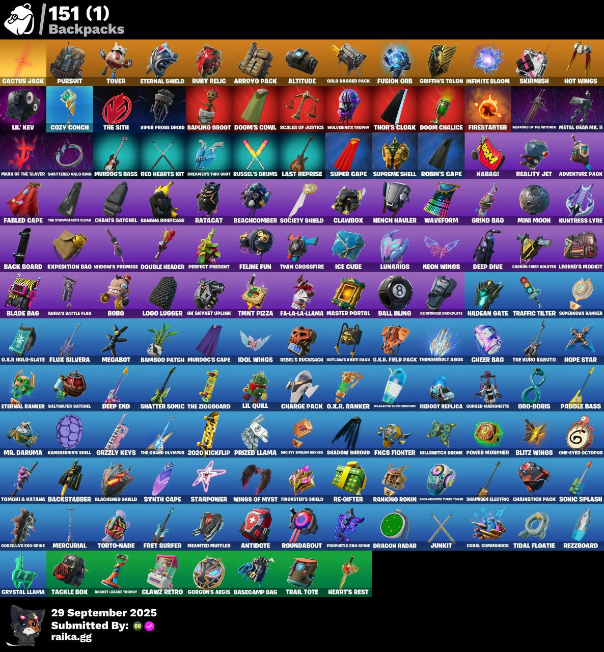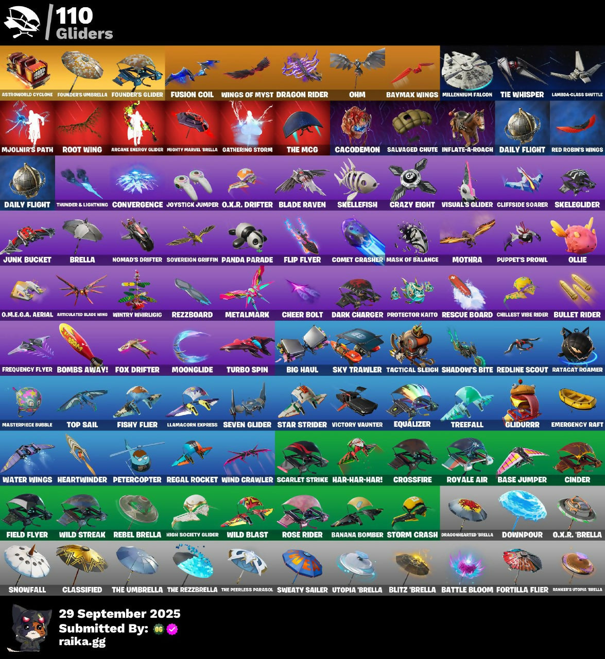 2020 Kickflip, 8-Ball vs Scratch, 8-ball, Abominable Axe, Adira, Adira's Armor, Adira's Battle Flag, Adventure Pack, Aerial Classic, Afterparty, Agent Patch, Agent Peely, Air Shredder, Alpha Altimeter, Altitude, Angler Axes, Antidote, Aphrodite, Aquaman, Aquaman's Trident, Arcane Energy Glider, Arcane Research, Arcane Steel, Arctic Adeline, Arctic Camo, Arrowpoint Carver, Arroyo Pack, Artemis, Articulated Blade Wing, Astroworld Cyclone, Augury, Auntie Dot, Aura, Aw, Shucks., Back Board, Back-Mounted Turbo Tower, Backstabber, Ball Bling, Bamboo Patch, Bamboo-Tana, Banana Bomber, Banana Briefcase, Bananaxe, Bank Shots, Base Jumper, Basecamp Bag, Basic Basher, Battle Bloom, Battle Gamer Mae, Baymax Wings, Beachcomber, Beep Beep, Behold!, Bernie, Big Haul, Bike To Go, Birdarang Flourish, Blackened Shield, Blade Bag, Blade Raven, Blades Of Light, Blasted, Blaze, Blitz 'Brella, Blitz Axe, Blitz Wings, Blowin' Up, Board Breaker, Bobo, Boing!, Bolt Blades, Bombs Away!, Bonde Do Brunão, Boogeyman, Boogie Down, Boosting Ki, Boulder Breakers, Boxy, Breakshore Trident, Brella, Brutus, Bullet Rider, Bunker Basher, Bunker Jonesy, Buzz Beat, Cacodemon, Cactus Club, Cactus Jack, Calico, Call Me, Cameo, Cameo vs Chic, Carbon Fiber Holster, Castaway Jonesy, Cat Flip, Catalyst, Cerberus, Cerberus Bite, Chainstick Pack, Challenger's Staff, Chani, Chani's Satchel, Charge Pack, Cheer Bag, Cheer Bolt, Chic, Chillest Vibe Rider, Chimichanga!, Cinder, Classified, Clawbox, Clawz Retro, Clean Sweep, Cliffside Soarer, Cloudburst, Cluck Strut, Cobalt, Coin Flip, Comet Crasher, Conch Call, Confetti, Convergence, Coral Commandos, Cozy Conch, Crazy Eight, Crossfire, Crowning Achievement, Crucible Blade, Crystal Fang, Crystal Llama, Crystal Smasher, Cuddle Carvers, Cuddle Hearts, Cursed, Cursed Marionette, Daigo, Daigo's Claws, Daily Flight, Daisies, Danica, Dark Charger, Darkfire Claws, Darth Shader, Darth Vader, De-Rezz De-Stroyer, Deadpool, Deep Dab, Deep Dive, Deep End, Denim Destiny, Designated Hitters, Diamondclaw Picker, Die With A Smile, Die with a Smile Bruno, Disco, Dive Knives, Doctor Doom, Doom Chalice, Doom Slayer, Doom's Cowl, Double Header, Downpour, Dragon Dagger, Dragon Daggers Song, Dragon Radar, Dragon Rider, Dragon Rune Lance, Dragonhearted 'Brella, Dreamer's Two-Shot, Droop, Duelist's Foil, Durrr Burger, Dusk Knight, Electro Swing, Electro-Pincers, Emergency Raft, Emote Camo, Energy Sword, Ensnared, Eon Blades, Epic Swords Of Wonder, Equalizer, Eternal Knight, Eternal Ranker, Eternal Shield, Evie, Evolved Heat Ray, Expedition Bag, Extermination Saw, FNCS Fighter, Fa-La-La-Llama, Fabled Cape, Fade, Falling Snow, Feline Fun, Ferocious, Festive Paper, Field Flyer, Firestarter, Fishstick, Fishy Flier, Fist Bump, Flip Flyer, Flippin Away, Flux Silvera, Fncs Star Wand, Foil Flex, For O.X.R.!, Fortilla Flier, Founder's Glider, Founder's Umbrella, Fox Clan Leader, Fox Drifter, Frequency Flyer, Fret Surfer, Frosty Globes, Frozen Axe, Fry Angles, Fusion, Fusion Coil, Fusion Orb, Fusion Scythe, Games Guard, Gathering Storm, Gear Specialist Maya, General's War Table, Geralt of Rivia, Gilded Heart, Glidurrr, Godzilla Evolved, Godzilla's Exo-Spine, Gold Dagger Pack, Golden King, Golf Clap, Good Game!, Good Sportsmanship, Gorgon's Aegis, Grav-Fusion, Greed, Green Ranger, Griffin's Talon, Grind Bag, Gringle Gift, Grizzly Keys, Groot, Groots Sap Axes, Grzzly Keys, Guff Gringle, Guiding Glow, HK Skynet Uplink, Hack & Smash, Hadean Gate, Hammers Of Justice, Hand Of Lightning, Har-Har-Har!, Harmony, Haylee Skye, Head Banger, Heart's Rest, Hearts Carver, Heartwinder, Hello Friend, Hench, Hench Hauler, Hero Baymax, High Five, High Society Glider, Highlight Strikers, Homegrown Flail, Hope, Hope Star, Hot Marat, Hot Wings, Hula Hoopin', Hunter's Knife, Huntress Lyre, Hydraulic Wrecker, Hype!, I Declare!, I'm A Mystery, Ice Cube, Ice-Blasted Snow Cruncher, Idol Lights, Idol Wings, Igni Sign, Imperial March, Indiana Jones, Industrious, Infinite Bloom, Infinite Swirl, Inflate-A-Roach, Intentions Unknown, Invisible Cut, Iris, It Is Finished, Jade, Jennifer Walters, Jet Signals, Journey vs Hazard, Joystick Jumper, Jules, Junk Bucket, Junkit, Jurassically Charged, KABAG!, Kamesennin's Shell, Kamesennin's Staff, Kendo, Keyed Up, Killswitch, Killswitch Drone, Kit, Korra, LBC Signature, Lambda-Class Shuttle, Last Reprise, Leafy Longboardin', Legend's Modkit, Legend's Retribution, Legendary Blade Of Insight, Lightrider, Lil Quill, Lil' Ducky Train, Lil' Ghost, Lil' Godzilla Attack, Lil' Kev, Lil' Prancer, Llamacorn Express, Logo Lugger, Lt. Evergreen, Lt. Ripp Slade, Lucky Lance, Lunar Glow, Lunar Party, Lunarian Luxury, Lunarios, Lynx, Maelstrom, Malik, Malik's Honor, Mark of the Slayer, Mask Of Balance, Massai, Massai Fire, Master Portal, Masterpiece Bubble, Mean Streak, Medaxe, Medusa, Megabot, Meowscles, Meowstermind, Mercurial, Metal Gear Mk. II, Metalmark, Mic Drop, Microbot Mallet, Microflip, Midas, Midas Memory, Midas' Shadow, Midnight Mycology, Mighty Marvel 'Brella, Millennium Falcon, Mini Moon, Mjolnir, Mjolnir's Path, Modena Icon, Modern Rōnin, Montague, Moonglide, Moonlit Mystery, Morgan Myst, Mothra, Mounted Muffler, Mr. Daruma, Murdoc's Bass, Murdoc's Cape, Murdog, Neko Claws, Neon Wings, New Year 2020, Niccals Pickles, Night Kama, Ninja Stance: Donnie, Ninja Stance: Leo, Ninja Stance: Mikey, Ninja Style, Nisha, Nitro Fueled, Nomad's Drifter, Nvanja, O-M-Gloves!, O.M.E.G.A. Aerial, O.M.E.G.A. Diagnostic, O.M.E.G.A. Spear, O.M.E.G.A. Suit Alpha, O.X.R Holo-Slate, O.X.R. 'Brella, O.X.R. Drifter, O.X.R. Field Pack, O.X.R. Ranker, Ocean, Ocean Wave, Ohm, Ol' Woody, Ollie, One-Eyed Octopus, Onyx Winter, Ooze, Oro-Boris, Oscar, Outlaw's Knife Rack, Outlaw's Whipknives, Paddle Bass, Paint Pummellers, Pairing Blades, Panda Parade, Pandemonium, Paws & Claws, Peace Out, Peppermint Pick, Perfect Present, Petercopter, Planetary Vibe, Plexi-Plastic Axe, Poacher's Regrets, Polished Stone, Pop Axe, Poseidon, Powder, Power Claws, P