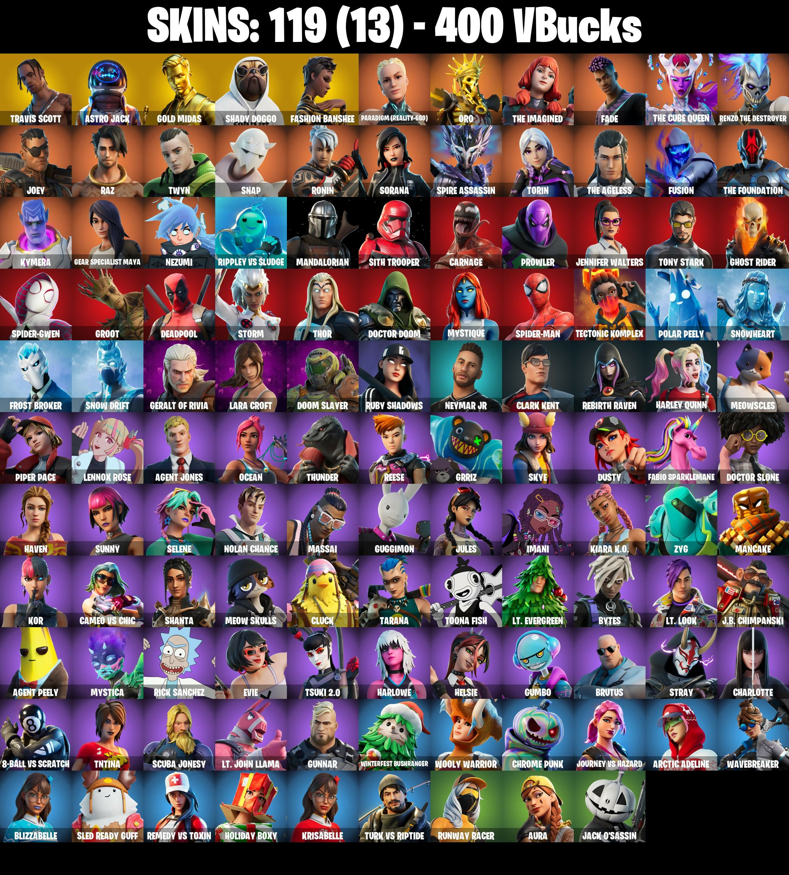PC/PSN/XBOX |119 skins | Travis Scott | Astro Jack | Lara Croft | Deadpool | Gold Midas | Spider-Gwen | Head Banger | Rage | Fusion | #B674