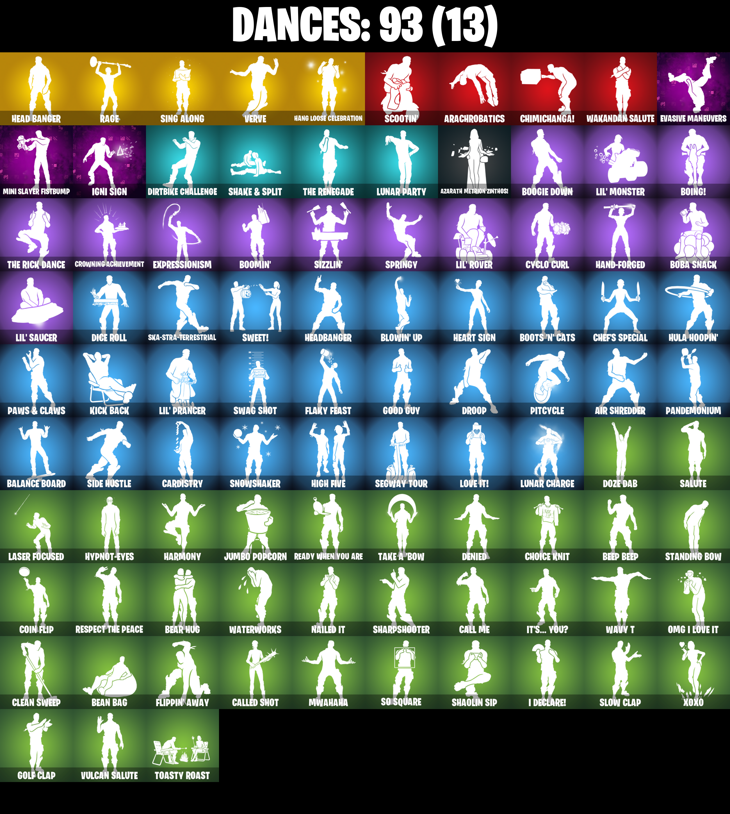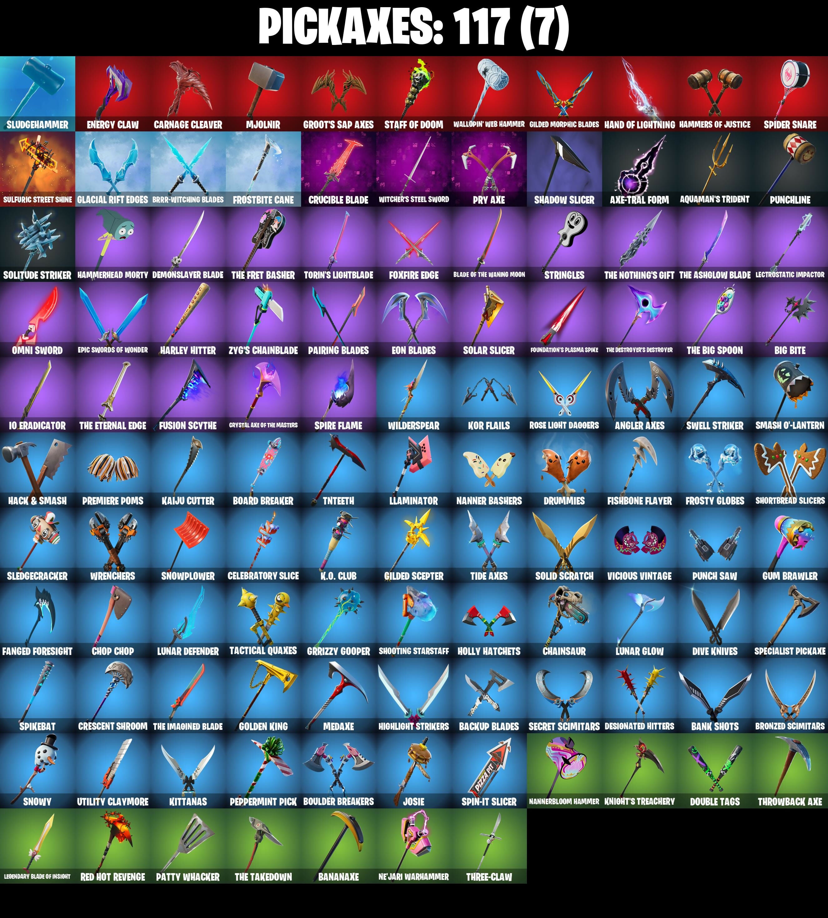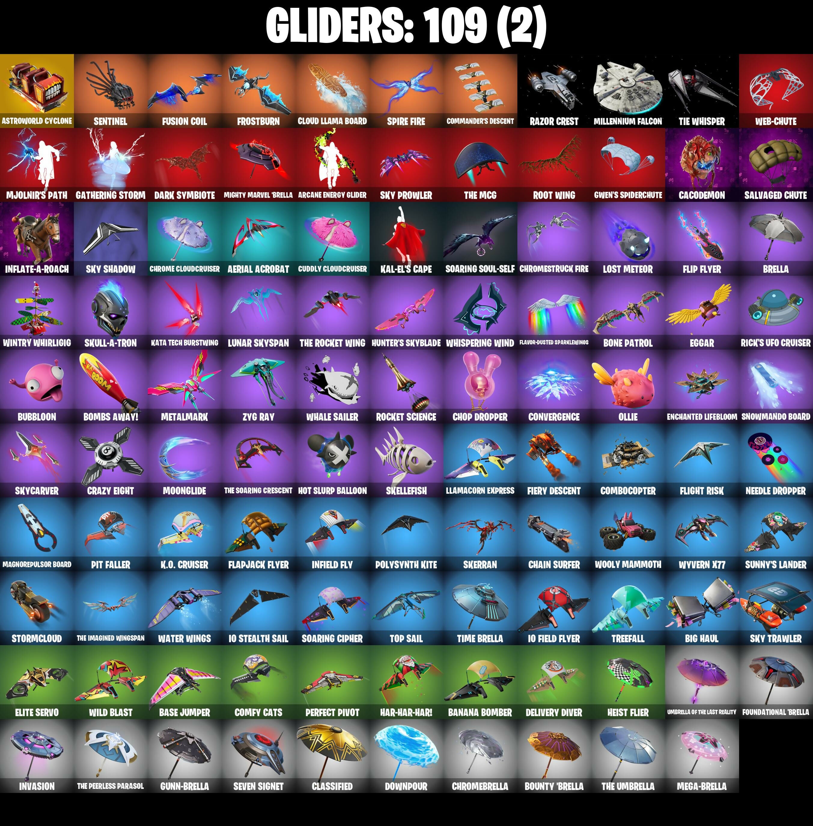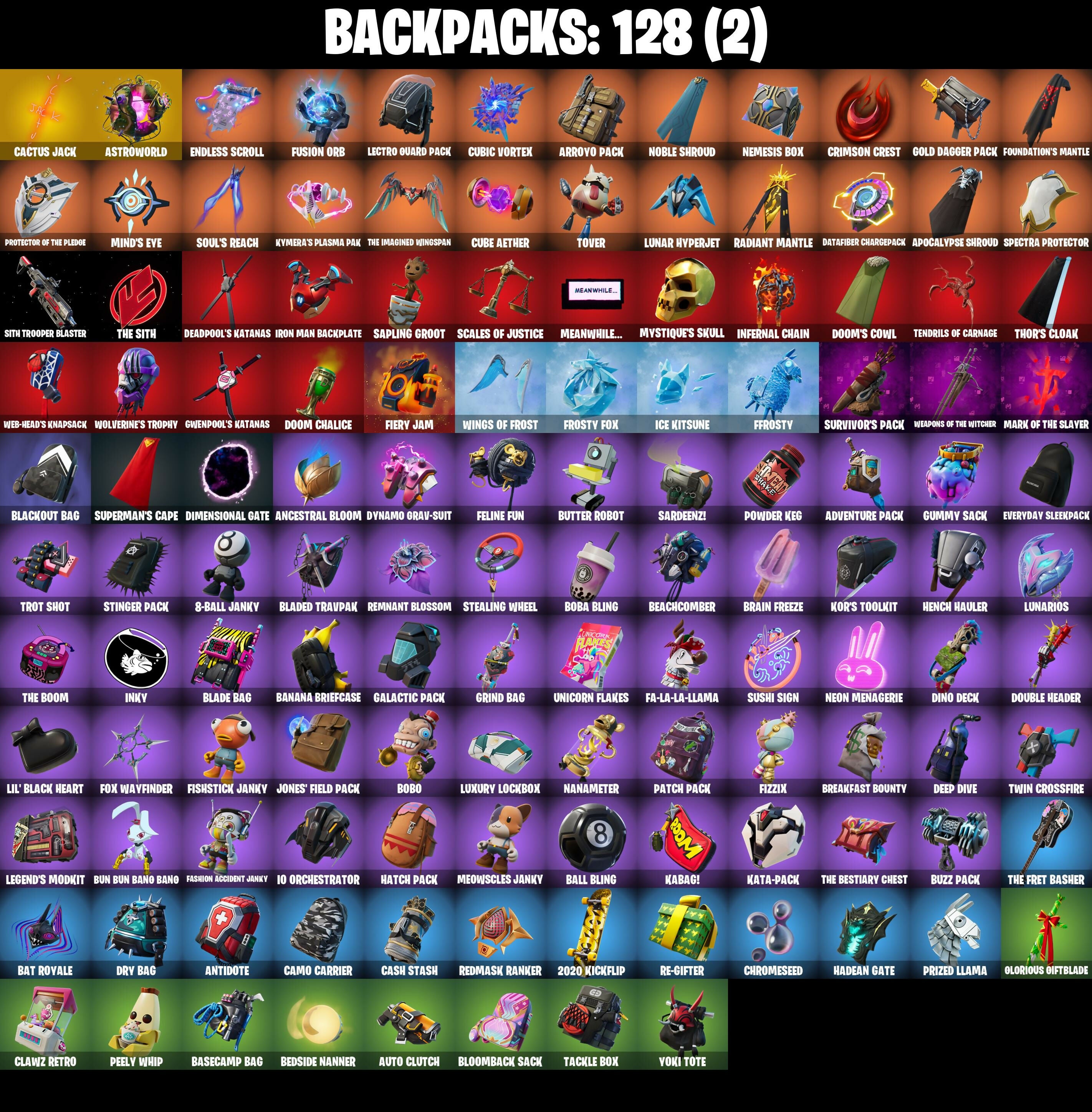 2020 Kickflip, 8-Ball Janky, 8-Ball Vs Scratch, Adventure Pack, Aerial Acrobat, Agent Jones, Agent Jones (Jump 31), Agent Peely, Air Shredder, Ancestral Bloom, Angler Axes, Antidote, Apocalypse Shroud, Aquaman's Trident, Arachrobatics, Arcane Energy Glider, Arctic Adeline, Arroyo Pack, Ascension Nezumi, Astro Armor, Astro Jack, Astroworld, Astroworld Cyclone, Aura, Auto Clutch, Axe-Tral Form, Azarath Metrion Zinthos!, Backup Blades, Balance Board, Ball Bling, Banana Bomber, Banana Briefcase, Bananaxe, Bank Shots, Base Jumper, Basecamp Bag, Bat Royale, Beachcomber, Bean Bag, Bear Hug, Bedside Nanner, Beep Beep, Big Bite, Big Haul, Blackout Bag, Blade Bag, Blade of the Waning Moon, Bladed Travpak, Blizzabelle, Bloomback Sack, Blowin' Up, Board Breaker, Boba Bling, Boba Snack, Bobo, Boing!, Bombs Away!, Bone Patrol, Boogie Down, Boomin', Boots 'N' Cats, Boulder Breakers, Bounty 'Brella, Brain Freeze, Breakfast Bounty, Brella, Bronzed Scimitars, Brrr-Witching Blades, Brutus, Bubbloon, Bun Bun Bang Bang, Butter Robot, Buzz Pack, Bytes, Bytes (Lone Traveler), Cacodemon, Cactus Jack, Call Me, Called Shot, Cameo Vs Chic, Camo Carrier, Cardistry, Carnage, Carnage (Maximum), Carnage Cleaver, Cash Stash, Celebratory Slice, Chain Surfer, Chainsaur, Charlotte, Chef's Special, Chic (Yellow), Chimichanga!, Choice Knit, Chop Chop, Chop Dropper, Chrome Cloudcruiser, Chrome Punk, Chromebrella, Chromeseed, Chromestruck Fire, Clark Kent, Clark Kent (Superman), Classified, Clawz Retro, Clean Sweep, Cloud Llama Board, Club President Helsie, Cluck, Cluck (Slurpy), Coin Flip, Combocopter, Comfy Cats, Commander's Descent, Convergence, Crazy Eight, Crescent Shroom, Crimson Crest, Crowning Achievement, Crucible Blade, Crystal Axe of the Masters, Cube Aether, Cubic Vortex, Cuddly Cloudcruiser, Cyclo Curl, Dark Symbiote, Datafiber Chargepack, Deadpool, Deadpool Unmasked, Deadpool's Katanas, Deep Dive, Delivery Diver, Demonslayer Blade, Denied, Designated Hitters, Dice Roll, Dimensional Gate, Dino Deck, Dirtbike Challenge, Dive Knives, Doctor Doom, Doctor Doom (God Emperor), Doctor Slone, Doom Chalice, Doom Slayer, Doom's Cowl, Double Header, Double Tags, Downpour, Doze Dab, Droop, Drummies, Dry Bag, Dusty, Dynamo Grav-Suit, Eggar, Elite Servo, Enchanted Lifebloom, Endless Scroll, Energy Claw, Eon Blades, Epic Swords of Wonder, Evasive Maneuvers, Everyday Sleeppack, Evie, Expressionism, Fa-La-La-Llama, Fabio Sparklemane, Fade, Fanged Foresight, Fashion Accident Janky, Fashion Banshee, Feline Fun, Ffrosty, Fiery Descent, Fiery Jam, Fishbone Flayer, Fishstick Janky, Fizzix, Flaky Feast, Flapjack Flyer, Flavor-Dusted Sparklewings, Flight Risk, Flip Flyer, Flippin' Away, Foundation's Mantle, Foundation's Plasma Spike, Foundational 'Brella, Fox Wayfinder, Foxfire Edge, Frost Broker, Frostbite Cane, Frostburn, Frosty Fox, Frosty Globes, Fusion, Fusion Coil, Fusion Orb, Fusion Scythe, Galactic Pack, Gathering Storm, Gear Specialist Maya, Geralt Of Rivia, Ghost Rider, Gilded Morphic Blades, Gilded Scepter, Glacial Rift Edges, Glorious Giftblade, Gold Dagger Pack, Gold Midas, Golden King, Golf Clap, Good Guy, Grind Bag, Grizzly Gooper, Groot, Groot's Sap Axes, Grriz, Guggimon, Gum Brawler, Gumbo, Gumbo (Sour), Gummy Sack, Gunn-Brella, Gunnar, Gwen's Spiderchute, Gwenpool's Katanas, Hack & Smash, Hadean Gate, Hammerhead Morty, Hammers of Justice, Hand of Lightning, Hand-Forged, Hang Loose Celebration, Har-Har-Har!, Harley (Always Fantabulous), Harley Hitter, Harley Quinn, Harlowe, Harlowe (Helmet), Harmony, Hatch Pack, Haven, Haven (Tropical Chirper), Hazard, Head (Droopy), Head Banger, Headbanger, Heart Sign, Heist Flier, Helsie, Hench Hauler, High Five, Highlight Strikers, Holiday Boxy, Holly Hatchets, Hot Slurp Balloon, Hula Hoopin', Hunter's Skyblade, Hypnot-Eyes, I Declare!, IO Field Flyer, IO Orchestrator, IO Stealth Sail, Ice Kitsune, Igni Sign, Imani, Infernal Chain, Infield Fly, Inflate-A-Roach, Inky, Invasion, Io Eradicator, Iron Man Backplate, It's... You?, J.B. Chimpanski, J.B. Chimpanski (Helmet), Jack O'Sassin, Jennifer Walters, Joey, Jones' Field Pack, Josie, Journey Vs Hazard, Jules, Jumbo Popcorn, K.O. Club, K.O. Cruiser, Kabag!, Kaiju Cutter, Kal-El's Cape, Kata Tech Burstwing, Kata-Pack, Kiara K.O., Kiara K.O. (Captain's Bomber), Kick Back, Kittanas, Knight's Treachery, Kor, Kor (Trenchcoat), Kor Flails, Kor's Toolkit, Krisabelle, Kymera, Kymera's Plasma Pak, Lara Croft, Lara Croft (Gold Anniversary), Laser Focused, Lectro Guard Pack, Lectrostatic Impactor, Legend's Modkit, Legendary Blade of Insight, Lennox Rose, Lil' Black Heart, Lil' Monster, Lil' Prancer, Lil' Rover, Lil' Saucer, Llamacorn Express, Llaminator, Lost Meteor, Love It!, Lt. Evergreen, Lt. John Llama, Lt. Look, Lunar Charge, Lunar Defender, Lunar Glow, Lunar Hyperjet, Lunar Party, Lunar Skyspan, Lunarios, Luxury Lockbox, Magnorepulsor Board, Mancake, Mandalorian, Mark Of The Slayer, Masked, Massai, Meanwhile..., Medaxe, Mega-Brella, Meow Skulls, Meowscles, Meowscles Janky, Metalmark, Mighty Marvel 'Brella, Millennium Falcon, Mind's Eye, Mini Slayer Fistbump, Mjolnir, Mjolnir's Path, Moonglide, Mwahaha, Mystica, Mystique, Mystique's Skull, Nailed It, Nanameter, Nanner Bashers, Nannerbloom Hammer, Ne'Jari Warhammer, Needle Dropper, Nemesis Box, Neon Menagerie, Neymar Jr, Neymar Jr (Exhibition), Nezumi, Noble Shroud, Nolan Chance, Ocean, Ollie, Omg I Love It, Omni Sword, Oro, Pairing Blades, Pandemonium, Paradigm (Aurelian), Paradigm (Reality-659), Patch Pack, Patty Whacker, Paws & Claws, Peely Whip, Peppermint Pick, Perfect Pivot, Piper Pace, Pit Faller, Pitcycle, Polar Peely, Polysynth Kite, Powder Keg, Premiere Poms, Prized Llama, Protector Of The Pledge, Prowler, Pry Axe, Punch Saw, Punchline, Rachel Roth, Radiant Mantle, Rage, Raz, Razor Crest, Re-Gifter, Ready When You Are, Rebirth Raven, Red Hot Revenge, Redmask Ranker, Reese, Remedy (Purple), Remedy Vs Toxin, Remnant Blossom, Renzo The Destroyer, Respect The Peace, Rick Sanchez, Rick's U