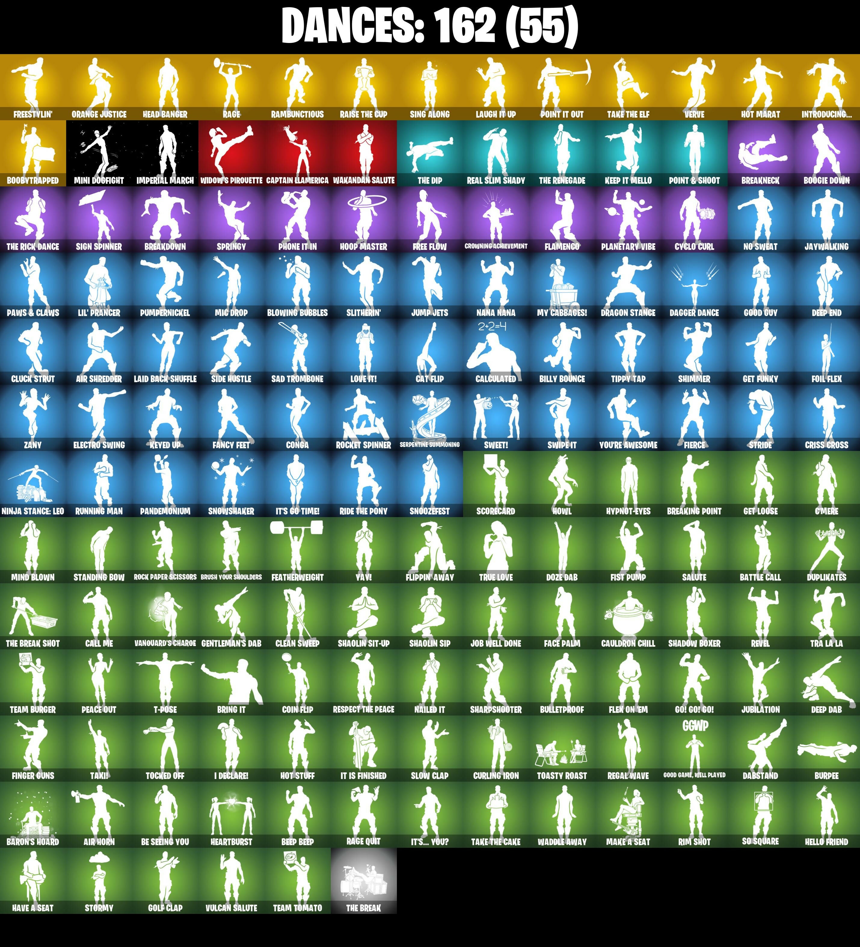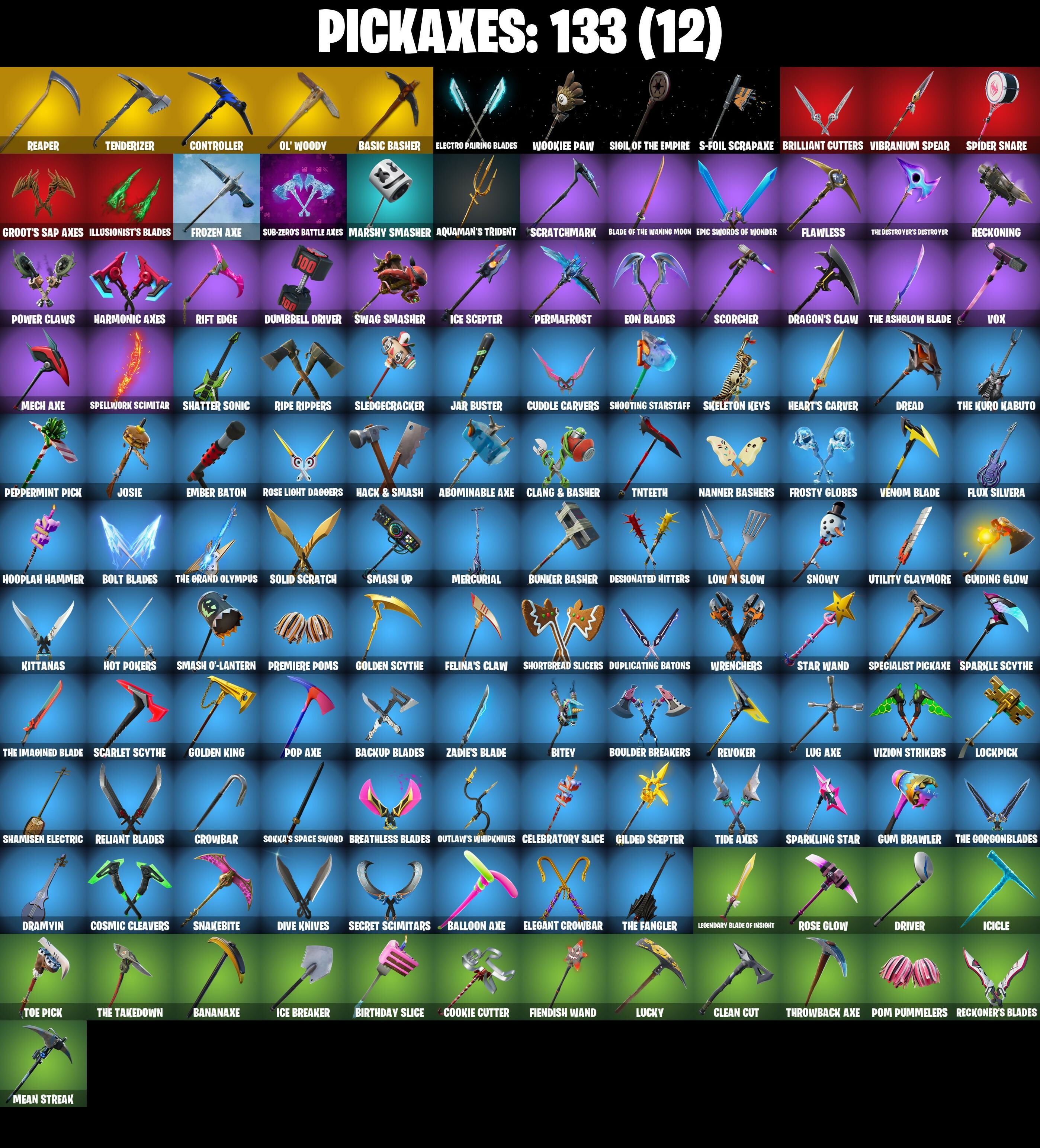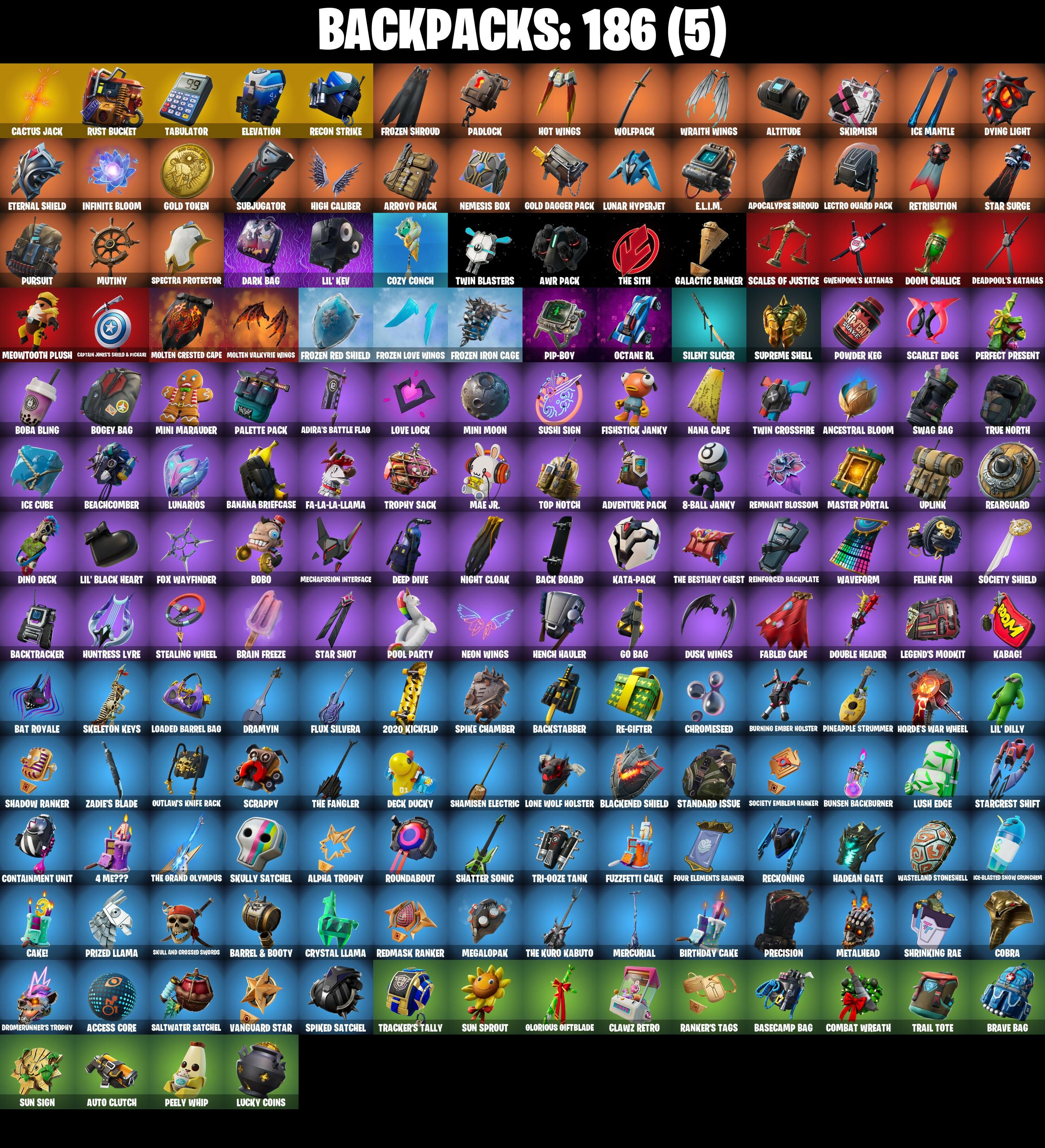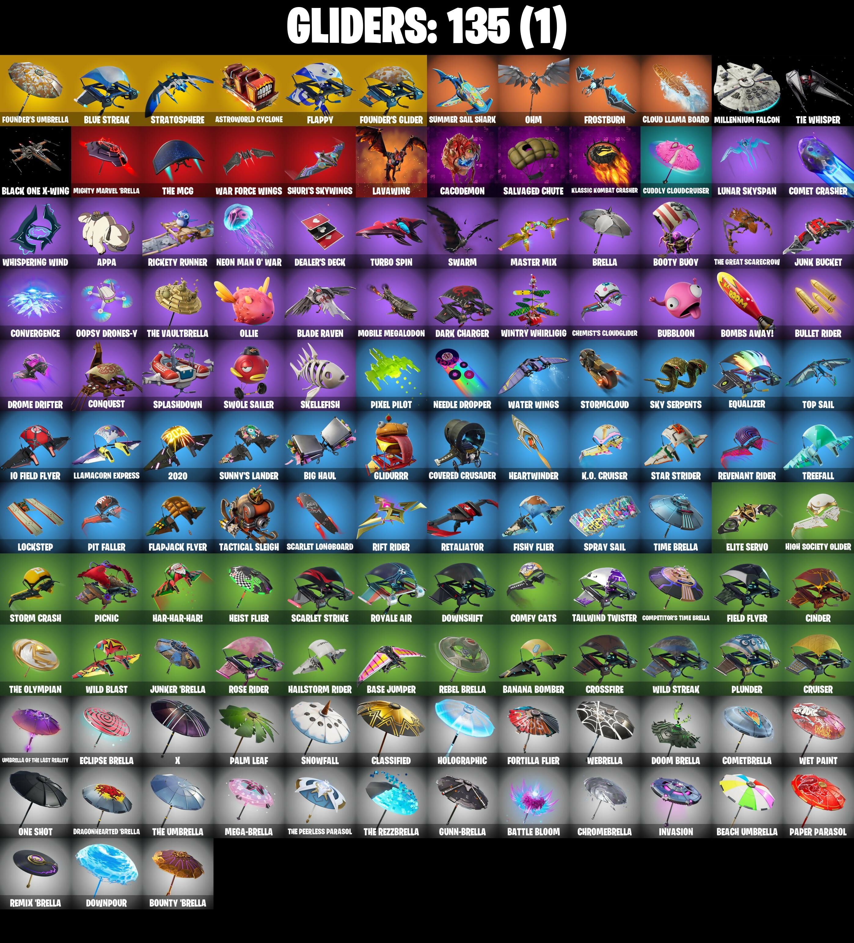 10 Field Flyer, 2020, 2020 Kickflip, 4 Me???, 8-Ball Janky, A.I.M., AWR Pack, Abominable Axe, Access Core, Adira's Battle Flag, Adventure Pack, Agent Peely, Air Horn, Air Shredder, Alpha Trophy, Altitude, Ancestral Bloom, Apocalypse Shroud, Appa, Aquaman, Aquaman's Trident, Arctic Adeline, Arroyo Pack, Arthur Curry, Astroworld Cyclone, Auto Clutch, Back Board, Backstabber, Backtracker, Backup Blades, Balloon Axe, Banana Bomber, Banana Briefcase, Bananaxe, Baron's Hoard, Barrel & Booty, Base Jumper, Basecamp Bag, Basic Basher, Bat Royale, Battle Bloom, Battle Call, Be Seeing You, Beach Umbrella, Beachcomber, Beep Beep, Big Haul, Billy Bounce, Birthday Cake, Birthday Slice, Bitey, Black One X-Wing, Black Werewolf, Blackened Shield, Blackheart, Blackheart (Stage 8), Blade Of The Waning Moon, Blade Raven, Blowing Bubbles, Blue Streak, Blue Team Leader, Boba Bling, Bobo, Bogey Bag, Bolt Blades, Bombs Away!, Boobytrapped, Boogie Down, Booty Buoy, Boulder Breakers, Bounty 'Brella, Brain Freeze, Brave Bag, Breakdown, Breaking Point, Breakneck, Breathless Blades, Brella, Brilliant Cutters, Bring It, Brush Your Shoulders, Bubbloon, Bullet Rider, Bulletproof, Bunker Basher, Bunker Jonesy, Bunsen Backburner, Burning Ember Holster, Burpee, Cacodemon, Cactus Jack, Cake!, Calamity, Calamity Stage 5, Calculated, Call Me, Captain Llamerica, Cat Flip, Catalyst, Catalyst (Overcharged), Cauldron Chill, Celebratory Slice, Chance, Chemist's Cloudglider, Chrome Punk, Chromebrella, Chromeseed, Cinder, Circuit Breaker, Clang & Basher, Classified, Clawz Retro, Clean Cut, Clean Sweep, Cloud Llama Board, Cloud Striker, Cluck Strut, Cobalt, Cobra, Coin Flip, Combat Wreath, Comet Crasher, Cometbrella, Comfy Cats, Commando, Competitor's Time Brella, Conga, Conquest, Containment Unit, Controller, Convergence, Cookie Cutter, Cosmic Cleavers, Covered Crusader, Cozy Conch, Criss Cross, Crossfire, Crowbar, Crowning Achievement, Cruiser, Crystal Llama, Cuddle Carvers, Cuddly Cloudcruiser, Curling Iron, Cyclo Curl, Cymere, Dabstand, Dagger Dance, Dark Bag, Dark Bomber, Dark Charger, Deadpool, Deadpool Unmasked, Deadpool's Katanas, Dealer's Deck, Deck Ducky, Deep Dab, Deep Dive, Deep End, Demi, Designated Hitters, Dino Deck, Dire, Dive Knives, Dj Yonder, Doom Brella, Doom Chalice, Double Header, Downpour, Downshift, Doze Dab, Dragon Stance, Dragon's Claw, Dragonhearted 'Brella, Dramvin, Dramyin, Dread, Drift, Drift Stage 5, Driver, Drome Drifter, Dromerunner's Trophy, Dumbbell Driver, Duplicating Batons, Duplikates, Dusk, Dusk Wings, Dying Light, Dynamo, E.L.I.M., Eclipse Brella, Electro Pairing Blades, Electro Swing, Elegant Crowbar, Elevation, Elite Servo, Ember, Ember (Night), Ember Baton, Enforcer, Eon Blades, Epic Swords Of Wonder, Equalizer, Eternal Knight, Eternal Shield, Fa-La-La-Llama, Fable, Fabled Cape, Face Palm, Fade, Fancy Feet, Featherweight, Felina, Felina's Claw, Feline Fun, Field Flyer, Fiendish Wand, Fierce, Finger Guns, Fishstick (World Cup), Fishstick Janky, Fishtick (World Cup), Fishy Flier, Fist Pump, Fixer, Flamenco, Flapjack Flyer, Flappy, Flawless, Flex On 'Em, Flippin' Away, Flux Silvera, Foil Flex, Fortilla Flier, Founder's Glider, Founder's Umbrella, Four Elements Banner, Fox Wayfinder, Free Flow, Freestylin', Frostburn, Frosty Globes, Frozen Axe, Frozen Iron Cage, Frozen Love Ranger, Frozen Love Wings, Frozen Raven, Frozen Red Knight, Frozen Red Shield, Frozen Shroud, Fuzzfetti Cake, Galactic Ranker, Gear Specialist Maya, Gear Specialist Maya (Hat - Dark), Gentleman's Dab, Get Funky, Get Loose, Giddy-Up, Gilded Scepter, Glidurr, Glorious Giftblade, Go Bag, Go! Go! Go!, Gold Brutus, Gold Dagger Pack, Gold Midas, Gold Token, Golden King, Golden Scythe, Golf Clap, Good Game, Well Played, Good Guy, Groot's Sap Axes, Guiding Glow, Gum Brawler, Gunn-Brella, Gwenpool's Katanas, Hack & Smash, Hadean Gate, Hailstorm Rider, Happy, Har-Har-Har!, Harmonic Axes, Have A Seat, Head Banger, Heart's Carver, Heartburst, Heartwinder, Heist Flier, Hello Friend, Hench Hauler, High Caliber, High Society Glider, Holiday Boxy, Holographic, Hoop Master, Hooplah Hammer, Horde's War Wheel, Hot Marat, Hot Pokers, Hot Stuff, Hot Wings, Howl, Huntress, Huntress Lyre, Hybrid, Hybrid (Stage 4), Hypnot-Eyes, I Declare!, Ice Breaker, Ice Cube, Ice King (Gold), Ice Mantle, Ice Scepter, Ice-Blasted Snow Cruncher, Icicle, Illusionist's Blades, Imperial March, Infinite Bloom, Introducing..., Invasion, Iris, It Is Finished, It's Go Time!, It's... You?, Jar Buster, Jawbreaker, Jaywalking, Job Well Done, Josie, Jubilation, Jules, Jump Jets, Jun-Hwan, Junk Bucket, Junker 'Brella, K.O. Cruiser, Kabag!, Kata-Pack, Keep It Mello, Keyed Up, Kit, Kittanas, Klassic Kombat Crasher, Laguna, Laid Back Shuffle, Laugh It Up, Lavawing, Lectro Guard Pack, Legend's Modkit, Legendary Blade Of Insight, Lil' Black Heart, Lil' Dilly, Lil' Kev, Lil' Prancer, Llamacorn Express, Loaded Barrel Bag, Lockpick, Lockstep, Lone Wolf Holster, Love It!, Love Lock, Low 'n Slow, Lt. Evergreen, Lucky, Lucky Coins, Lug Axe, Lunar Hyperjet, Lunar Skyspan, Lunarios, Lush Edge, Luxe, Luxe (Gold Clothing), Lynx, Lynx (Stage 4 - No Ponytail), Mae Jr., Make A Seat, Marshy Smasher, Masked, Master Key, Master Key (Masked), Master Mix, Master Portal, Mean Streak, Mech Axe, Mechafusion Interface, Mega-Brella, Megalopak, Meowscles, Meowtooth Plush, Mercurial, Merry Marauder, Metalhead, Mic Drop, Mighty Marvel 'Brella, Millennium Falcon, Mind Blown, Mini Dogfight, Mini Marauder, Mini Moon, Mobile Megalodon, Molten Battle Hound, Molten Crested Cape, Molten Valkyrie, Molten Valkyrie Wings, Mutiny, My Cabbages!, Nailed It, Nana Cape, Nana Nana, Nanner Bashers, Needle Dropper, Nemesis Box, Neon Man O' War, Neon Wings, Night Cloak, Nightshade, Ninja Stance: Leo, Nitelite, No Sweat, Ocean, Octane RL, Ohm, Ol' Woody, Ollie, One Shot, Onesie, Onesie (Winter), Oopsy Drones-Y, Orange Justice, Outlaw's Knife Rack, Outlaw's Whipknives, Padlock, Palette Pack, Palm Leaf, Pandemonium, Paper Paras