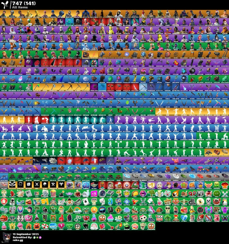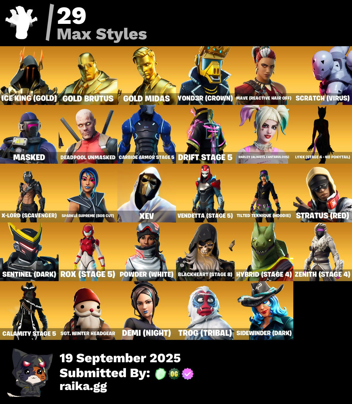A.I.M., Agent Jones, Agent Peely, Archetype, Armadillo, Assault Trooper, Astro Antidote, Astro Jack, Astroworld Cyclone, Aura, B.R.U.T.E. Gunner, Backlash, Bandollette, Basic Basher, Battlehawk, Beast Boy & Raven, Birdie, Blackheart (Stage 8), Bracer, Breakpoint, Brilliant Striker, Brite Bomber, Brutus, Bullseye, Bunker Jonesy, Bunny Brawler, Cactus Jack, Calamity, Calamity Stage 5, Cameo Vs Chic, Carbide Armor Stage 5, Catalyst, Catwoman, Chill Count, Cloaked Shadow, Cluck, Cobalt, Commando, Constructor, Crystal, DJ Yonder, Dark Bomber, Dark Voyager, Dazzle, Deadpool, Deadpool Unmasked, Demi (Night), Diamond Diva, Drift Stage 5, Durrr Burger, Dusk, Elite Agent, Ember, Enforcer, Eternal Knight, Eternal Voyager, Fable, Fade, Finesse Finisher, Founder's Glider, Founder's Umbrella, Frozen Love Ranger, Frozen Midas, Frozen Raven, Frozen Red Knight, Frozen Wild Card, Garbide Armor Stage 5, Gear Specialist Maya, Ghoul Trooper, Giddy-Up, Gingerbread Raider, Gold Brutus, Gold Midas, Groot, Grriz, Harley (Always Fantabulous), Haze, Head Banger, Hot Marat, Huntress, Hybrid, Hybrid (Stage 4), Hydraulic Wrecker, Ice King (Gold), Iris, Jennifer Walters, John Wick, Jonesy, Journey Vs Hazard, Jules, Jungle Scout, Kit, Kondor, Kuno, Kymera, Laguna, Lara Croft, Laugh It Up, Leviathan Axe, Lexa, Loserfruit, Love Ranger, Lt. Evergreen, Lt. John Llama, Luxe, Lynx (Stage 4 - No Ponytail), Lynx (Stage 4 No Ponytail), Mancake, Mandalorian, Manic, Marigold, Marshmello, Masked, Master Key, Mave, Mave (Reactive Hair Off), Menace, Meowscles, Merry Mint Axe, Midas, Midas Rex, Mission Specialist, Monster Team Banner, Moonwalker, Nitelite, Nog Ops, Ocean, Ol' Woody, Omega, Onesie, Orange Justice, Outlander, Overtaker, Pastel, Peekaboo, Peely, Point It Out, Poised Playmaker, Powder (White), Prickly Patroller, Rage, Raise The Cup, Rambunctious, Rapscallion, Raven, Reaper, Recon Expert, Recon Specialist, Red Jade, Red Knight, Red Strike, Redline, Reese, Remedy, Remedy Vs Toxin, Renegade, Resistance Jonesy, Rippley Vs Sludge, Rodriguez, Rogue Agent, Rook, Rose Team Leader, Rox, Rox (Stage 5), Ruby Shadows, Rust Bucket, Rust Lord, Sabina, Scarlet Defender, Scratch (Virus), Seeker, Sentinel (Dark), Sgt. Winter Headgear, Sidewinder (Dark), Sing Along, Singularity, Siona, Skull, Skull Trooper, Skye, Sledgehammer, Soldier, Sparkle Supreme (80s Cut), Sparkle Supreme (Bob Cut), Squad Leader, Steel Wool, Storm, Stratus (Red), Summit Seeker Evie, Summit Striker, Sun Strider, Supersonic, Take The Elf, Take The L, Tarana, Tart Tycoon, Tech Axe, Teknique, The Ace, The Foundation, The Ice King, The Reaper, The Scientist, The Visitor, Thor, Tilted Teknique (Hoodie), Tntina, Tomatohead, Toy Trooper, Travis Scott, Triggerfish, Trog (Tribal), Tsuki, Turk Vs Riptide, Ultima Knight, Valkyrie, Valor, Vega, Vendetta (Stage 5), Verve, Volley Girl, Warpaint, Wavebreaker, Whiplash, Whistle Warrior, Wilde, Wingman, Wooly Warrior, World Warrior, X-Lord (Scavenger), Xev, Y0nD3R (Crown), Yond3r (Crown), Zenith, Zenith (Stage 4), Zoey