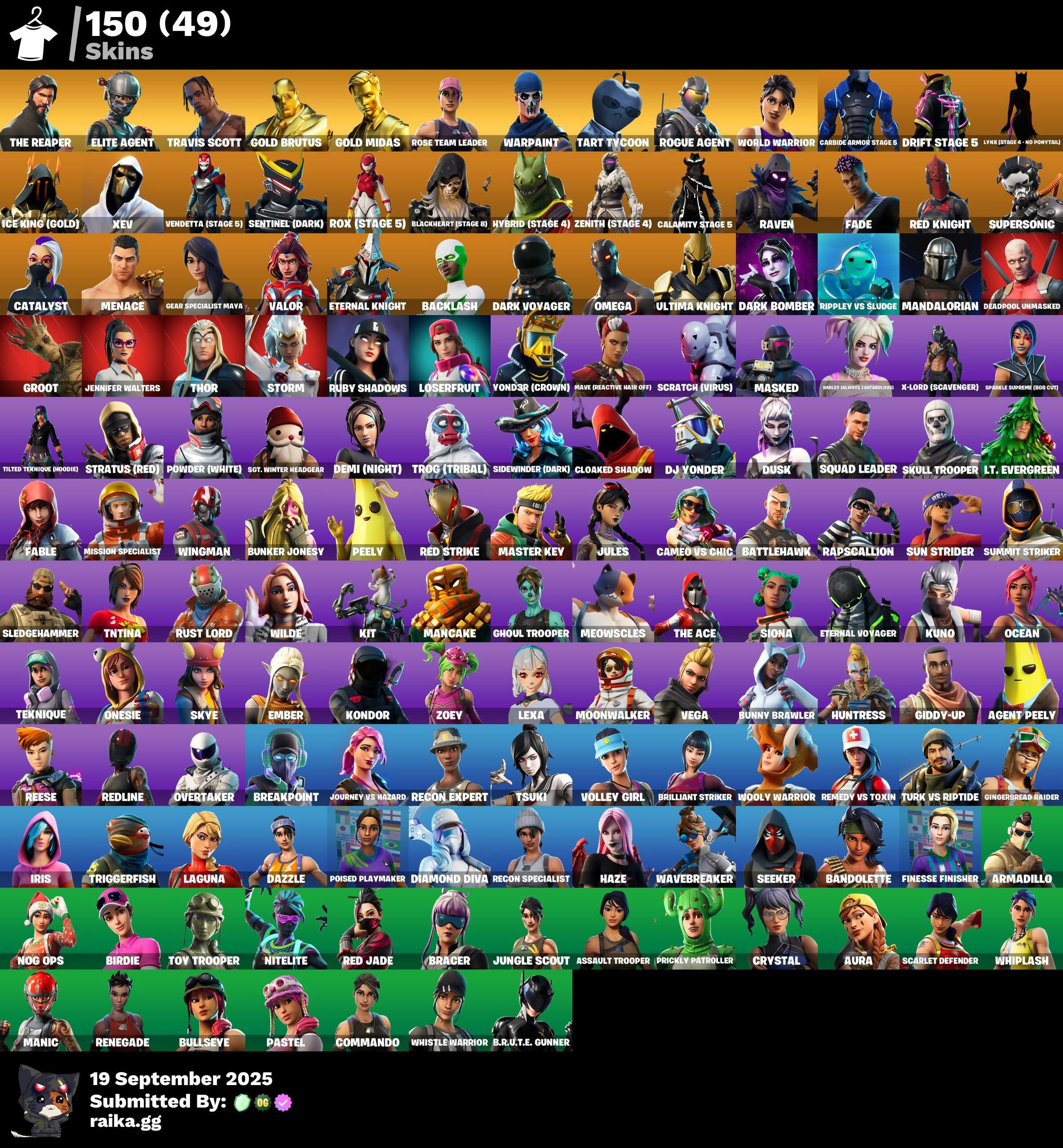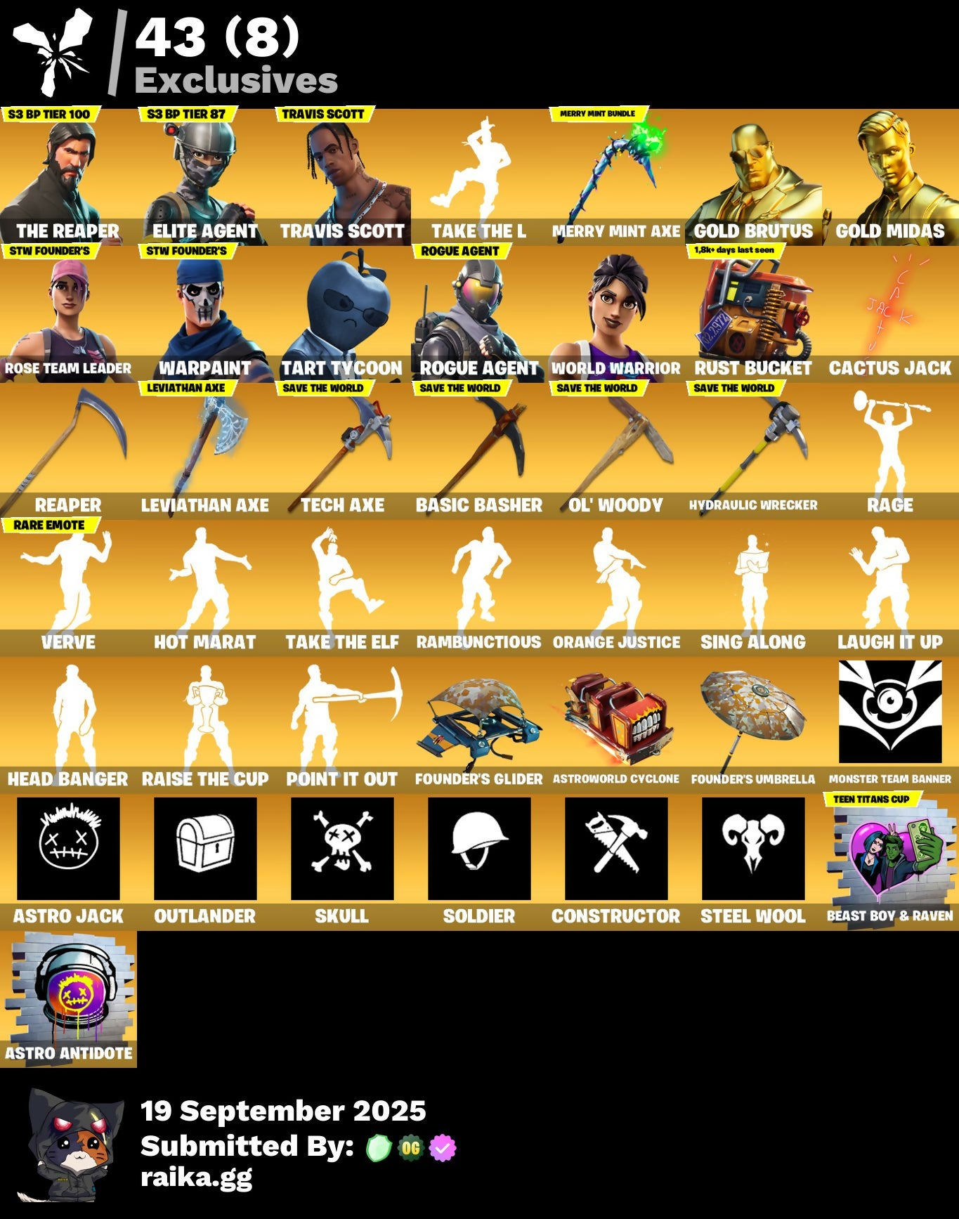 [PC/PSN/XBOX] 150 skins | Travis Scott | Merry Mint Axe | Leviathan Axe | OG STW | The Reaper | Elite Agent | Gold Brutus | Gold Midas | Tart Tycoon | Rogue Agent | World Warrior | 130 VB #474