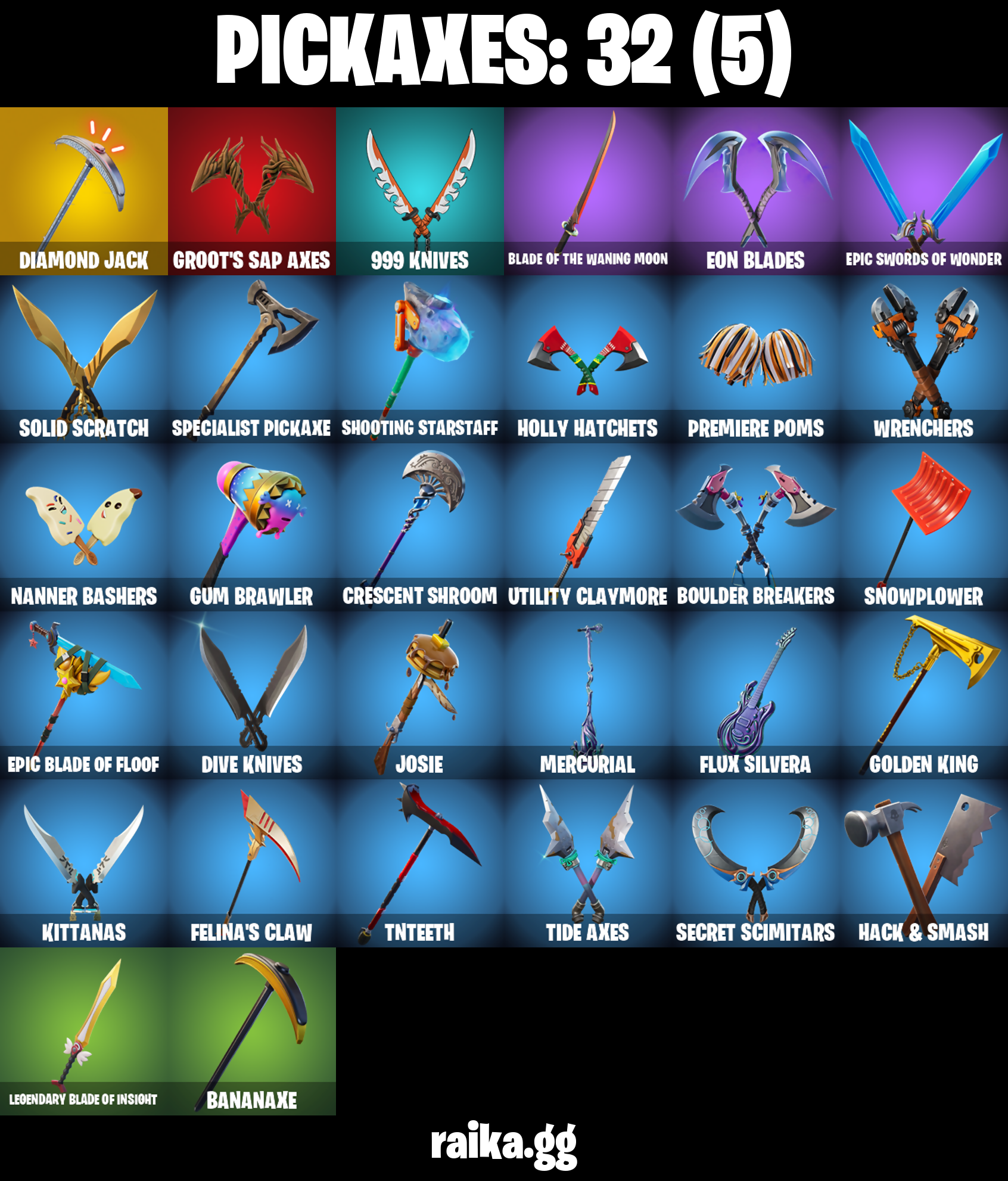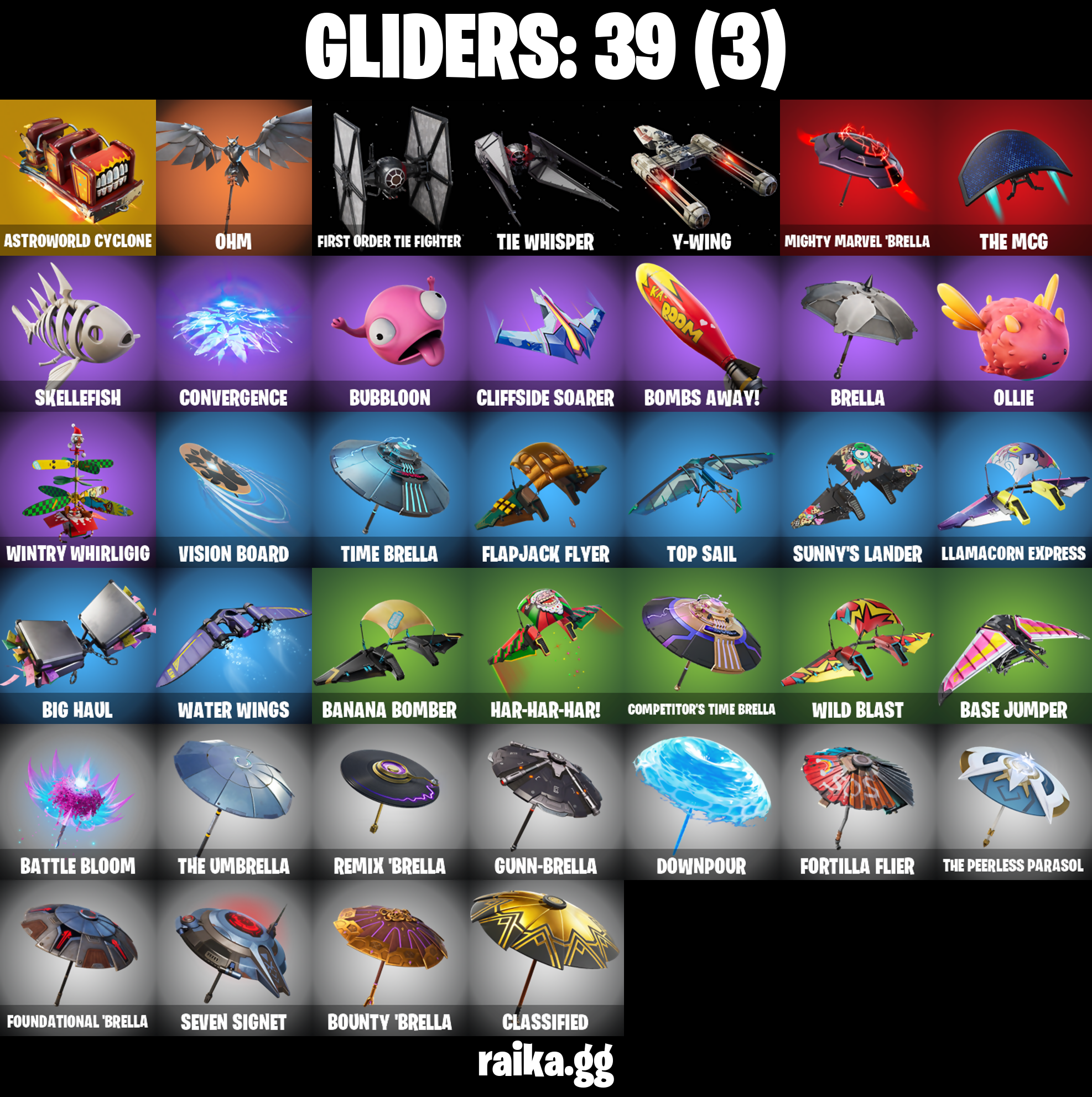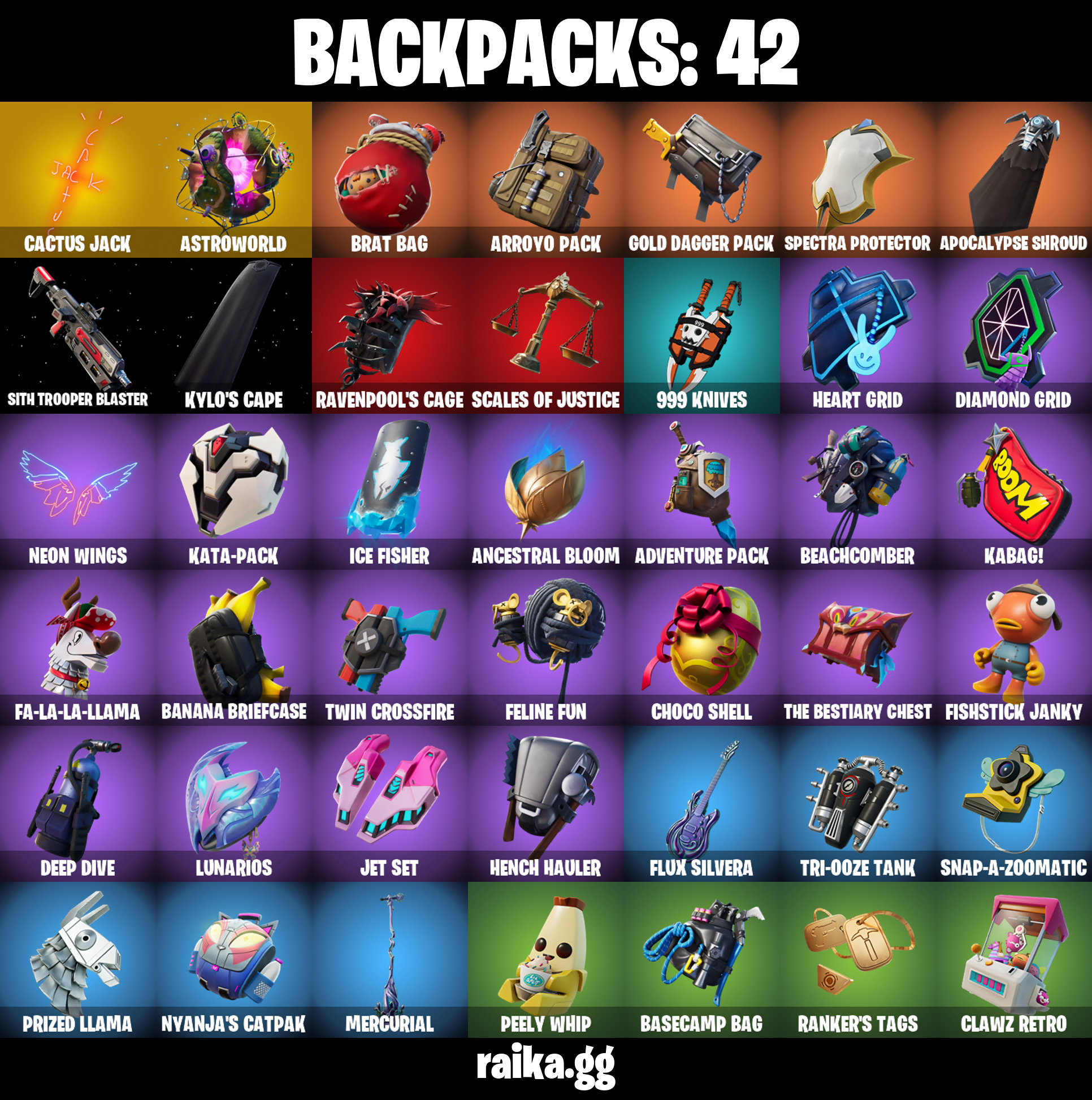 999 Knives, Adventure Pack, Agent Peely, Air Shredder, Ancestral Bloom, Apocalypse Shroud, Arroyo Pack, Astro Jack, Astroworld, Astroworld Cyclone, Banana Bomber, Banana Briefcase, Bananaxe, Base Jumper, Basecamp Bag, Battle Bloom, Beachcomber, Beep Beep, Big Haul, Blade of the Waning Moon, Bombs Away!, Boulder Breakers, Bounty 'Brella, Brat Bag, Brella, Brutus, Bubbloon, Bun Bun, Bunnywolf, Cactus Jack, Call Me, Choco Shell, Choice Knit, Classified, Clawz Retro, Clean Sweep, Cliffside Soarer, Coin Flip, Competitor's Time Brella, Convergence, Crabby, Crescent Shroom, Crowning Achievement, Curling Iron, Deadpool, Deep Dive, Diamond Grid, Diamond Jack, Dive Knives, Downpour, Doze Dab, Dynamic Shuffle, Electro Swing, Eon Blades, Epic Blade of Floof, Epic Swords of Wonder, Fa-La-La-Llama, Fade, Felina's Claw, Feline Fun, First Order Tie Fighter, Fishstick Janky, Flapjack Flyer, Flippin' Away, Flux Silvera, Focused, Fortilla Flier, Foundational 'Brella, Full Tilt, Gear Specialist Maya, Gold Dagger Pack, Gold Midas, Golden King, Groot's Sap Axes, Gum Brawler, Gunn-Brella, Hack & Smash, Har-Har-Har!, Heart Grid, Hench Hauler, Holly Hatchets, Ice Fisher, It's... You?, Jet Set, Jiggle Jiggle, Josie, Jubilation, Jules, Kabag!, Kata-Pack, Kittanas, Krampus, Kylo Ren, Kylo's Cape, Legendary Blade of Insight, Lil' Prancer, Llamacorn Express, Llion, Love It!, Lunarios, Mecha Team Leader, Meowscles, Mercurial, Mighty Marvel 'Brella, Nanner Bashers, Neon Wings, Nyanja's Catpak, Ocean, Ohm, Ollie, Pandemonium, Pass Rush Ranger, Paws & Claws, Peely Whip, Pirouette, Polar Patroller, Polar Peely, Premiere Poms, Prized Llama, Ranker's Tags, Ravenpool, Ravenpool's Cage, Remix 'Brella, Respect The Peace, Ride Along, Scales Of Justice, Scuba Jonesy, Secret Scimitars, Seven Signet, Shooting Starstaff, Side Hustle, Sing Along, Sith Trooper, Sith Trooper Blaster, Skellefish, Skye, Slayer Juice Wrld, Snap-A-Zoomatic, Snikt! Snikt!, Snowplower, So Square, Solid Scratch, Sparkler, Specialist Pickaxe, Spectra Protector, Springy, Sunny's Lander, The Bestiary Chest, The Break Shot, The Dip, The Mcg, The Peerless Parasol, The Umbrella, Thumbs Down, Tide Axes, Tie Whisper, Time Brella, Tippy Tap, Tnteeth, Tntina, Toosie Slide, Top Sail, Travis Scott, Tri-Ooze Tank, Twin Crossfire, Utility Claymore, Verve, Vision Board, Water Wings, Well Rounded, Wild Blast, Wintry Whirligig, Wrenchers, Y-Wing, Zorii Bliss