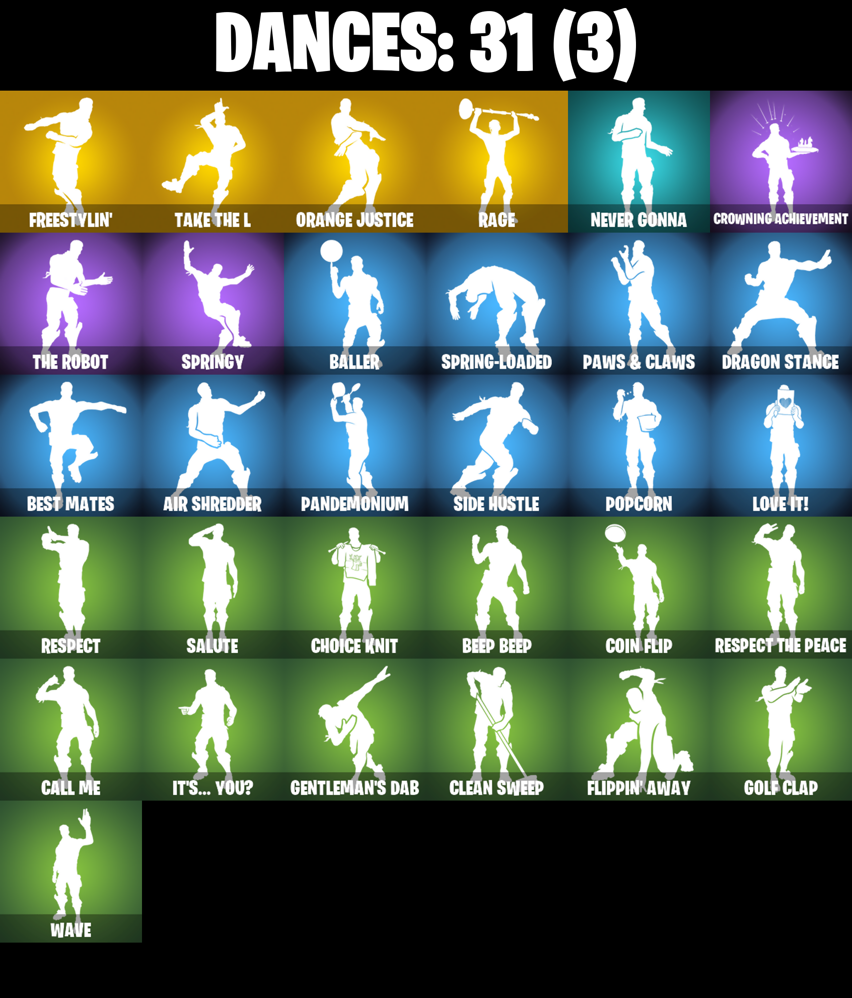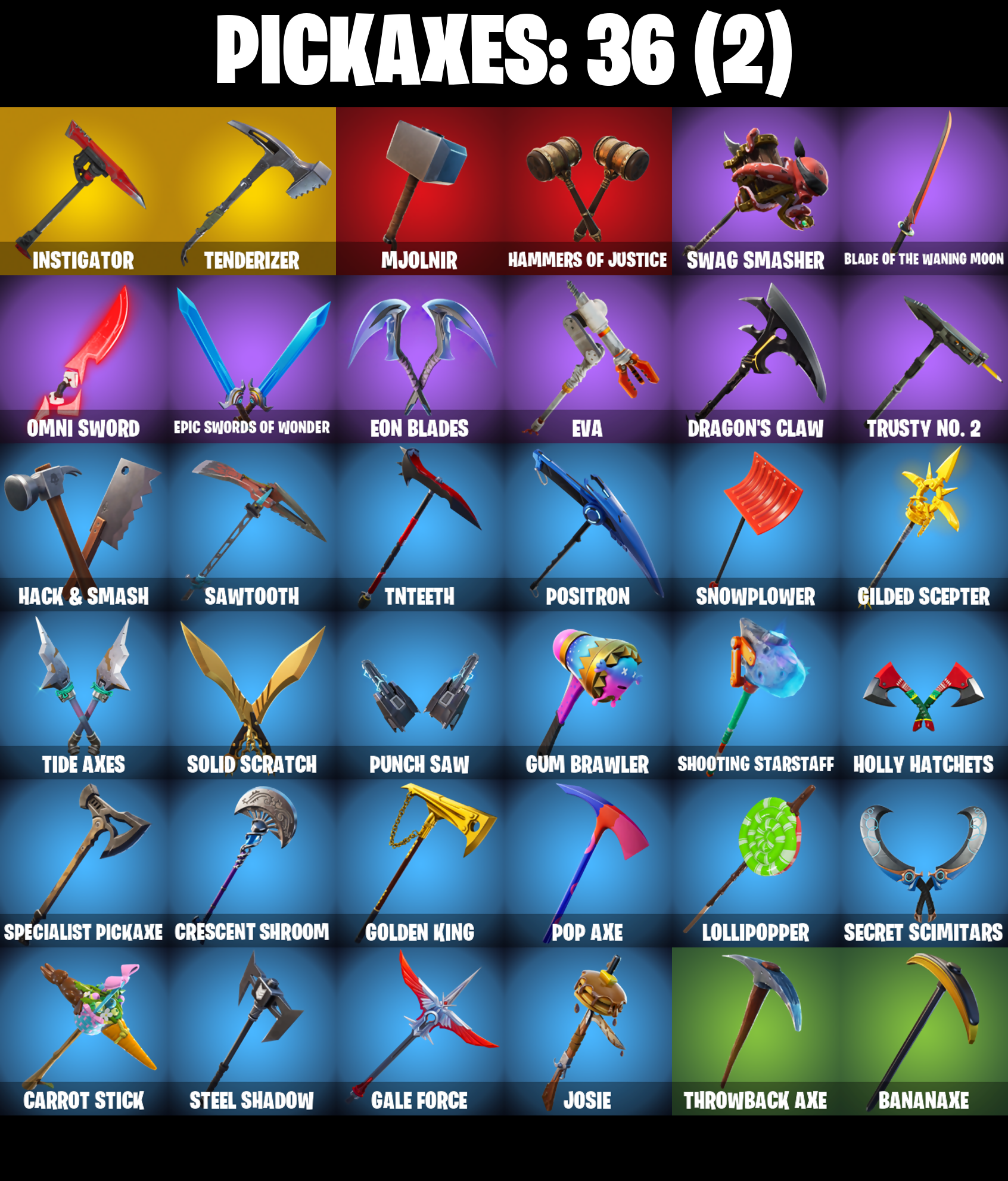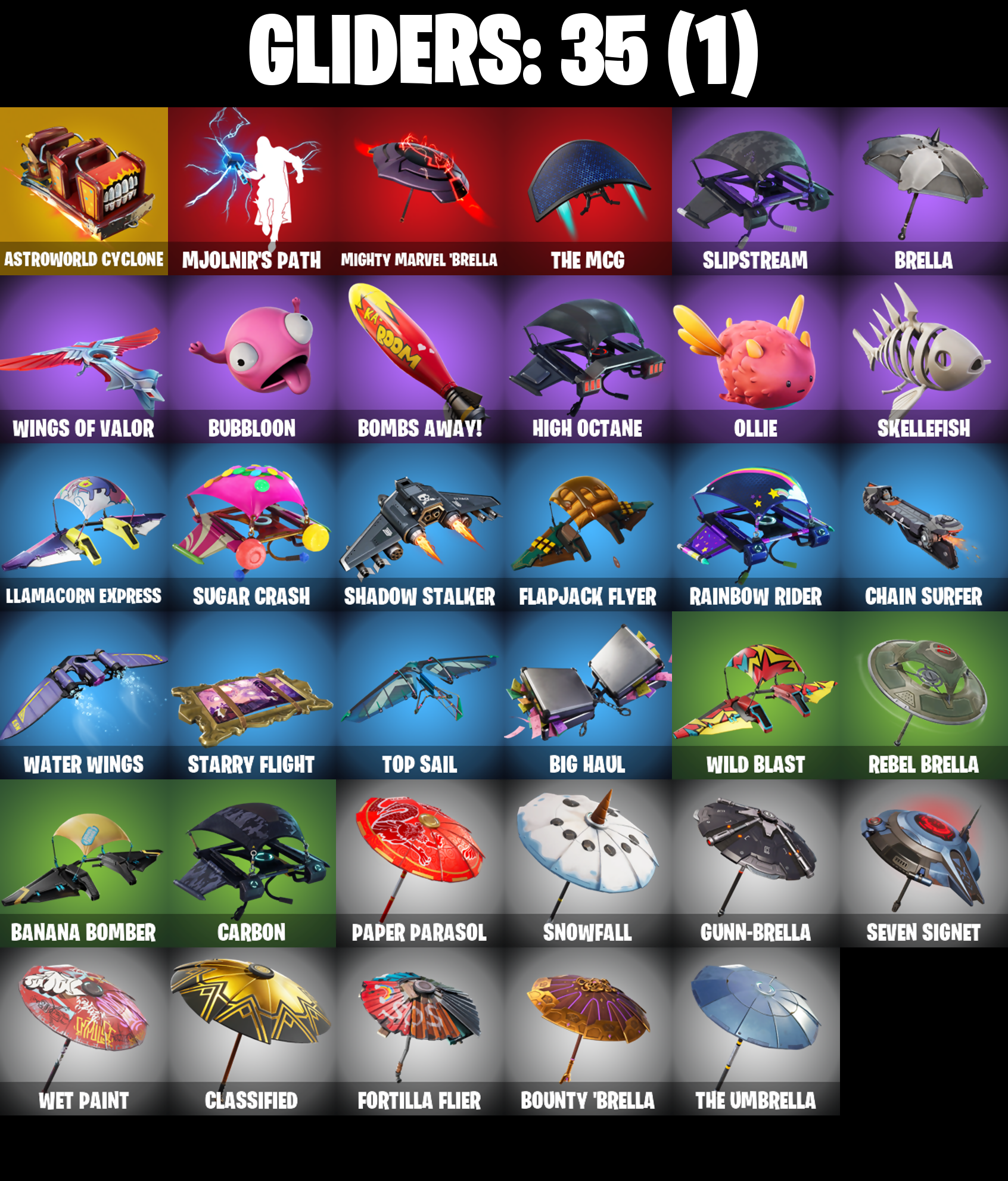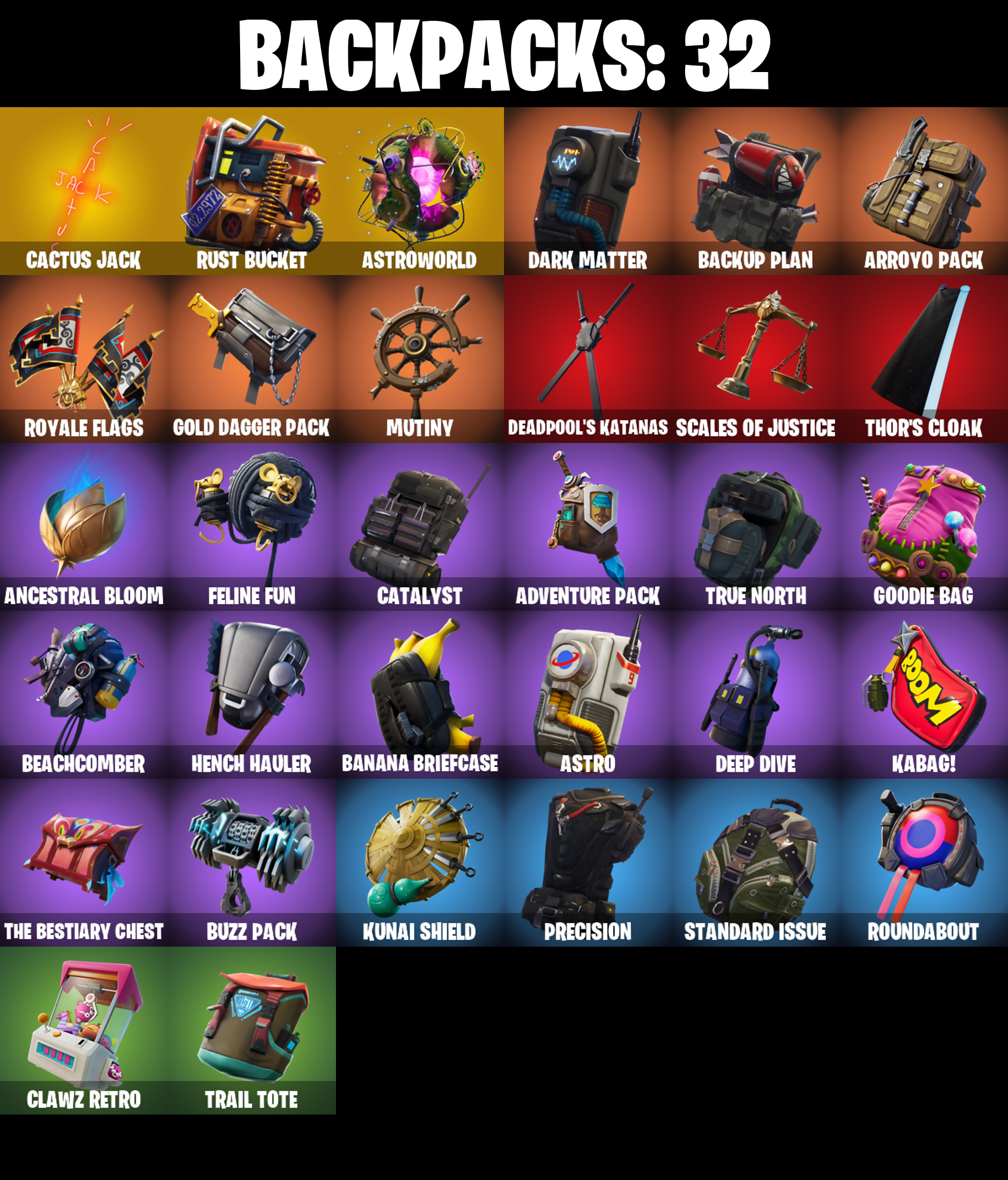 Adventure Pack, Agent Peely, Air Shredder, Ancestral Bloom, Arroyo Pack, Astro, Astro Jack, Astroworld, Astroworld Cyclone, Backup Plan, Baller, Banana Bomber, Banana Briefcase, Bananaxe, Battlehawk, Beachcomber, Beep Beep, Best Mates, Big Haul, Blackheart, Blackheart (Stage 8), Blade Of The Waning Moon, Bombs Away!, Bounty 'Brella, Brella, Bubloon, Buzz Pack, Cactus Jack, Call Me, Carbide, Carbon, Carrot Stick, Catalyst, Chain Surfer, Choice Knit, Classified, Clawz Retro, Clean Sweep, Coin Flip, Crescent Shroom, Crowning Achievement, Dark Matter, Dark Voyager, Deadpool, Deadpool Unmasked, Deadpool's Katanas, Deep Dive, Dragon Stance, Dragon's Claw, Elite Agent, Eon Blades, Epic Swords Of Wonder, Eva, Fade, Feline Fun, Flapjack Flyer, Flippin' Away, Fortilla Flier, Freestylin', Gale Force, Gear Specialist Maya, Gear Specialist Maya (Hat - Dark), Gentleman's Dab, Gilded Scepter, Gold Brutus, Gold Dagger Pack, Gold Midas, Golden King, Golf Clap, Goodie Bag, Gum Brawler, Gunn-Brella, Gunnar, Hack & Smash, Hammers Of Justice, Havoc, Hench Hauler, High Octane, Holly Hatchets, Hybrid, Hybrid (Stage 4), Instigator, Iris, It's... You?, Jennifer Walters, Josie, Kabag!, Kunai Shield, Llamacorn Express, Lollipopper, Love It!, Meowscles, Mighty Marvel 'Brella, Mission Specialist, Mjolnir, Mjolnir's Path, Moonwalker, Mutiny, Never Gonna, Ocean, Ollie, Omni Sword, Orange Justice, Pandemonium, Paper Parasol, Paws & Claws, Polar Peely, Pop Axe, Popcorn, Positron, Precision, Punch Saw, Rage, Rainbow Rider, Rebel Brella, Respect, Respect The Peace, Riptide, Rogue Agent, Roundabout, Royale Flags, Rust Bucket, Rust Lord, Salute, Sawtooth, Scales Of Justice, Scuba Jonesy, Secret Scimitars, Seven Signet, Shadow Stalker, Shifu, Shooting Starstaff, Side Hustle, Skellefish, Skye, Slipstream, Snowfall, Snowplower, Solid Scratch, Specialist Pickaxe, Spring-Loaded, Springy, Standard Issue, Starry Flight, Steel Shadow, Sub Commander, Sugar Crash, Swag Smasher, Take The L, Teknique, Tenderizer, The Bestiary Chest, The McG, The Reaper, The Robot, The Umbrella, Thor, Thor's Cloak, Throwback Axe, Tide Axes, Tnteeth, Tntina, Top Sail, Trail Tote, Trailblazer, Travis Scott, True North, Trusty No. 2, Tsuki 2.0, Water Wings, Wave, Wet Paint, Wild Blast, Wings Of Valor, Wolverine, Wukong, Zoey