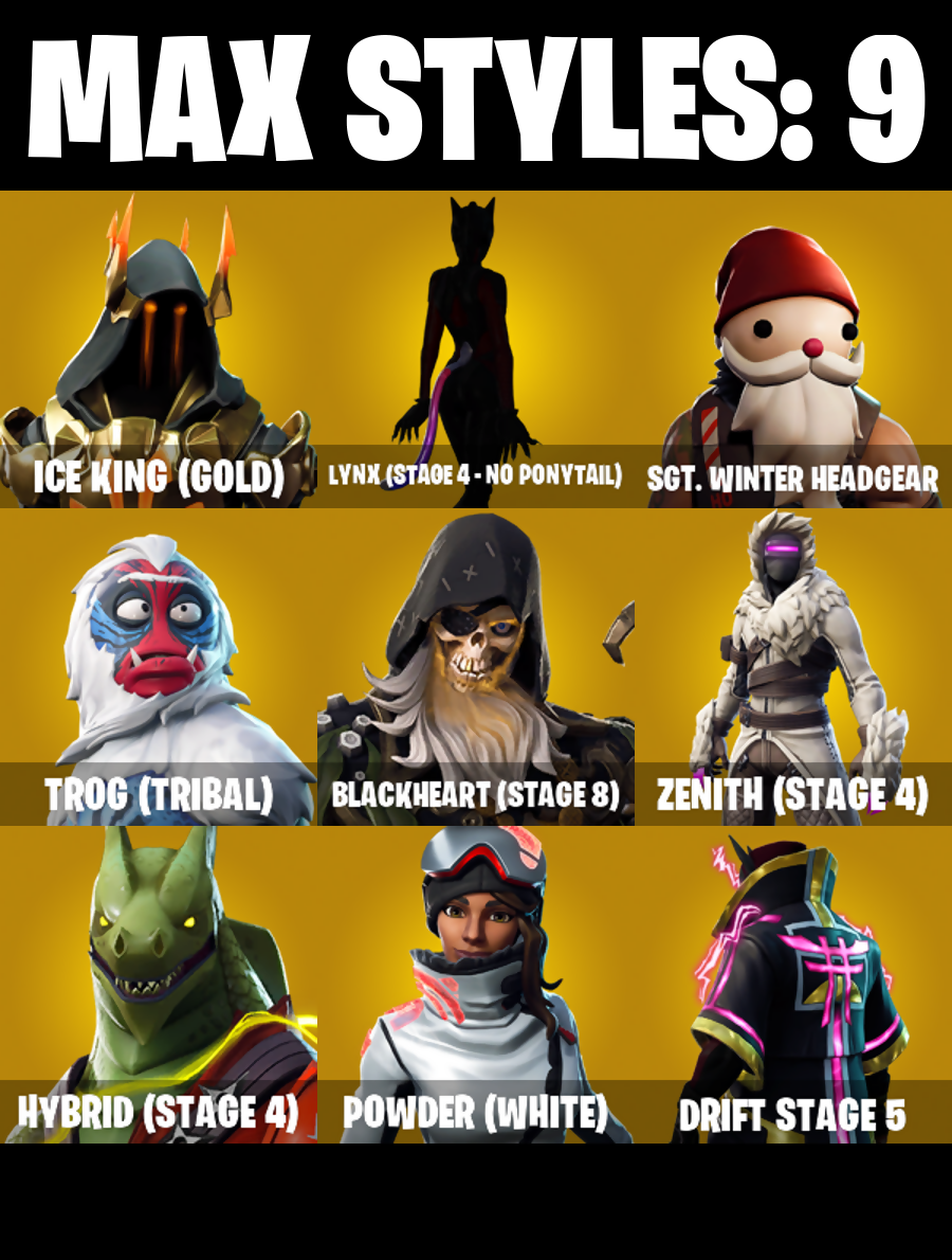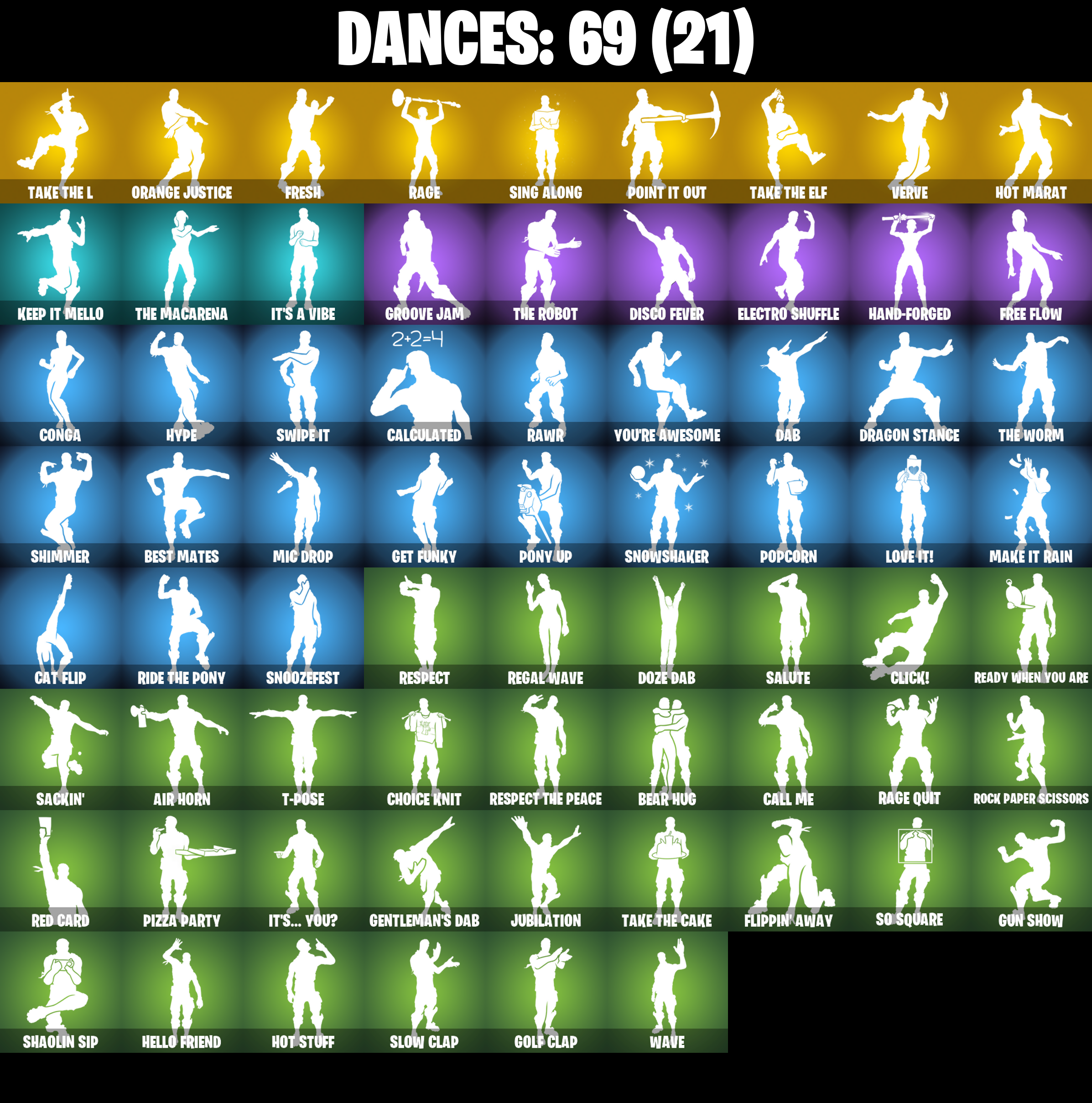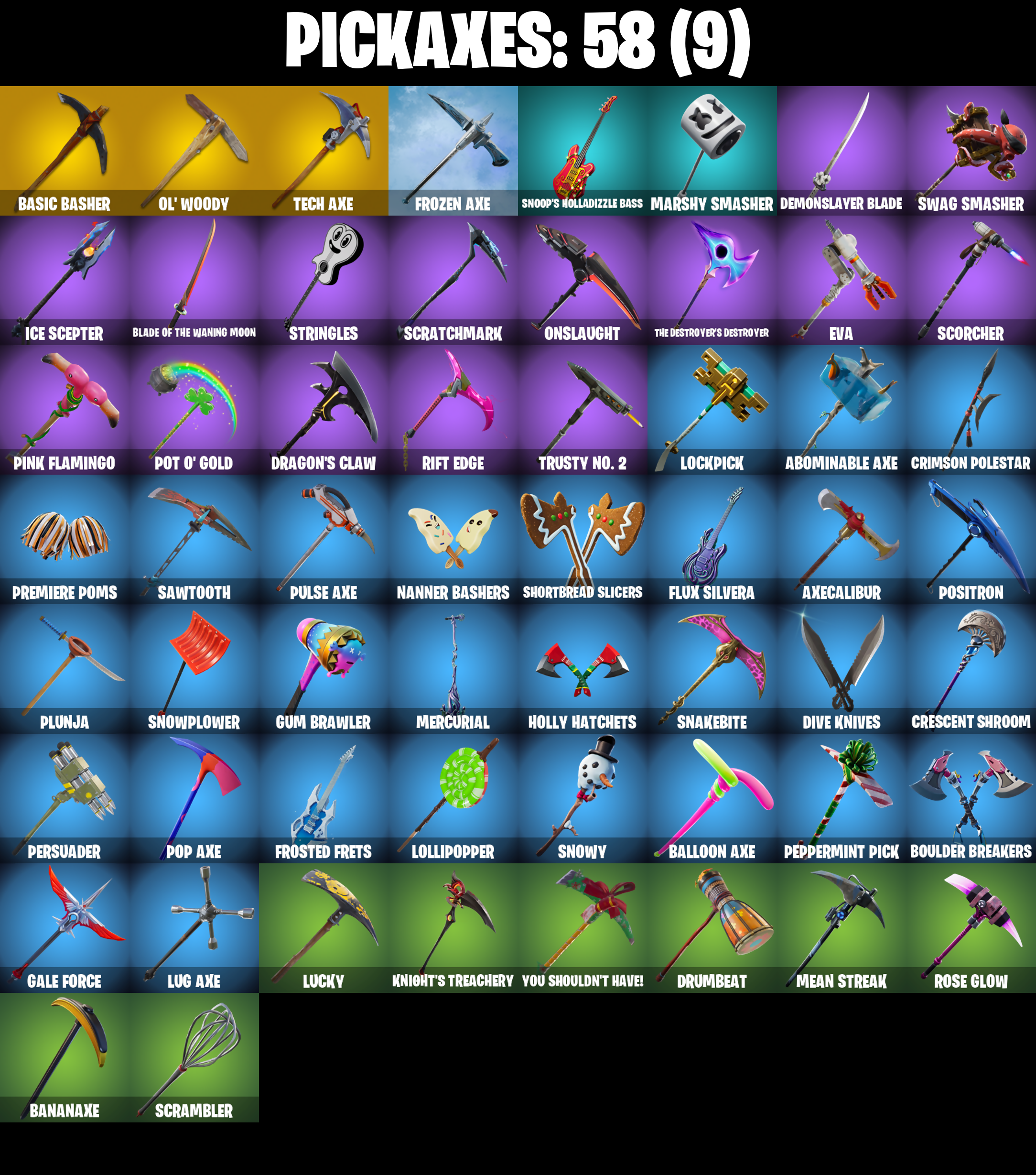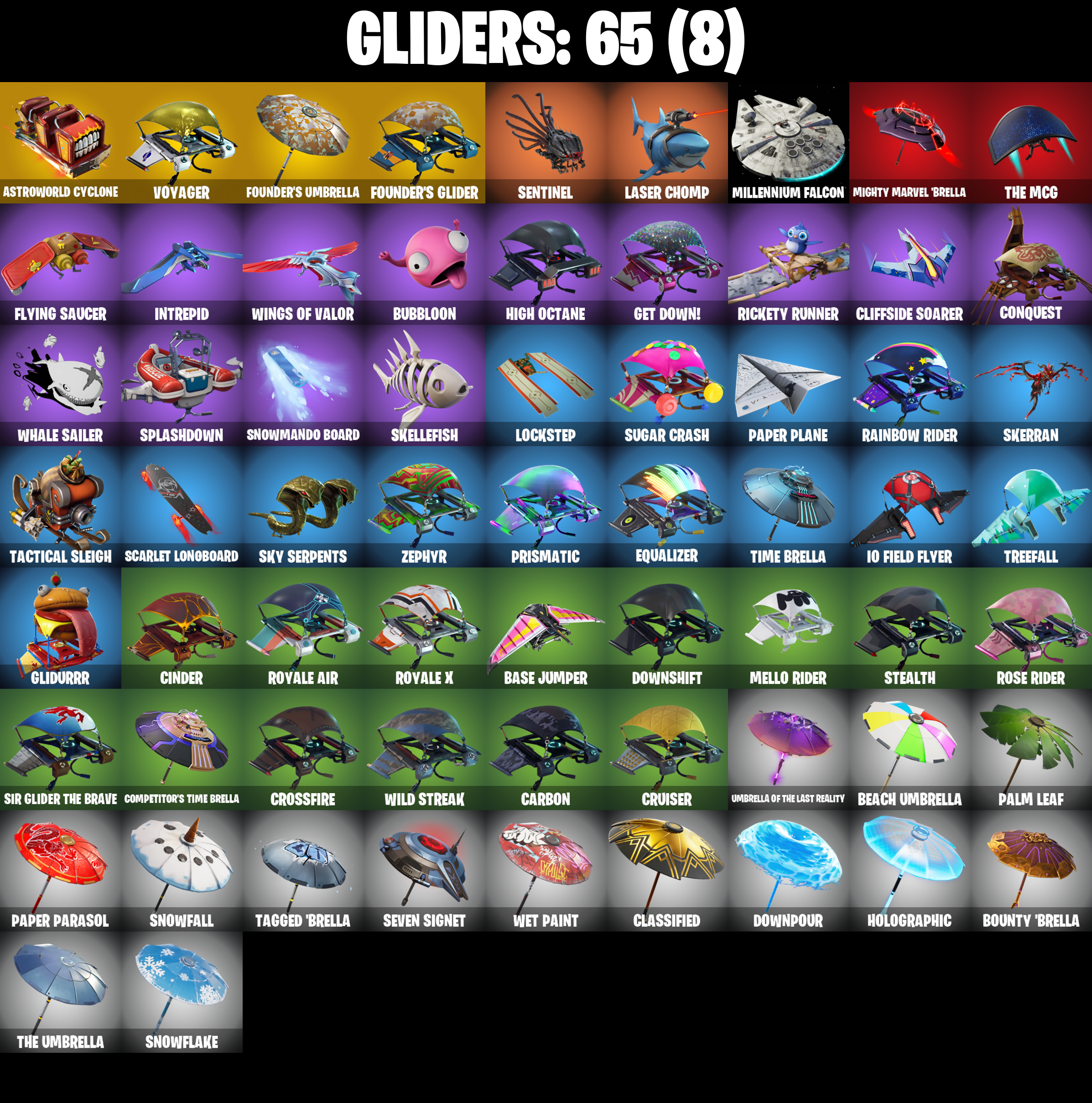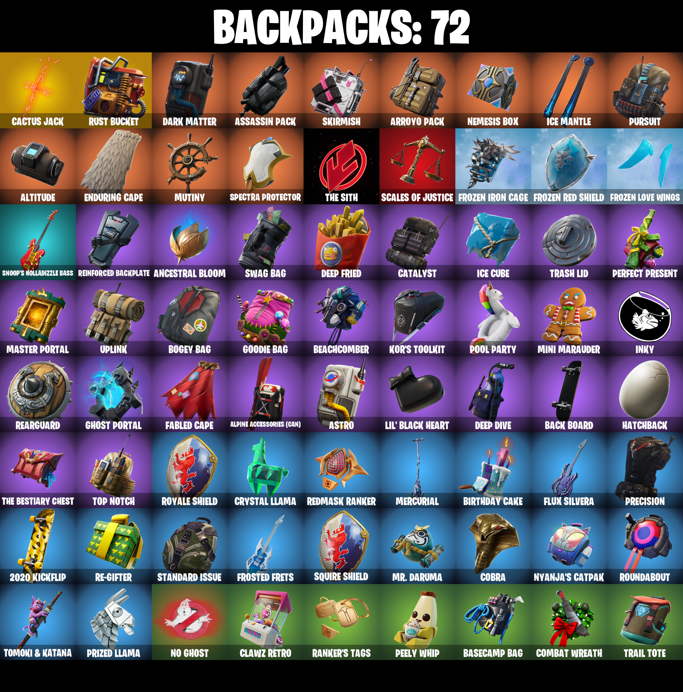 2020 Kickflip, Abominable Axe, Air Horn, Alpine Accessories (Can), Alpine Ace (CAN), Altitude, Ancestral Bloom, Arctic Assassin, Arroyo Pack, Assassin Pack, Astro, Astroworld Cyclone, Axecalibur, Back Board, Balloon Axe, Bananaxe, Base Jumper, Basecamp Bag, Basic Basher, Battlehawk, Beach Umbrella, Beachcomber, Bear Hug, Beef Boss, Best Mates, Birthday Cake, Blackheart, Blackheart (Stage 8), Blade of the Waning Moon, Blizzabelle, Blue Squire, Bogey Bag, Boulder Breakers, Bounty 'Brella, Bubloon, Cactus Jack, Calculated, Call Me, Carbide, Carbon, Cat Flip, Catalyst, Charlotte, Choice Knit, Cinder, Circuit Breaker, Classified, Clawz Retro, Click!, Cliffside Soarer, Clinical Crosser, Cobalt, Cobra, Combat Wreath, Competitor's Time Brella, Conga, Conquest, Crescent Shroom, Crimson Polestar, Crossfire, Cruiser, Crystal Llama, Dab, Dark Matter, Dark Voyager, Deep Dive, Deep Fried, Demonslayer Blade, Diecast, Disco Fever, Dive Knives, Downpour, Downshift, Doze Dab, Dragon Stance, Dragon's Claw, Drift, Drift Stage 5, Drumbeat, Electro Shuffle, Elite Agent, Enduring Cape, Equalizer, Eva, Fabled Cape, Flippin' Away, Flux Silvera, Flying Saucer, Founder's Glider, Founder's Umbrella, Free Flow, Fresh, Frosted Frets, Frozen Axe, Frozen Iron Cage, Frozen Love Ranger, Frozen Love Wings, Frozen Raven, Frozen Red Knight, Frozen Red Shield, Gale Force, Gentleman's Dab, Get Down!, Get Funky, Ghost Portal, Glidurr, Golf Clap, Goodie Bag, Groove Jam, Gum Brawler, Gun Show, Hand-Forged, Hatchback, Hello Friend, High Octane, Holly Hatchets, Holographic, Hot Marat, Hot Stuff, Huntress, Hybrid, Hybrid (Stage 4), Hype, Hyperion, Ice Cube, Ice King (Gold), Ice Mantle, Ice Scepter, Inky, Intrepid, Io Field Flyer, Iris, It's A Vibe, It's... You?, John Wick, Jubilation, Jungle Scout, Keep It Mello, Kitbash, Knight's Treachery, Kor, Kor's Toolkit, Krisabelle, Laser Chomp, Lil' Black Heart, Lockpick, Lockstep, Lollipopper, Love It!, Lt. Evergreen, Lucky, Lug Axe, Lynx, Lynx (Stage 4 - No Ponytail), Magnus, Make It Rain, Marshmello, Marshy Smasher, Master Portal, Mean Streak, Mello Rider, Mercurial, Merry Marauder, Mic Drop, Mighty Marvel 'Brella, Millennium Falcon, Mini Marauder, Mission Specialist, Moonwalker, Mr. Daruma, Mutiny, Nanner Bashers, Nemesis Box, No Ghost, Nog Ops, Nyanja's Catpak, Ol' Woody, Omega, Onesie, Onslaught, Orange Justice, Palm Leaf, Paper Parasol, Paper Plane, Peely, Peely Whip, Peppermint Pick, Perfect Present, Persuader, Pink Flamingo, Pizza Party, Plunja, Point It Out, Polar Peely, Pony Up, Pool Party, Pop Axe, Popcorn, Positron, Pot O' Gold, Powder, Powder (White), Precision, Premiere Poms, Prismatic, Prized Llama, Pulse Axe, Pursuit, Rage, Rage Quit, Rainbow Rider, Ranker's Tags, Rawr, Re-Gifter, Ready When You Are, Rearguard, Red Card, Red-Nosed Raider, Redline, Redmask Ranker, Regal Wave, Reinforced Backplate, Respect, Respect The Peace, Rickety Runner, Ride The Pony, Rift Edge, Rock Paper Scissors, Rogue Agent, Rose Glow, Rose Rider, Rose Team Leader, Roundabout, Royale Air, Royale Knight, Royale Shield, Royale X, Rust Bucket, Rust Lord, Sackin', Salute, Sawtooth, Scales of Justice, Scarlet Longboard, Scorcher, Scrambler, Scratchmark, Sentinel, Seven Signet, Sgt. Green Clover, Sgt. Winter, Sgt. Winter Headgear, Shaolin Sip, Shimmer, Shortbread Slicers, Sidewinder, Sing Along, Sir Glider The Brave, Skellefish, Skerran, Skirmish, Skull Trooper, Sky Serpents, Sledgehammer, Slow Clap, Snakebite, Snoop's Holladizzle Bass, Snoozefest, Snowfall, Snowflake, Snowmando Board, Snowplower, Snowshaker, Snowy, So Square, Spectra Protector, Splashdown, Squad Leader, Squire Shield, Standard Issue, Stealth, Stringles, Sugar Crash, Summit Striker, Sun Strider, Swag Bag, Swag Smasher, Swipe It, T-Pose, Tactical Sleigh, Tagged 'Brella, Take The Cake, Take The Elf, Take The L, Tech Axe, Teknique, Tender Defender, The Ace, The Bestiary Chest, The Destroyer's Destroyer, The Ice King, The Macarena, The Mcg, The Reaper, The Robot, The Sith, The Umbrella, The Worm, Time Brella, Tomoki & Katana, Toona Fish, Top Notch, Trail Tote, Trash Lid, Travis Scott, Treefall, Trog, Trog (Tribal), Trusty No. 2, Umbrella Of The Last Reality, Uplink, Valor, Verve, Voyager, Warpaint, Wave, Wet Paint, Whale Sailer, Wild Streak, Wingman, Wings of Valor, Wooly Warrior, You Shouldn't Have!, You're Awesome, Zenith, Zenith (Stage 4), Zephyr, Zoey