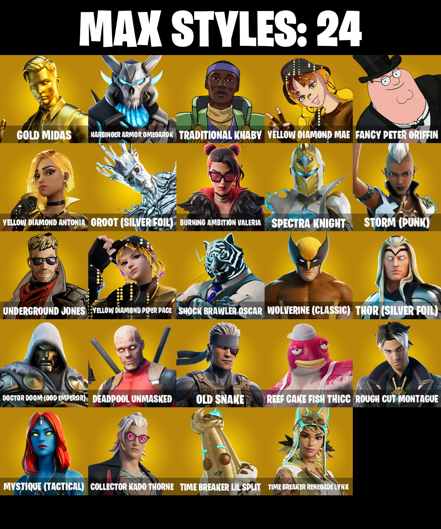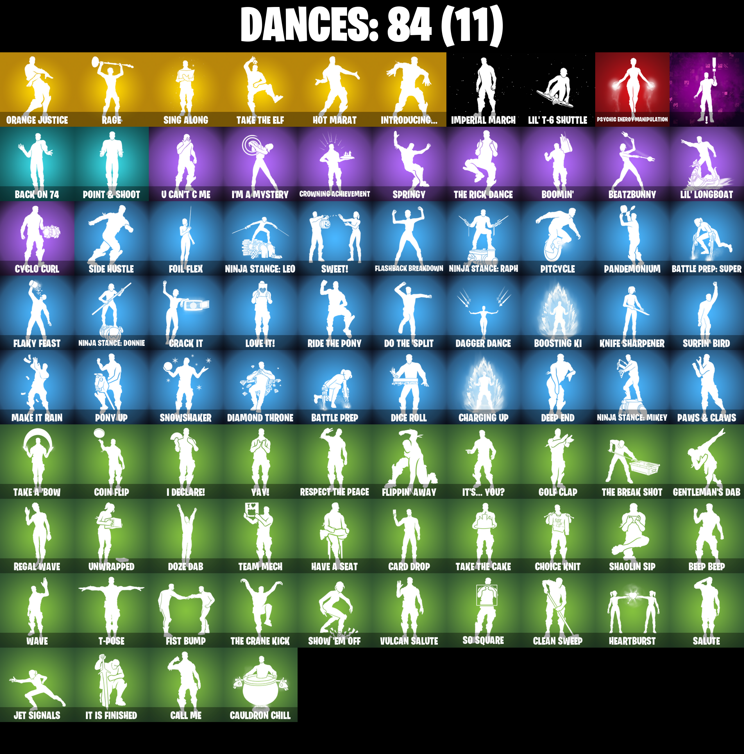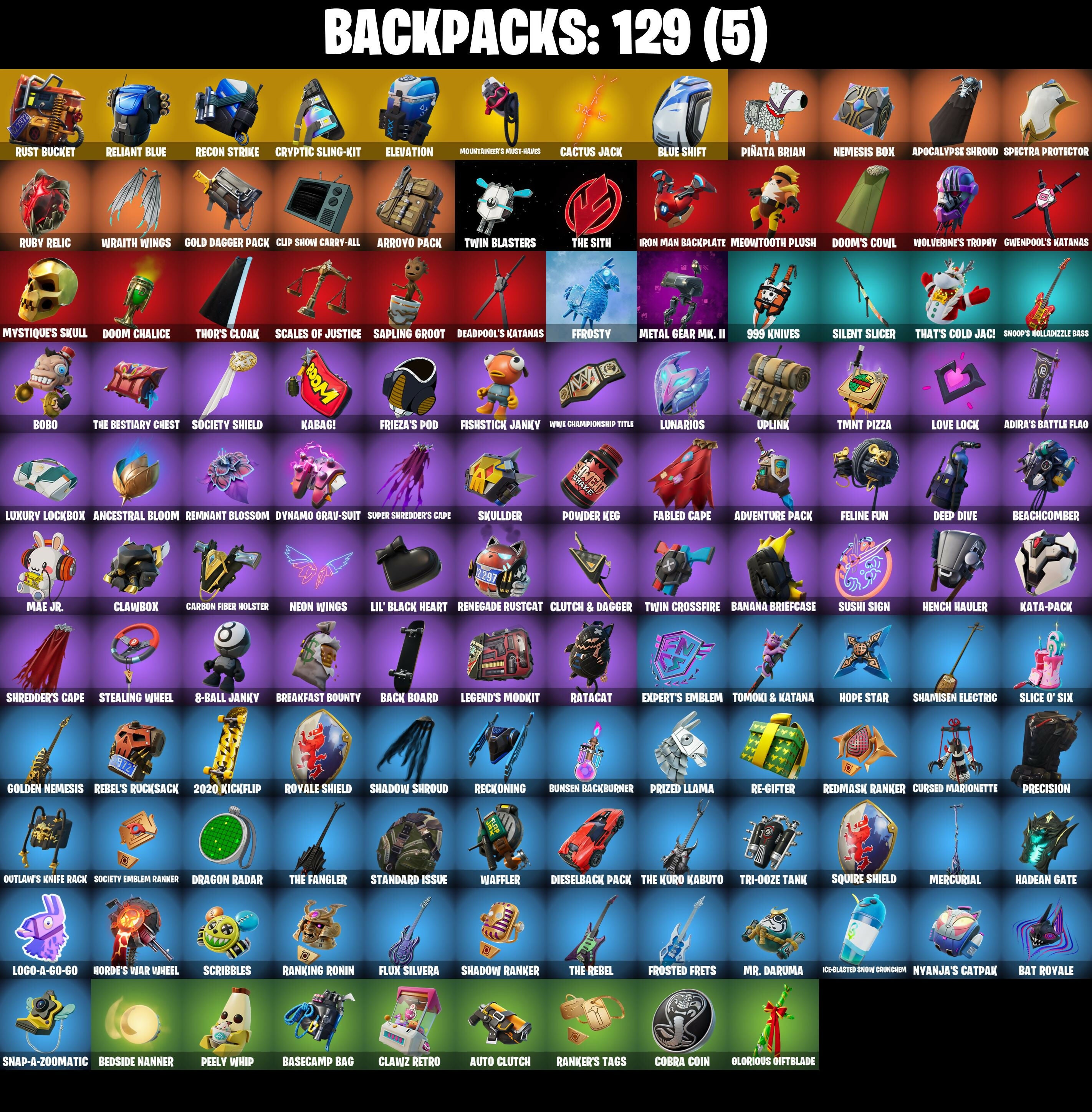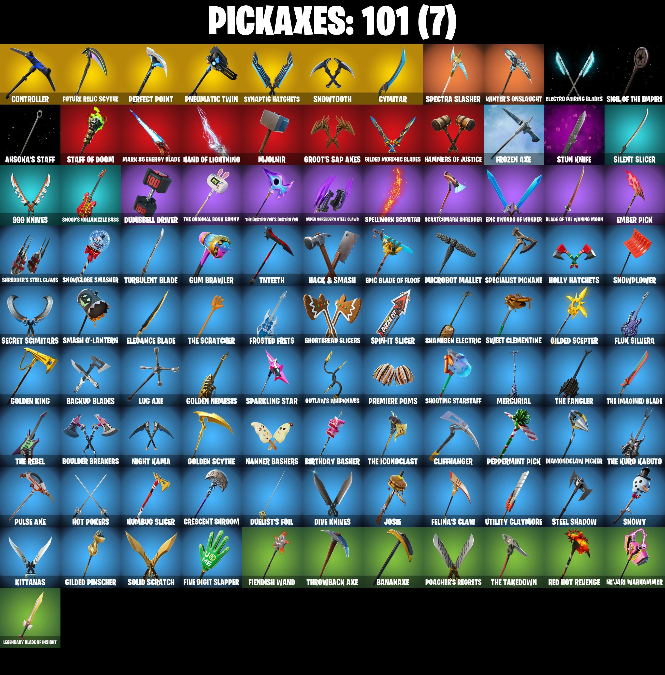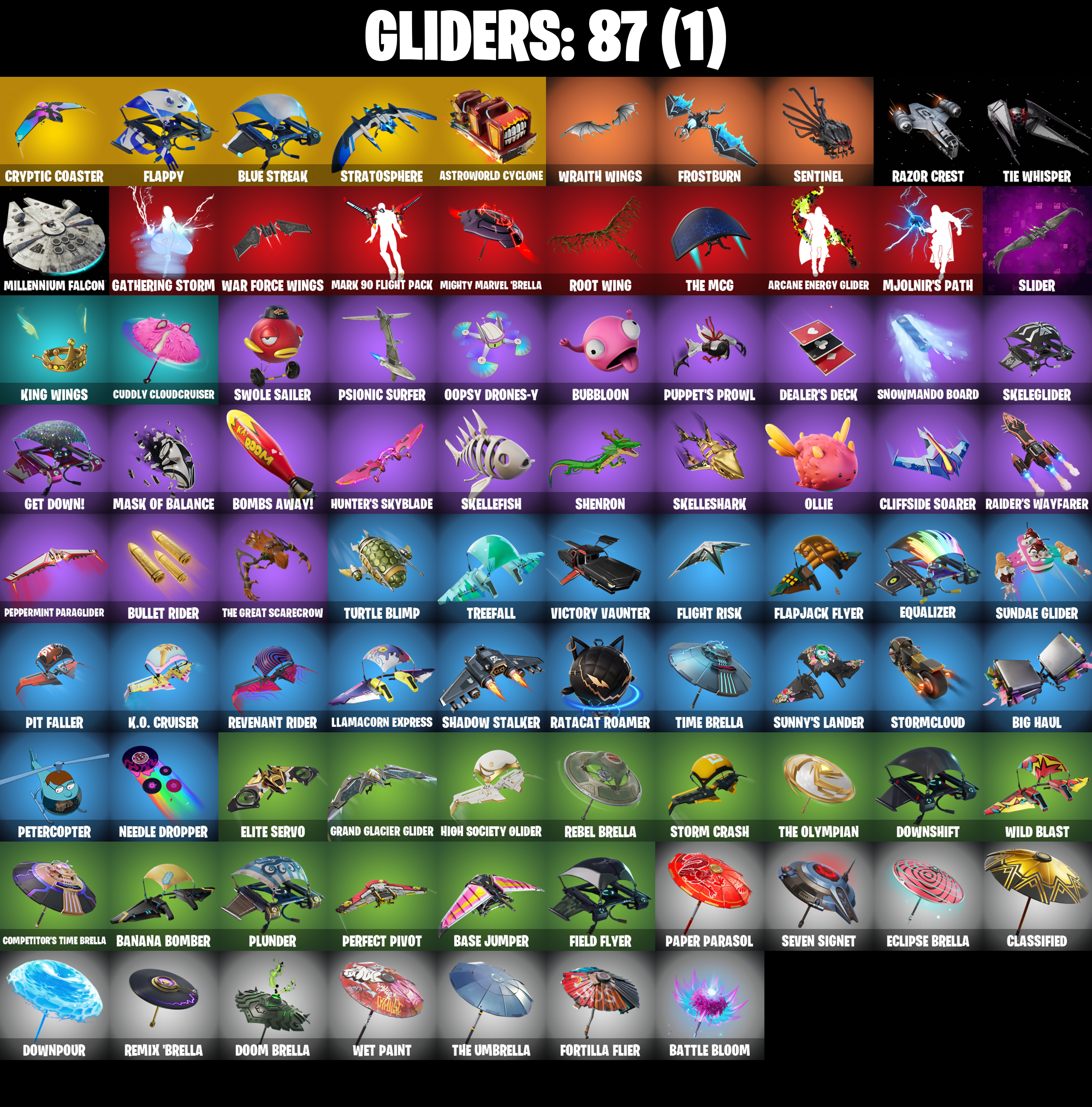 2020 Kickflip, 8-Ball Janky, 999 Knives, Adira's Battle Flag, Adventure Pack, Agent Peely, Ahsoka Tano, Ahsoka's Staff, Ancestral Bloom, Antonia, Apocalypse Shroud, Arcane Energy Glider, Arroyo Pack, Astroworld Cyclone, Auto Clutch, Back Board, Back On 74, Backup Blades, Banana Bomber, Banana Briefcase, Bananaxe, Base Jumper, Basecamp Bag, Bat Royale, Battle Bloom, Battle Prep, Battle Prep: Super, Beachcomber, Beatzbunny, Bedside Nanner, Beep Beep, Big Haul, Birthday Basher, Blade of the Waning Moon, Blizzard Bomber, Blue Shift, Blue Squire, Blue Streak, Blue Striker, Blue Team Leader, Bobo, Bombs Away!, Boomin', Boosting Ki, Boulder Breakers, Breakfast Bounty, Brutus, Bubbloon, Bullet Rider, Bunsen Backburner, Burning Ambition Valeria, Cactus Jack, Call Me, Carbon Fiber Holster, Card Drop, Cauldron Chill, Charging Up, Choice Knit, Classified, Clawbox, Clawz Retro, Clean Sweep, Cliffhanger, Cliffside Soarer, Clip Show Carry-All, Cloud Striker, Clutch & Dagger, Cobra Coin, Coin Flip, Collector Kado Thorne, Competitor's Time Brella, Controller, Crack It, Crescent Shroom, Crowning Achievement, Cryptic Coaster, Cryptic Sling-Kit, Cuddly Cloudcruiser, Cursed Marionette, Cyclo Curl, Cymitar, Dagger Dance, Deadpool, Deadpool Unmasked, Deadpool's Katanas, Dealer's Deck, Deep Dive, Deep End, Diamond Throne, Diamondclaw Picker, Dice Roll, Dieselback Pack, Dive Knives, Do The 'Split, Doctor Doom, Doctor Doom (Odd Emperor), Doom Brella, Doom Chalice, Doom's Cowl, Downpour, Downshift, Doze Dab, Dragon Radar, Duelist's Foil, Dumbbell Driver, Dynamo Grav-Suit, Eclipse Brella, Electro Pairing Blades, Elegance Blade, Elevation, Elite Servo, Ember Pick, Epic Blade of Floof, Epic Swords of Wonder, Equalizer, Expert's Emblem, Fabled Cape, Fancy Peter Griffin, Felina, Felina's Claw, Feline Fun, Field Flyer, Fiendish Wand, Fish Thicc, Fishstick Janky, Fist Bump, Five Digit Slapper, Fixer, Flaky Feast, Flapjack Flyer, Flappy, Flashback Breakdown, Flight Risk, Flippin' Away, Flux Silvera, Foil Flex, Fortilla Flier, Frieza, Frieza's Pod, Frostburn, Frosted Frets, Frosty, Frozen Axe, Future Relic Scythe, Gathering Storm, Gear Specialist Maya, Gentleman's Dab, Get Down!, Gilded Morphic Blades, Gilded Pinscher, Gilded Scepter, Glorious Giftblade, Gold Dagger Pack, Gold Midas, Golden King, Golden Nemesis, Golden Scythe, Golf Clap, Grand Glacier Glider, Groot, Groot (Silver Foil), Groot's Sap Axes, Gum Brawler, Gwenpool's Katanas, Hack & Smash, Hadean Gate, Hammers of Justice, Hand of Lightning, Harbinger Armor Omegarok, Have A Seat, Heartburst, Hench Hauler, High Society Glider, Holiday Boxy, Holly Hatchets, Hope, Hope Star, Horde's War Wheel, Hot Marat, Hot Pokers, Humbug Slicer, Hunter's Skyblade, I Declare!, I'm A Mystery, Ice-Blasted Snow Crunch'em, Imperial March, Introducing..., Iron Man Backplate, It Is Finished, It's... You?, Jackie, Jennifer Walters, Jet Signals, John Cena, Josie, K.O. Cruiser, Kabag!, Kado Thorne, Kata-Pack, Khaby Lame, King Wings, Kittanas, Knife Sharpener, Krisabelle, Legend's Modkit, Legendary Blade of Insight, Lil Split, Lil' Black Heart, Lil' Longboat, Lil' T-6 Shuttle, Llamacorn Express, Logo-A-Go-Go, Love It!, Love Lock, Lt. Evergreen, Lug Axe, Lunarios, Luxury Lockbox, Mae, Mae Jr., Major Mancake, Make It Rain, Mancake, Mandalorian, Mark 86 Energy Blade, Mark 90 Flight Pack, Mask Of Balance, Meowscles, Meowtooth Plush, Mercurial, Metal Gear Mk. II, Microbot Mallet, Mighty Marvel 'Brella, Millennium Falcon, Mjolnir, Mjolnir's Path, Montague, Mr. Daruma, Mystique, Mystique (Tactical), Mystique's Skull, Nanner Bashers, Ne'Jari Warhammer, Needle Dropper, Nemesis Box, Neon Wings, Night Kama, Ninja Stance: Donnie, Ninja Stance: Leo, Ninja Stance: Mikey, Ninja Stance: Raph, Nisha, Nolan Chance, Nyanja's Catpak, Old Snake, Ollie, Omegarok, Oopsy Drones-Y, Orange Justice, Oscar, Outlaw's Knife Rack, Outlaw's Whipknives, Pandemonium, Paper Parasol, Paws & Claws, Peely Whip, Peppermint Paraglider, Peppermint Pick, Perfect Pivot, Perfect Point, Peter Griffin, Petercopter, Piper Pace, Pit Faller, Pitcycle, Piñata Brian, Plunder, Pneumatic Twin, Poacher's Regrets, Point & Shoot, Point Patroller, Polar Peely, Pony Up, Powder Keg, Precision, Premiere Poms, Prized Llama, Psionic Surfer, Psychic Energy Manipulation, Pulse Axe, Puppet's Prowl, Rage, Raider's Wayfarer, Ranker's Tags, Ranking Ronin, Rap Boy, Ratacat, Ratcat Roamer, Razor Crest, Re-Gifter, Rebel Brella, Rebel's Rucksack, Reckoning, Recon Strike, Red Hot Revenge, Redmask Ranker, Reef Cake Fish Thicc, Reese, Regal Wave, Reliant Blue, Remix 'Brella, Remnant Blossom, Renegade Lynx, Renegade Rustcat, Respect The Peace, Revenant Rider, Ride The Pony, Root Wing, Rough Cut Montague, Royale Knight, Royale Shield, Ruby Relic, Runway Racer, Rust Bucket, Salute, Santa Dogg, Sapling Groot, Scales Of Justice, Scratchmark Shredder, Scribbles, Secret Scimitars, Sentinel, Seven Signet, Shadow Ranker, Shadow Shroud, Shadow Stalker, Shamisen Electric, Shaolin Sip, Shenron, Shock Brawler Oscar, Shooting Starstaff, Shortbread Slicers, Show 'Em Off, Shredder, Shredder's Cape, Shredder's Steel Claws, Side Hustle, Sigil of the Empire, Silent Slicer, Sing Along, Skeleglider, Skellefish, Skelleshark, Skullder, Skye, Slayer Juice Wrld, Slice O' Six, Slider, Smash O'-Lantern, Snap-A-Zoomatic, Snoop's Holladizzle Bass, Snowglobe Smasher, Snowmando Board, Snowplower, Snowshaker, Snowtooth, Snowy, So Square, Society Emblem Ranker, Society Shield, Solid Scratch, Solid Snake, Sparkling Star, Specialist Pickaxe, Spectra Knight, Spectra Protector, Spectra Slasher, Spellwork Scimitar, Spin-It Slicer, Springy, Squire Shield, Staff of Doom, Standard Issue, Stealing Wheel, Steel Shadow, Storm, Storm (Punk), Storm Crash, Stormcloud, Stratosphere, Stun Knife, Subzero Cryptic, Sultura, Sundae Glider, Sunny's Lander, Super Shredder, Super Shredder's Cape, Super Shredder's Steel Claws, Surfin' Bird, Sushi Sign, Sweet Clementine, Sweet!, Swole Sailer, Synaptic Hatchets, T-Pose, T