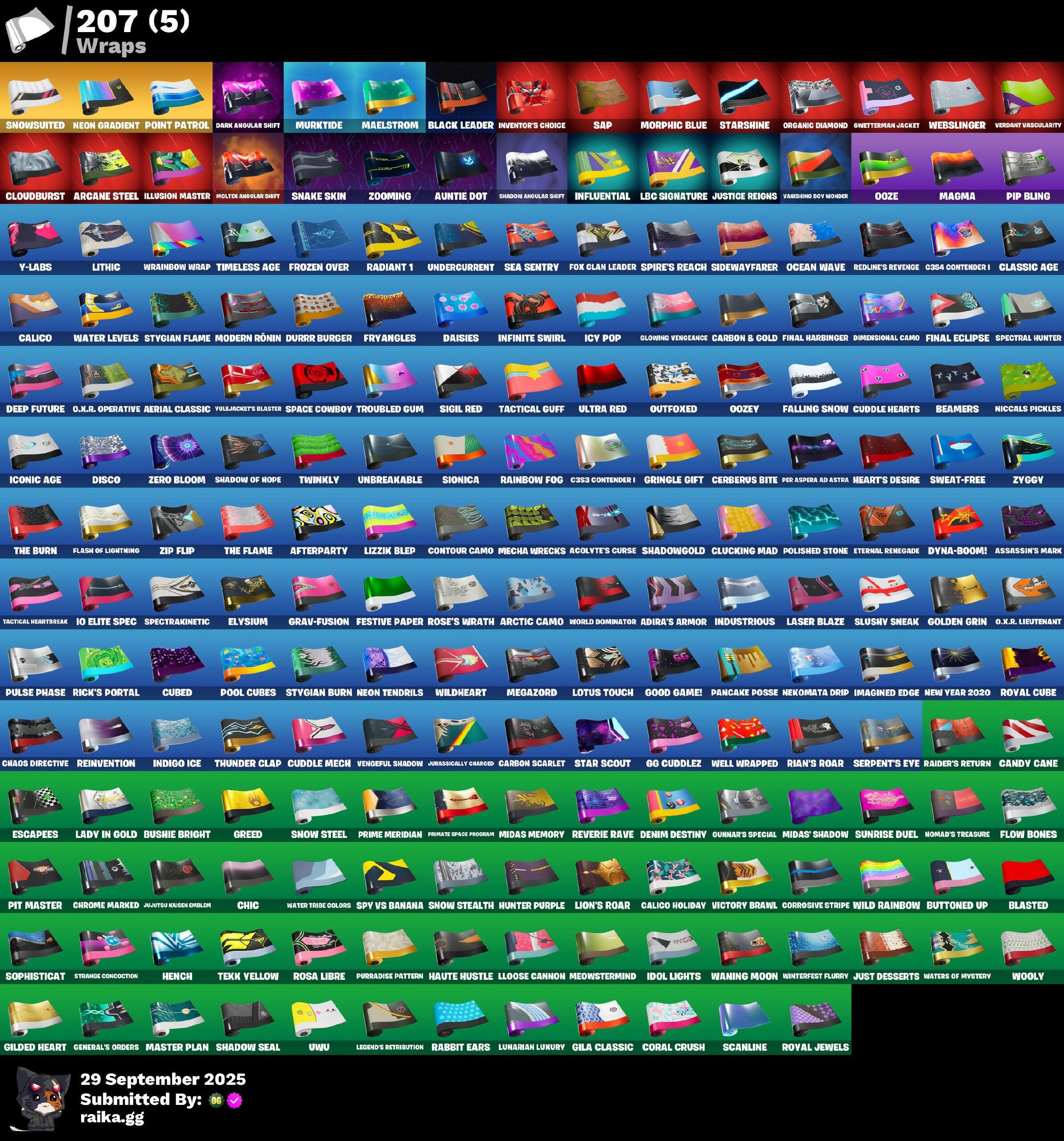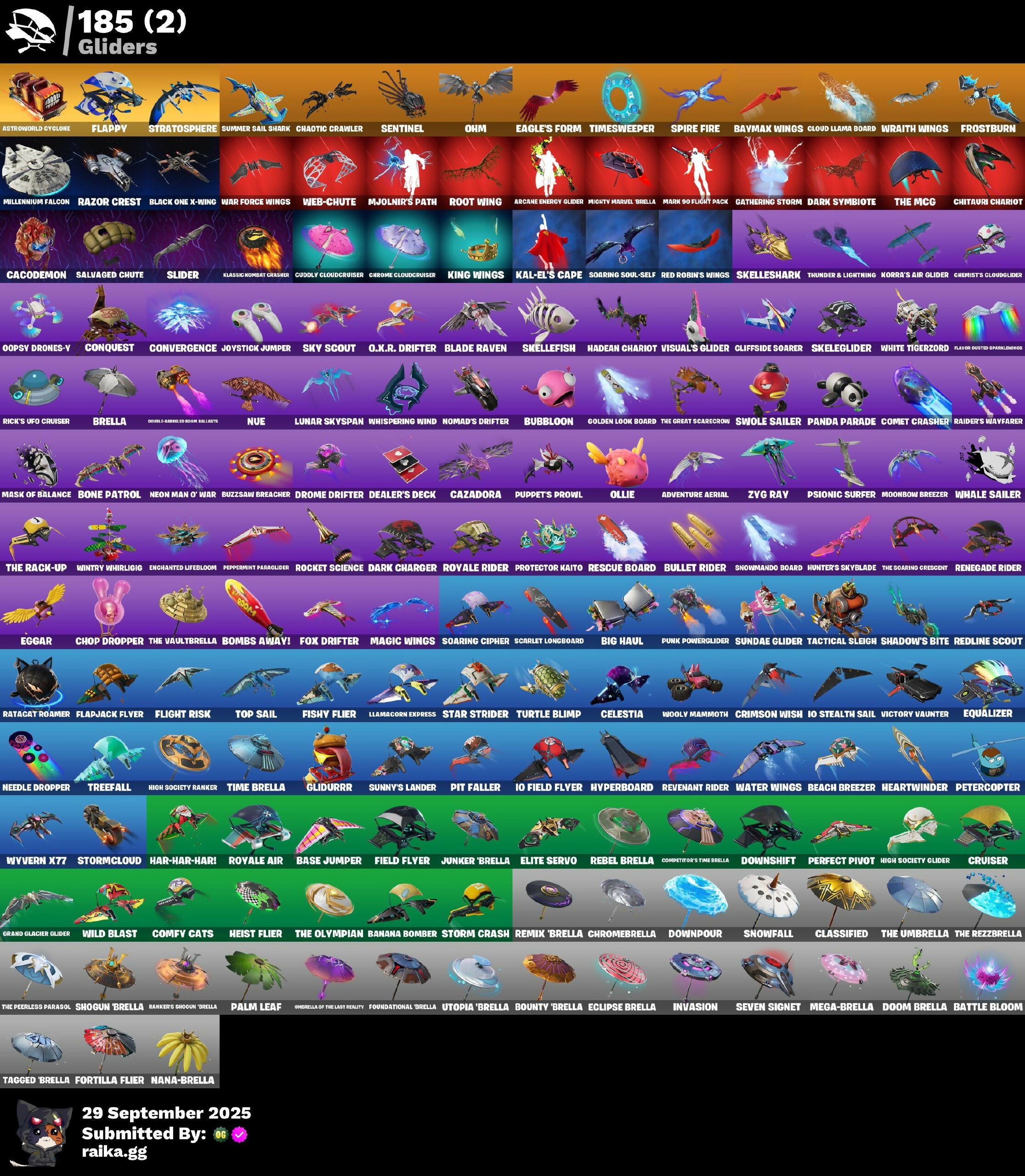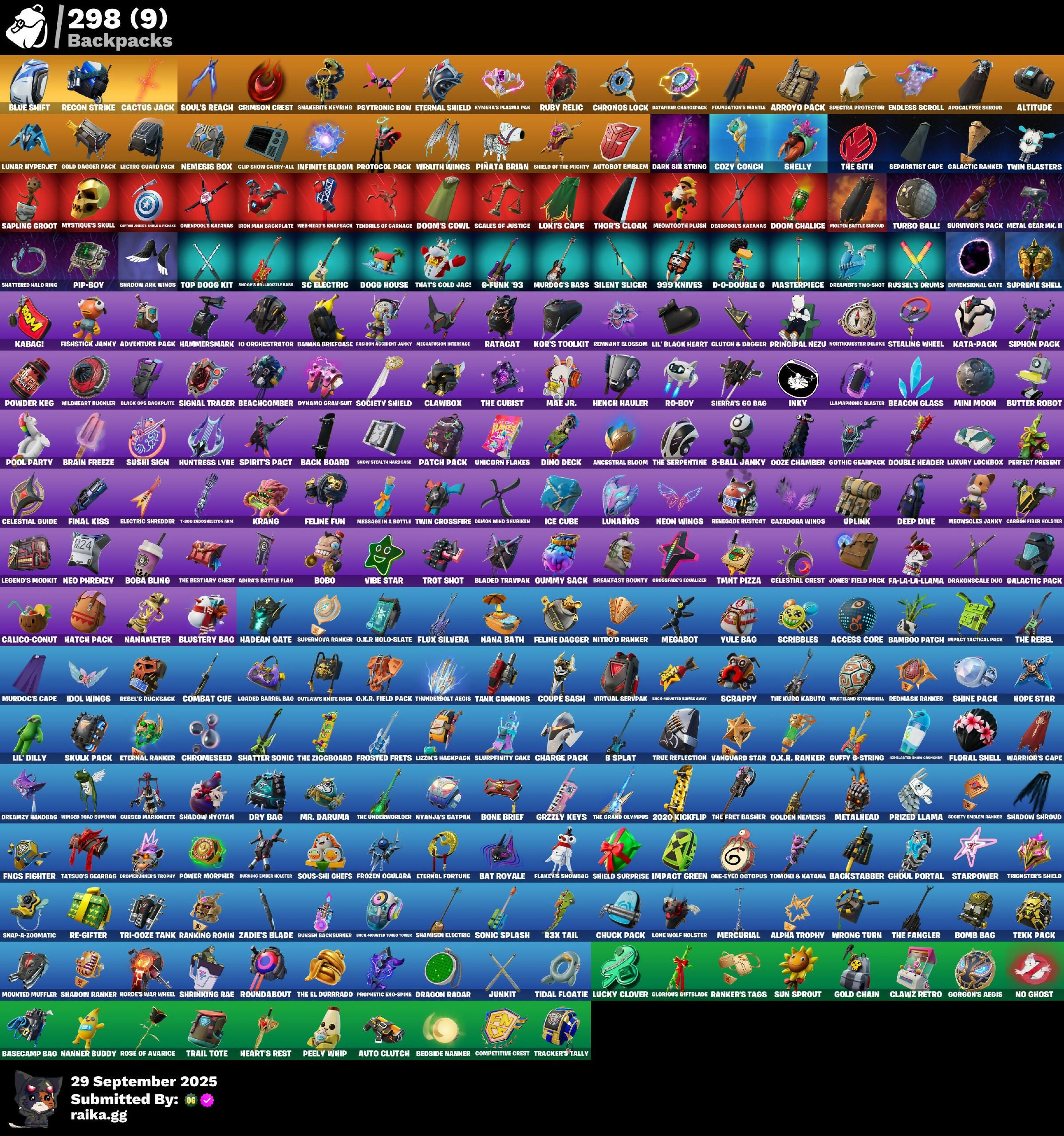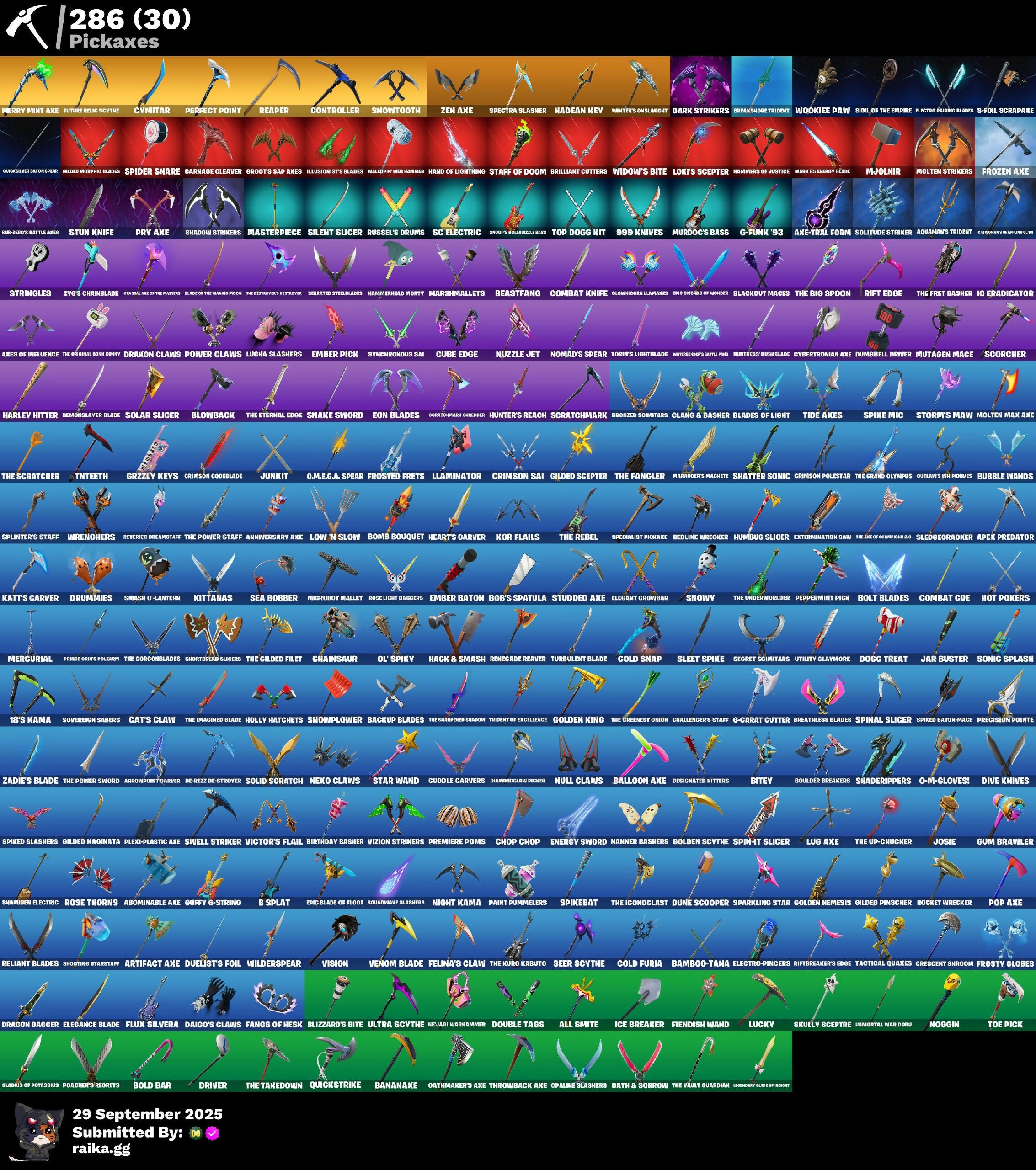 1-Ball, 18's Kama, 2020 Kickflip, 8-Ball Janky, 999 Knives, ASMR Keys, Abominable Axe, Access Core, Acolyte's Curse, Adira's Armor, Adira's Battle Flag, Adventure Aerial, Adventure Pack, Aerial Assault Bomber, Aerial Classic, Afterparty, Agent Jones, Agent Patch, Agent Peely, Air Shredder, All Might, All Smite, Alpha Trophy, Altitude, Amazing Cube, Ancestral Bloom, Andy Fangerison, Anniversary Axe, Antonia, Apex Predator, Aphrodite, Apocalypse Shroud, Aquaman's Trident, Arcane Energy Glider, Arcane Steel, Arctic Adeline, Arctic Camo, Ares, Arrowpoint Carver, Arroyo Pack, Artemis, Artifact Axe, Assassin's Mark, Astroworld Cyclone, Augury, Auntie Dot, Aura, Auto Clutch, Autobot Emblem, Avatar's Flourish, Axe-Trail Form, Axes Of Influence, B Splat, B-Splat, Back Board, Back-Mounted Bombs Alum, Back-Mounted Turbo Tower, Backstabber, Backup Blades, Balloon Axe, Bamboo Patch, Bamboo-Tana, Banana Bomber, Banana Briefcase, Bananaxe, Baron's Hoard, Base Jumper, Basecamp Bag, Bat Royale, Battle Blessing, Battle Bloom, Battle Call, Battle Gamer Mae, Baymax Wings, Beach Breezer, Beachcomber, Beacon Glass, Beamers, Bean Bag, Bear Hug, Beastfang, Beatzbunny, Bedside Nanner, Beep Beep, Behold!, Big Fan, Big Haul, Bike To Go, Billy Bounce, Birdie, Birthday Basher, Bitey, Black Leader, Black One X-Wing, Black Ops Backplate, Blackout Maces, Blade Of The Missing Moon, Blade Raven, Bladed Travpak, Blades Of Light, Blasted, Blizzabelle, Blizzard's Bite, Blowback, Blue Shift, Blue Striker, Blustery Bag, Bob's Spatula, Boba Bling, Bobo, Bold Bar, Bolt Blades, Bomb Bag, Bomb Bouquet, Bombs Away!, Bone Brief, Bone Patrol, Boogie Down, Boomin', Bootsin' Cats, Boulder Breakers, Bounty 'Brella, Brain Freeze, Breakfast Bounty, Breaking Point, Breakshore Trident, Breathless Blades, Breezabelle, Brella, Brilliant Cutters, Bring It, Bronzed Scimitars, Bubble Wands, Bubbloon, Bullet Rider, Bunsen Backburner, Burning Ember Holster, Burnoff, Bushie Bright, Butter Robot, Buttoned Up, Buzz Beat, Buzzsaw Breacher, Cacodemon, Cactus Jack, Calculated, Calico, Calico Holiday, Calico-Coconut, Call Me, Candy Cane, Cap Kick, Captain America’s Shield & Shield, Captain L America, Carbon & Gold, Carbon Fiber Holster, Carbon Scarlet, Card Drop, Cardistry, Carnage, Carnage Cleaver, Cat Flip, Cat's Claw, Cauldron Chill, Cazadora, Cazadora Wings, Celestia, Celestial Crest, Celestial Guide, Cerberus, Cerberus Bite, Chainsaur, Challenger's Staff, Champion Siren, Chaos Agent, Chaos Directive, Chaos Director, Chaos Origins, Chaotic Crawler, Charge Pack, Charlotte, Chemist's Cloudglider, Chic, Chicken Wing It, Chitauri Chariot, Choice Knit, Chop Chop, Chop Dropper, Chrome Cloudcruiser, Chrome Marked, Chrome Punk, Chromebrella, Chromeseed, Chronos Lock, Chuck Pack, Cimere, Clang & Basher, Clara, Classic Age, Classified, Clawbox, Clawz Retro, Clean Sweep, Cliffside Soarer, Clip Show Carry-All, Cloud Llama Board, Cloudburst, Cluck, Clucking Mad, Clutch & Dagger, Coin Flip, Cold Furia, Cold Snap, Combat Cue, Combat Knife, Comet Crasher, Comfy Cats, Competitive Crest, Competitor's Tire Brella, Conch Call, Conquest, Contour Camo, Controller, Convergence, Copines, Coral Crush, Corrosive Stripe, Count It!, Coupé Sash, Covert Cobalt, Cozy Commander, Cozy Conch, Cozy Jonesy, Crack It, Crescent Shroom, Crimson Codeblade, Crimson Crest, Crimson Polestar, Crimson Sai, Crimson Wish, Crossfade's Equalizer, Cruiser, Crystal Axe Of The Masters, Cs3 Contender I, Cs33 Contender I, Cube Assassin, Cube Edge, Cubed, Cuddle Carvers, Cuddle Hearts, Cuddle Mech, Cuddly Cloudcruiser, Curling Iron, Cursed Marionette, Cvmitar, Cybertronian Axe, Cyclo Curl, D-O-Double G, Daigo, Daigo's Claws, Daisies, Danica, Dark Angular Shift, Dark Charger, Dark Doggo, Dark Power Chord, Dark Six String, Dark Strikers, Dark Symbiote, Datafiber Chargepack, Daywalkers Kata, De-Rezz De-Stroyer, Deadpool, Deadpool's Katanas, Dealer's Deck, Deep Dab, Deep Dive, Deep Future, Demon Slayer Blade, Demon Wind Shuriken, Denim Destiny, Designated Hitters, Diamond Diva, Diamond Throne, Diamondclaw Picker, Dice Roll, Dimensional Camo, Dimensional Gate, Dino Deck, Dino Megazord, Disco, Dive Knives, Do The 'Split, Doctor Doom, Doctor Slone, Dogg House, Dogg Treat, Doom Brella, Doom Chalice, Doom's Cowl, Doombringer's Trophy, Double Header, Double Tags, Double-Barreled Boom Ballasts, Doublecross, Downpour, Downshift, Doze Dab, Dragon Dagger, Dragon Radar, Drakon Claws, Drakon Steel Hybrid, Drakonscale Duo, Dramatic Flares, Dreamer's Two-Shot, Dreamzy Handbag, Drift, Driver, Drome Drifter, Drummies, Dry Bag, Duelist's Foil, Dumbbell Driver, Dummy, Dune Scooper, Durrr Burger, Durrr Taisho, Dusk Knight, Dyna-Boom!, Dynamo Grill-Suit, Dynamo TNTina, Eagle's Form, Earthmover's Grappling Claw, Echo, Eclipse 'Brella, Education Janky, Eggar, Electric Shredder, Electro Fusion Blades, Electro-Pincers, Elegance Blade, Elegant Crowbar, Elite Servo, Elysium, Ember Baton, Ember Pick, Enchanted Lifebloom, Endless Scroll, Energy Sword, Eon Blades, Epic Blade Of Flood, Epic Swords Of Wonder, Equalizer, Era, Escapees, Eternal Fortune, Eternal Knight, Eternal Ranker, Eternal Renegade, Eternal Shield, Evasive Maneuvers, Extermination Saw, FNCS Fighter, Fa-La-La-Llama, Fabio Sparklemane, Fade, Falling Snow, Fang Dance, Fangs Of Hesk, Felina, Felina's Claw, Feline Dagger, Feline Fun, Festival Lace, Festive Paper, Field Flyer, Fiendish Wand, Final Eclipse, Final Harbinger, Final Kiss, Fish Thicc, Fishstick Janky, Fishy Flier, Fist Bump, Flakey The Snowbird, Flakey's Snowbag, Flaky Feast, Flapjack Flyer, Flappy, Flash Of Lightning, Flavor Dusted Sparklingdog, Flight Risk, Flippin' Away, Floral Shell, Flow, Flow Bones, Flux Silvera, Focus, Focused, Foil Flex, For Q.I.R!, Fort Knighted, Fortilla Flier, Foundation's Mantle, Foundational 'Brella, Fox Clan Leader, Fox Drifter, Front Page Pose, Frostburn, Frosted Frets, Frosty Globes, Frozen Axe, Frozen Oculura, Frozen Over, Fry Angles, Future Relic Scythe, G-Funk '93, G-Rat Cutt