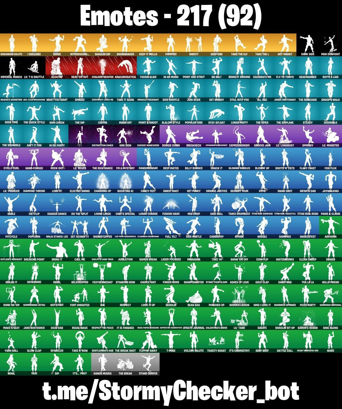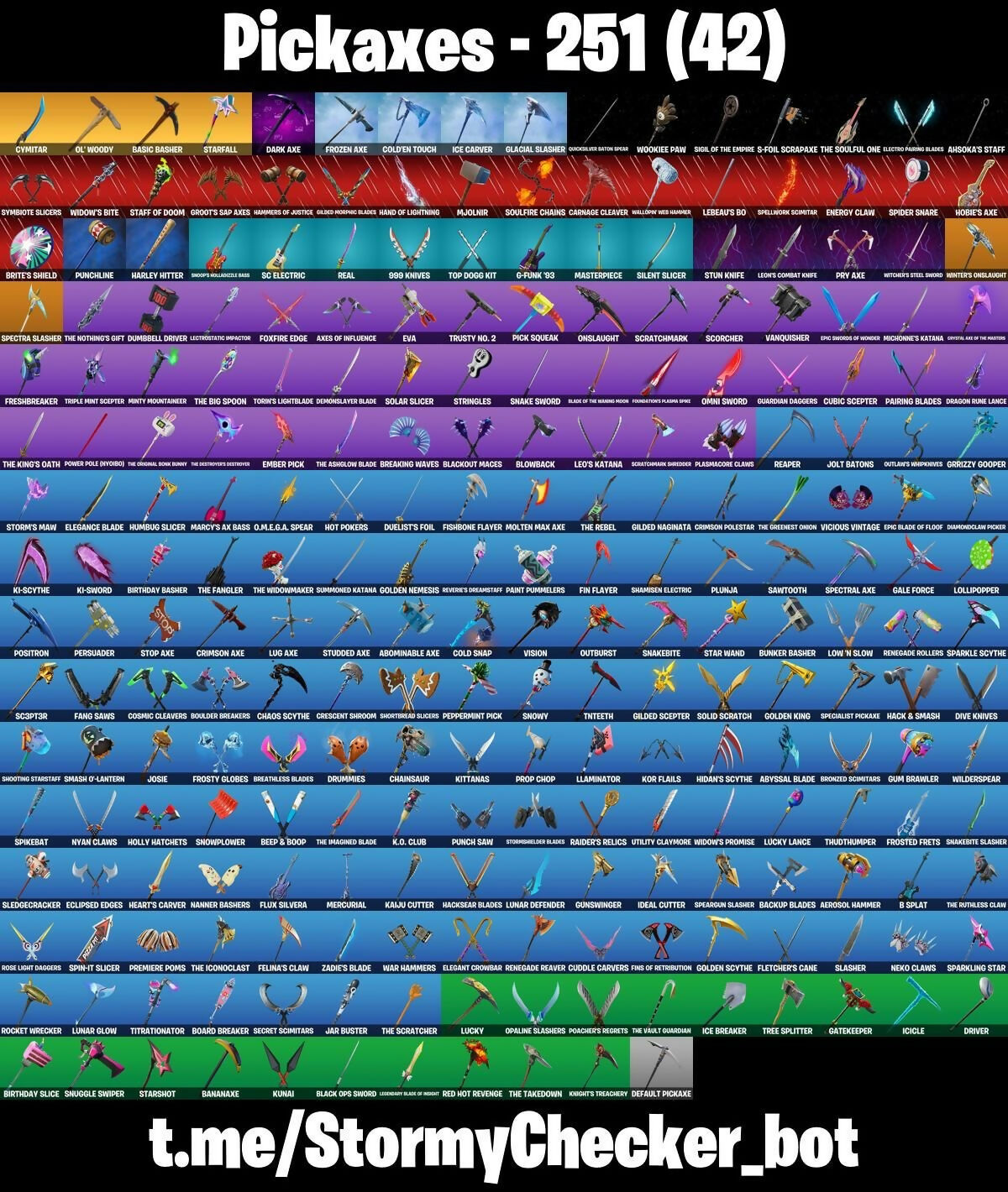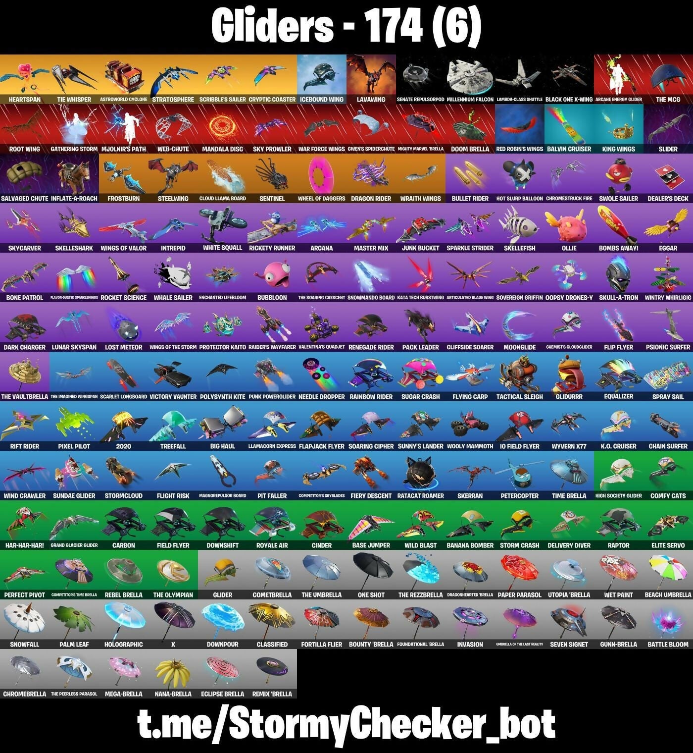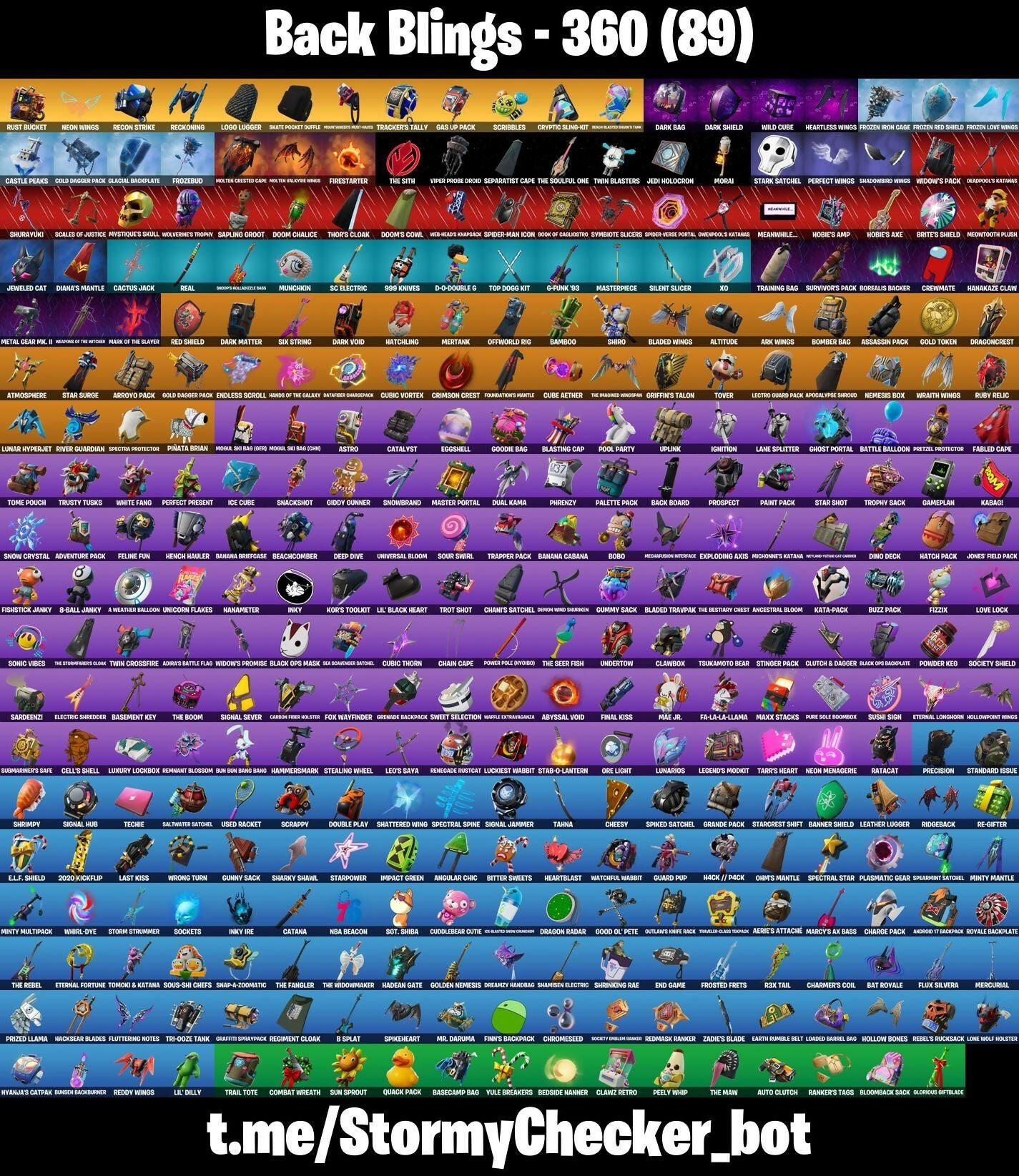 2020, 2020 Kickflip, 8-Ball Janky, 999 Knives, A Weather Balloon, Abominable Axe, Absenz, Abyssal Blade, Abyssal Void, Adeline, Adira, Adira's Battle Flag, Adventure Pack, Aerie's Attache, Aerosol Hammer, Afterparty, Agent Jones, Agent Peely, Ahsoka's Staff, Ain't It Fun, Air Horn, All Red, Altitude, Alto, Anakin Skywalker, Ancestral Bloom, Android 17, Android 17 Backpack, Andy Fangerson, Angular Chic, Ani Konda, Antonia, Apocalypse Shroud, Arachrobatics, Arcana, Arcane Energy Glider, Arctic Adeline, Arctic Assassin, Ark, Ark Wings, Arroyo Pack, Articulated Blade Wing, Ashes Of Love, Assassin Pack, Assault Trooper, Astro, Astroworld Cyclone, Atmosphere, Aura, Auto Clutch, Ava, Axes Of Influence, Ayida, Azuki, B Splat, B.R.U.T.E. Gunner, BB Belt, Back Board, Backup Blades, Balvin Cruiser, Bamboo, Banana Bomber, Banana Briefcase, Banana Cabana, Bananaxe, Bandoliette, Banner Shield, Baron's Hoard, Base Jumper, Basecamp Bag, Basement Key, Basic Basher, Bat Royale, Battle Balloon, Battle Bloom, Battle Call, Battlehawk, Beach Jules, Beach Umbrella, Beachcomber, Bean Bag, Bedside Nanner, Beep & Boop, Beep Beep, Beerus, Behold!, Benzo the Destroyer, Best Mates, Big Dill, Big Haul, Billy Bounce, Birdie, Birthday Basher, Birthday Slice, Bitter Sweets, Black Knight, Black One X-Wing, Black Ops Backplate, Black Ops Mask, Black Ops Sword, Black Widow Outfit, Blackout Maces, Blade Of The Waning Moon, Bladed Travpak, Bladed Wings, Blasting Cap, Blaze, Blizzard Bomber, Bloombax Sack, Blowback, Blowin' Up, Blowing Bubbles, Board Breaker, Bob Belcher, Bobo, Bolt, Bomber Bag, Bombs Away!, Bone Patrol, Bonejamin, Boogie Down, Book of Cagliostro, Boosting Ki, Boot It, Boots 'N' Cats, Borealis Backer, Boulder Breakers, Bounty 'Brella, Boxy, Boy's A Liar, Breaking Point, Breaking Waves, Breakneck, Breakpoint, Breathless Blades, Briar of the Thorn, Bring It, Bring It Around, Brite Bomber, Brite's Shield, Britestar, Bronzed Scimitars, Brutus, Bubbloon, Bullet Rider, Bullseye, Bun Bun Bang Bang, Bunker Basher, Bunny Brawler, Bunsen Backburner, Buzz Pack, Bytes, Cactus Jack, Call Me, Cammy, Caper, Captain Talon, Carbide, Carbon, Carbon Fiber Holster, Cardistry, Carnage Cleaver, Cassidy Quinn, Castle Peaks, Cat Flip, Catalyst, Catana, Celebrate Me, Celeste, Cell, Cell's Shell, Chain Cape, Chain Surfer, Chain's Satchel, Chainsaur, Champion Kyra, Champion Sparkplug, Chani, Chaos Scythe, Charge Pack, Charging Up, Charlotte, Charmer's Coil, Cheesy, Chef's Special, Chemist's Cloudglider, Chigusa, Choice Knit, Chrome Punk, Chromebrella, Chromeseed, Chromestruck Fire, Cinder, Classified, Clawbox, Clawz Retro, Clean Sweep, Cliffside Soarer, Clinical Grosser, Cloud Llama Board, Cluck, Clutch & Dagger, Codename E.L.F., Coffin, Coin Flip, Cold Dagger Pack, Cold Snap, Colden Touch, Combat Tech Jules, Combat Wreath, Comet, Cometbrella, Comfy Cats, Competitors Skyblades, Competitors Time Brella, Conjure Weapon, Cosma, Cosmic Cleavers, Covert Cobalt, Cozy Chomps, Crack It, Crackabella, Crescent Shroom, Crewmate, Crimson Axe, Crimson Crest, Crimson Polestar, Crowning Achievement, Crusher, Cryptic, Cryptic Coaster, Cryptic Sling-Kit, Crystal, Crystal Axe Of The Masters, Cube Aether, Cubic Scepter, Cubic Thorn, Cubic Vortex, Cuddle Carvers, Cuddle Hearts, Cuddlebear Cutie, Cyclo Curl, Cymitar, D-Double G, Dabstand, Dagger Dance, Dance Moves, Dark Axe, Dark Bag, Dark Bomber, Dark Charger, Dark Jonesy, Dark Matter, Dark Red Knight, Dark Shield, Dark Side, Dark Vanguard, Dark Void, Dark Voyager, Dark Wild Card, Darkheart, Darth Vader, Datafire Chargepack, Deadpool, Deadpool's Katanas, Deal 'Em Out, Dealer's Deck, Deep Dive, Deep End, Default Pickaxe, Delivery Diver, Demon Wind Shuriken, Demonslayer Blade, Denied, Desirable, Diamond Throne, Diamondclaw Picker, Diana's Mantle, Dice Roll, Diecast, Dino Deck, Dip, Distraction Dance, Dive Knives, Do The 'Split, Doctor Doom, Doctor Strange, Doom Brella, Doom Chalice, Doom's Cowl, Double Play, Down Arrow, Downpour, Downshift, Doze Dab, Dragon Radar, Dragon Rider, Dragon Rune Lance, Dragoncrest, Dragonhearted 'Brella, Dream, Dreamzy Handbag, Driver, Drummies, Dual Kama, Duelist's Card Trick, Duelist's Foil, Dumbbell Driver, Dummy, Dummy Supreme, Dunk On 'Em, Durr Taisho, Dusty Daredevil, Dynamic Dribbler, Dynamo Dancer, E.L.F. Shield, Eagle, Earth Rumble Belt, Eclipse Brella, Eclipsed Edges, Eggar, Eggshell, Electric Shredder, Electro Pairing Blades, Electro Swing, Elegance Blade, Elegant Crowbar, Eleven, Elite Agent, Elite Servo, Ellen Ripley, Elmira, Ember Pick, Enchanted Lifebloom, End Game, Endless Scroll, Energy Claw, Epic Blade Of Floof, Epic Swords Of Wonder, Equalizer, Erisa, Eternal Fortune, Eternal Longhorn, Eternal Voyager, Eva, Evasive Maneuvers, Everybody Loves Me, Evie, Exploding Axis, Expressionism, FFC Sparkplug, Fa-La-La-Llama, Fabio Sparklejam, Fabled Cape, Fancy Feet, Fang Saws, Fastball, Fearless (Tear-Glass Tech), Featherweight, Felina, Felina's Claw, Feline Fun, Festival Phaedra, Field Flyer, Fiery Descent, Fin Flayer, Final Kiss, Finesse Finisher, Finger Guns, Finn The Human, Finn's Backpack, Fins Of Retribution, Firestarter, Fireworks Team Leader, Fish Thicc, Fishbone Flayer, Fishstick, Fishstick Janky, Fixer, Fizzix, Flaky Feast, Flapjack Flyer, Flashback Breakdown, Flavor-Dusted Sparklings, Fletcher Kane, Fletcher's Cane, Flight Risk, Flip Flyer, Flippin' Away, Fluttering Notes, Flux Silvera, Fly To Tokyo, Flying Carp, Foil Flex, Formation Fighter, Fort Knighted, Fortilla Flier, Foundation's Mantle, Foundation's Plasma Spike, Foundational 'Brella, Fox Wayfinder, Foxfire Edge, Fresh Aura, Freshbreaker, Frostburn, Frosted Frets, Frosty Globes, Frozebud, Frozen Axe, Frozen Fishstick, Frozen Iron Cage, Frozen Love Ranger, Frozen Love Wings, Frozen Nog Ops, Frozen Raven, Frozen Red Knight, Frozen Red Shield, Full Tilt, Fusion! Hah!!, G-Funk '93, Galaxy Grappler, Gale Force, Game Knight, Gameplan, Gas Up Pack, Gatekeeper, Gathering Storm, Gear Specialist Maya, Geek Time, Ge