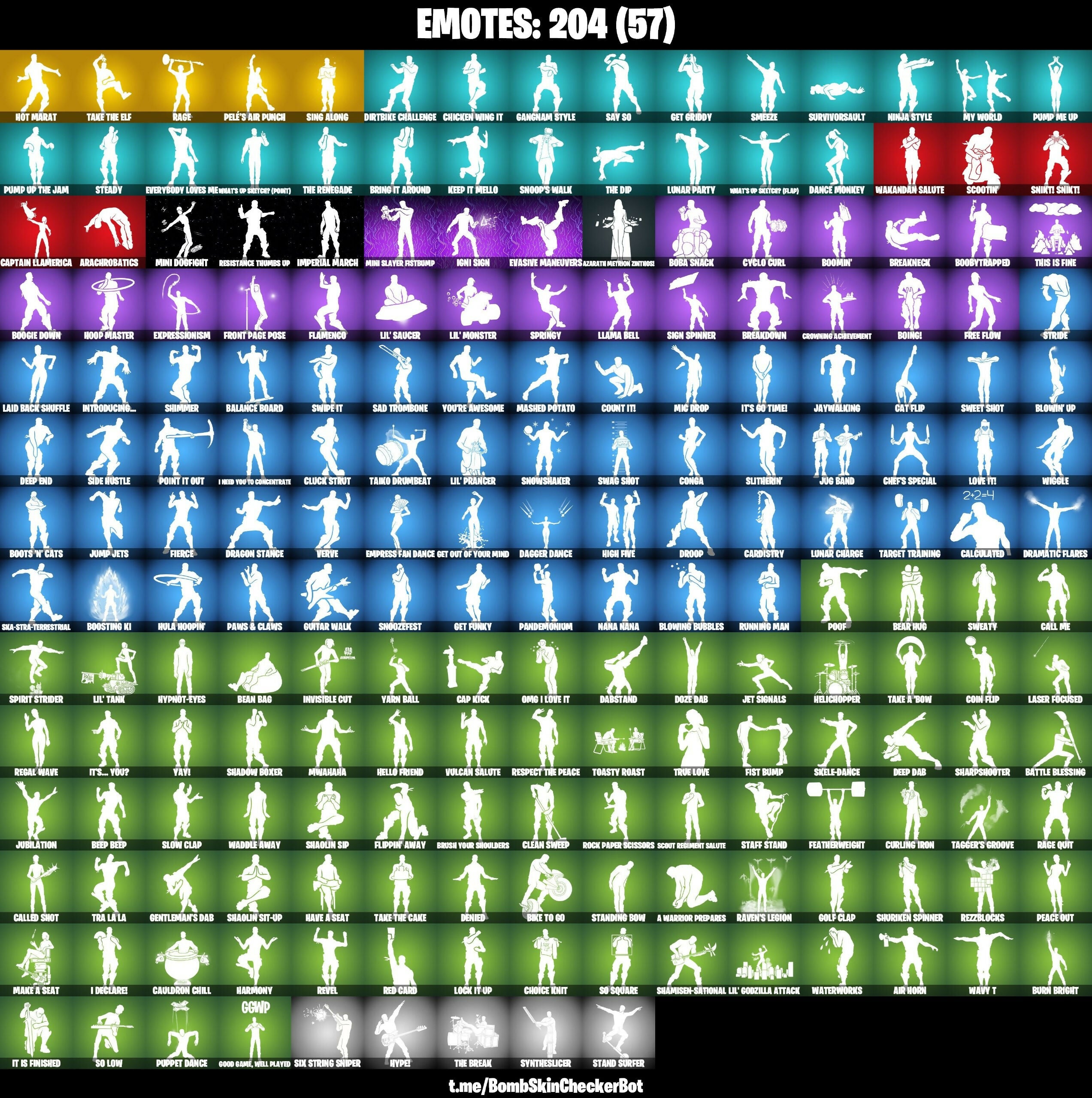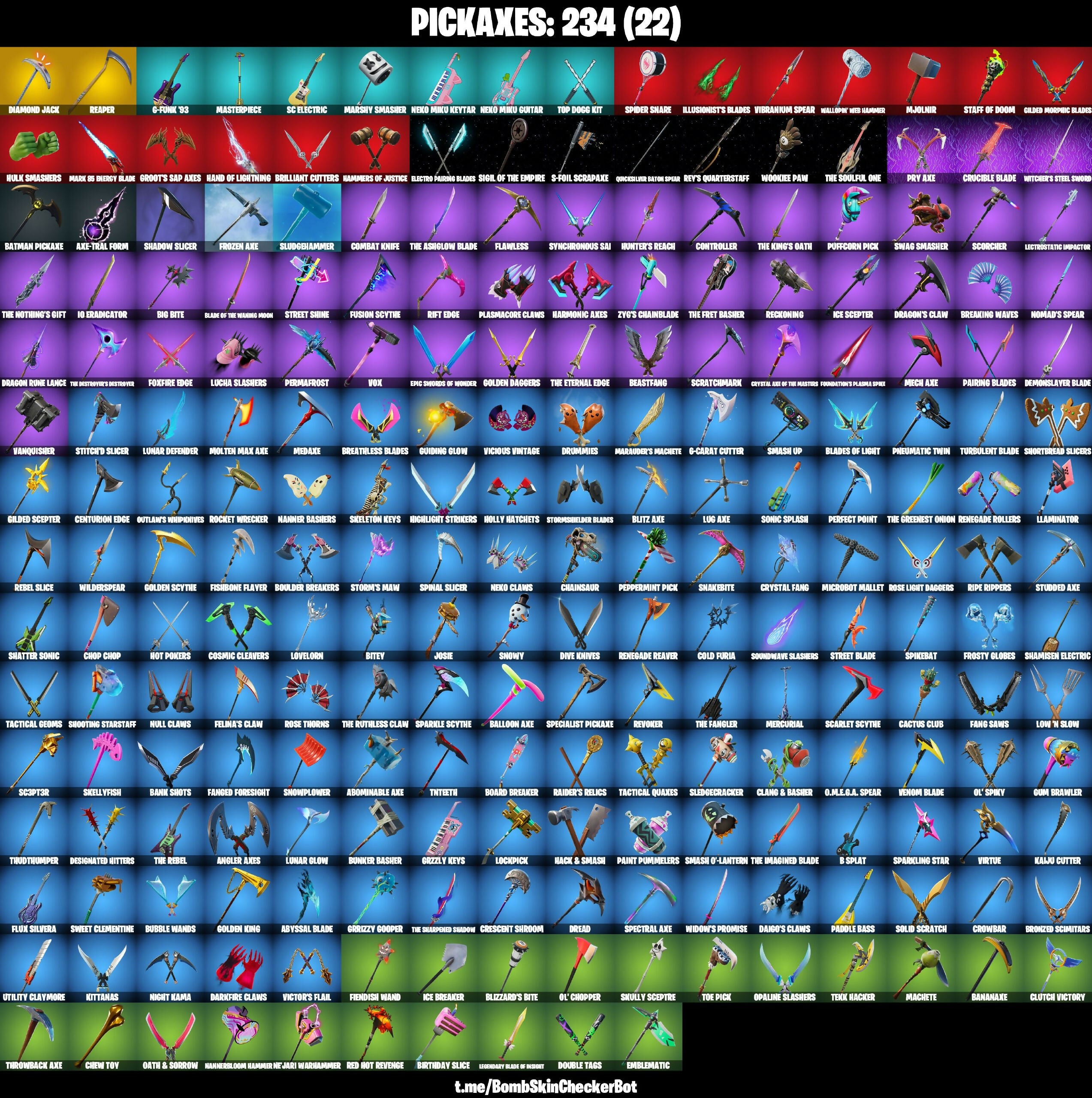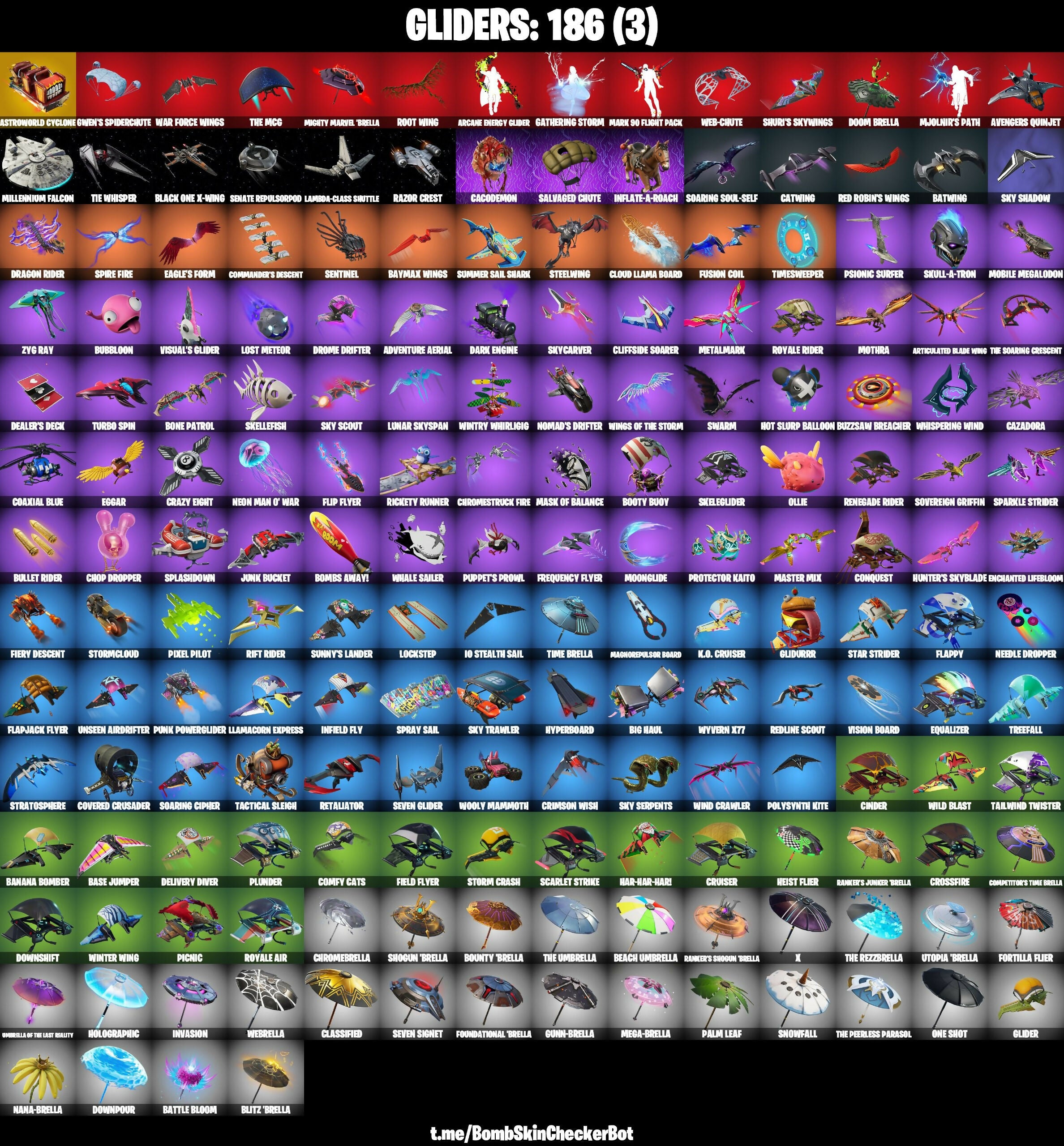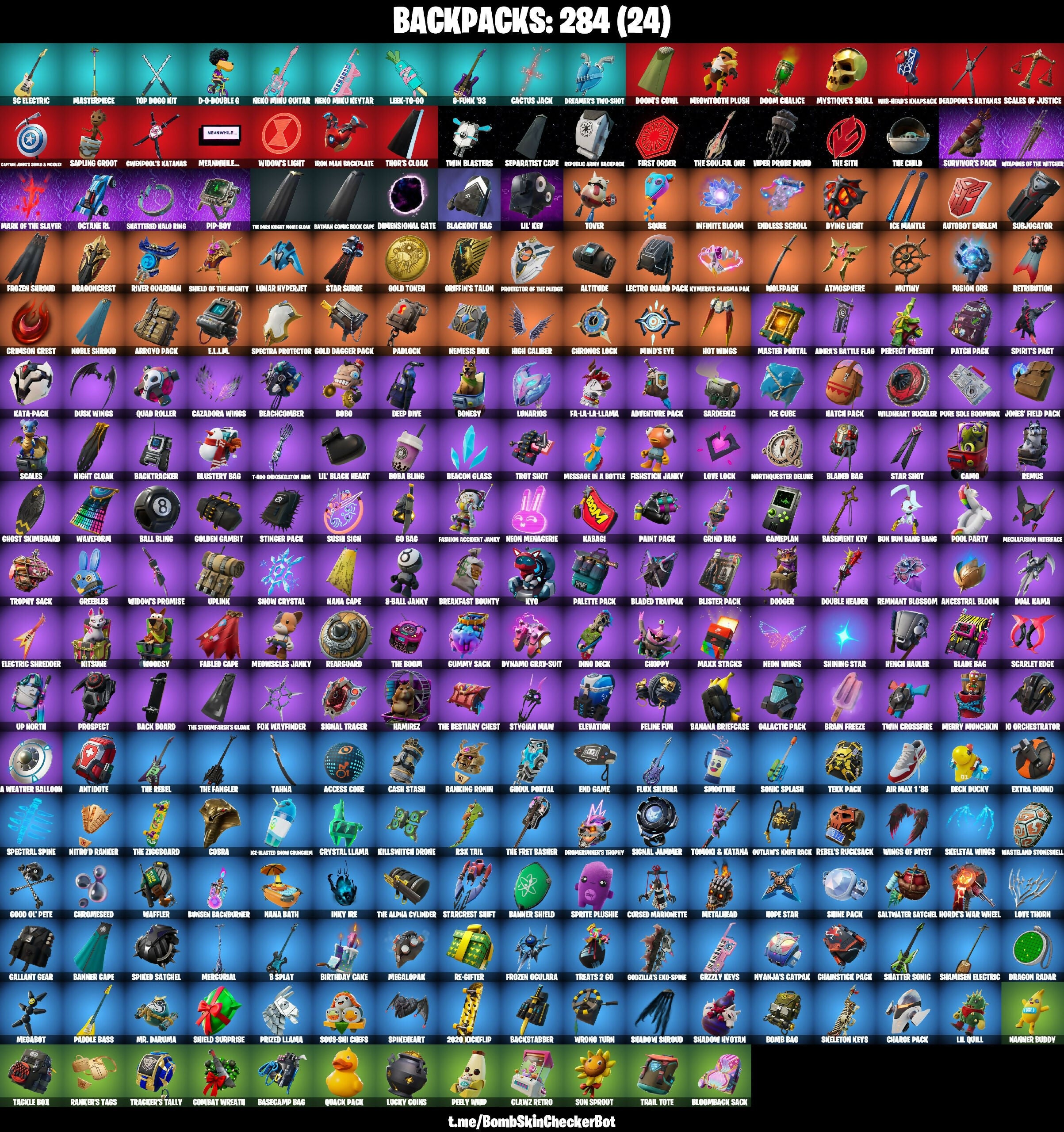 2020 Kickflip, 6-Carat Cutter, 8-Ball Janky, 8-Ball vs Scratch, A Warrior Prepares, A Weather Balloon, A.I.M., Abominable Axe, Absenz, Abyssal Blade, Access Core, Adira, Adira's Battle Flag, Adventure Aerial, Adventure Pack, Aerial Assault Bomber, Agent Jones, Agent Peely, Air Horn, Air Max 1 '86, Airie, Alli, Altitude, Ancestral Bloom, Angler Axes, Antidote, Arachrobatics, Arcane Energy Glider, Arctic Adeline, Arroyo Pack, Articulated Blade Wing, Astra, Astroworld Cyclone, Atmosphere, Autobot Emblem, Avengers Quinjet, Axe-Tral Form, Azarath Metrion Zinthos, B Splat, B-Splat, Back Board, Backstabber, Backtracker, Balance Board, Ball Bling, Balloon Axe, Banana Bomber, Banana Briefcase, Bananaxe, Bank Shots, Banner Cape, Banner Shield, Base Jumper, Basecamp Bag, Basement Key, Batman Comic Book Cape, Batman Comic Book Outfit, Batman Pickaxe, Battle Blessing, Battle Bloom, Batwing, Baymax Wings, Beach Umbrella, Beachcomber, Beacon Glass, Bean Bag, Bear Hug, Beastfang, Beep Beep, Big Bite, Big Haul, Bike To Go, Birdie, Birthday Cake, Birthday Slice, Bitey, Black One X-Wing, Black Window (Snow Suit), Blackheart, Blackout Bag, Blade Bag, Blade of the Waning Moon, Bladed Bag, Bladed TrayPak, Blades of Light, Blister Pack, Blitz 'Brella, Blitz Axe, Blitz Knight, Blizzabelle, Blizzard's Bite, Bloomback Sack, Blowin' Up, Blowing Bubbles, Blustery Bag, Board Breaker, Boba Bling, Boba Snack, Bobo, Boing!, Bomb Bag, Bombs Away!, Bone Patrol, Bonesy, Bonjamine, Boobytrapped, Boogeyman, Boogie Down, Boomin', Boosting Ki, Boots 'N' Cats, Booty Buoy, Boulder Breakers, Bounty 'Brella, Bracer, Brain Freeze, Breakdown, Breakfast Bounty, Breaking Waves, Breakneck, Breakpoint, Breathless Blades, Breezabelle, Brilliant Cutters, Bring It Around, Bronzed Scimitars, Brush Your Shoulders, Brutus (Fully Golden), Bubble Wands, Bubbloon, Bullet Rider, Bullseye, Bun Bun Bang Bang, Bunker Basher, Bunker Jonesy, Bunsen Backburner, Burn Bright, Buzzsaw Breacher, Bytes, Cacodemon, Cactus Club, Cactus Jack, Calamity, Calculated, Call Me, Called Shot, Cameo vs Chic, Camo, Cap Kick, Captain James Grab & Reglue, Captain Llamerica, Cardistry, Cash Stash, Cat Flip, Catalyst, Catwing, Cauldron Chill, Cazadora, Cazadora Wings, Centurion, Centurion Edge, Chainsaur, Charge Pack, Charlotte, Chauntstick Pack, Chef's Special, Chew Toy, Chicken Wing It, Choice Knit, Chop Chop, Chop Dropper, Choppy, Chrome Punk, Chromebrella, Chromeseed, Chromestruck Fire, Chronos Lock, Cinder, Clang & Basher, Classified, Clawz Retro, Clean Sweep, Cliffside Soarer, Clock Strut, Cloud Llama Board, Cloud Striker, Cluck, Clutch Victory, Coaxial Blue, Cobra, Coin Flip, Cold Furia, Combat Knife, Combat Wreath, Comfy Cats, Commander's Descent, Competitor's Time Brella, Conga, Conquest, Controller, Cosmic Cleavers, Count It!, Covered Crusader, Crazy Eight, Crescent Shroom, Crimson Crest, Crimson Wish, Crossfire, Crowbar, Crowning Achievement, Crucible Blade, Cruiser, Cryptic, Crystal, Crystal Axe of the Masters, Crystal Fang, Crystal Llama, Curling Iron, Cursed Marionette, Cyclo Curl, D-O-Double G, DJ Yonder, DJ-1000, Dabstand, Dagger Dance, Daigo, Daigo's Claws, Dance Monkey, Dark Engine, Darkfire Claws, Darth Vader, Deadpool, Deadpool's Katanas, Dealer's Deck, Deck Ducky, Deep Dab, Deep Dive, Deep End, Delivery Diver, Demi, Demonslayer Blade, Denied, Derby Dynamo, Designated Hitters, Diamond Diva, Diamond Jack, Dimensional Gate, Dino Deck, Dire, Dirtbike Challenge, Dive Knives, Dizzie, Doctor Doom, Doctor Sloane, Dodger, Doom Brella, Doom Chalice, Doom Slayer, Doom's Cow, Double Header, Double Tags, Downpour, Downshift, Doze Dab, Dragon Radar, Dragon Rider, Dragon Rune Lance, Dragon Stance, Dragon's Claw, Dragoncrest, Dramatic Flares, Dread, Dreamer's Two-Shot, Drift, Drift (Stage 5), Drome Drifter, Dromerunner's Trophy, Droop, Drummies, Dual Kama, Dummy, Durrr Taisho, Dusk, Dusk Wings, Dusty, Dying Light, Dynamo Grav-Suit, E.L.I.M., Eagle's Form, Eggar, Electric Shredder, Electro Pairing Blades, Elevation, Ember, Emblematic, Empress Fan Dance, Enchanted Lifebloom, End Game, Endless Scroll, Enforcer, Epic Swords of Wonder, Equalizer, Era, Eternal Voyager, Evasive Maneuvers, Everybody Loves Me, Evie, Explorer Emilie, Expressionism, Extra Round, Fa-La-La-Llama, Fable, Fabled Cape, Fang Saws, Fanged Foresight, Fashion Accident Janky, Featherweight, Felina, Felina's Claw, Feline Fun, Field Flyer, Fiendish Wand, Fierce, Fiery Descent, First Order, Fishbone Flayer, Fishstick Janky, Fishstick World Cup, Fishtaich World Cup, Fist Bump, Flamenco, Flapjack Flyer, Flappy, Flawless, Flip Flyer, Flippin' Away, Flux Silvera, Fortilla Flier, Foundation's Plasma Spear, Foundational 'Brella, Fox Wayfinder, Foxfire Edge, Free Flow, French Hauler, Frequency Flyer, Front Page Pose, Frost Squad, Frosty Globes, Frozen Axe, Frozen Oculabra, Frozen Shroud, Fusion, Fusion Coil, Fusion Scythe, G-Funk '93, Galactic Pack, Gallant Gear, Gameplan, Gangnam Style, Gathering Storm, Gear Specialist Maya, Gentleman's Dab, Geralt of Rivia, Get Funky, Get Griddy, Get Out Of Your Mind, Ghost Skimboard, Ghoul Portal, Giddy-Up, Gilded Morphic Blades, Gilded Scepter, Glider, Glurrrr, Go Bag, Godzilla Evolved, Godzilla's EXO-Spine, Gold Dagger Pack, Gold Token, Golden Daggers, Golden Gambit, Golden King, Golden Scythe, Golf Clap, Good Game, Well Played, Good Ol' Pete, Greebles, Griffin's Talon, Grind Bag, Grizz, Grizzly Gooper, Grizzly Keys, Groot, Groot's Sap Axes, Guff Gringle, Guggimon, Guiding Glow, Guitar Walk, Gum Brawler, Gumbo, Gumi-Brella, Gummy Sack, Gwen's Spiderchute, Gwenpool's Katanas, Hack & Smash, Hamirez, Hammers of Justice, Hand of Lightning, Har-Har-Har!, Harlowe, Harmonic Axes, Harmony, Haruka of the Masks, Hatch Pack, Have A Seat, Haven, Heist Flier, Helichopper, Hello Friend, Helsie, Hero Baymax, High Caliber, High Five, Highlight Strikers, Highwire, Holly Hatchets, Holographic, Hoop Master, Hope Star, Horde's War Wheel, Hot Marat, Hot Pokers, Hot Slurp Balloon, Hot Wings, Hula 
