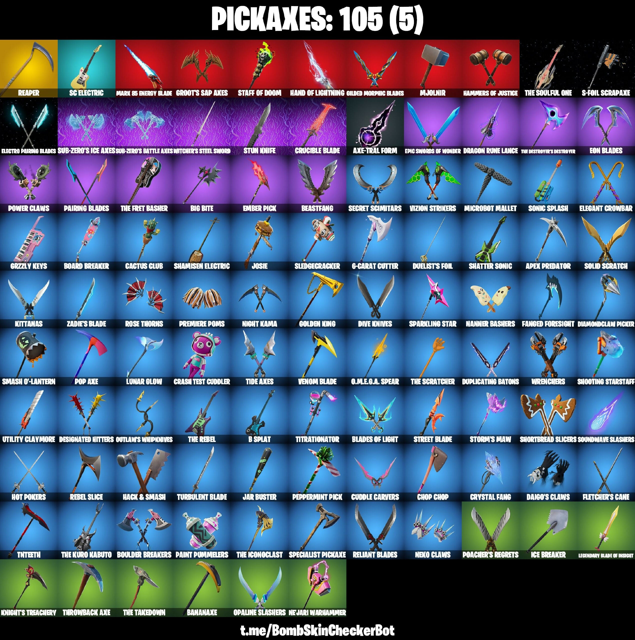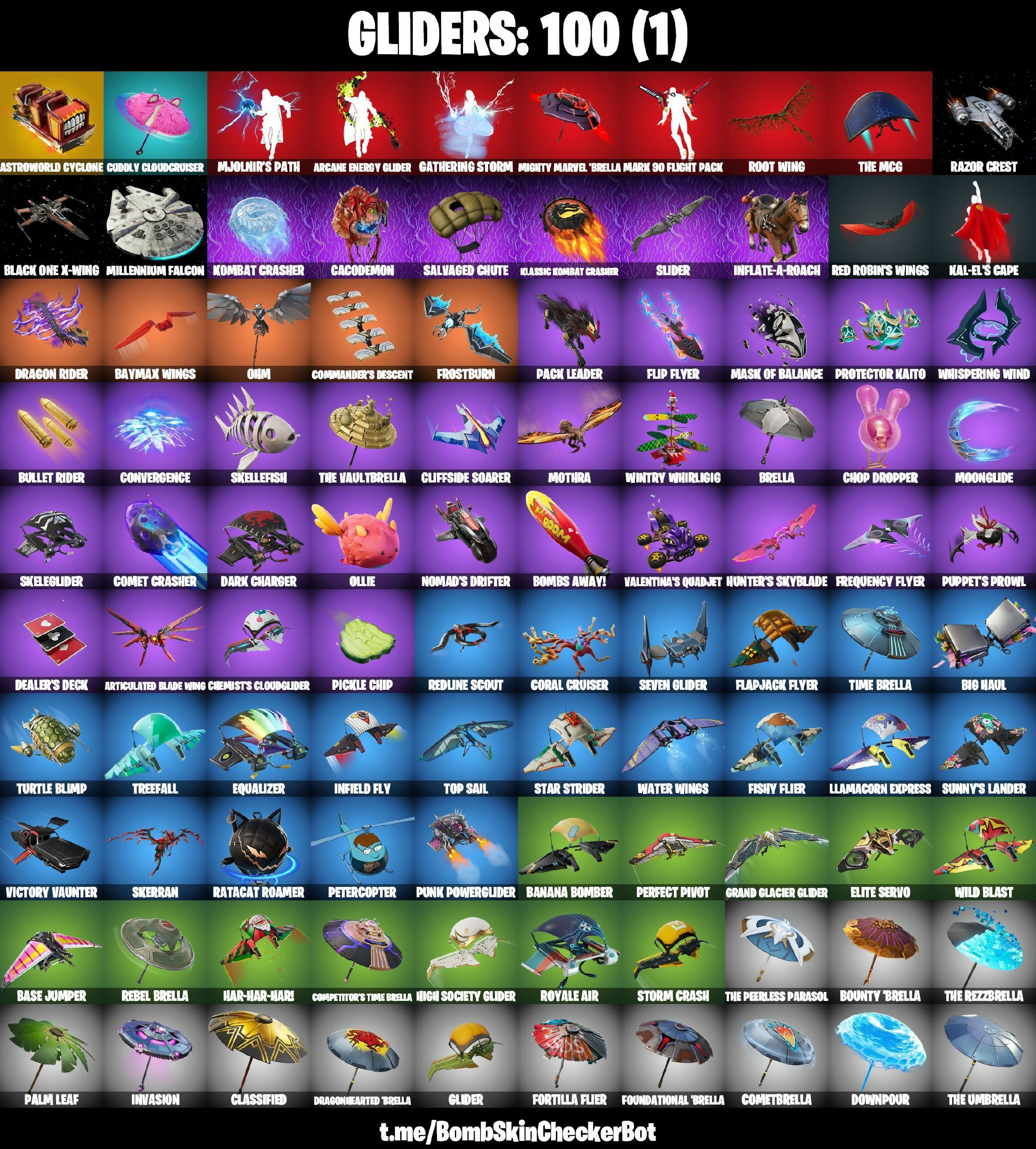 6-Carat Cutter, Adira, Agent Peely, Air Shredder, Apex Predator, Arcane Energy Glider, Arctic Adeline, Articulated Blade Wing, Astro Jack, Astroworld Cyclone, Aura, Axe-tral Form, B Splat, Balance Board, Banana Bomber, Bananaxe, Baron's Hoard, Base Jumper, Battle Blessing, Baymax Wings, Bear Hug, Beastfang, Beep Beep, Big Bite, Big Dill, Big Haul, Bike To Go, Billy Bounce, Black One X-Wing, Blades Of Light, Blitz Knight, Blowin' Up, Board Breaker, Boba Snack, Bombs Away!, Boogie Down, Boomin', Boulder Breakers, Bounty Brella, Brella, Brutus, Bullet Rider, Cacodemon, Cactus Club, Call Me, Card Drop, Cassidy Quinn, Chemist's Cloudglider, Chop Chop, Chop Dropper, Classified, Clean Sweep, Cliffside Soarer, Coin Flip, Comet Crasher, Cometbrella, Commander's Descent, Commando, Competitor's Time Brella, Convergence, Coral Cruiser, Crash Test Cuddler, Crowning Achievement, Crucible Blade, Crystal Fang, Cuddle Carvers, Cuddly Cloudcruiser, Daigo, Daigo's Claws, Dark Charger, Deadpool, Dealer's Deck, Deep Dab, Designated Hitters, Diamond Diva, Diamond Throne, Diamondclaw Picker, Dive Knives, Dizzie, Doctor Doom, Doom Slayer, Downpour, Doze Dab, Dragon Rider, Dragon Rune Lance, Dragonhearted Brella, Dream Feet, Duelist's Card Trick, Duelist's Foil, Duplicates, Duplicating Batons, Dusty, Electro Pairing Blades, Elegant Crowbar, Elite Servo, Ember Pick, Eon Blades, Epic Swords Of Wonder, Equalizer, Evie, Fade, Fanged Foresight, Feelin' Jaunty, Fishy Flier, Fist Bump, Flapjack Flyer, Fletcher Kane, Fletcher's Cane, Flip Flyer, Flippin' Away, Foil Flex, Fortilla Flier, Foundational 'Brella, Frequency Flyer, Frostburn, Frozen Treat Cart, Gathering Storm, Gear Specialist Maya, Gentleman's Dab, Geralt of Rivia, Ghoul Trooper, Gilded Morphic Blades, Glider, Godzilla Evolved, Golden King, Golf Clap, Grand Glacier Glider, Groot, Groot's Sap Axes, Grzzly Keys, Guggimon, Hack & Smash, Hammers Of Justice, Hand Of Lightning, Har-Har-Hari, Have A Seat, Head Banger, Hello Friend, Helsie, Hero Baymax, High Society Glider, Holiday Boxy, Hope, Hot Marat, Hot Pokers, Hunter's Skyblade, Hype!, Hypnot-Eyes, I Declare!, I'm A Mystery, Ice Breaker, Igni Sign, Infield Fly, Inflate-A-Roach, Invasion, Invisible Cut, Iris, It's Chemistry!, Jade, Jar Buster, Jennifer Walters, Jet Signals, Joey, Josie, Joss, Jules, Kal-El's Cape, Keisha Cross, Kendo, Keyed Up, Kit, Kittanas, Klassic Kombat Crasher, Knife Sharpener, Knight's Treachery, Kombat Crasher, Kymera, Legendary Blade Of Insight, Lil' Godzilla Attack, Lil' Prancer, Lil' Saucer, Llamacorn Express, Lock It Up, Lt. Evergreen, Lunar Glow, Lunar Party, Mancake, Mandalorian, Mark 85 Energy Blade, Mark 90 Flight Pack, Mask of Balance, Massai, Mave, Meowscles, Microbot Mallet, Midas (Fully Golden), Midas' Shadow, Mighty Marvel 'Brella, Millennium Falcon, Mini Dogfight, Mini Slayer Fistbump, Mjolnir, Mjolnir's Path, Montague, Moonglide, Mothra, Mystique, Nanner Bashers, Ne'jari Warhammer, Neko Claws, Nezumi, Night Kama, Ninja Stance Donnie, Ninja Stance: Leo, Ninja Stance: Mikey, Ninja Stance: Raph, Nisha, Nomad's Drifter, Nyanja, O.M.E.G.A. Spear, Ocean, Ohm, Ollie, Opaline Slashers, Oscar, Outlaw Midas, Outlaw's Mugshot, Outlaw's Strut, Outlaw's Whipknives, Pack Leader, Paint Pummellers, Pairing Blades, Palm Leaf, Pandemonium, Paws & Claws, Peppermint Pick, Perfect Pivot, Peter Griffin, Petercopter, Pickle Chip, Planetary Vibe, Poacher's Regrets, Poised Playmaker, Pop Axe, Power Claws, Premiere Poms, Protector Kaito, Pull Up, Punk Powerglider, Puppet Dance, Puppet's Prowl, Ratacat Roamer, Raven's Legion, Razor Crest, Reaper, Rebel Brella, Rebel Slice, Red Robin's Wings, Redline Scout, Reese, Regal Wave, Reliant Blades, Respect The Peace, Revel, Rollie, Root Wing, Rose Thorns, Royale Air, Ruby, Runway Racer, S-foil Scrapaxe, Salvaged Chute, Sc Electric, Scootin, Scuba Jonesy, Secret Scimitars, Seeker, Selene, Seven Glider, Shadow Blade Hope, Shamisen Electric, Shamisen-Sational, Shatter Sonic, Shooting Starstaff, Shortbread Slicers, Show 'Em Off, Side Hustle, Sing Along, Siona, Ska-Stra-Terrestrial, Skeleglider, Skellefish, Skerran, Skye, Sledgecracker, Slider, Slow Clap, Smash O'-Lantern, Smooth Moves, Snap, Snowshaker, So Square, Social Climber, Solid Scratch, Solid Snake, Sonic Splash, Soundwave Slashers, Sparkling Star, Specialist Pickaxe, Spirit Strider, Springy, Staff Of Doom, Star Strider, Storm, Storm Crash, Storm's Maw, Stormy, Street Blade, Stun Knife, Sub-Zero (MK3), Sub-zero's Battle Axes, Sub-zero's Ice Axes, Sunny, Sunny's Lander, Surfin' Bird, Tagger's Groove, Take A Bow, Take The Cake, The Ageless, The Break, The Destroyer's Destroyer, The Fret Basher, The Iconoclast, The Kuro Kabuto, The MCG, The Night Rose, The Peerless Parasol, The Rebel, The Rezzbrella, The Scratcher, The Soulful One, The Takedown, The Umbrella, The Vaultbrella, Thor, Throwback Axe, Tide Axes, Time Brella, Tippy Tap, Titranationator, Tnteeth, Tntina, Tony Stark, Top Sail, Travis Scott, Treefall, Turbulent Blade, Turtle Blimp, Twist, Utility Claymore, Valentina, Valentina's Quadjet, Valentina's Verve, Valeria, Vengeance Jones, Venom Blade, Verve, Victory Vaunter, Vizion Strikers, Vulcan Salute, Water Wings, Whispering Wind, Wiggle, Wild Blast, Winterfest Bushranger, Wintry Whirligig, Witcher's Steel Sword, Wolverine, Wooly Warrior, Wrenchers, Yarn Ball, Yay!, Yellowjacket, Zadie's Blade