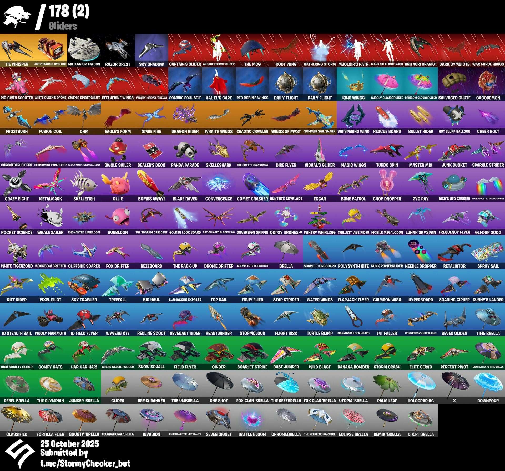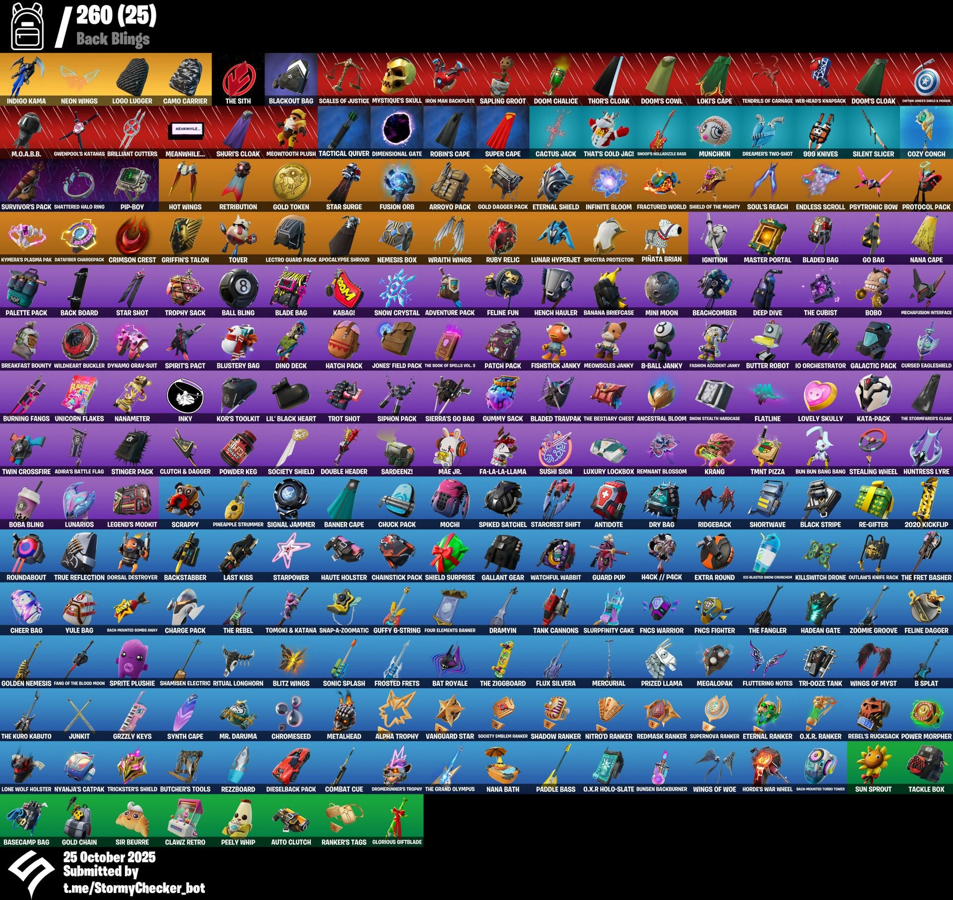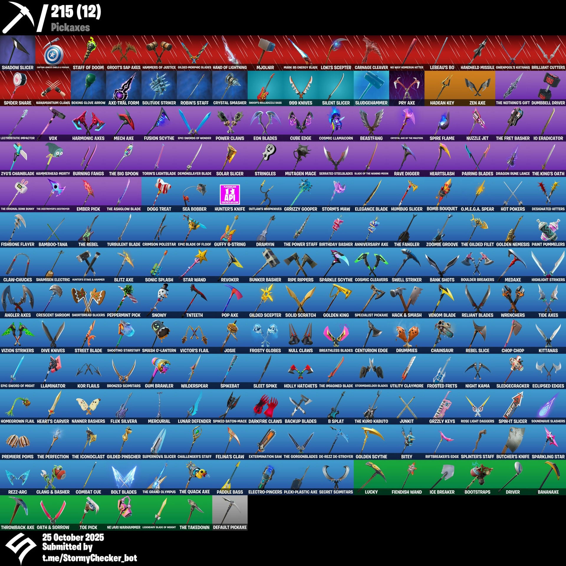 (Snikt!), 1-Ball, 10 Orchestrator, 2020 Kickflip, 8-Ball Janky, 8-Ball Vs Scratch, 999 Knives, A Warrior Prepares, Absolute Zero, Adira, Adira's Battle Flag, Adventure Pack, Aftermath, Afterparty, Agent Jones, Agent Peely, Air Shredder, All I Want For Christmas Is You, Alpha Trophy, Ancestral Bloom, Angler Axes, Anniversary Axe, Antidote, Antonia, Apocalypse Shroud, Aracharobatics, Arcane Energy Glider, Arcane Research, Arctic Adeline, Arctic Assassin, Arroyo Pack, Articulated Blade Wing, Astroworld Cyclone, Athleisure Assassin, Aura, Auto Clutch, Axe-Tral Form, Azarath Metrion Zinthos!, B Splat, Bachi, Back Board, Backstabber, Backup Blades, Ball Bling, Bamboo-Tana, Banana Bomber, Banana Briefcase, Bananaxe, Bank Shots, Banner Cape, Base Jumper, Basecamp Bag, Bat Royale, Bat Signal, Battle Bloom, Beachcomber, Bean Bag, Beastfang, Beatzbunny, Beep Beep, Big Haul, Bike To Go, Billy Bounce, Birdarang Flourish, Birdie, Birthday Basher, Bitey, Black Stripe, Blackout Bag, Blade Bag, Blade Raven, Blade of the Waning Moon, Bladed Bag, Bladed Travpak, Blinding Lights, Blitz Axe, Blitz Knight, Blitz Wings, Blowin' Up, Blowing Bubbles, Blustery Bag, Boba Bling, Bobo, Boing!, Bolt Blades, Bomb Bouquet, Bombs Away!, Bone Patrol, Boogie Down, Boomin', Boots 'N' Cats, Bootstraps, Boulder Breakers, Bounty 'Brella, Boxing Glove Arrow, Bracer, Breakfast Bounty, Breakneck, Breakpoint, Breathless Blades, Brella, Brilliant Cutters, Bronzed Scimitars, Brs22-Showdown-Zet, Brutus, Bubloon, Bullet Rider, Bun Bun Bang Bang, Bunker Basher, Bunker Jonesy, Bunsen Backburner, Burning Fangs, Business Hips, Butcher's Knife, Butcher's Tools, Butter Robot, Bytes, C'Mere, Cacodemon, Cactus Jack, California Love, Call Me, Cameo Vs Chic, Camo Carrier, Captain America's Shield & Pouch, Captain Jones, Captain Llamerica, Captain's Glider, Cardistry, Carnage, Carnage Cleaver, Catalyst, Cauldron Chill, Centurion, Centurion Edge, Chainsaur, Chainstick Pack, Challenger's Staff, Chaos Director, Chaos Origins, Chaotic Crawler, Charge Pack, Charlotte, Cheer Bag, Cheer Bolt, Chemist's Cloudglider, Chigusa, Chillest Vibe Rider, Chitauri Chariot, Chop Chop, Chop Dropper, Chrome Punk, Chromebrella, Chromeseed, Chromestruck Fire, Chuck Pack, Cinder, Clang & Basher, Classified, Claw-Chucks, Clawz Retro, Clean Sweep, Cliffside Soarer, Cluck, Cluck Strut, Clutch, Clutch & Dagger, Coffin, Coin Flip, Combat Cue, Comet Crasher, Comfy Cats, Competitor's Skyblades, Competitor's Time Brella, Contract Giller, Convergence, Cosmic Cleavers, Cosmic Llamacorn, Cozy Conch, Crack It, Crazy Eight, Crescent Shroom, Crimson Crest, Crimson Polestar, Crimson Wish, Crowning Achievement, Crystal, Crystal Axe of the Masters, Crystal Smasher, Cube Assassin, Cube Edge, Cuddly Cloudcruiser, Curling Iron, Cursed Eagleshield, Cyclo Curl, Dabstand, Daily Flight, Dance Moves, Dare, Dark Symbiote, Darkfire Claws, Datafiber Chargepack, De-Rezz De-Stroyer, Deadpool, Dealer's Deck, Deep Dab, Deep Dive, Default Pickaxe, Demi, Demon Slayer Blade, Designated Hitters, Desirable, Dice Roll, Dieselback Pack, Dimensional Gate, Dino Deck, Dip, Dire Flyer, Dirtbike Challenge, Dive Knives, Dizzie, Doctor Doom, Doctor Slone, Dogg Treat, Dombbell Driver, Doom Chalice, Doom's Cloak, Doom's Cowl, Dorsal Destroyer, Double Header, Double-Barreled Boom Ballasts, Downpour, Doze Dab, Dragon Rider, Dragon Rune Lance, Dramyin, Dreamer's Two-Shot, Driver, Drome Drifter, Dromerunner's Trophy, Droop, Drummies, Dry Bag, Dummy Supreme, Dynamo Dancer, Dynamo Grav-Suit, Dynamo Tntina, Eagle, Eagle's Form, Echo, Eclipse Brella, Eclipsed Edges, Eggar, Electro-Pincers, Electrostatic Impactor, Elegance Blade, Elite Servo, Ember Pick, Emma Frost, Enchanted Lifebloom, Endless Scroll, Envoy, Eon Blades, Epic Blade of Floof, Epic Sword of Might, Epic Swords of Wonder, Eternal Knight, Eternal Ranker, Eternal Shield, Evasive Maneuvers, Evie, Extermination Saw, Extra Round, FNCS Fighter, FNCS Warrior, Fa-La-La-Llama, Fabio Sparklemane, Face Palm, Fade, Fang Of The Blood Moon, Fashion Accident Janky, Fast Feet, Featherweight, Felina, Felina's Claw, Feline Dagger, Feline Fun, Field Flyer, Fiendish Wand, Fish Thicc, Fishbone Flayer, Fishstick Janky, Fishy Flier, Flaky Feast, Flapjack Flyer, Flatline, Flavour-Dusted Sparklwings, Flight Risk, Flippin' Away, Fluttering Notes, Flux Silvera, Focus, Foil Flex, Fortilla Flier, Foundational 'Brella, Four Elements Banner, Fox Clan 'Brella, Fox Drifter, Fractured World, Frequency Flyer, Frostburn, Frosted Frets, Frosty Globes, Fusion, Fusion Coil, Fusion Orb, Fusion Scythe, Galactic Pack, Galaxia, Gallant Gear, Gathering Storm, Gear Specialist Maya, Geek Time, Gilded Morphic Blades, Gilded Pinscher, Gilded Scepter, Gli-Dar 3000, Glider, Glitter, Glorious Giftblade, Go Bag, Gold Chain, Gold Dagger Pack, Gold Token, Golden King, Golden Look Board, Golden Nemesis, Golden Scythe, Good Sportsmanship, Grand Glacier Glider, Graveheart, Green Arrow, Griffin's Talon, Grind, Grizzly Gooper, Grizzly Keys, Groot, Groot's Sap Axes, Groove Destroyer, Ground Pound, Grriz, Grzzly Keys, Guard Pup, Guerrera Colorada, Guffy 6-String, Guggimon, Gum Brawler, Gumbo, Gummy Sack, Gwen's Spiderchute, Gwen-Step, Gwenpool, Gwenpool's Katanas, H4ck // P4ck, Hack & Smash, Hadean Gate, Hadean Key, Hammerhead Morty, Hammers of Justice, Hand of Lightning, Hand-Forged, Handheld Missile, Har-Har-Har!, Harlowe, Harmonic Axes, Hatch Pack, Haute Holster, Haven, Haylee Skye, Haze, Heart's Carver, Heartslash, Heartwinder, Hellfire Dance, Hello Friend, Hench Hauler, High Five, High Society Glider, Highlight Strikers, Holiday Boxy, Holly Hatchets, Holographic, Homegrown Flail, Horde's War Wheel, Hot Pokers, Hot Slurp Balloon, Hot Wings, Hula Hoopin', Humbug Slicer, Hunter's Knife, Hunter's Skyblade, Hunter's Stake & Hammer, Huntress Lyre, Hush, Hype!, Hyperboard, Hypnot-Eyes, I Declare!, IO Eradicator, IO Field Flyer, IO Stealth Sail, Ice Breaker, Ice Spice, Ice-Blasted Snow Crunchin, Ignition, In Da Party, Indig