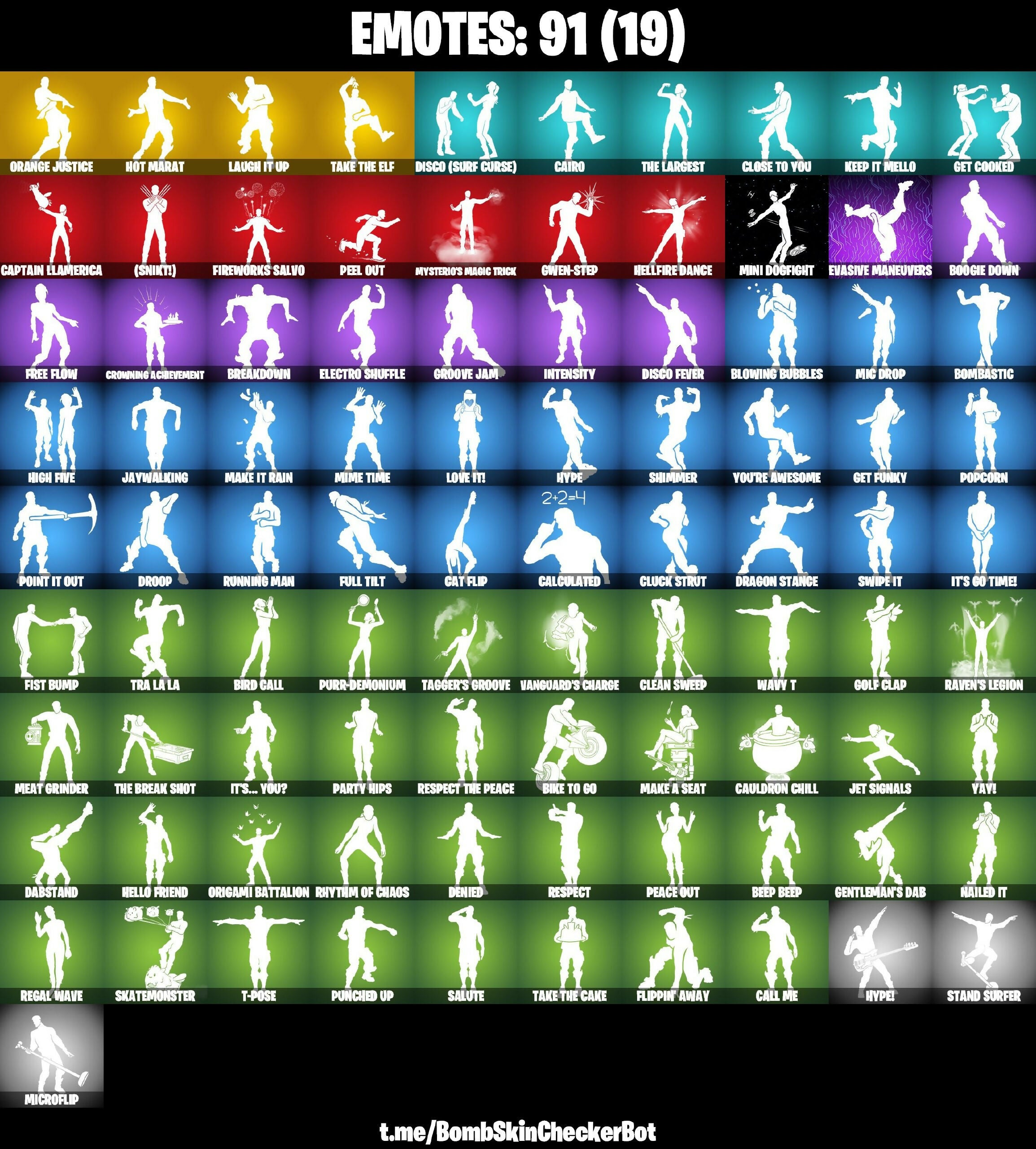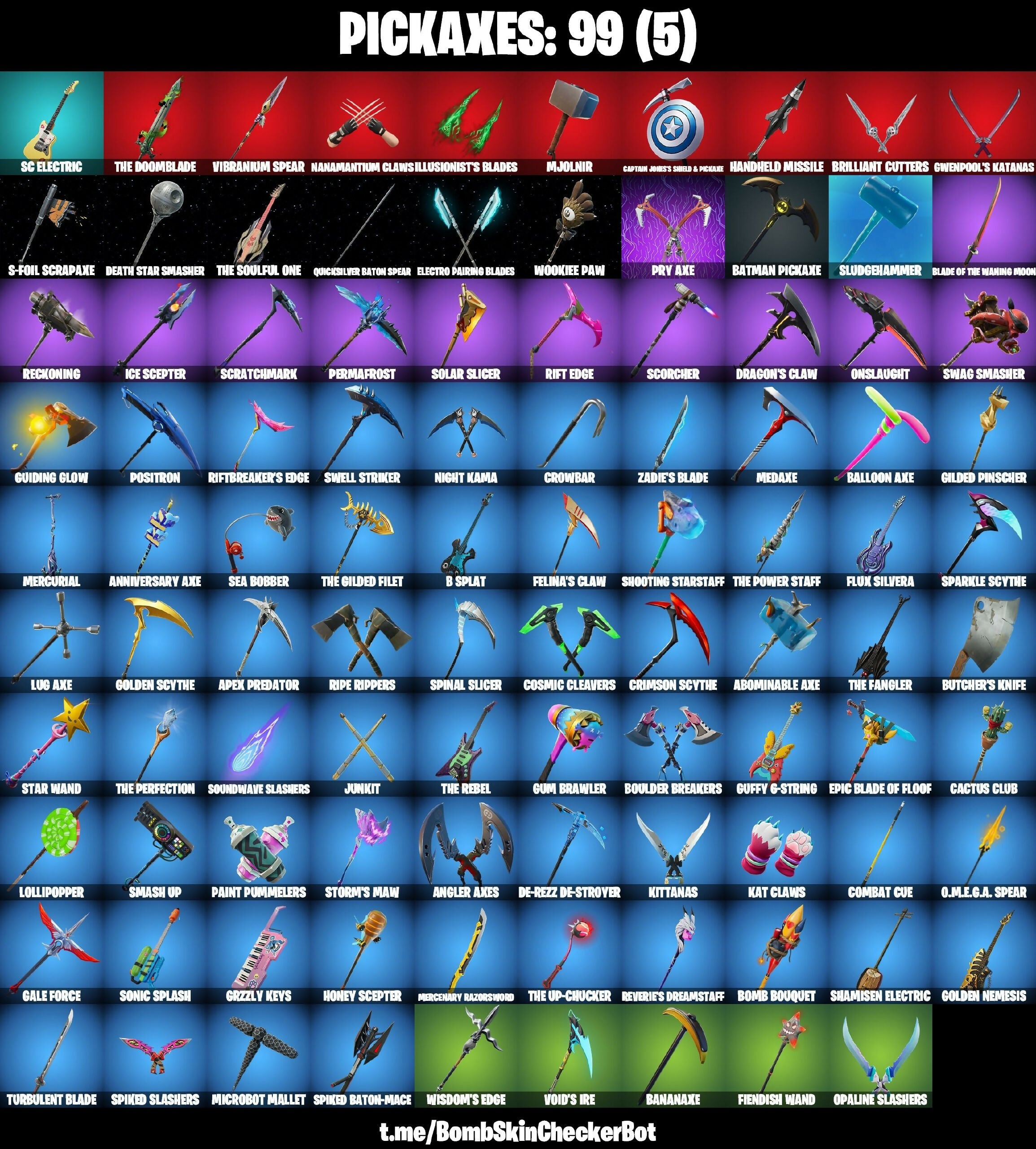 (Snikt!), 1-Ball, Abominable Axe, Agent Jones, Angler Axes, Anniversary Axe, Apex Predator, Astro Jack, B Splat, B.R.U.T.E. Gunner, B.R.U.T.E. Navigator, Balloon Axe, Bananaxe, Batman Comic Book Outfit, Batman Pickaxe, Battlehawk, Beep Beep, Bike To Go, Bird Call, Blackheart, Blade Of The Waning Moon, Blitz Knight, Blowing Bubbles, Bomb Bouquet, Bombastic, Boogie Down, Boulder Breakers, Breakdown, Brilliant Cutters, Bunker Jonesy, Burnoff, Butcher's Knife, Cactus Club, Cairo, Calamity, Calculated, Call Me, Captain Jones, Captain Jones's Shield & Pickaxe, Captain Llamerica, Carbide (Stage 5), Cat Flip, Catalyst, Cauldron Chill, Chaos Director, Chord Kahele, Clean Sweep, Close To You, Cluck Strut, Combat Cue, Cosmic Cleavers, Crimson Scythe, Crowbar, Crowning Achievement, DJ Yonder, Dabstand, Dara, Dark Doggo, De-Rezz De-Stroyer, Death Star Smasher, Denied, Disco (Surf Curse), Disco Fever, Dragon Stance, Dragon's Claw, Drift (Stage 5), Droop, Dynamo, Dynamo Tntina, Electro Pairing Blades, Electro Shuffle, Emma Frost, Enforcer, Epic Blade Of Floof, Evasive Maneuvers, Fable, Felina, Felina's Claw, Fiendish Wand, Fireworks Salvo, Fist Bump, Flippin' Away, Flux Silvera, Free Flow, Full Tilt, Gale Force, Gentleman's Dab, Get Cooked, Get Funky, Giddy-Up, Gilded Pinscher, Golden Nemesis, Golden Scythe, Golf Clap, Grizzly Keys, Groove Jam, Guffy 6-String, Guiding Glow, Gum Brawler, Gwen-Step, Gwenpool, Gwenpool's Katanas, Handheld Missile, Hellfire Dance, Hello Friend, High Five, Honey Scepter, Hot Marat, Huntress, Hybrid, Hype, Hype!, Ice Scepter, Illusionist's Blades, Inferno, Infinity, Intensity, Irridia Vayne, It's Go Time!, It's... You?, Jaywalking, Jet Signals, Journey vs Hazard, Junkit, Kat Claws, Katalina, Keep It Mello, Kittanas, Kuno, Lara Croft, Laugh It Up, Lizzik, Lollipopper, Longshot, Love It!, Lug Axe, Lynx, Make A Seat, Make It Rain, Meat Grinder, Medaxe, Meowdas, Mercenary Razorsword, Mercurial, Mic Drop, Microbot Mallet, Microflip, Mime Time, Mini Dogfight, Mjolnir, Mothmando, Mullet Marauder, Musha, Mysterio, Mysterio's Magic Trick, Nailed It, Nanomantium Claws, Night Kama, Noir, O.M.E.G.A. Spear, Omega (Stage 5), Onesie, Onslaught, Opaline Slashers, Orange Justice, Origami Battalion, Paint Pummeling, Paradox, Party Hips, Peace Out, Peel Out, Peelverine, Permafrost, Pig The Butcher, Point It Out, Polly, Popcorn, Positron, Powder, Pry Axe, Punched Up, Purr-Demonium, Quicksilver Baton Spear, Ragnarok (Stage 6), Raven's Legion, Reckoning, Redline, Regal Wave, Relay, Remedy vs Toxin, Respect, Respect The Peace, Reverie, Reveries Dreamstaff, Rhythm Of Chaos, Rift Edge, Riftbreaker's Edge, Ripe Rippers, Rippley vs Sludge, Rogue Agent, Rook, Rox, Running Man, S-Foil Scrapaxe, Salute, Sandshark Driver, Sc Electric, Scorcher, Scratchmark, Sea Bobber, Sentinel, Sgt. Winter, Shamisen Electric, Shimmer, Shooting Starstaff, Shuri, Sith Trooper, Skatemonster, Skull Trooper, Sledgehammer, Sludgehammer, Smash Up, Solar Slicer, Sonic Splash, Soundwave Slashers, Sparkle Scythe, Spider-Man, Spiked Baton-Mace, Spiked Slashers, Spinal Slicer, Squad Leader, Stand Surfer, Star Wand, Storm's Maw, Sun Strider, Swag Smasher, Swell Striker, Swipe It, T-Pose, Tagger's Groove, Take The Cake, Take The Elf, Teknique, The Batman Who Laughs, The Break Shot, The Dark Knight Movie Outfit, The Doomblade, The Fangler, The Gilded Filet, The Ice King, The Largest, The Perfection, The Power Staff, The Prisoner, The Rebel, The Soulful One, The Up-Chucker, The Visitor, Thor, Tilted Teknique, Toxic Trooper, Tra La La, Travis Scott, Trog, Turbulent Blade, Turk vs Riptide, UNSC Spartan, Undercover Skye, Valor, Vanguard Zadie, Vanguard's Charge, Venturion, Verge, Vibranium Spear, Vintage Ramirez, Void Warrior Absenz, Void's Ire, Vond3r, War Machine, Wavebreaker, Wavy T, Wisdom's Edge, Wookiee Paw, Wukong, X-Lord, Yay!, You're Awesome, Zadie's Blade, Zenith, Zoey