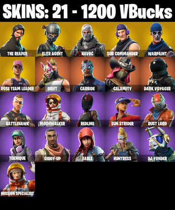 🎆21 SKINS ⚡️PC/XBOX⚡️ THE REAPER 👑 ELITE AGENT 👑 HAVOC 👑 SUB COMMANDER 👑 DRIFT 👑 CARBIDE 👑 CALAMITY 👑 DARK VOYAGER 👑 BATTLEHAWK ⚡️ 1200 VB 📧 MAIL CHANGEABLE SOON #M488