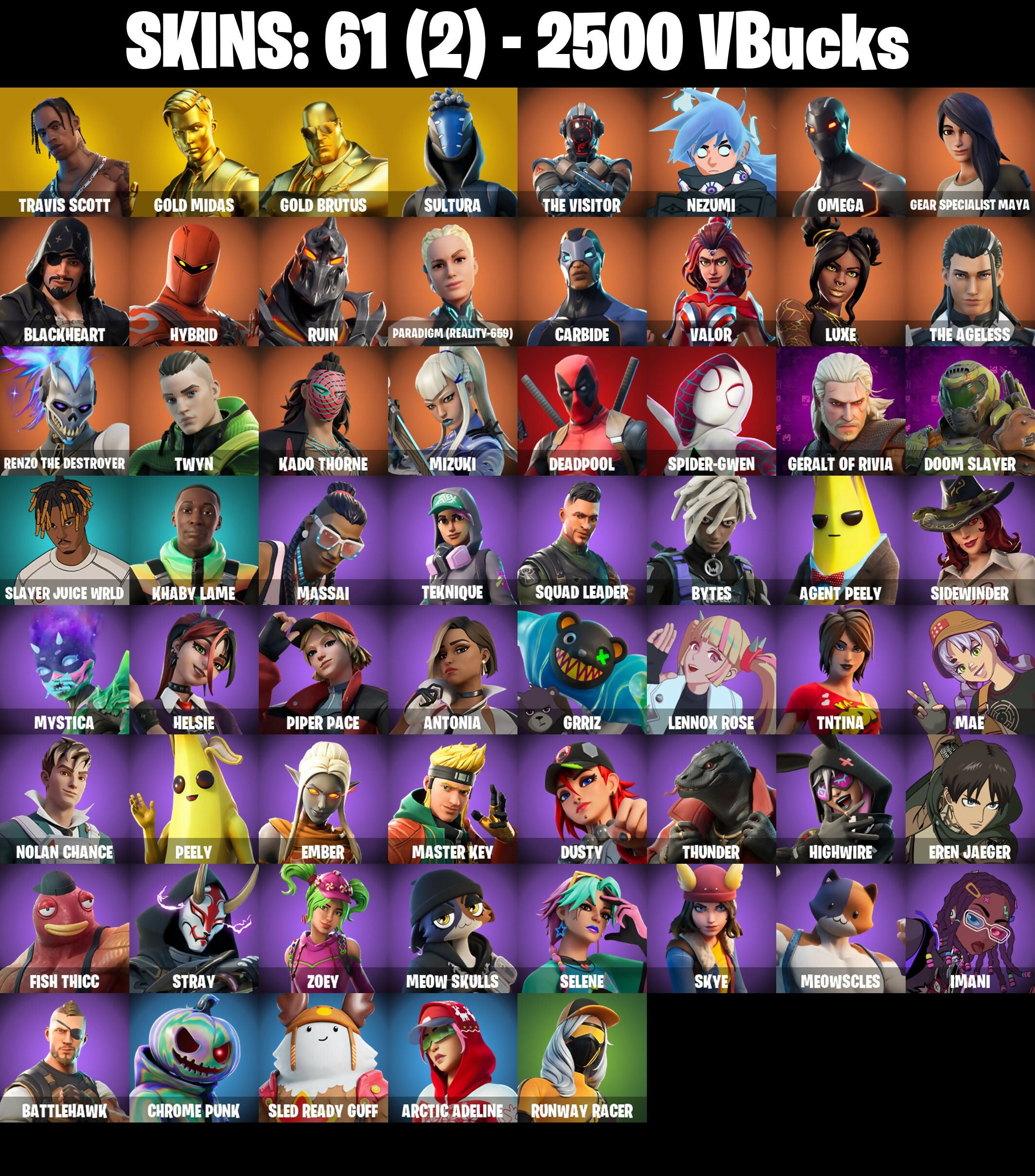 🎆61 SKINS ⚡️PC/XBOX⚡️ TRAVIS SCOTT 👑 GOLD MIDAS 👑 GOLD BRUTUS 👑 SULTURA 👑 THE VISITOR 👑 NEZUMI 👑 OMEGA 👑 GEAR SPECIALIST MAYA 👑 BLACKHEART ⚡️ 2500 VB 📧 MAIL CHANGEABLE SOON #M545