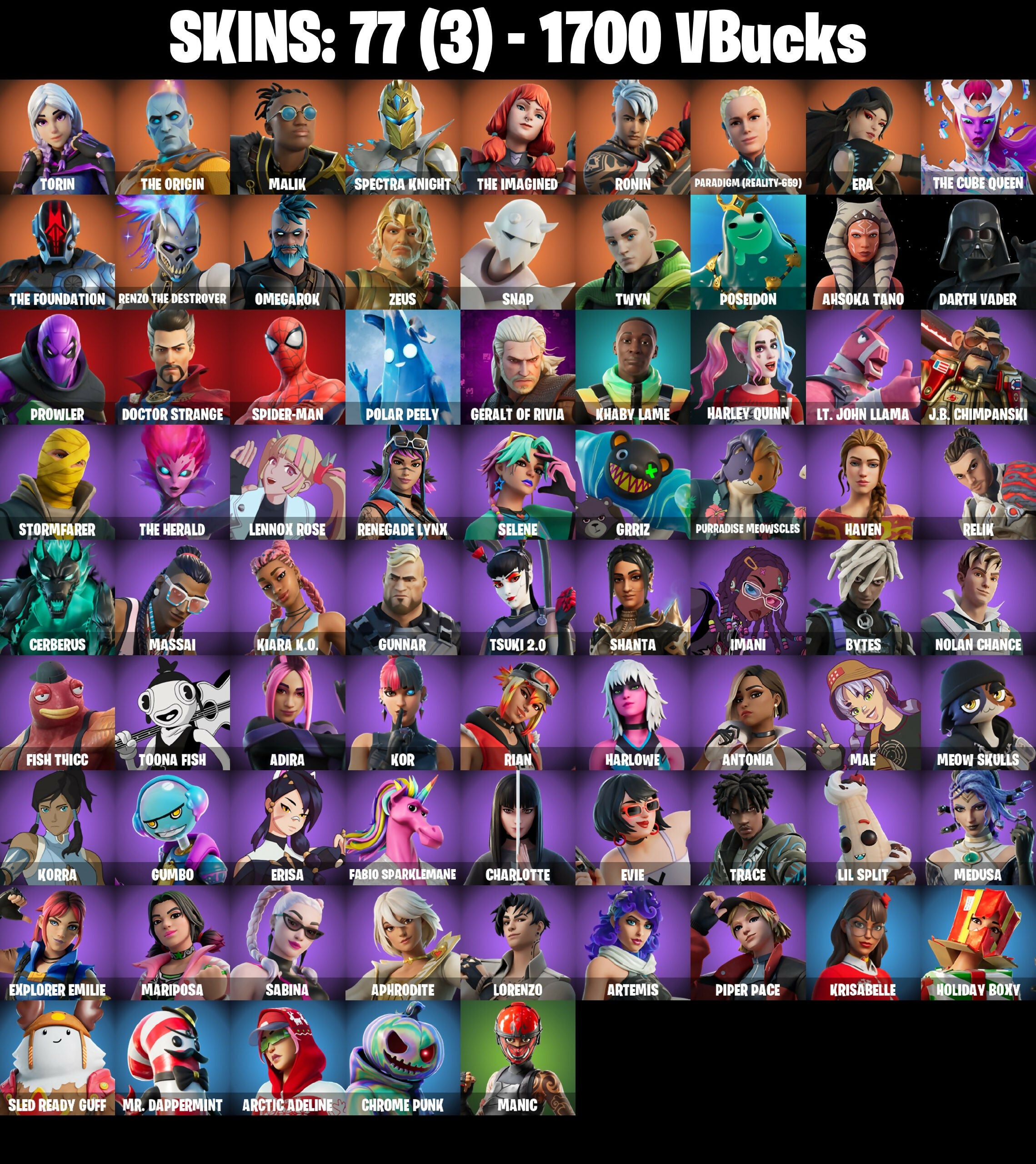 🎆77 SKINS ⚡️PC⚡️ TORIN 👑 THE ORIGIN 👑 MALIK 👑 SPECTRA KNIGHT 👑 THE IMAGINED 👑 RONIN 👑 PARADIGM (REALITY-659) 👑 ERA 👑 THE CUBE QUEEN ⚡️ 1700 VB 📧 MAIL CHANGEABLE SOON #M512