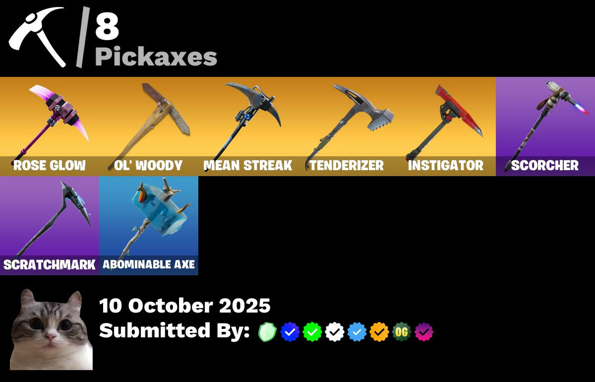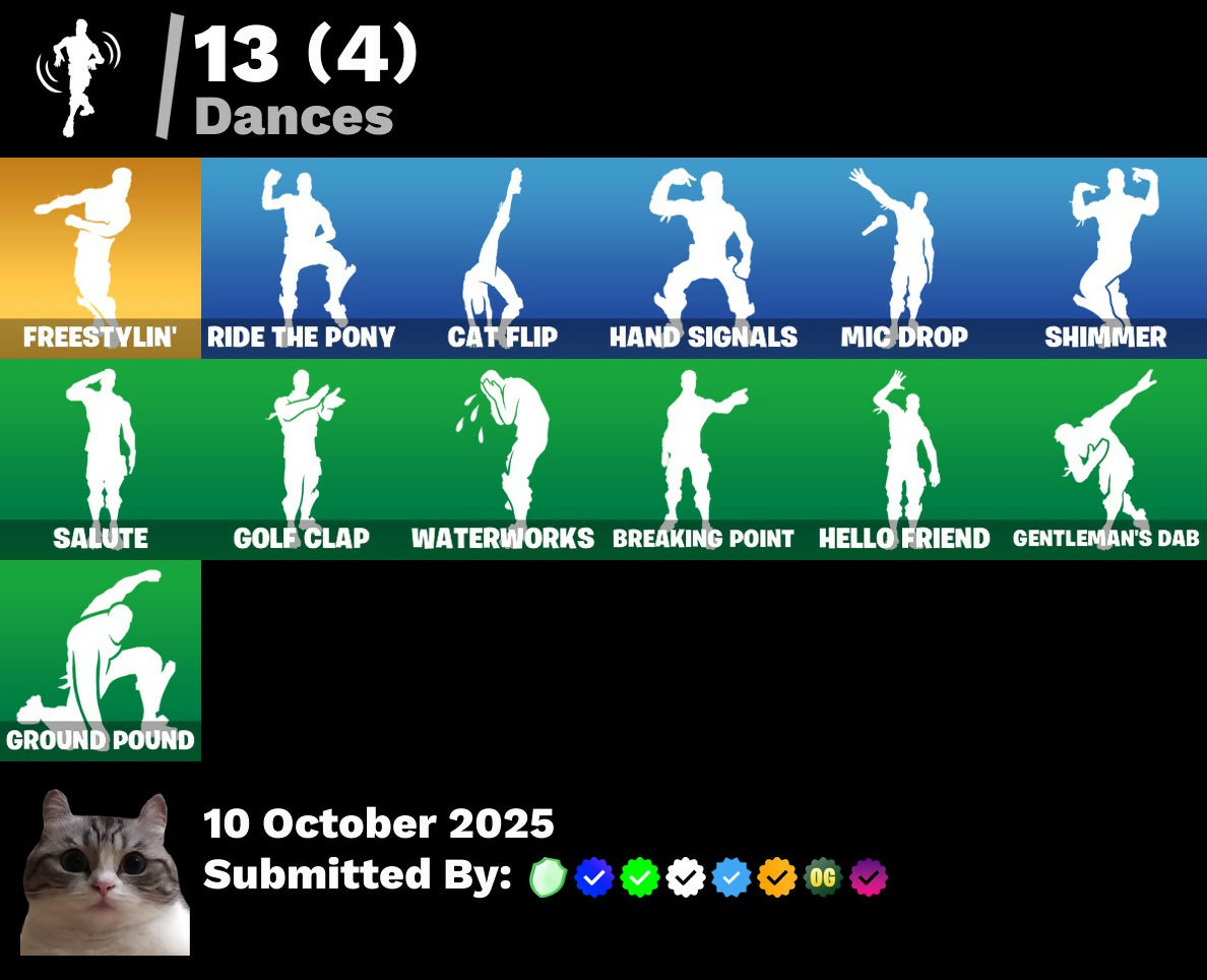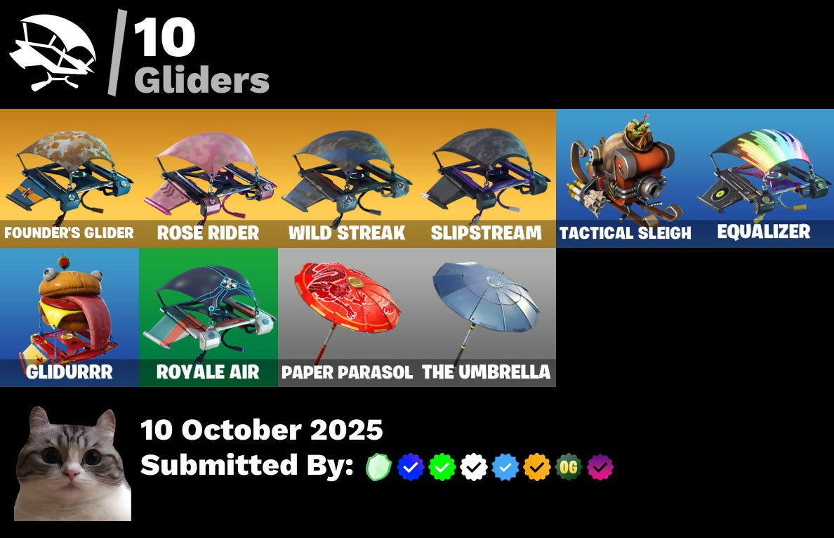 Abominable Axe, Backup Plan, Breaking Point, Cat Flip, Chapter 3 Island Theme, Chapter 4 Island Theme, Chapter 5 Island Theme, Clawz Retro, Constructor, Cuddle Hearts, Equalizer, Fortnite, Founder's Glider, Freestylin', Fryangles, Gentleman's Dab, Glidurrr, Golf Clap, Ground Pound, Hand Signals, Havoc, Hello Friend, Instigator, Lego Fortnite Theme, Lobby Classic, Lynx, Mean Streak, Mic Drop, Ol' Woody, Paper Parasol, Powder, Pursuit, Ride The Pony, Rose Glow, Rose Rider, Rose Team Leader, Royale Air, Rust Bucket, Salute, Scorcher, Scratchmark, Sgt. Winter, Shimmer, Skeletara, Skirmish, Slipstream, Sockets, Soldier, Sub Commander, Tactical Sleigh, Tenderizer, The Umbrella, Trailblazer, True North, Warpaint, Waterworks, Wild Streak, Zenith