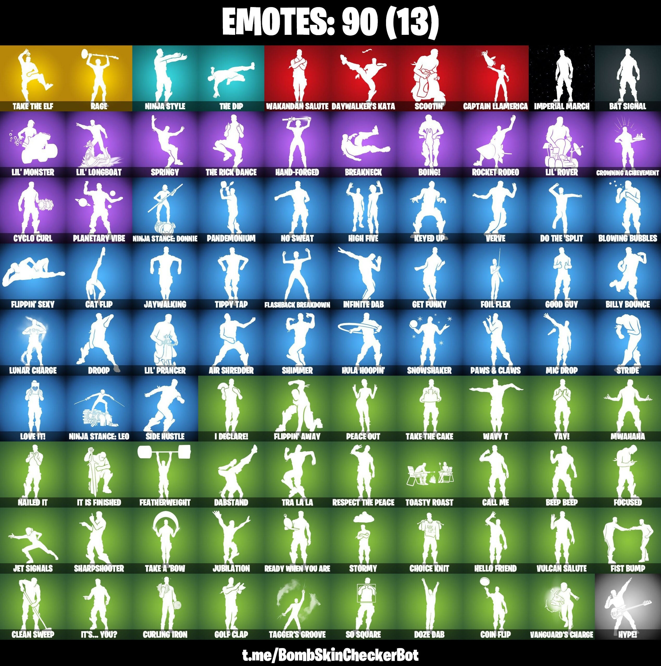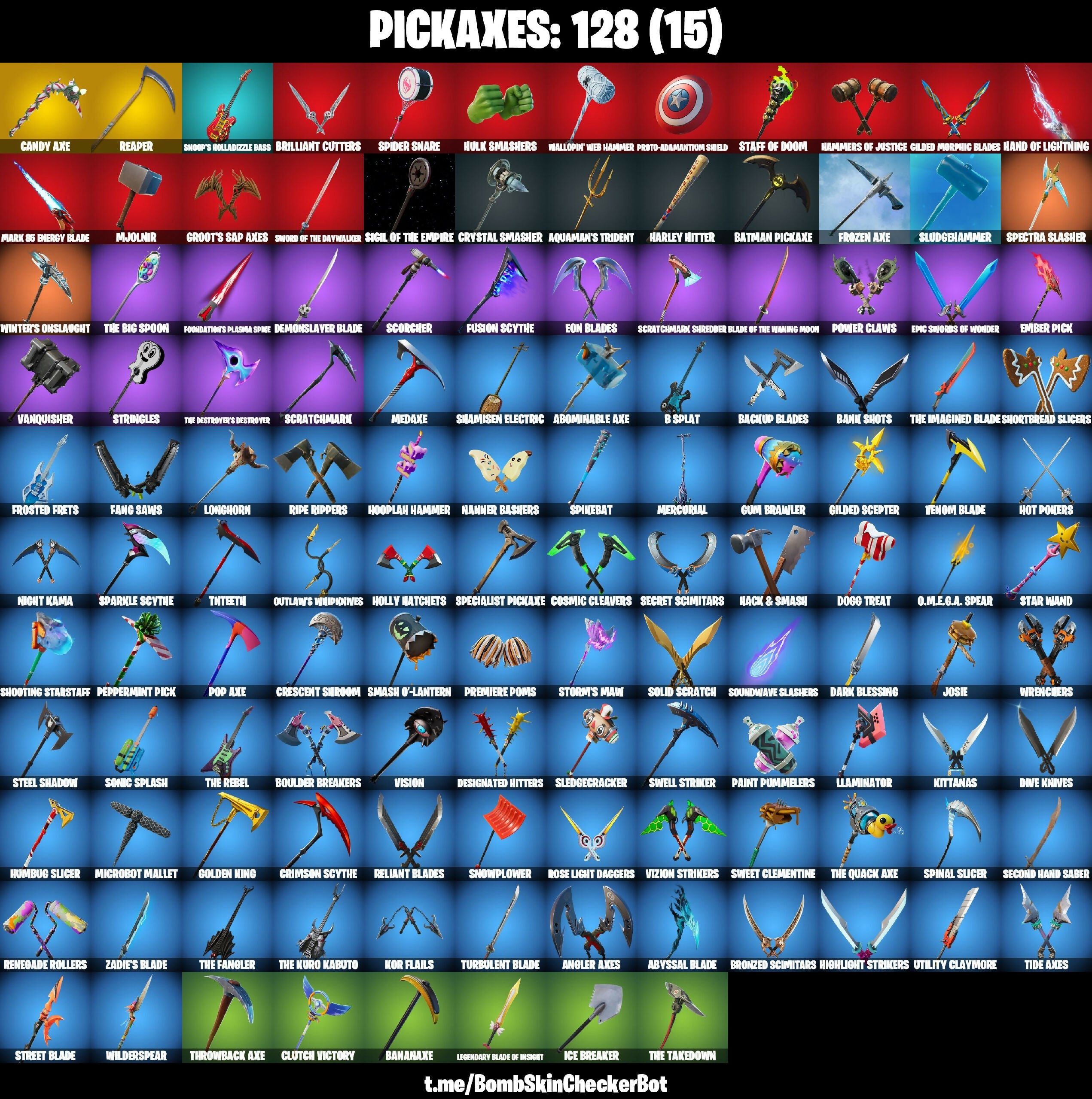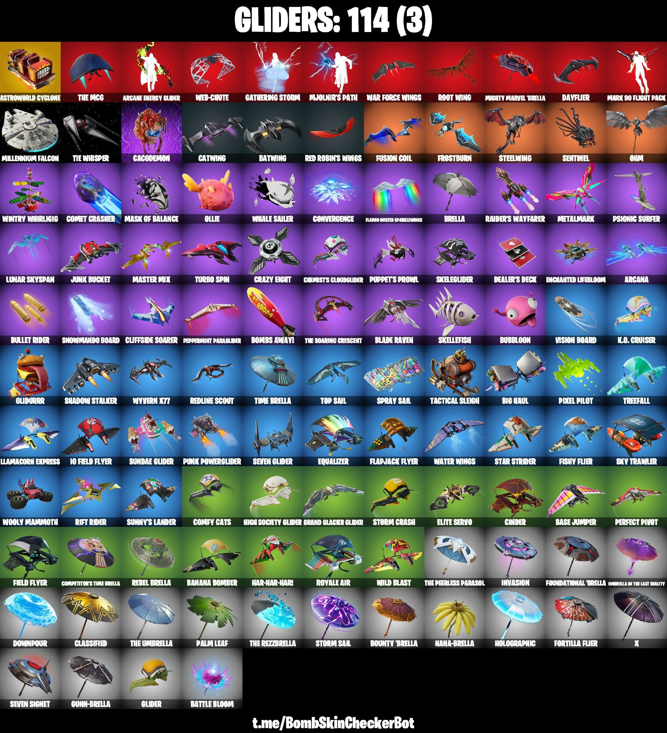 8-Ball Vs Scratch, Abominable Axe, AbseNz, Abyssal Blade, Agent Peely, Air Shredder, Angler Axes, Aquaman, Aquaman's Trident, Arcana, Arcane Energy Glider, Arctic Adeline, Astro Jack, Astroworld Cyclone, Aura, B Splat, Backup Blades, Banana Bomber, Bananaxe, Bank Shots, Base Jumper, Bat Signal, Batman Comic Book Outfit, Batman Pickaxe, Battle Bloom, Batwing, Beach Bomber, Beep Beep, Big Haul, Billy Bounce, Blade, Blade Raven, Blade of the Waning Moon, Blaze, Blowing Bubbles, Boing!, Bombs Away!, Boogeyman, Boulder Breakers, Bounty 'Brella, Breakneck, Brella, Brilliant Cutters, Bronzed Scimitars, Brutus (Fully Golden), Bubbloon, Bullet Rider, Bunker Jonesy, Cacodemon, Call Me, Cameo Vs Chic, Candy Axe, Captain America, Captain Llamerica, Cat Flip, Catalyst, Catwing, Chaos Agent, Charlotte, Chemist's Cloudglider, Choice Knit, Chrome Punk, Cinder, Classified, Clean Sweep, Cliffside Soarer, Clutch Victory, Coin Flip, Comet Crasher, Comfy Cats, Commando, Competitor's Time Brella, Convergence, Cosmic Cleavers, Crazy Eight, Crescent Shroom, Crimson Scythe, Crowning Achievement, Crystal, Crystal Smasher, Curling Iron, Cyclo Curl, D'ark, Dabstand, Dark Blessing, Dayflier, Daywalker's Kata, Deadpool, Dealer's Deck, Demonslayer Blade, Designated Hitters, Dive Knives, Do The 'Split, Doctor Doom, Dogg Treat, Downpour, Doze Dab, Droop, Elite Servo, Ember Pick, Enchanted Lifebloom, Eon Blades, Epic Swords of Wonder, Equalizer, Eternal Knight, Eternal Voyager, Fabio Sparklemane, Fade, Fang Saws, Featherweight, Field Flyer, Fishstick, Fishy Flier, Fist Bump, Flapjack Flyer, Flashback Breakdown, Flavor-Dusted Sparklewings, Flippin' Away, Flippin' Sexy, Focused, Foil Flex, Fortilla Flier, Foundation's Plasma Spike, Foundational 'Brella, Frostburn, Frosted Frets, Frozen Axe, Fusion, Fusion Coil, Fusion Scythe, Gathering Storm, Gear Specialist Maya, Get Funky, Gilded Morphic Blades, Gilded Scepter, Glider, Glidurr, Golden King, Golf Clap, Good Guy, Grand Glacier Glider, Groot, Groot's Sap Axes, Gum Brawler, Gumbo, Gunn-'Brella, Hack & Smash, Hammers of Justice, Hand of Lightning, Hand-Forged, Har-Har-Har!, Harley Hitter, Harlowe, Haven, Hello Friend, High Five, High Society Glider, Highlight Strikers, Holiday Boxy, Holly Hatchets, Holographic, Hooplah Hammer, Hot Pokers, Hula Hoopin', Hulk Smashers, Humbug Slicer, Hype!, I Declare!, IO Field Flyer, Ice Breaker, Imperial March, Inferno, Infinite Dab, Invasion, Iris, It Is Finished, It's... You?, Jaywalking, Jennifer Walters, Jet Signals, Josie, Journey Vs Hazard, Jubilation, Jules, Jumpshot, Junk Bucket, K.O. Cruiser, Keyed Up, Kit, Kittanas, Kor, Kor Flails, Krisabelle, Laguna, Legendary Blade of Insight, Lil Split, Lil' Longboat, Lil' Monster, Lil' Prancer, Lil' Rover, Llamacorn Express, Llaminator, Longhorn, Love It!, Lt. John Llama, Lunar Charge, Lunar Skyspan, Lynx, Major Mancake, Manic, Mark 85 Energy Blade, Mark 90 Flight Pack, Marked Marauder, Mask Of Balance, Master Mix, Mecha Team Shadow, Medaxe, Meowscles (Fully Golden), Mercurial, Merry Marauder, Metalmark, Mezmer, Mic Drop, Microbot Mallet, Midas (Fully Golden), Midas' Shadow, Mighty Marvel 'Brella, Millennium Falcon, Mjolnir, Mjolnir's Path, Mwahaha, Mystique, Nailed It, Nana-Brella, Nanner Bashers, Night Kama, Ninja, Ninja Stance Donnie, Ninja Stance Leo, Ninja Style, No Sweat, O.M.E.G.A. Spear, Ocean, Ohm, Ollie, Omegarok, Outlaw's Whipknives, Paint Pummelers, Palm Leaf, Pandemonium, Paws & Claws, Peace Out, Peppermint Paraglider, Peppermint Pick, Perfect Pivot, Pixel Pilot, Planetary Vibe, Plastic Patroller, Polar Peely, Pop Axe, Powder, Power Claws, Premiere Poms, Proto-Adamantium Shield, Psionic Surfer, Punk Powerglider, Puppet's Prowl, Rage, Raiders Wayfarer, Ready When You Are, Reaper, Rebel Brella, Recon Expert, Red Knight, Red Robin's Wings, Redline Scout, Reliant Blades, Remedy Vs Toxin, Renegade Lynx, Renegade Rollers, Respect The Peace, Rift Rider, Ripe Rippers, Rippley Vs Sludge, Rocket Rodeo, Ronin, Root Wing, Rose Light Daggers, Rox, Royale Air, Runway Racer, Santa Dogg, Scootin', Scorcher, Scratchmark, Scratchmark Shredder, Scuba Jonesy, Second Hand Saber, Secret Scimitars, Seeker, Sentinel, Seven Glider, Seven Signet, Sgt. Winter, Shadow Stalker, Shamisen Electric, Shanta, Sharpshooter, Shimmer, Shooting Starstaff, Shortbread Slicers, Side Hustle, Sigil of the Empire, Siona, Skeleglider, Skellefish, Sky Trawler, Skye, Sled Ready Guff, Sledgecracker, Sludgehammer, Smash O'-Lantern, Snoop's Holladizzle Bass, Snowmando Board, Snowplower, Snowshaker, So Square, Solid Scratch, Sonic Splash, Soundwave Slashers, Sparkle Scythe, Sparkle Supreme, Specialist Pickaxe, Spectra Knight, Spectra Slasher, Spider Snare, Spider-Man, Spider-Man (No Way Home), Spider-Man Zero, Spikebat, Spinal Slicer, Spray Sail, Springy, Staff of Doom, Star Scout, Star Strider, Star Wand, Steel Shadow, Steelwing, Storm, Storm Crash, Storm Sail, Storm's Maw, Stormy, Street Blade, Stride, Stringles, Summer Drift, Summit Striker, Sundae Glider, Sunny's Lander, Supersonic, Sweet Clementine, Swell Striker, Sword of the Daywalker, Tactical Sleigh, Tagger's Groove, Take A Bow, Take The Cake, Take The Elf, The Big Spoon, The Dark Knight Movie Outfit, The Destroyer's Destroyer, The Dip, The Fangler, The Foundation, The Imagined Blade, The Kuro Kabuto, The McG, The Peerless Parasol, The Quack Axe, The Rebel, The Rezzbrella, The Rick Dance, The Scientist, The Soaring Crescent, The Takedown, The Umbrella, Thor, Throwback Axe, Tide Axes, Tie Whisper, Tilted Teknique, Time Brella, Tippy Tap, Tnteeth, Tntina, Toasty Roast, Tony Stark, Toona Fish, Top Sail, Tra La La, Travis Scott, Treefall, Turbo Spin, Turbulent Blade, Turk Vs Riptide, Ultima Knight, Utility Claymore, Vanguard's Charge, Vanquisher, Venom Blade, Verve, Vision, Vision Board, Vizion Strikers, Vulcan Salute, Wakandan Salute, Wallopin' Web Hammer, War Force Wings, Water Wings, Wavebreaker, Wavy T, Web-Chute, Whale Sailer, Wild Blast, Wilderspear, Winter's Onslaught, 